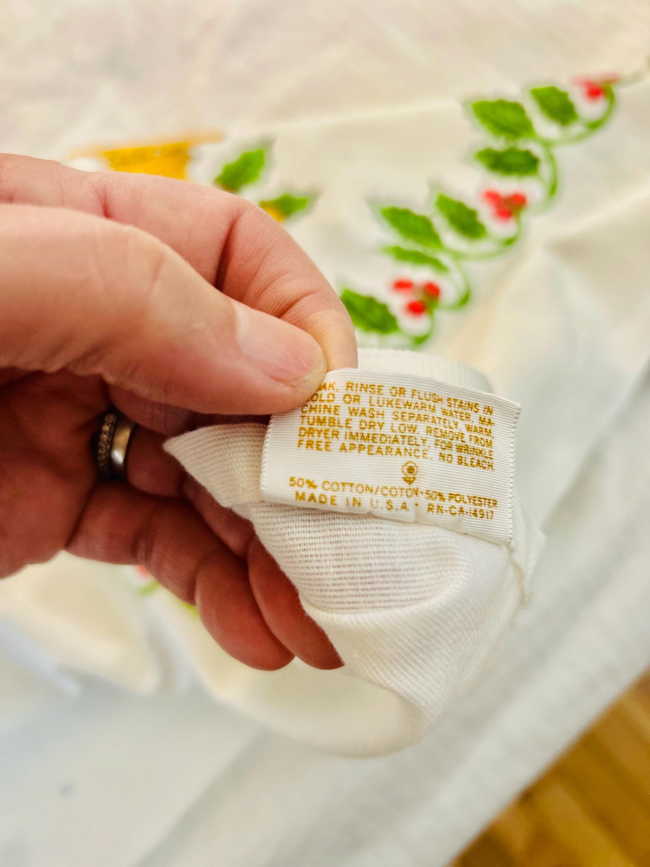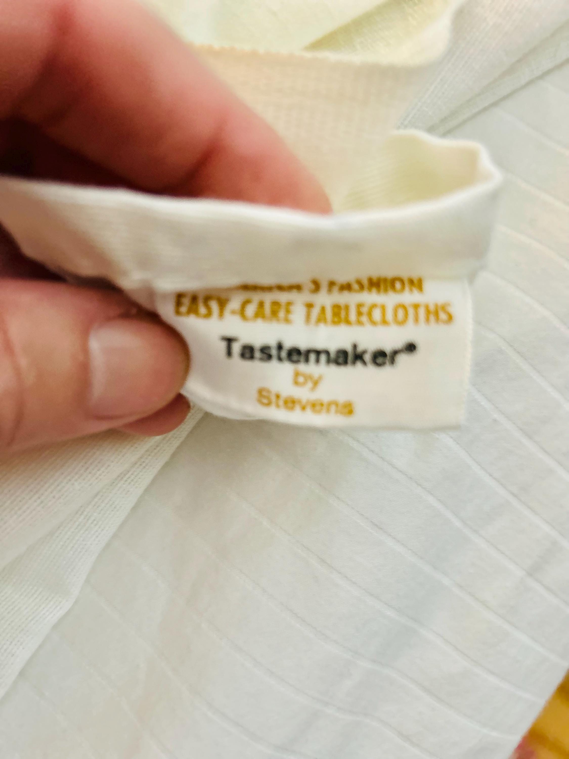 Freshly laundered and clean and bright. Measures 49 inches by 52.5 inches.
