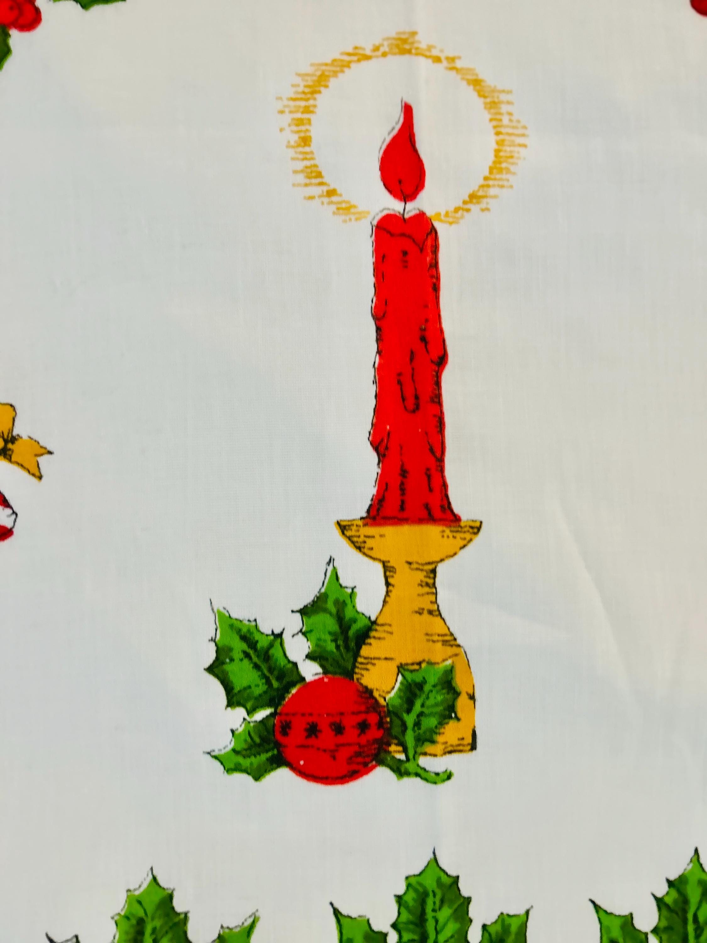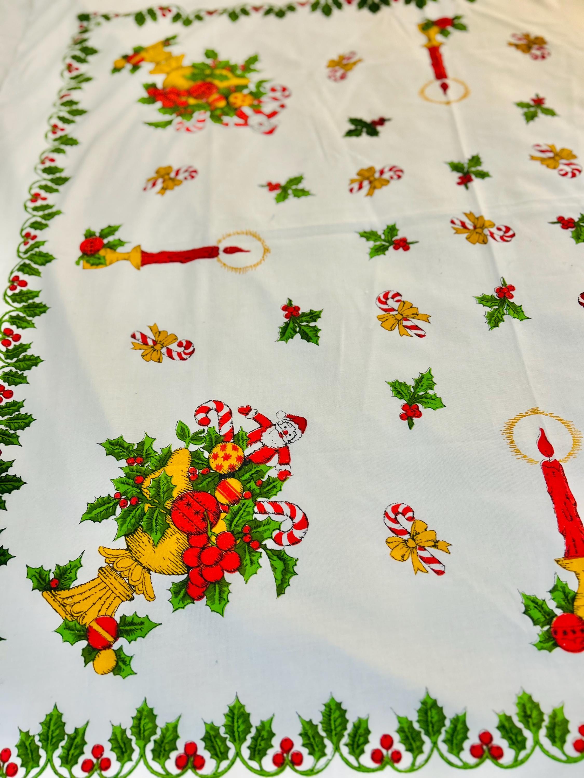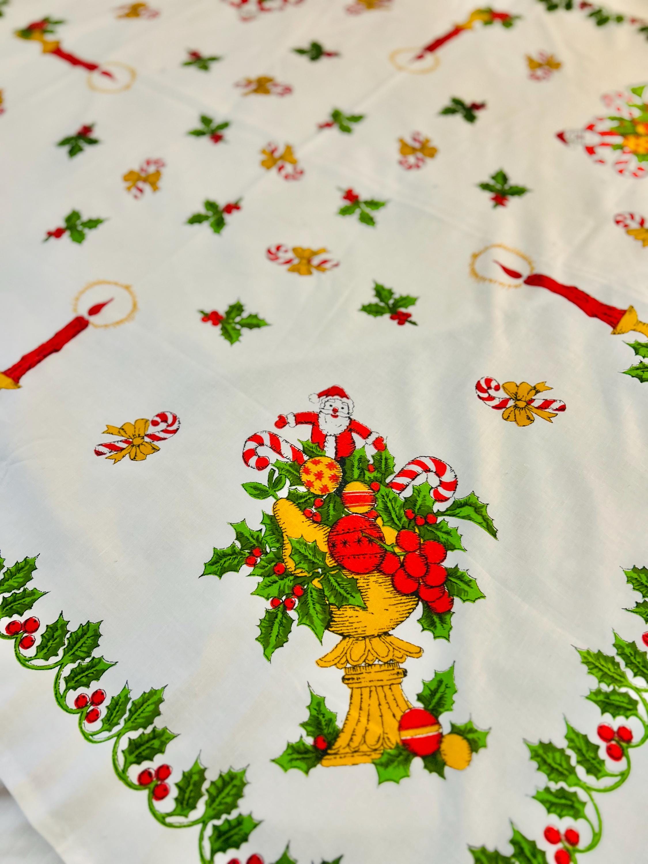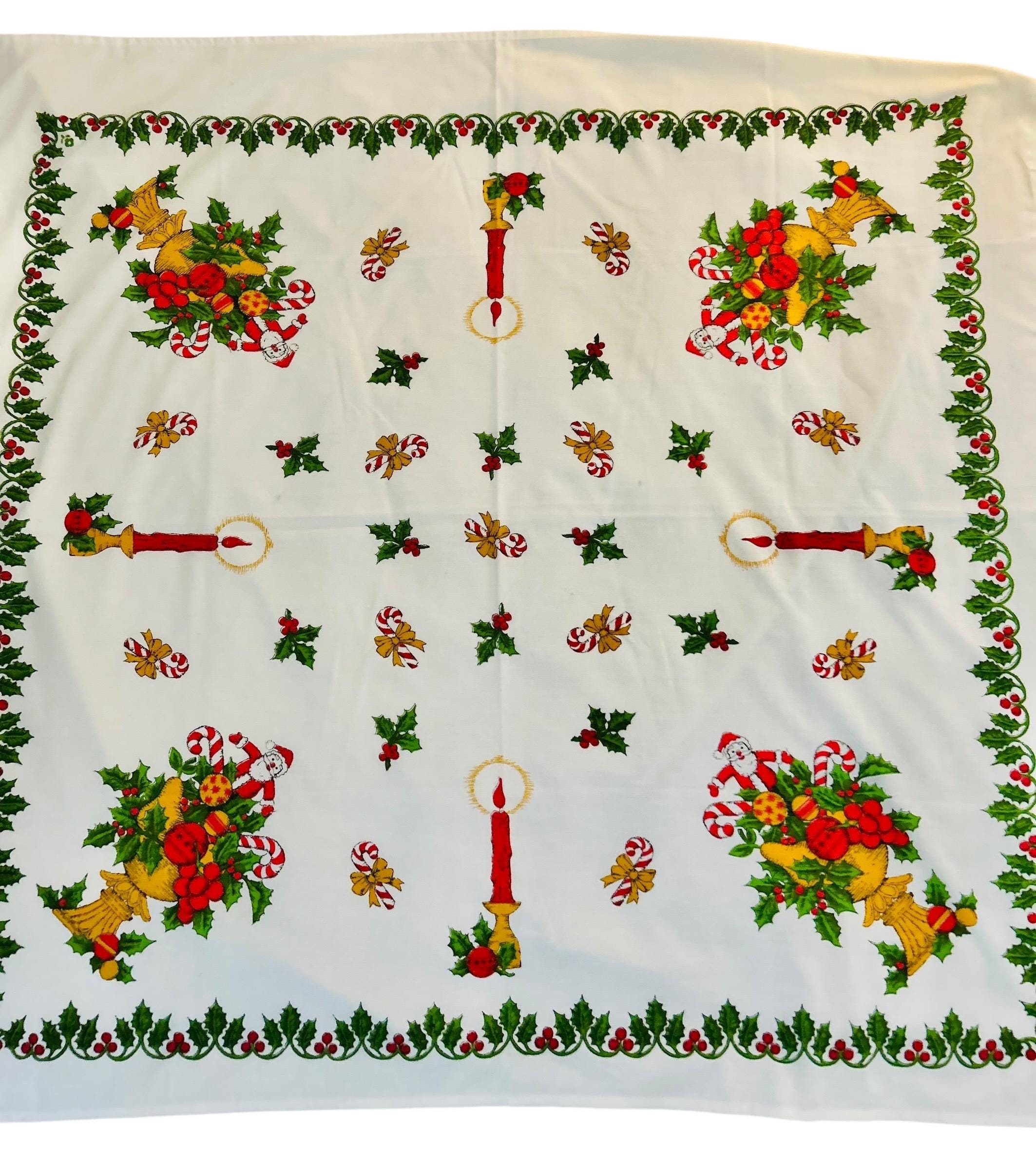 Vintage Holiday Tablecloth with motifs of Santa, candles, candy canes and a Holly border. Machine-made; 50% cotton and 50% polyester. Tag says "Tastemaker by Stevens"