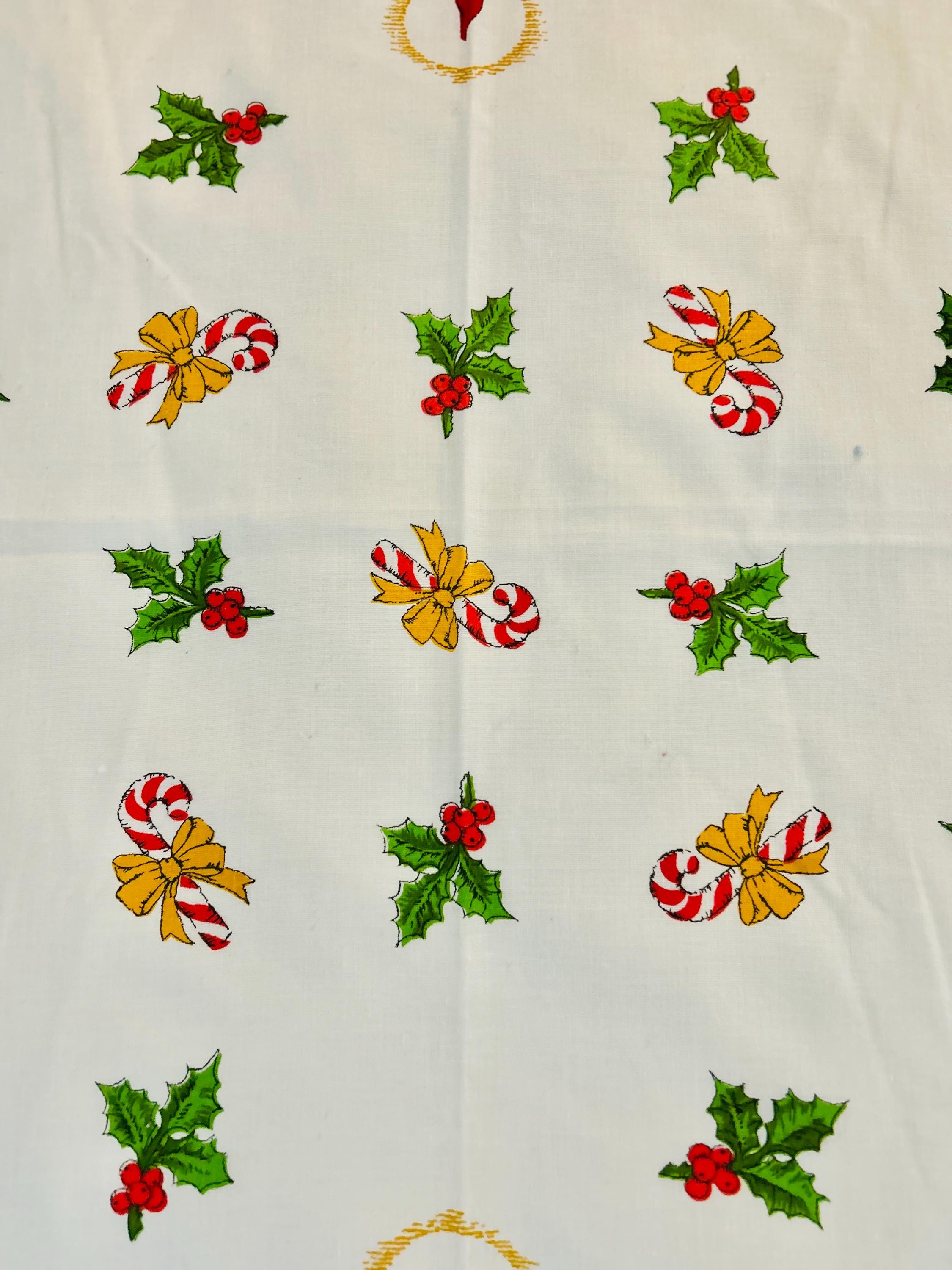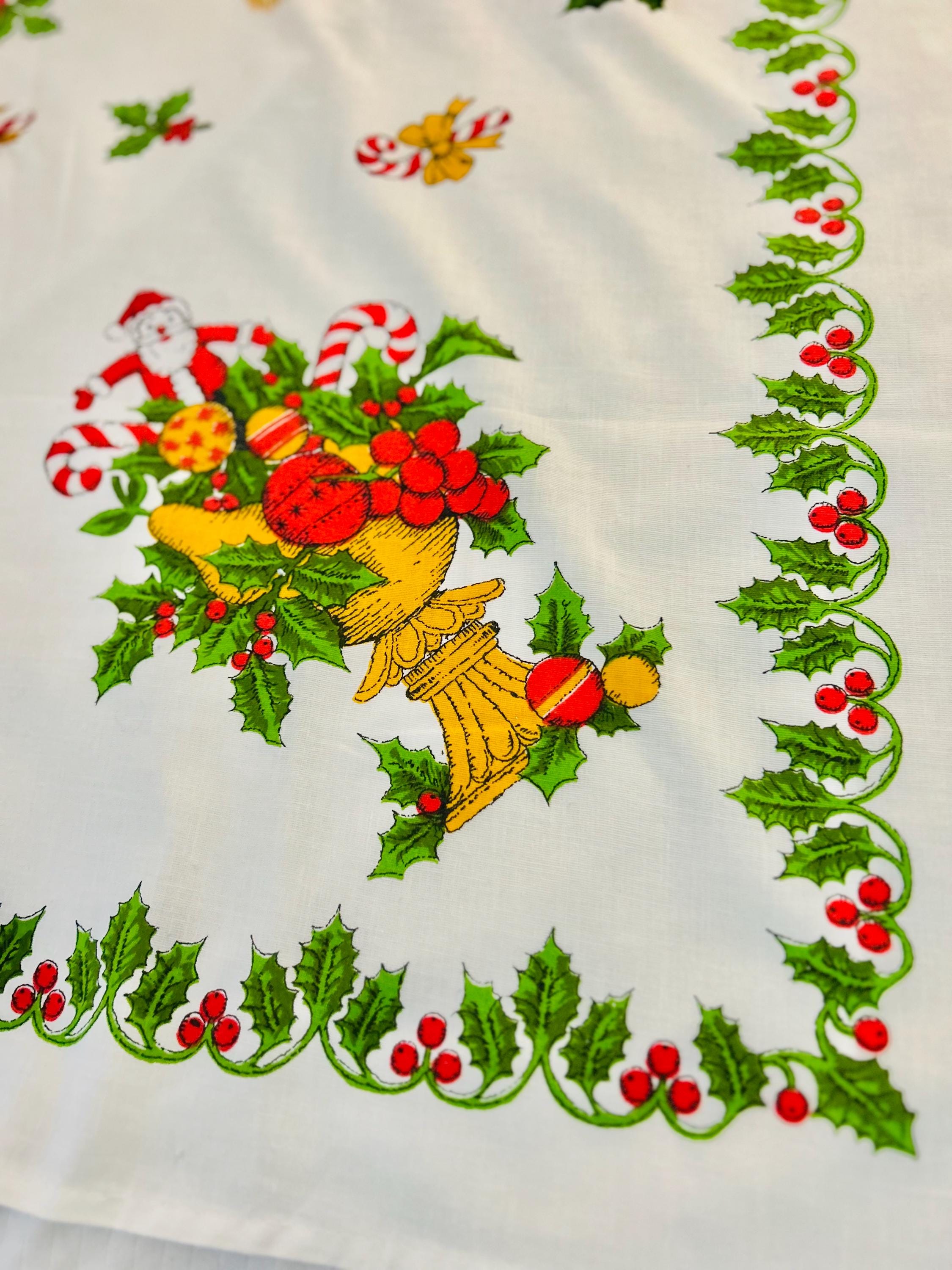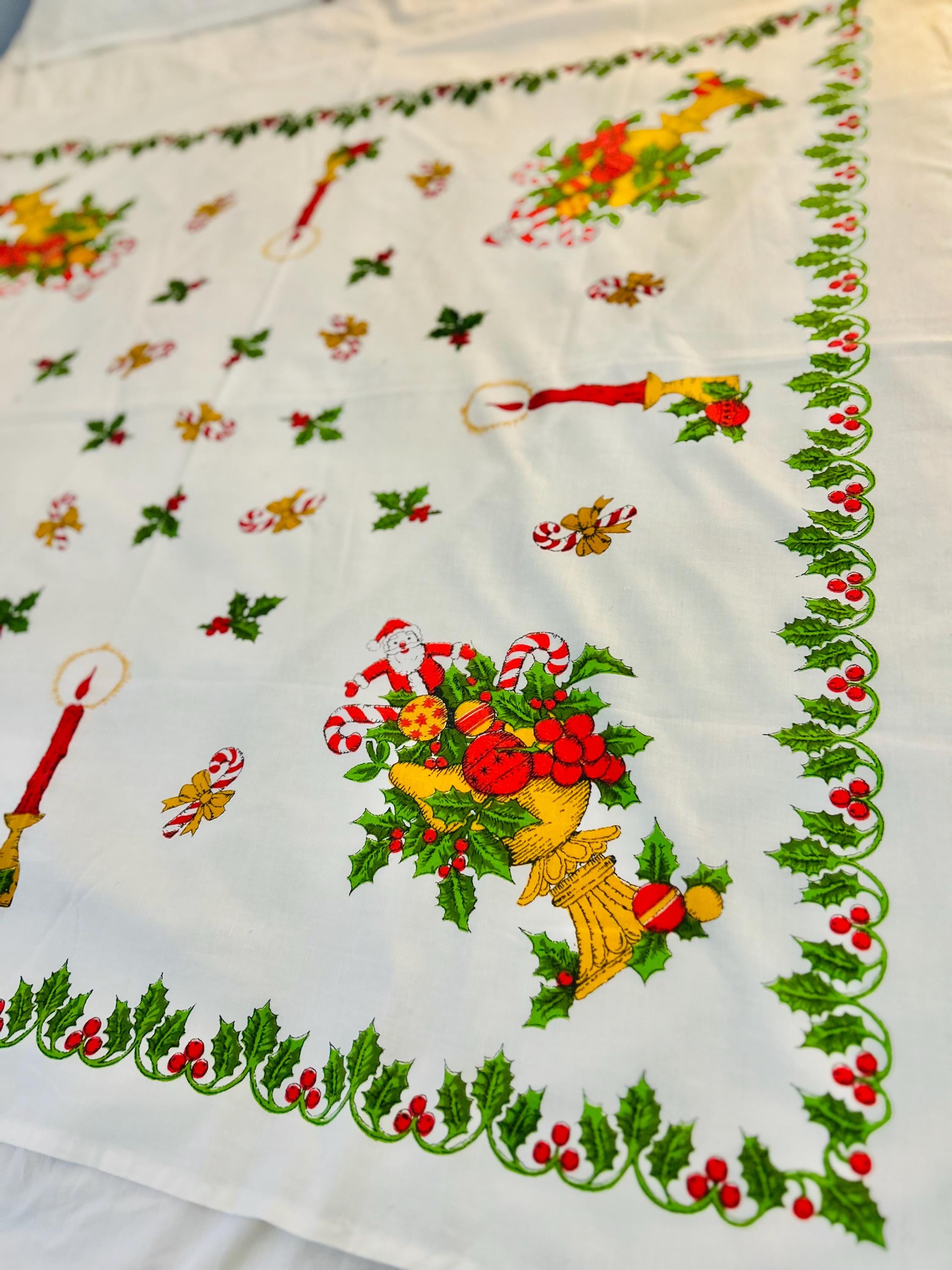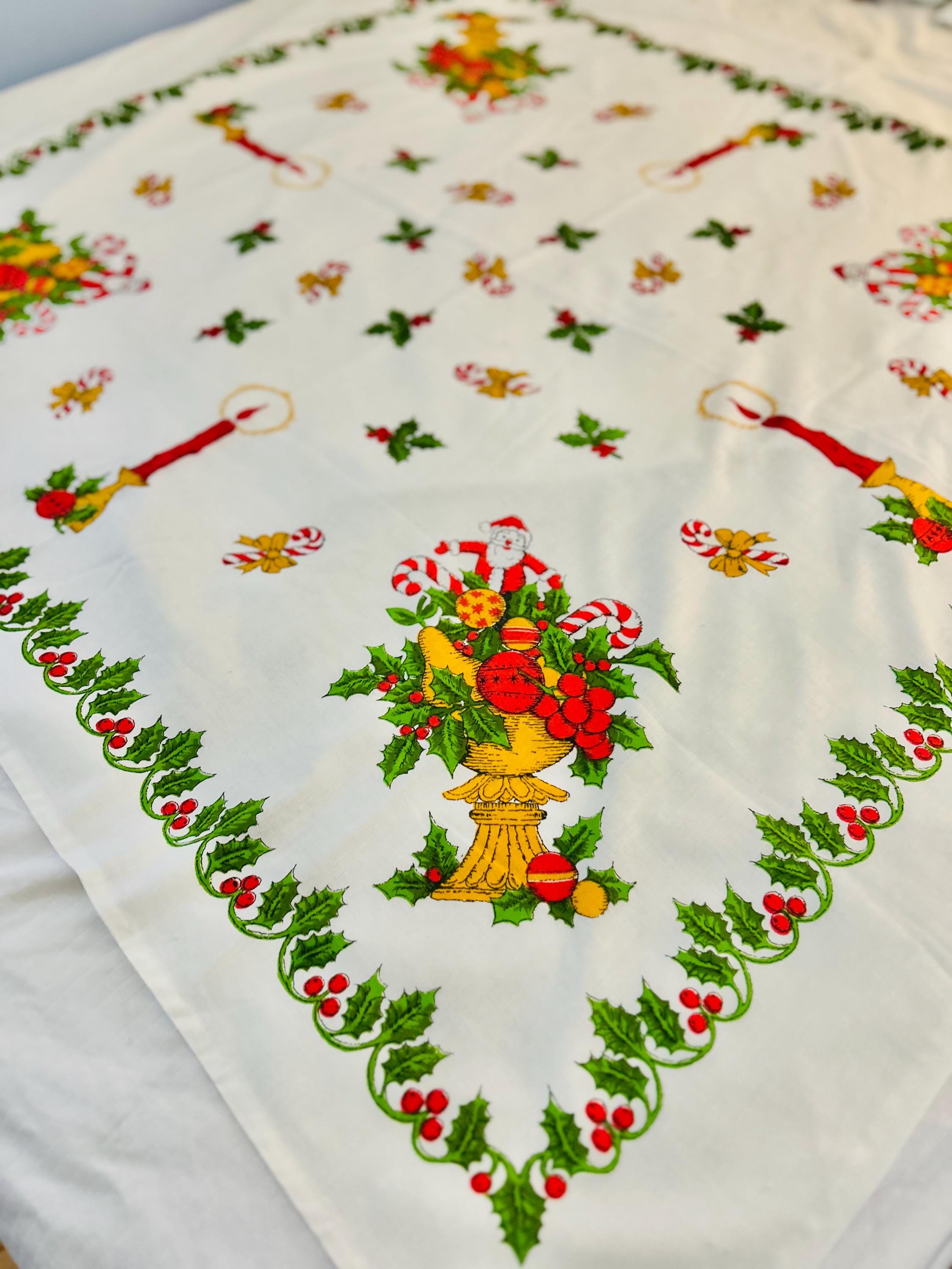 Vintage Holiday Tablecloth with motifs of Santa, candles, candy canes and a Holly border. Machine-made; 50% cotton and 50% polyester. Tag says "Tastemaker by Stevens"
