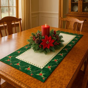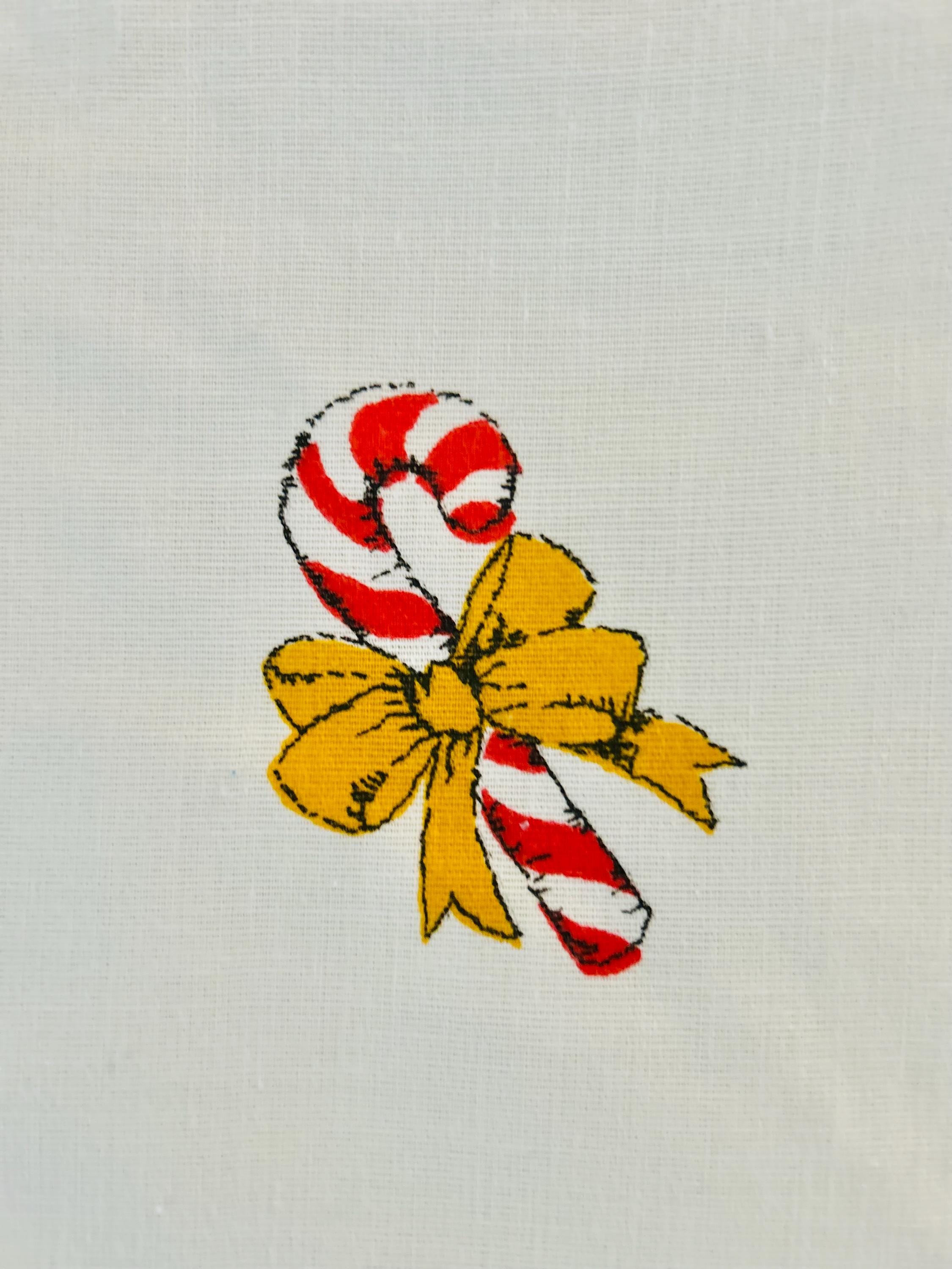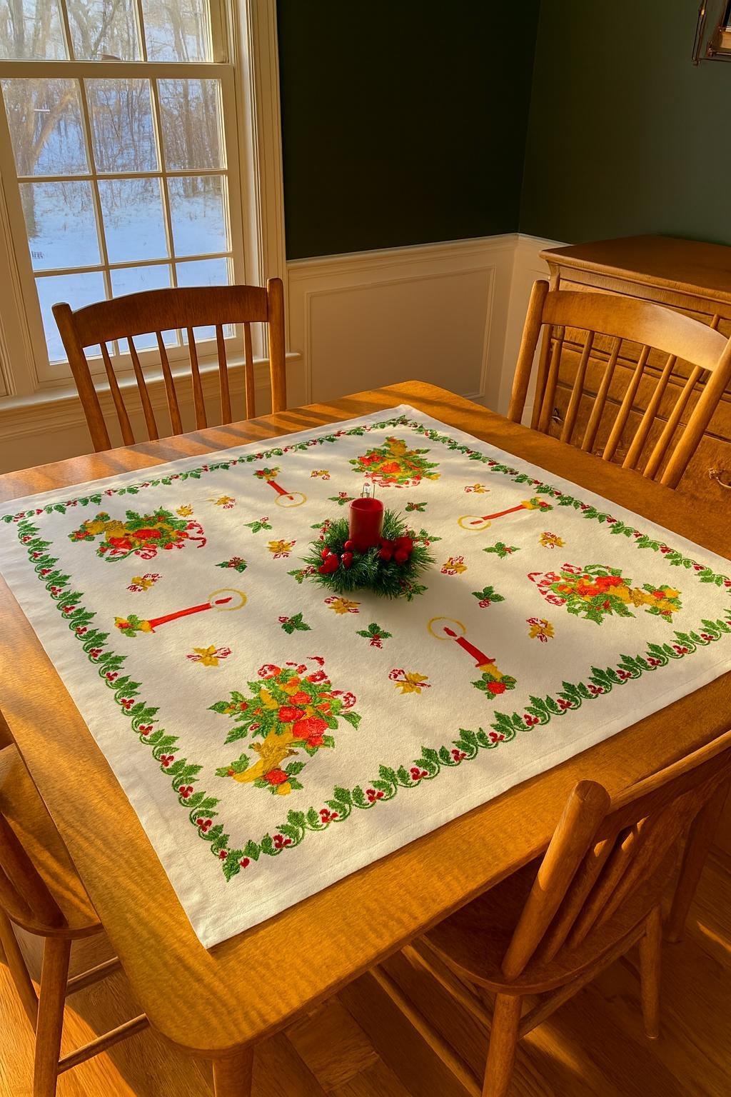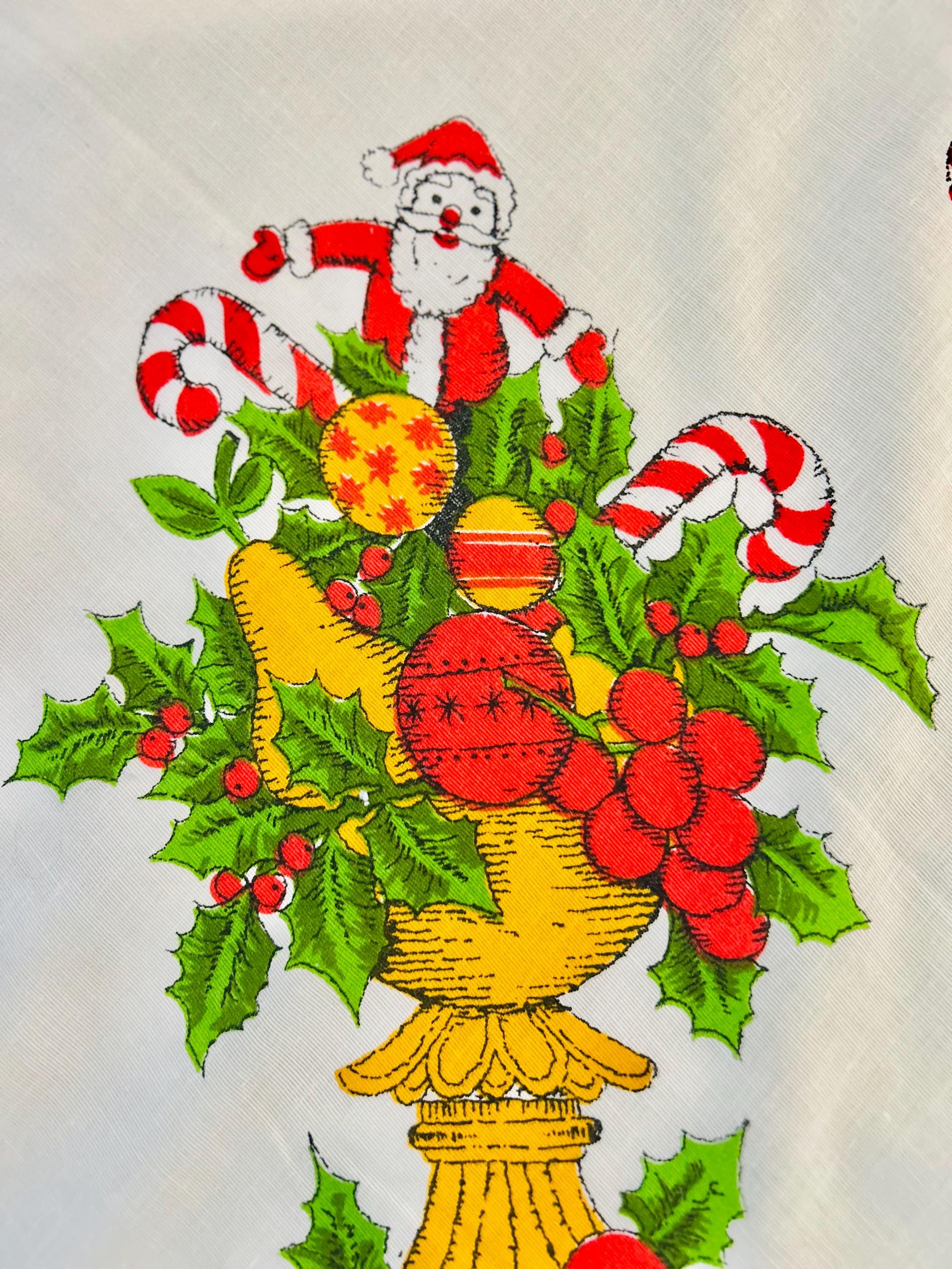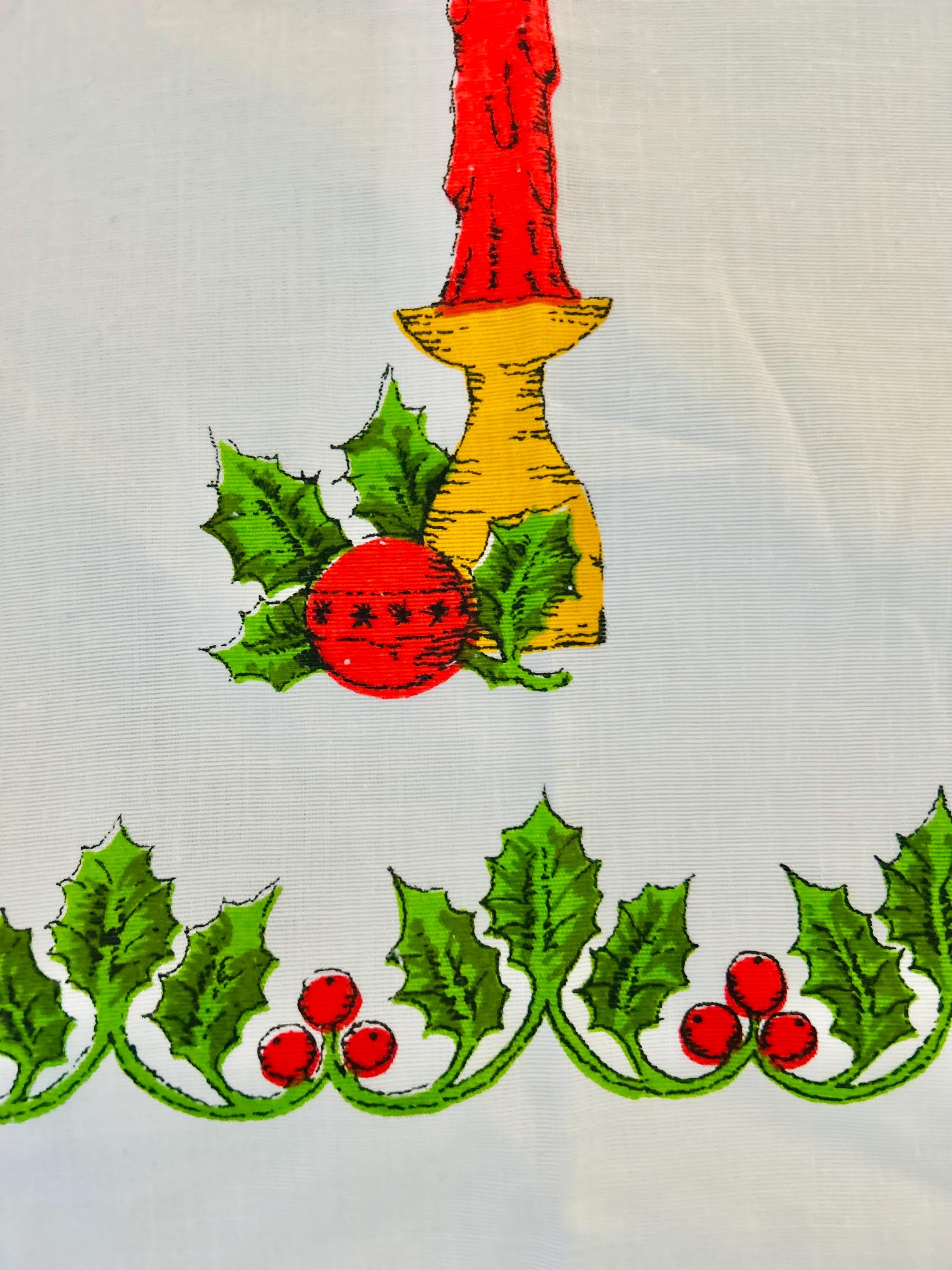 Vintage Holiday Tablecloth with motifs of Santa, candles, candy canes and a Holly border. Machine-made; 50% cotton and 50% polyester. Tag says "Tastemaker by Stevens"