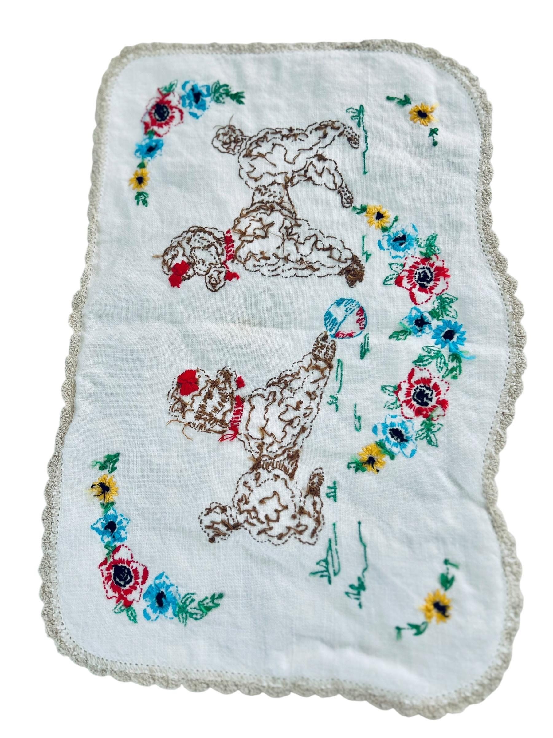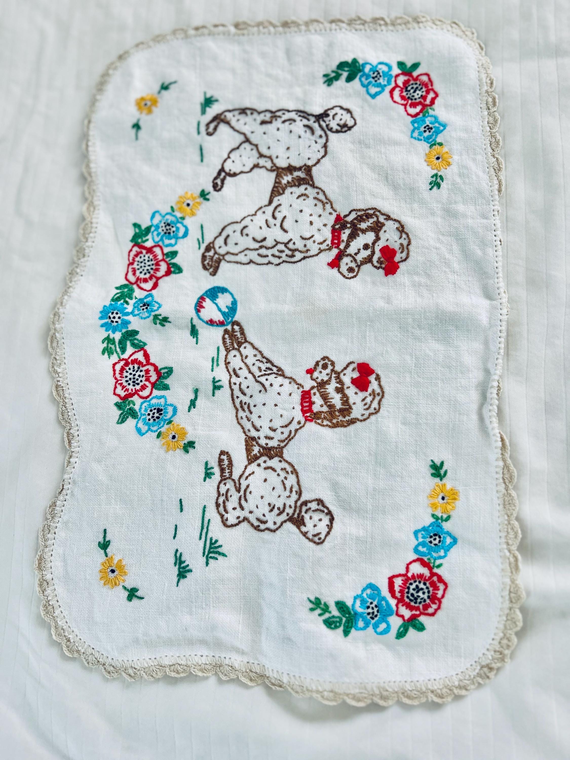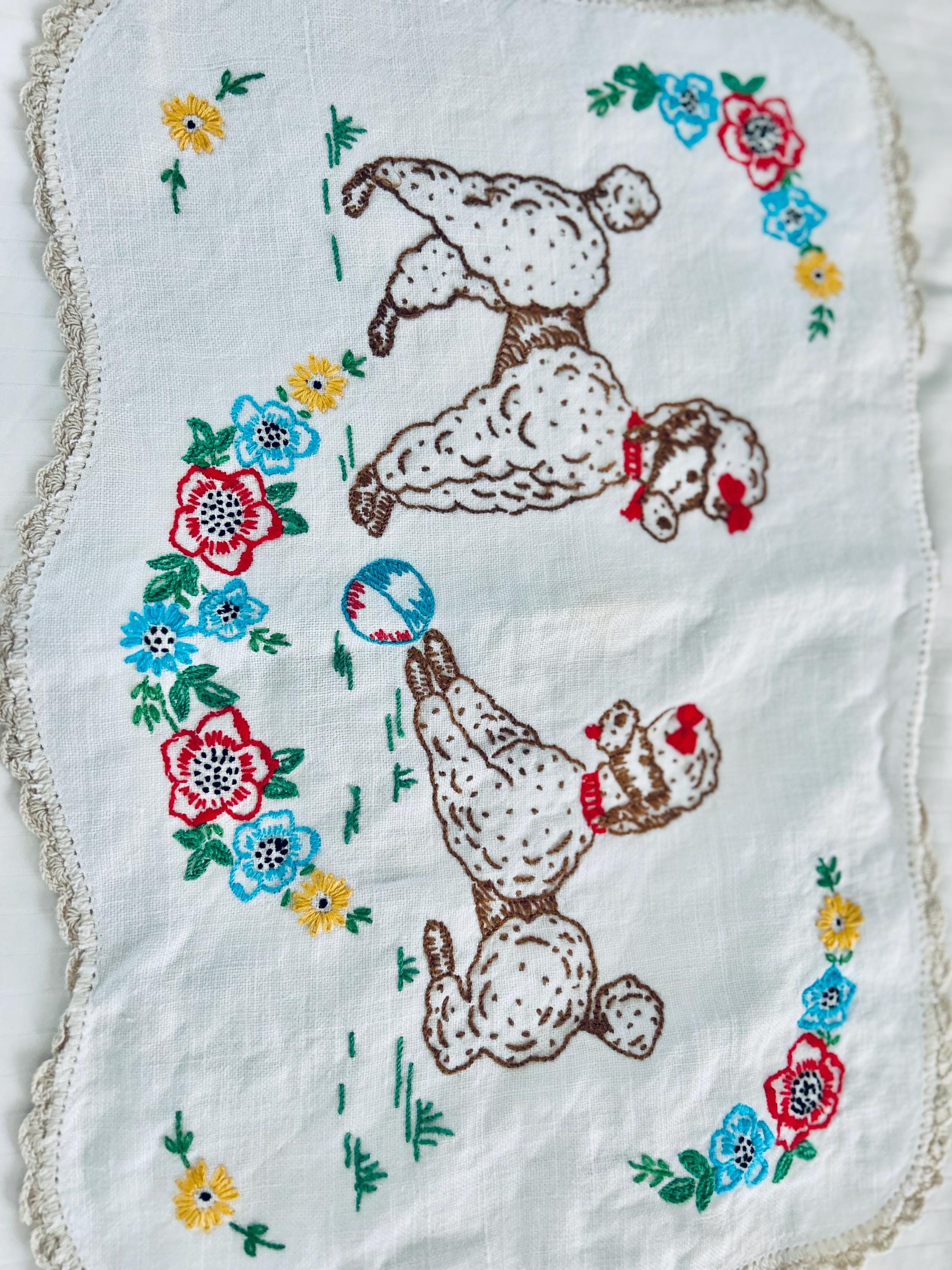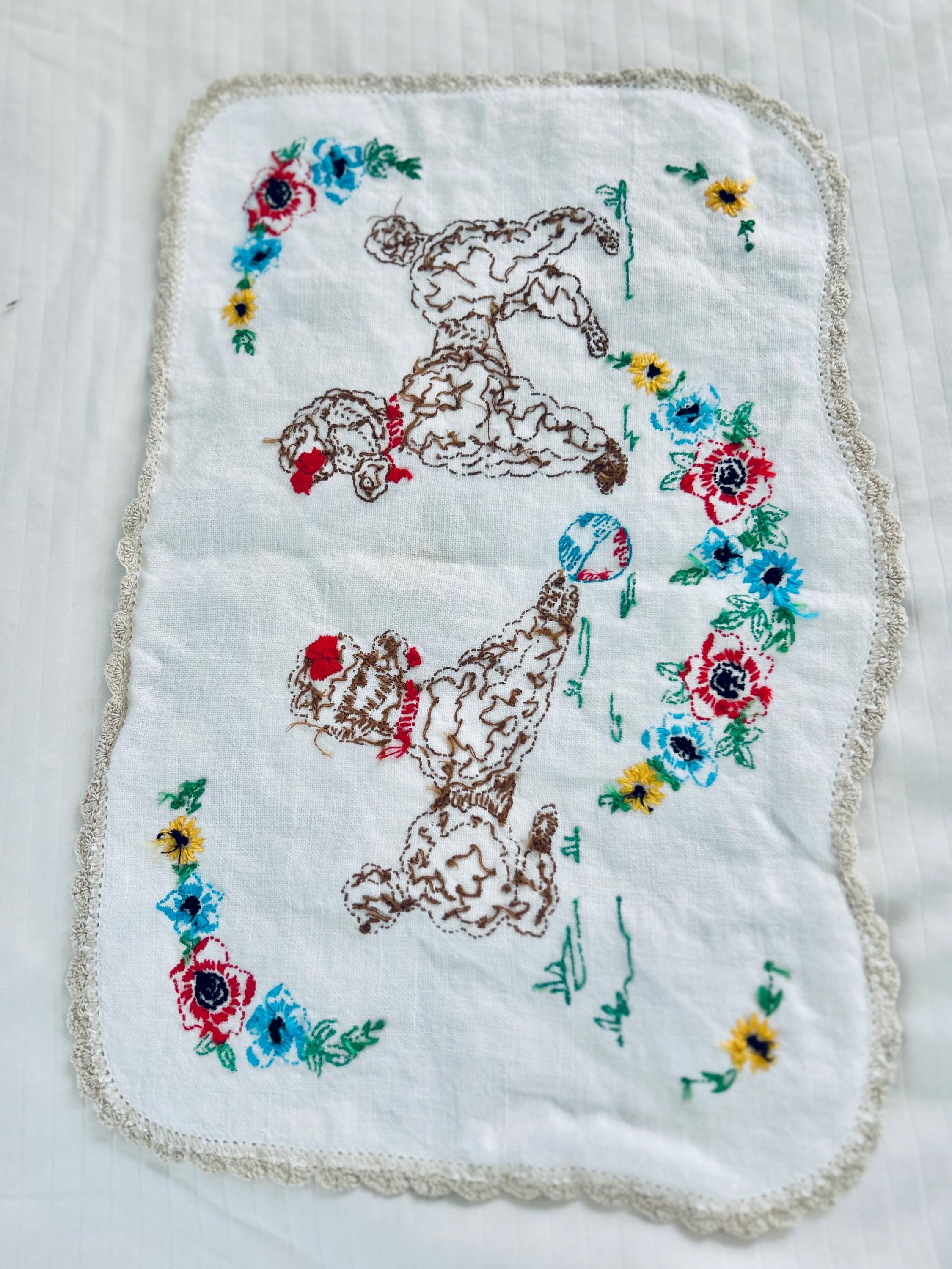 Vintage Hand-Embroidered Poodle Table Ma with tatted border; Poodle table runner; 1950s; 10" by 15"