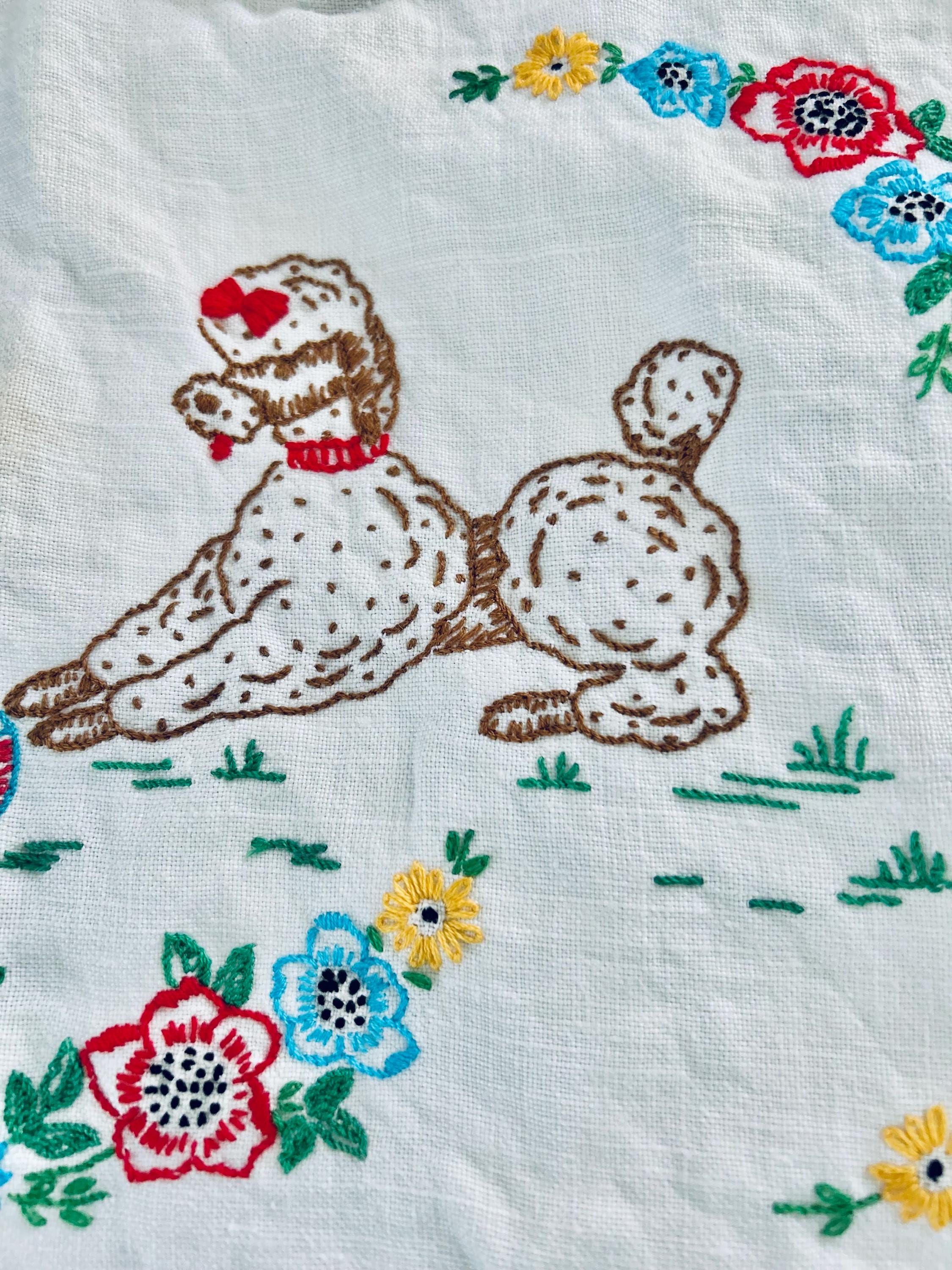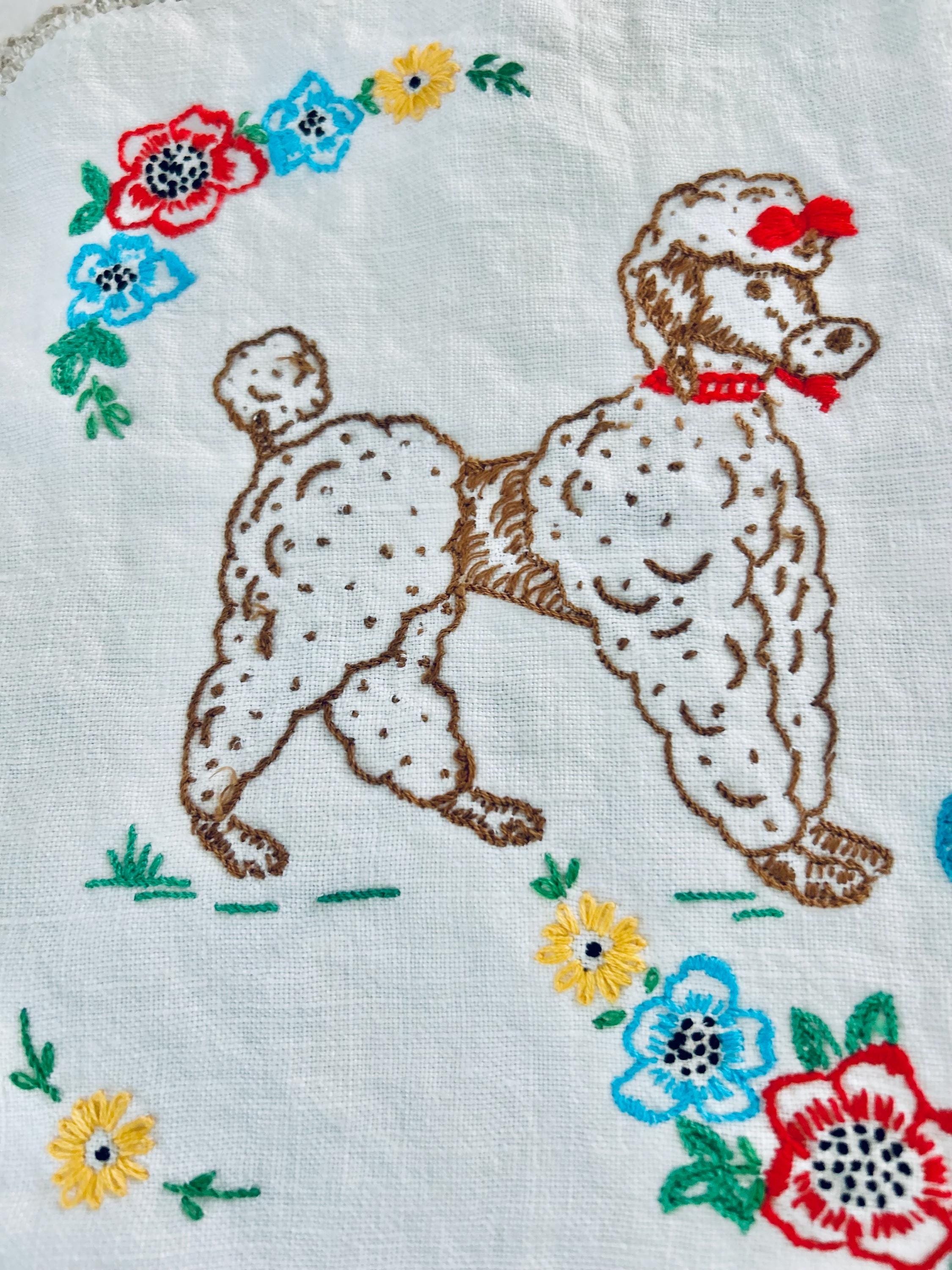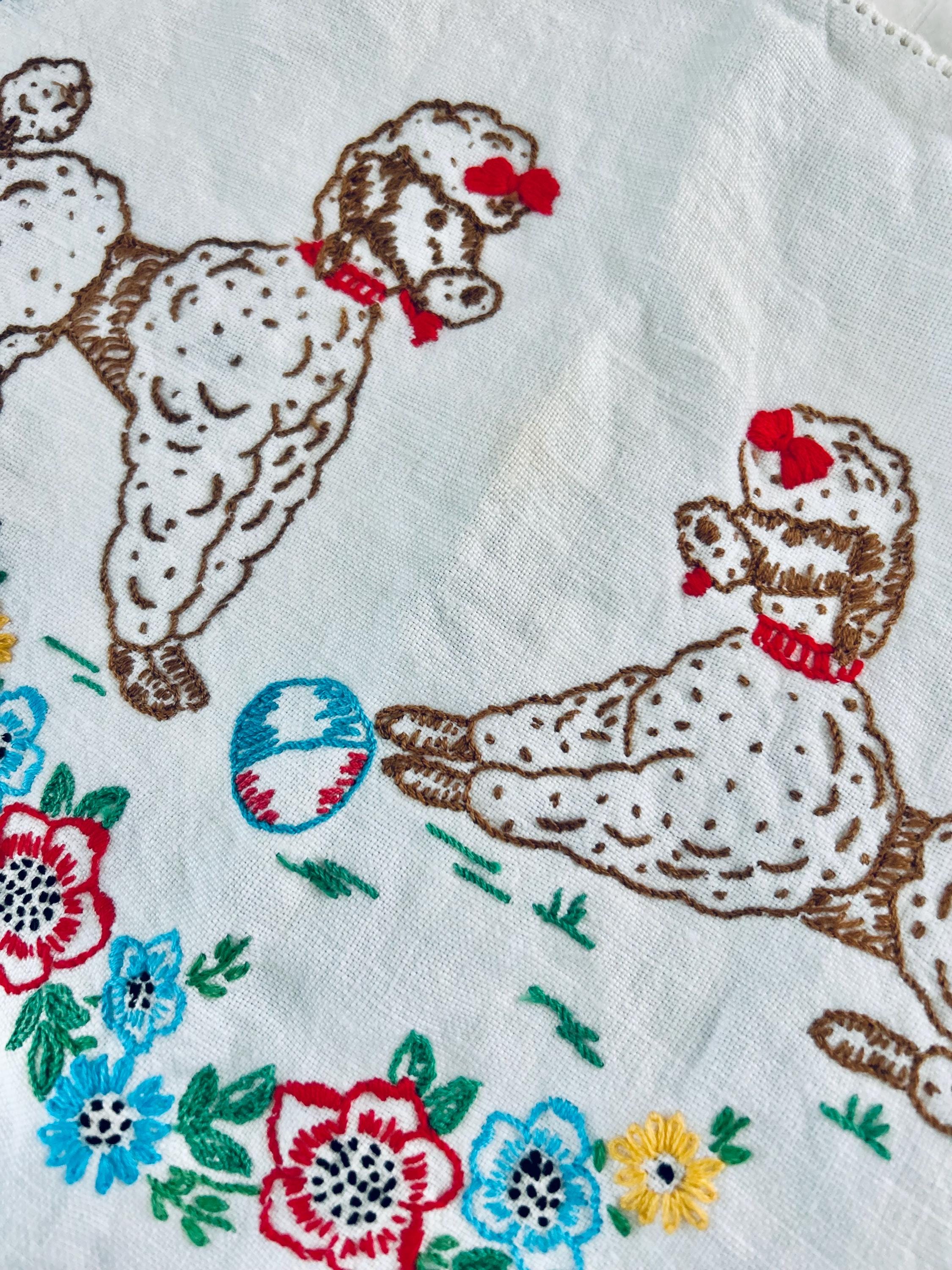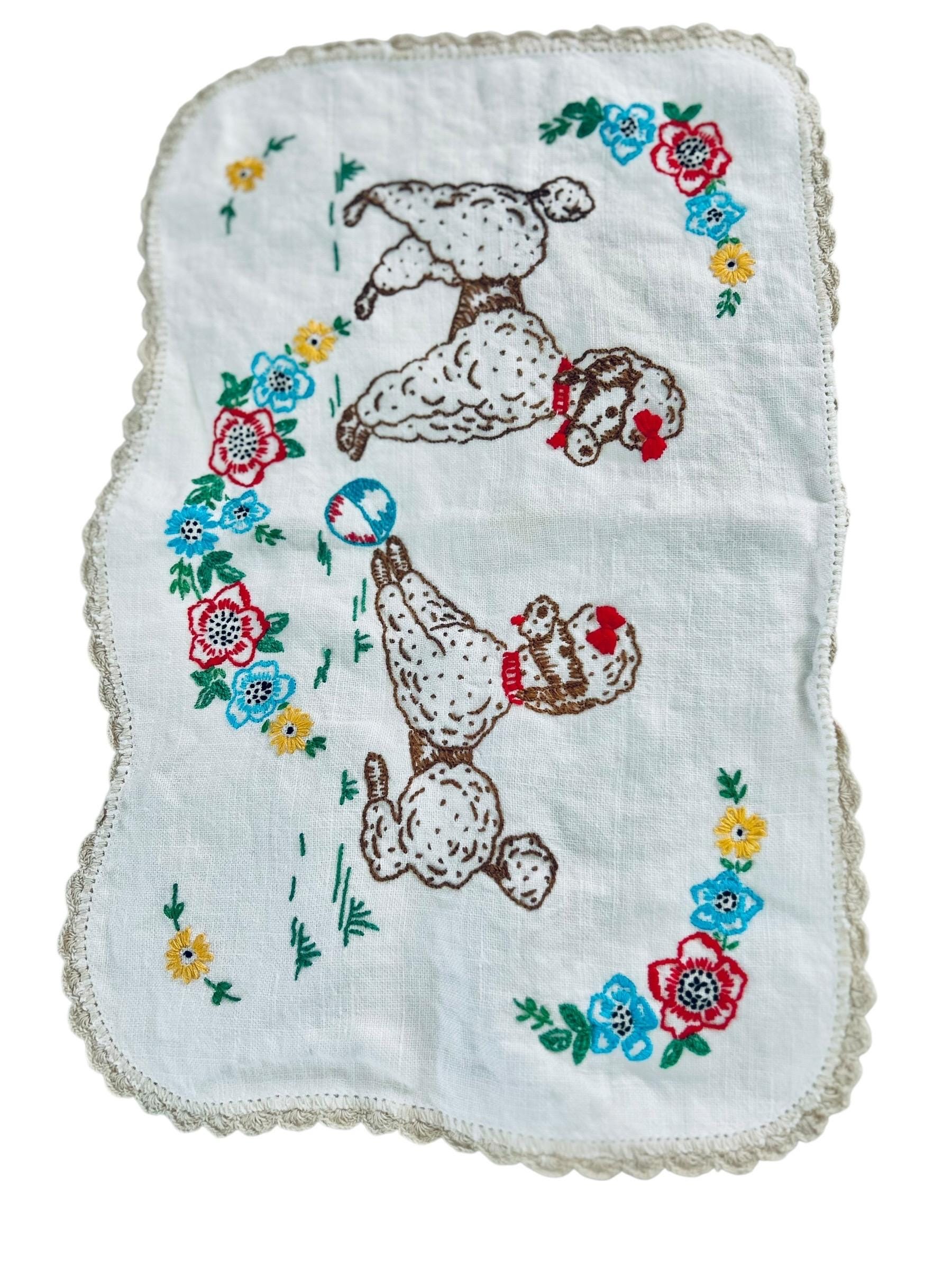 Vintage Hand-Embroidered Poodle Table Ma with tatted border; Poodle table runner; 1950s; 10" by 15"
