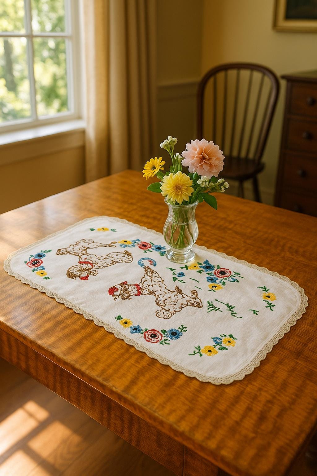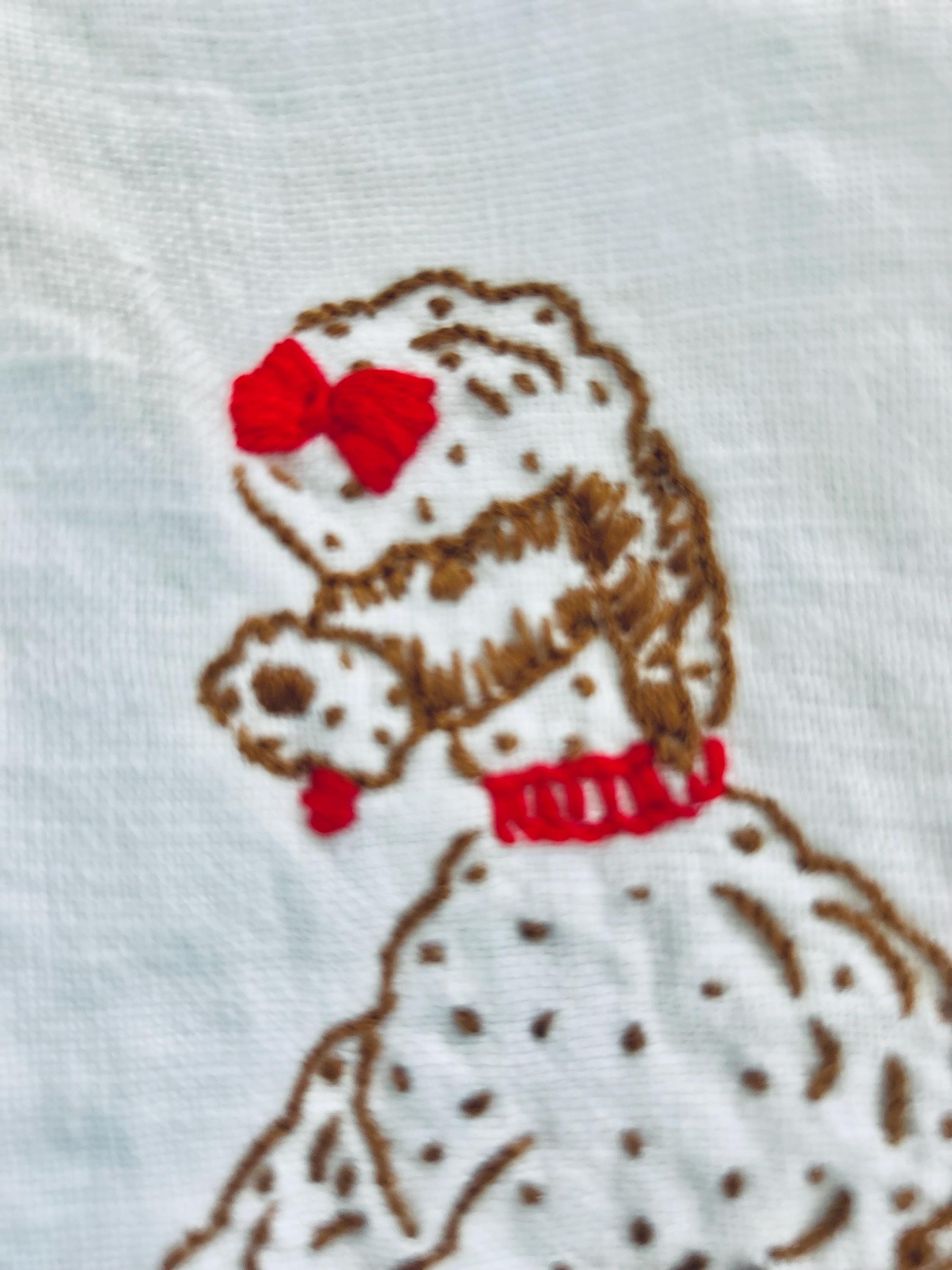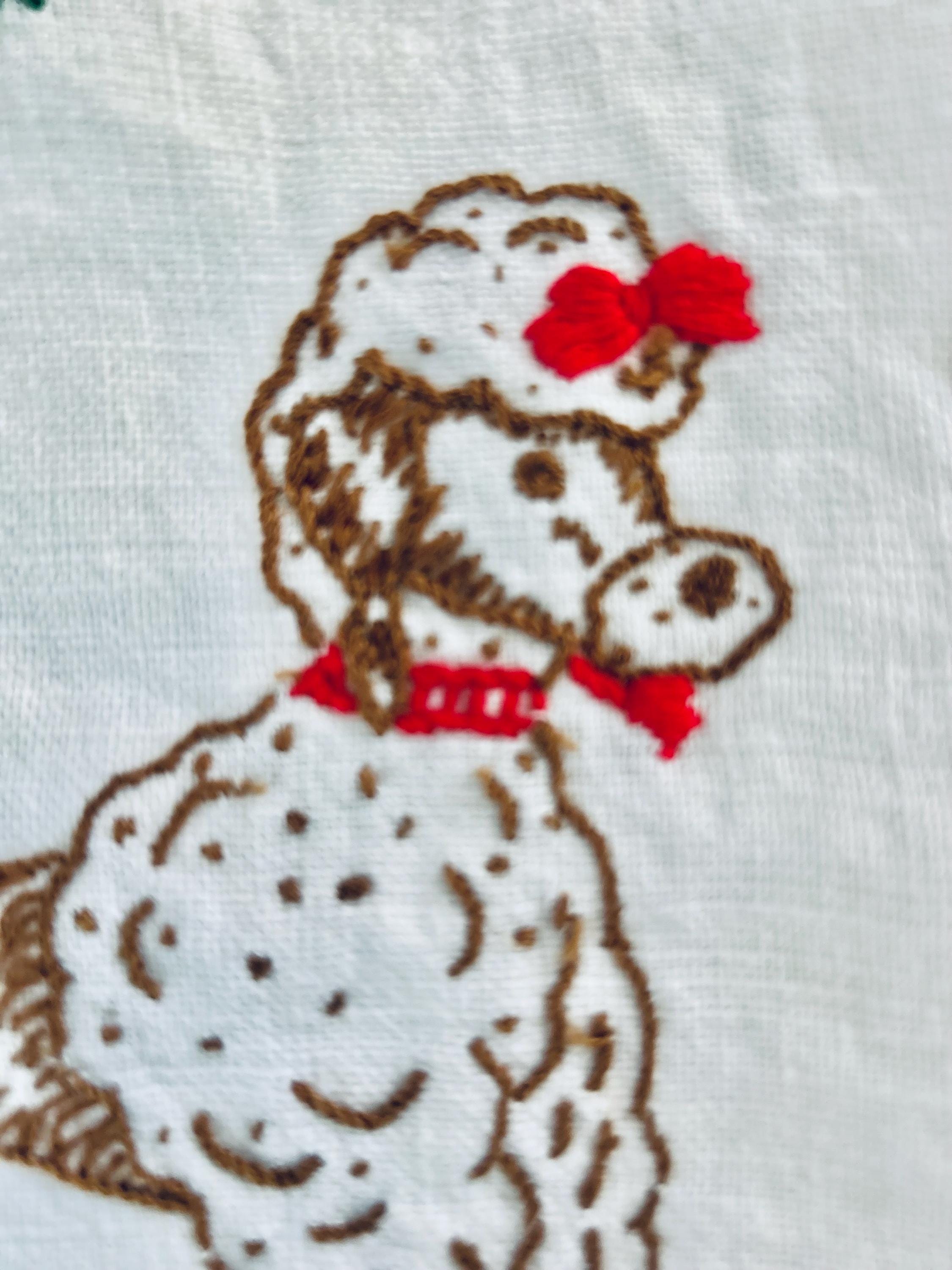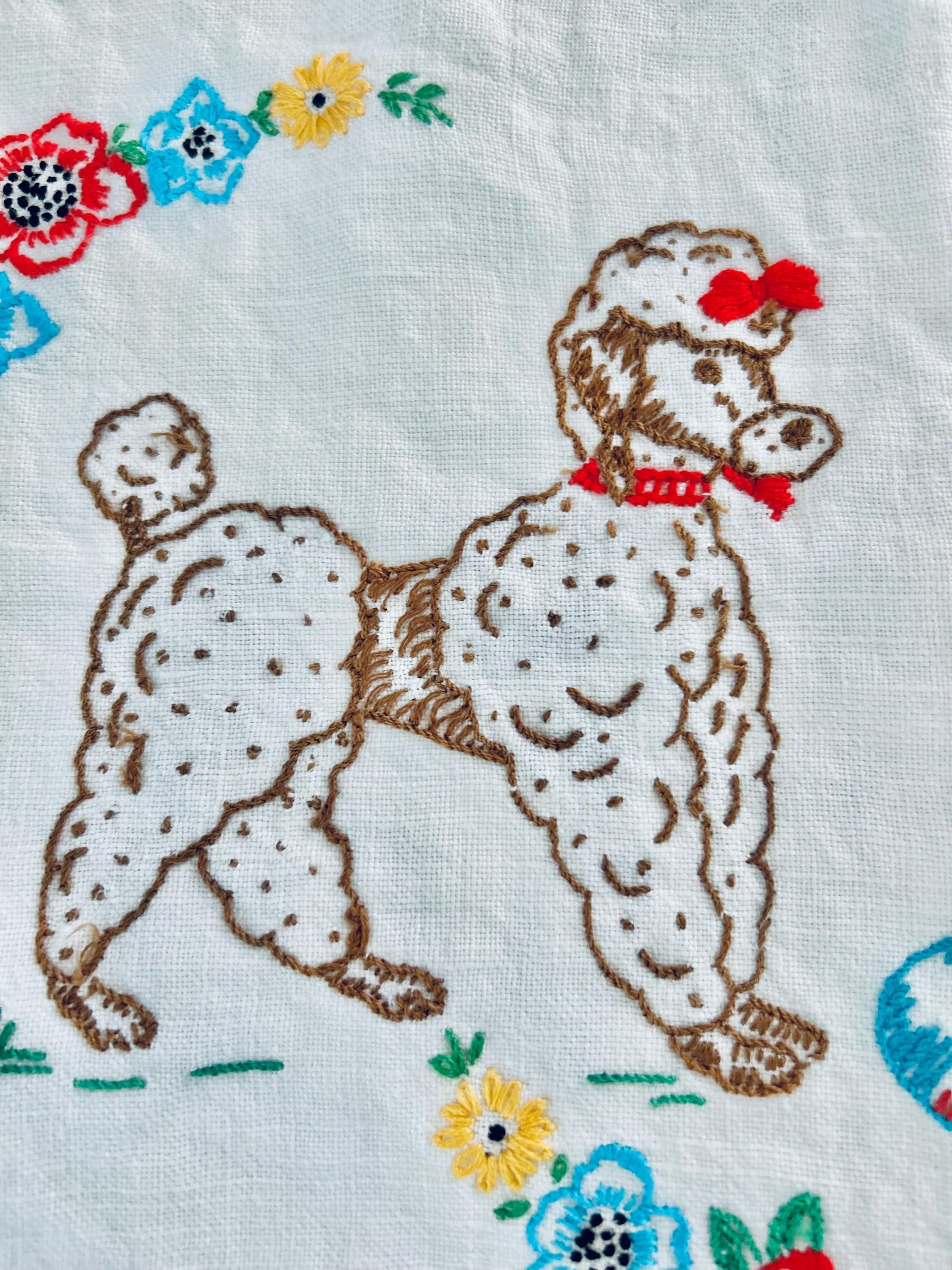 Vintage Hand-Embroidered Poodle Table Ma with tatted border; Poodle table runner; 1950s; 10" by 15"