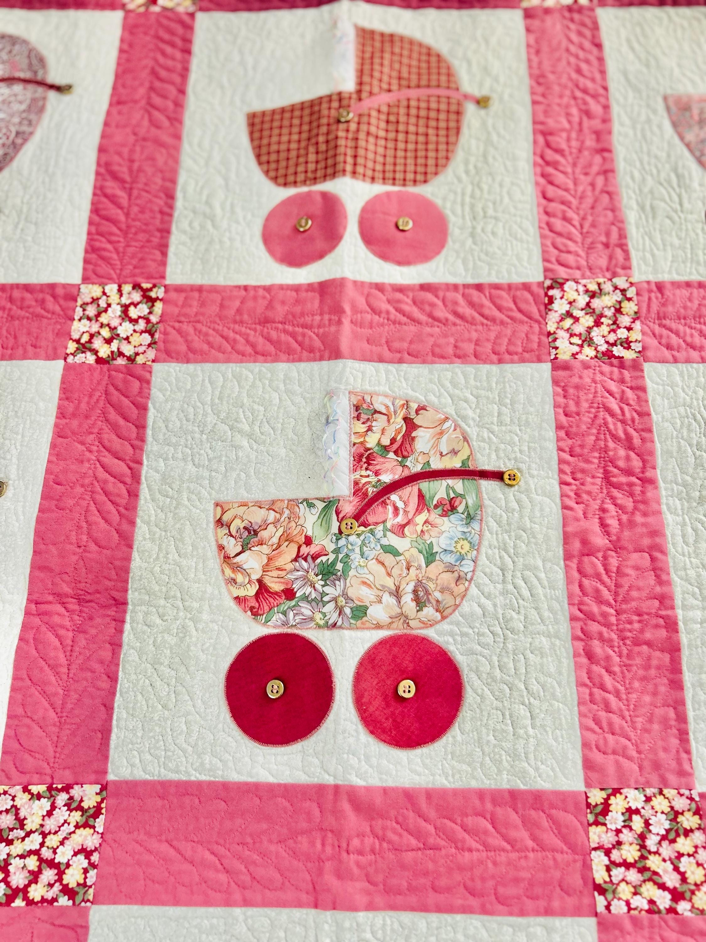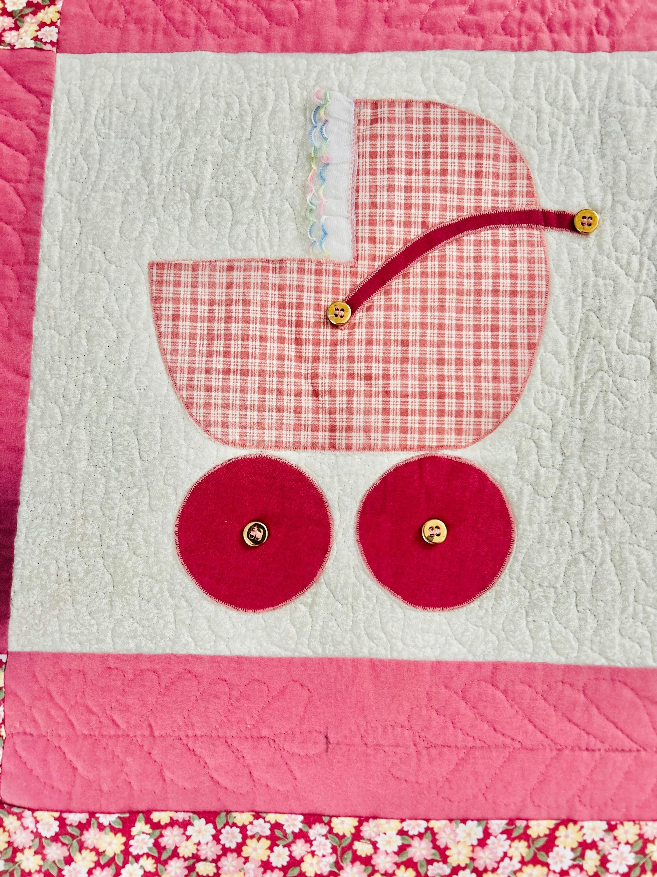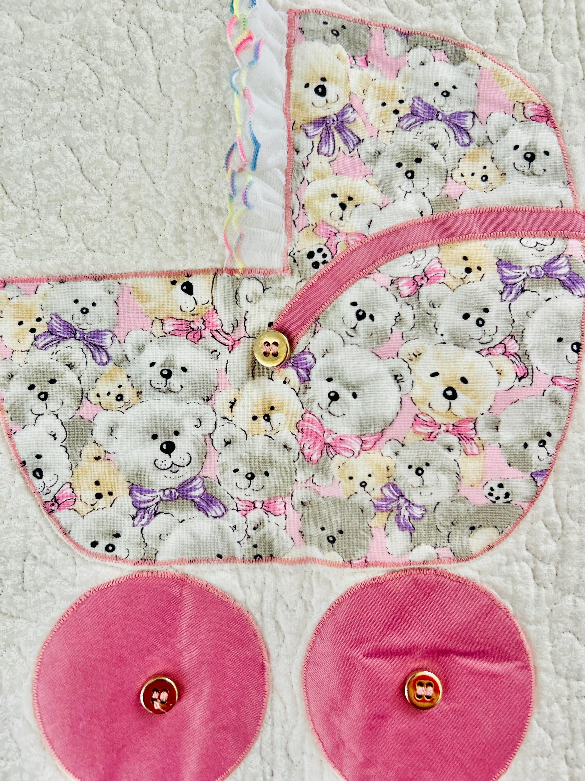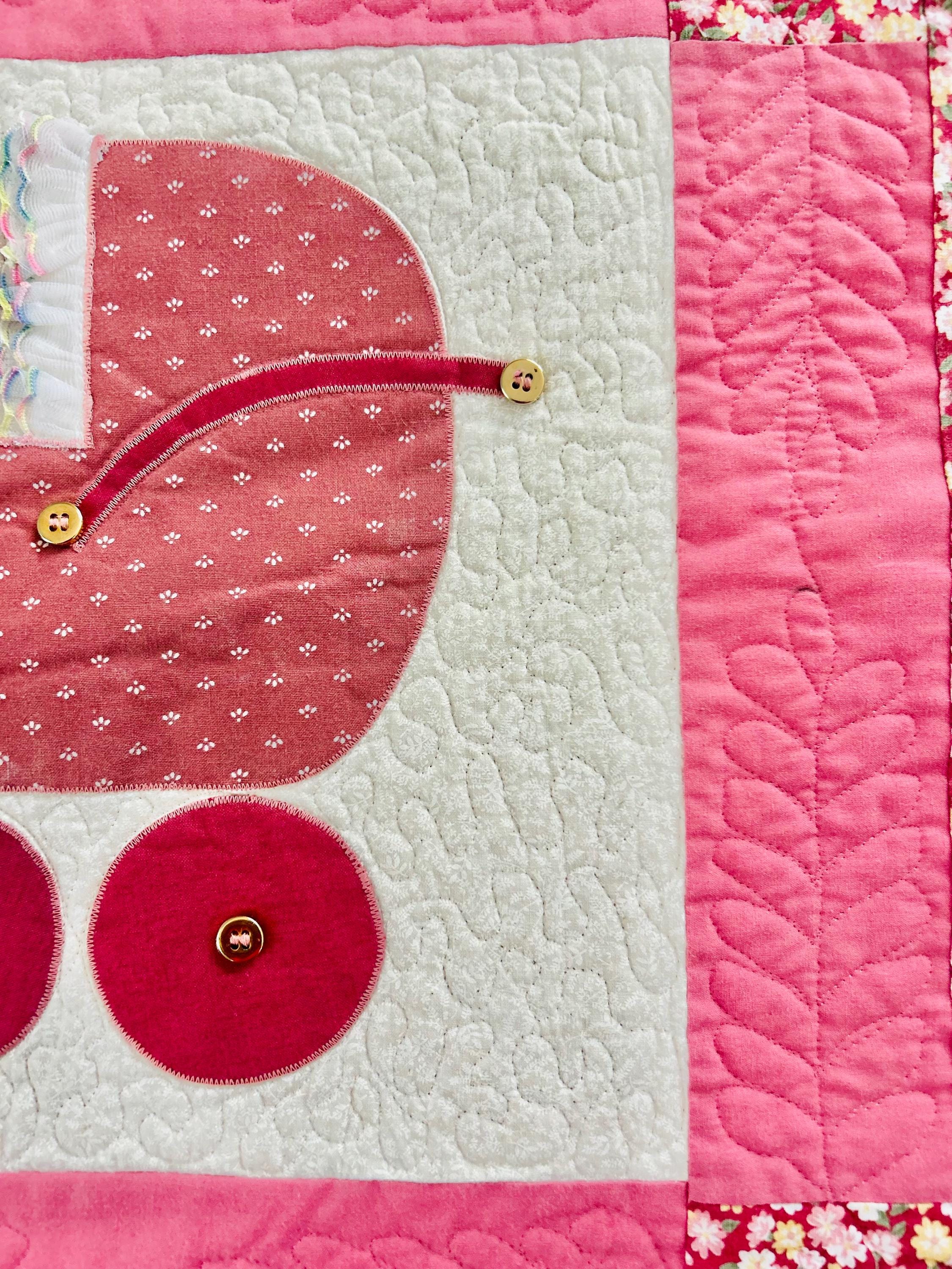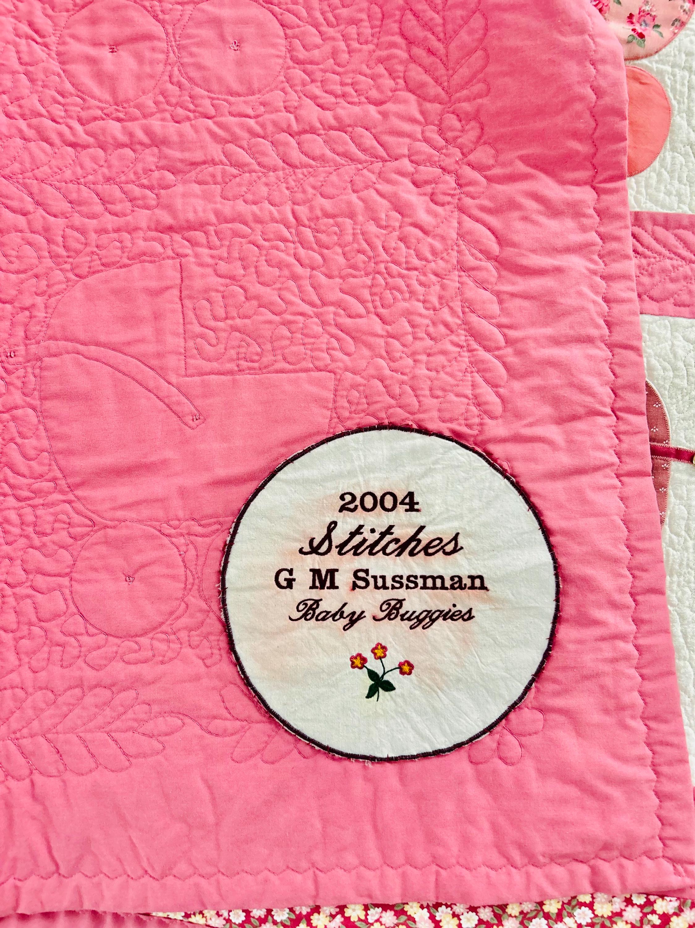 Very Sweet "Baby Buggies" Quilt signed "G.M. Sussman" and dated 2004, this quilt is intricately longarm quilted in feathers and curlicues. It is machine embroidered around the "buggies" which have embellishments like buttons and lace.