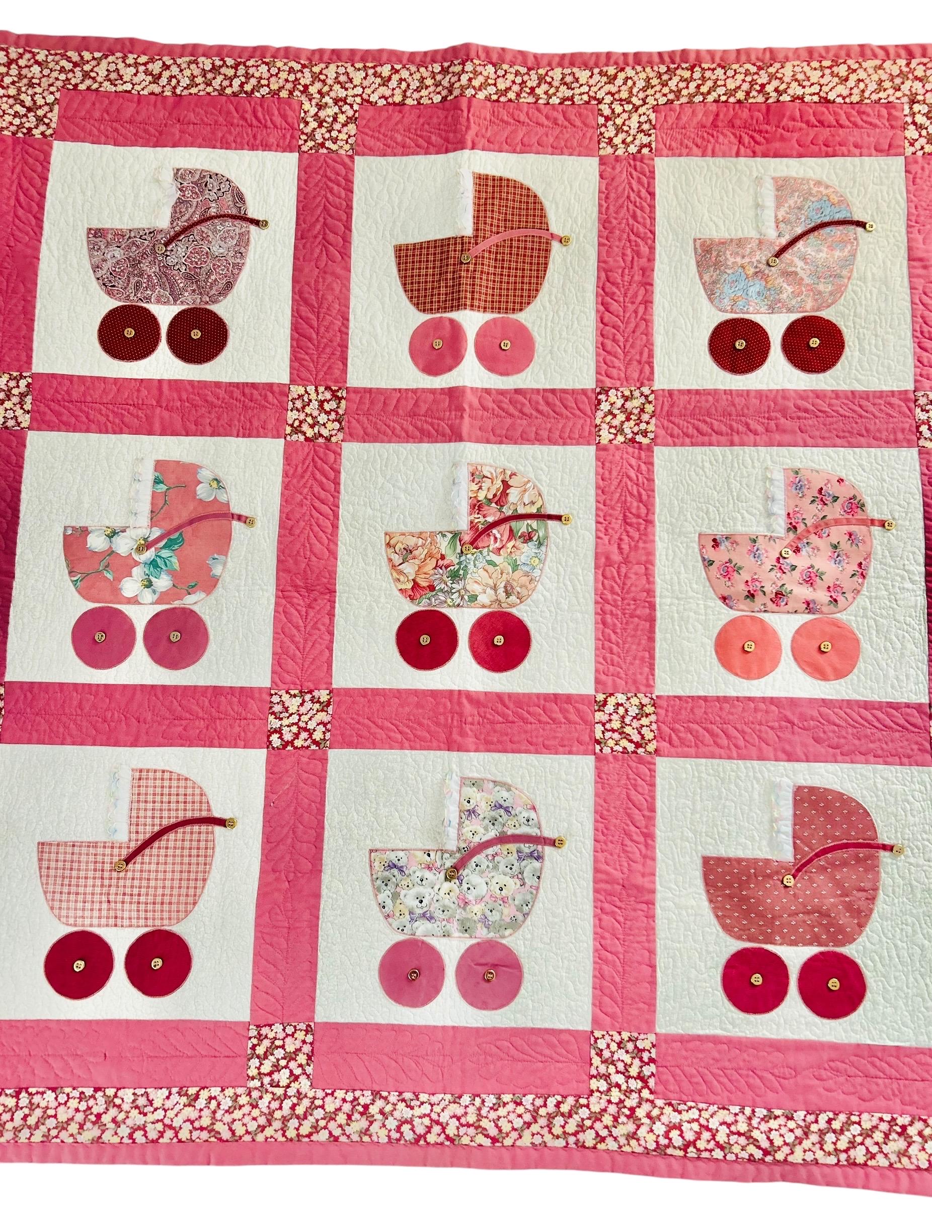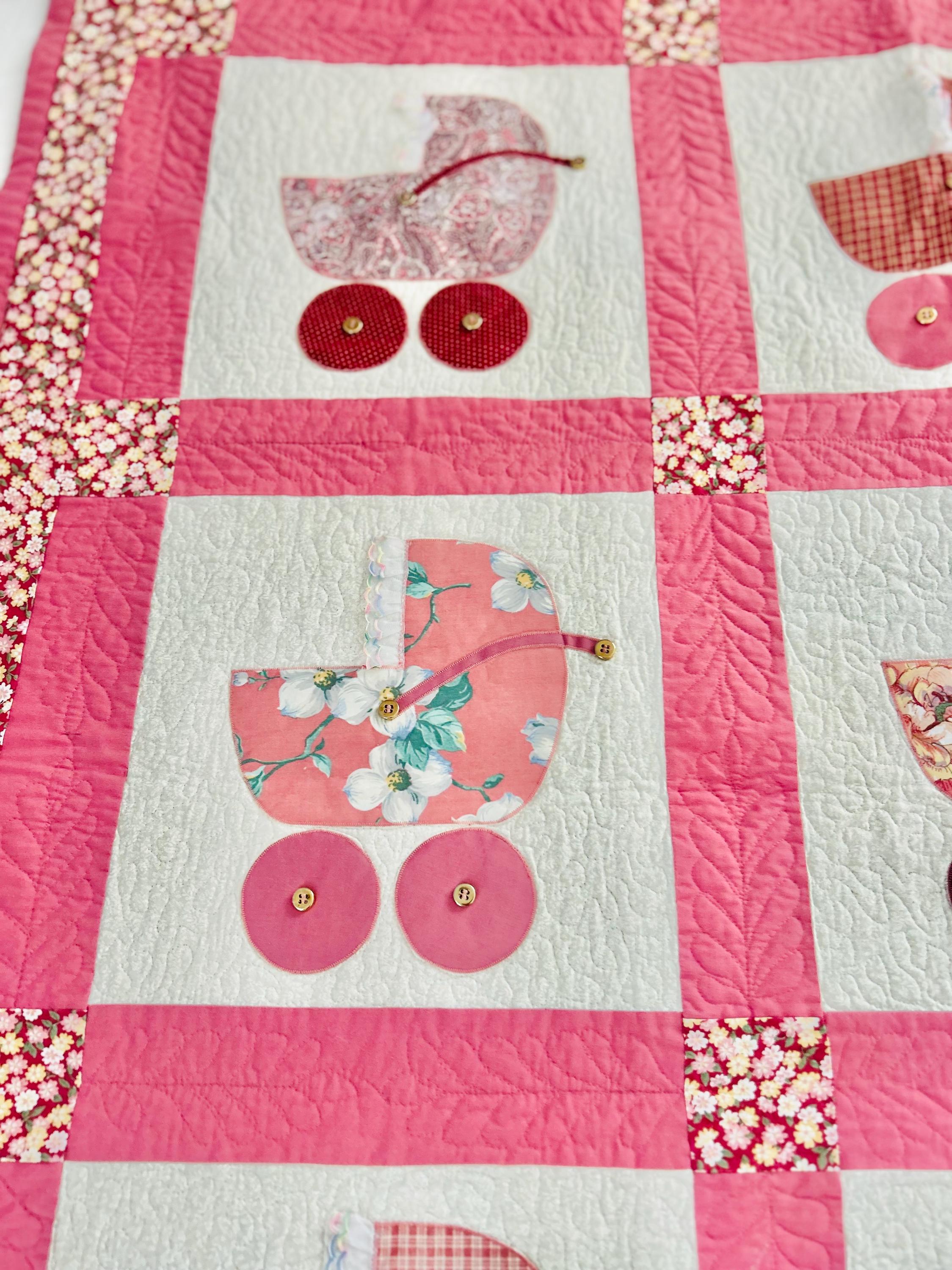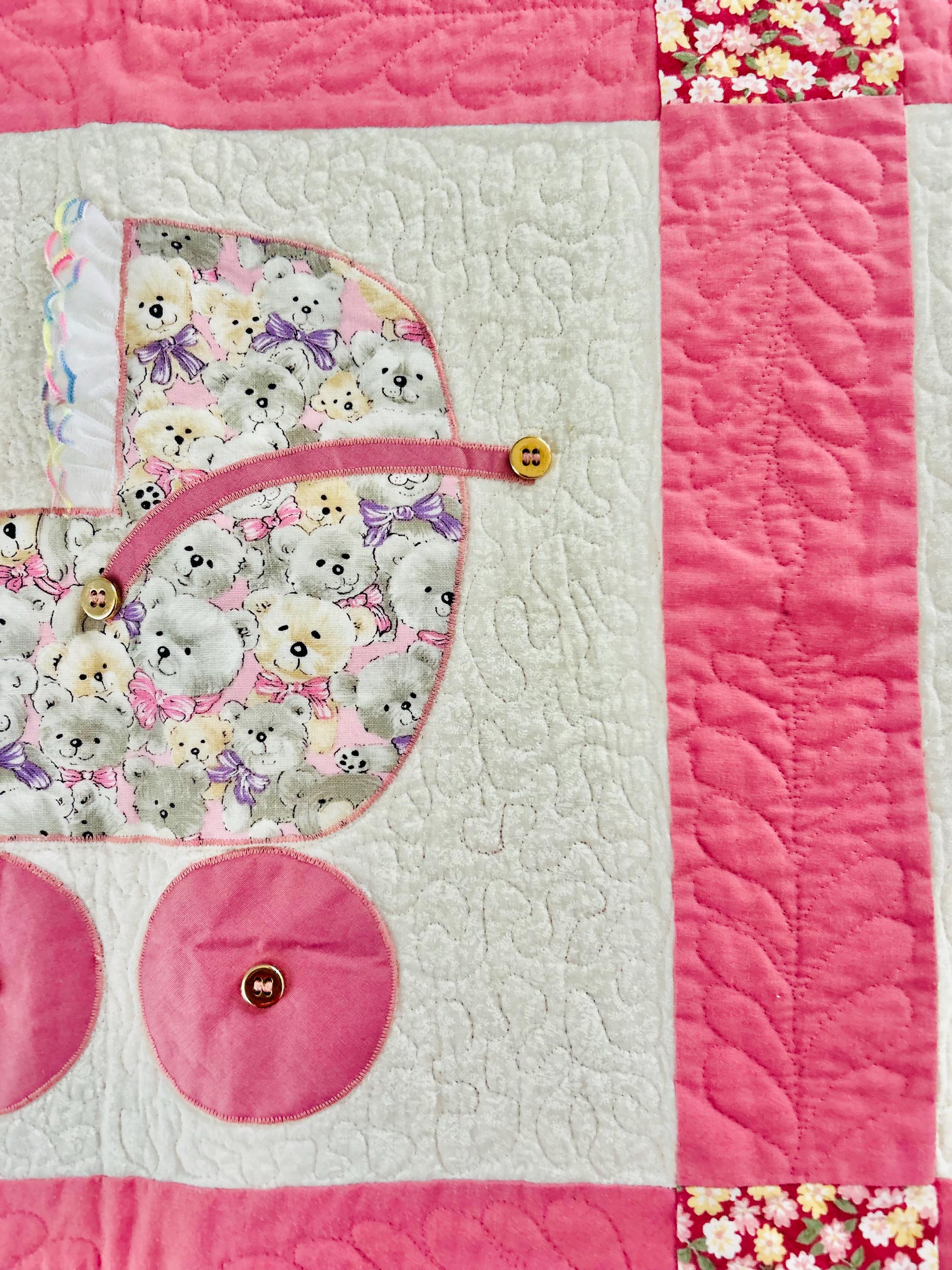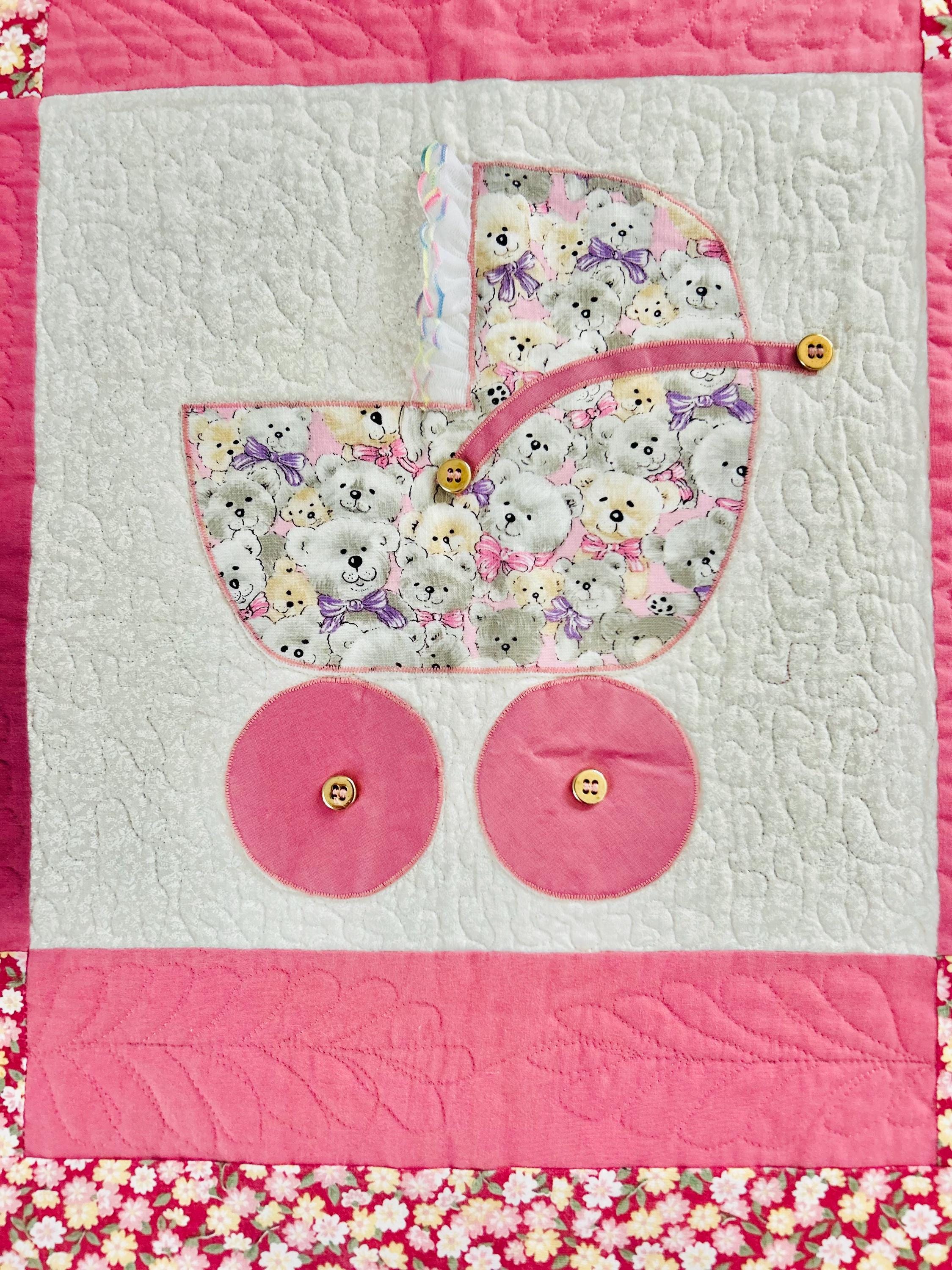 Very Sweet "Baby Buggies" Quilt signed "G.M. Sussman" and dated 2004, this quilt is intricately longarm quilted in feathers and curlicues. It is machine embroidered around the "buggies" which have embellishments like buttons and lace.
