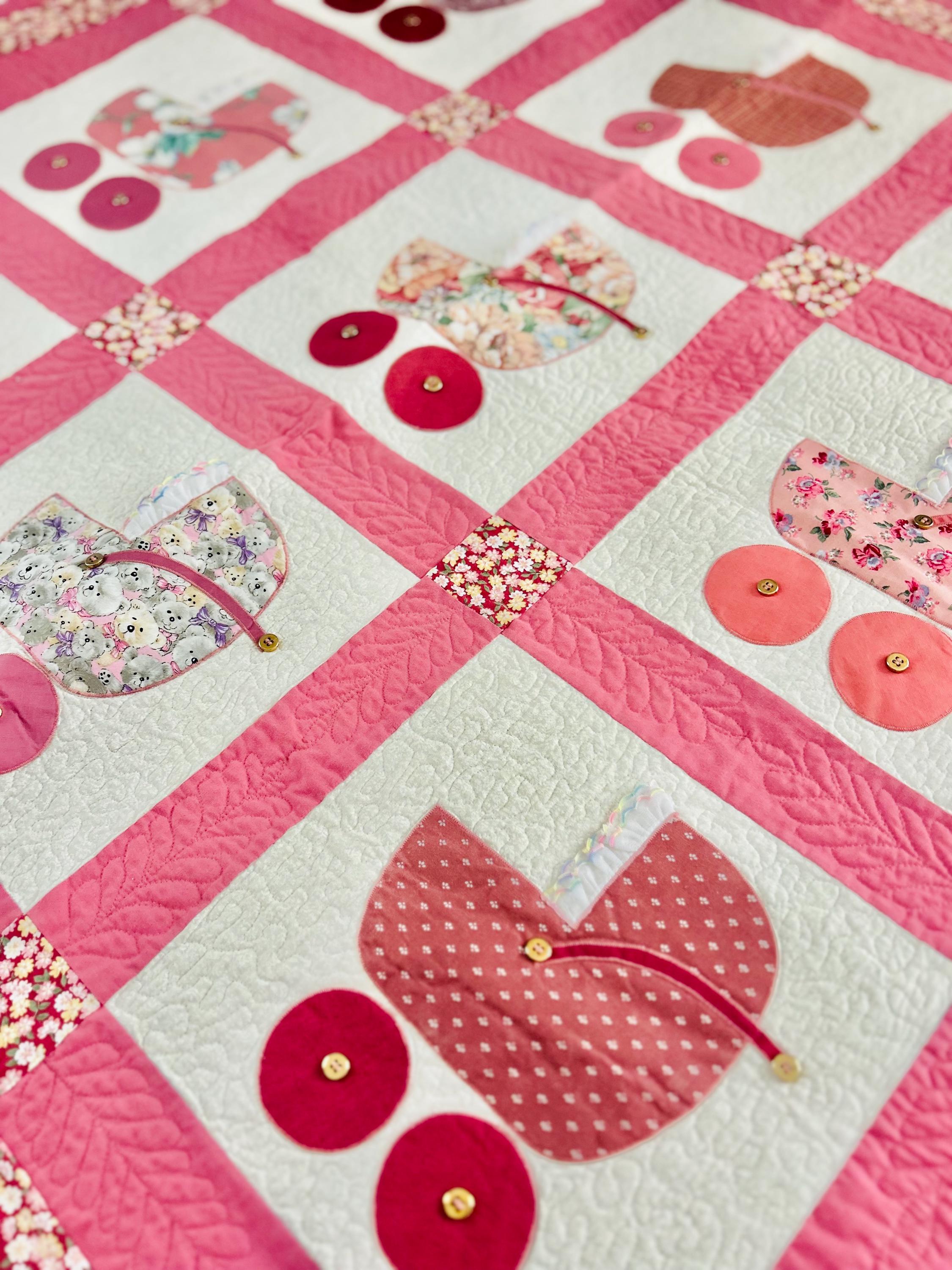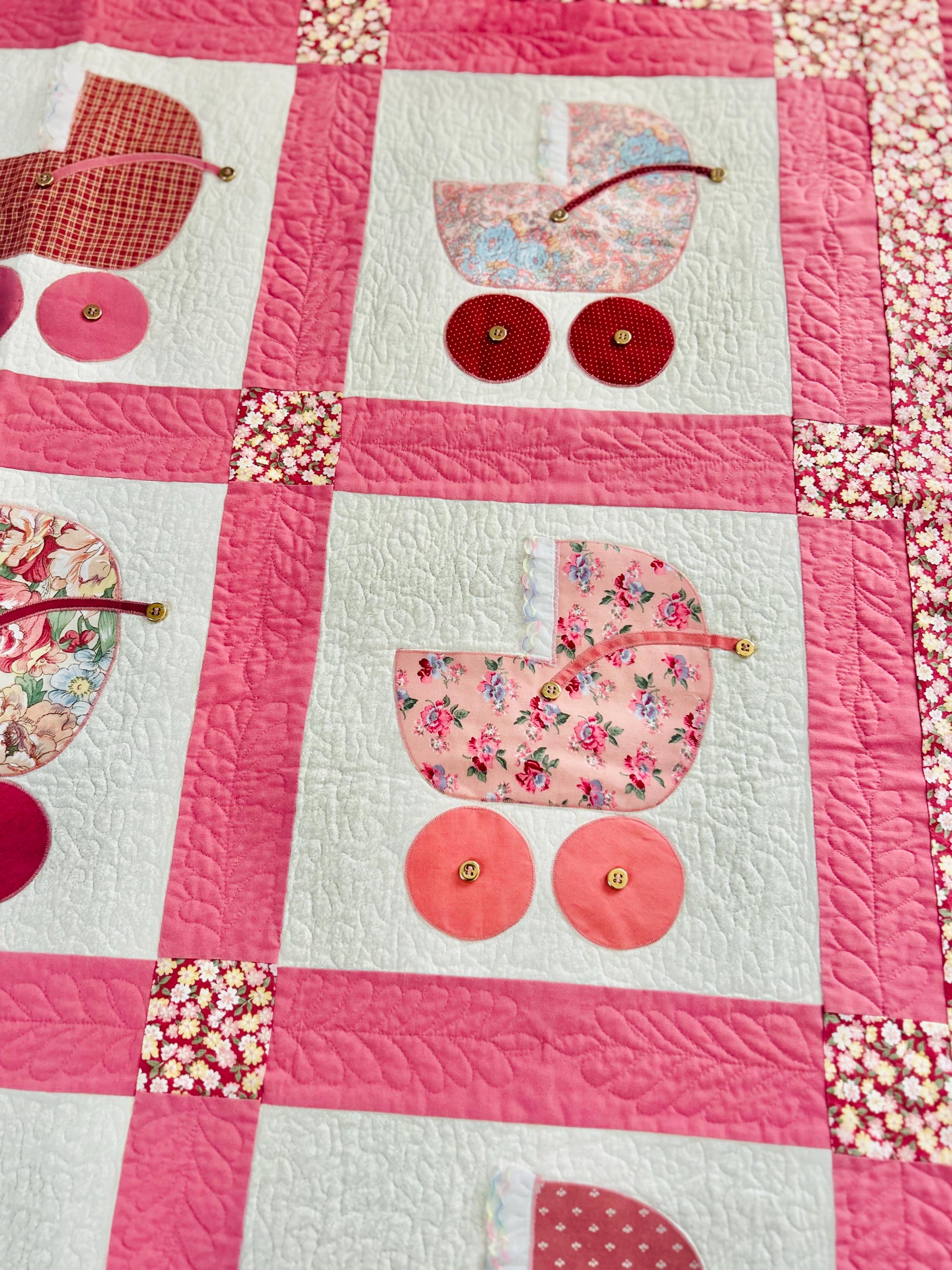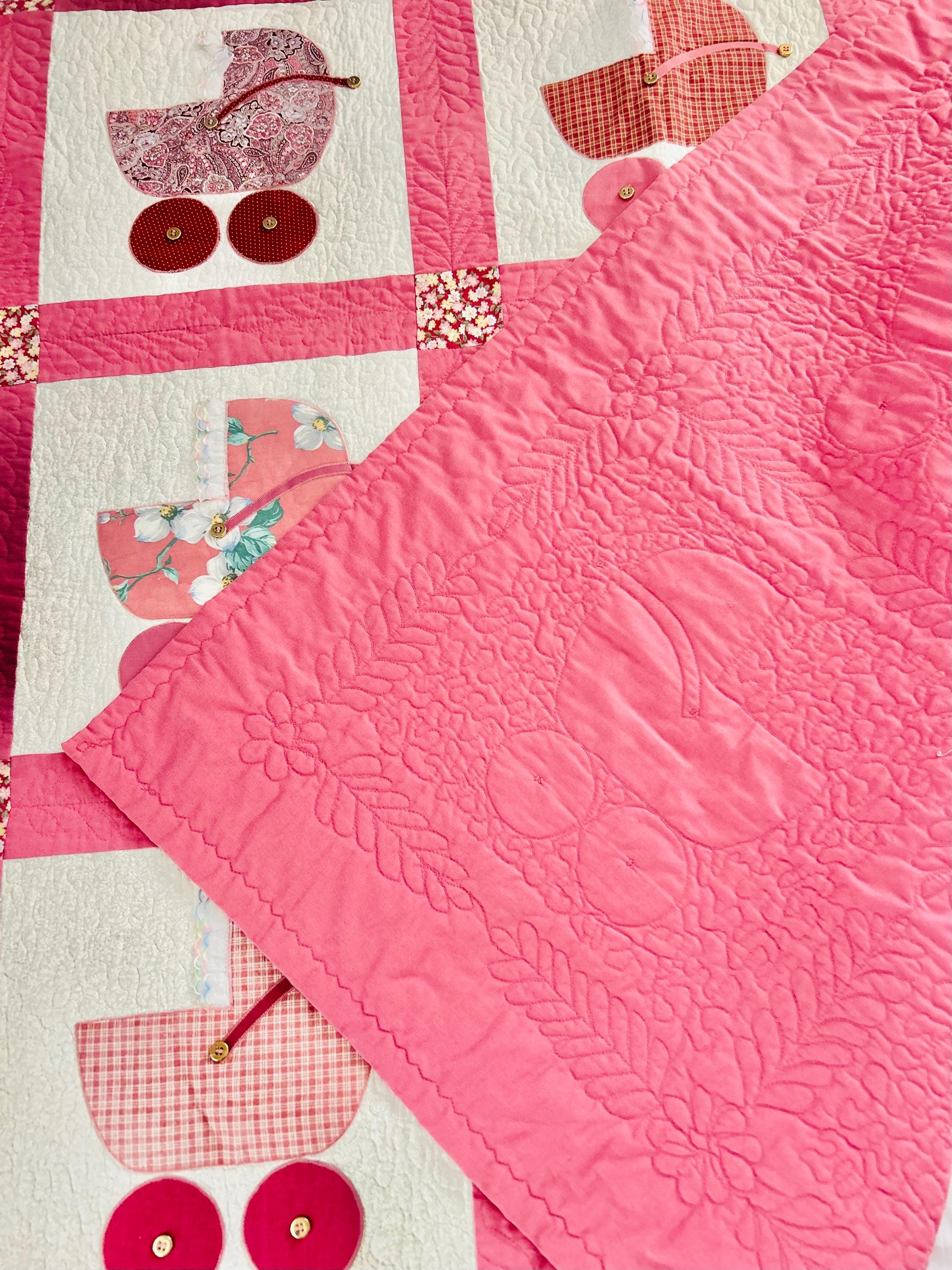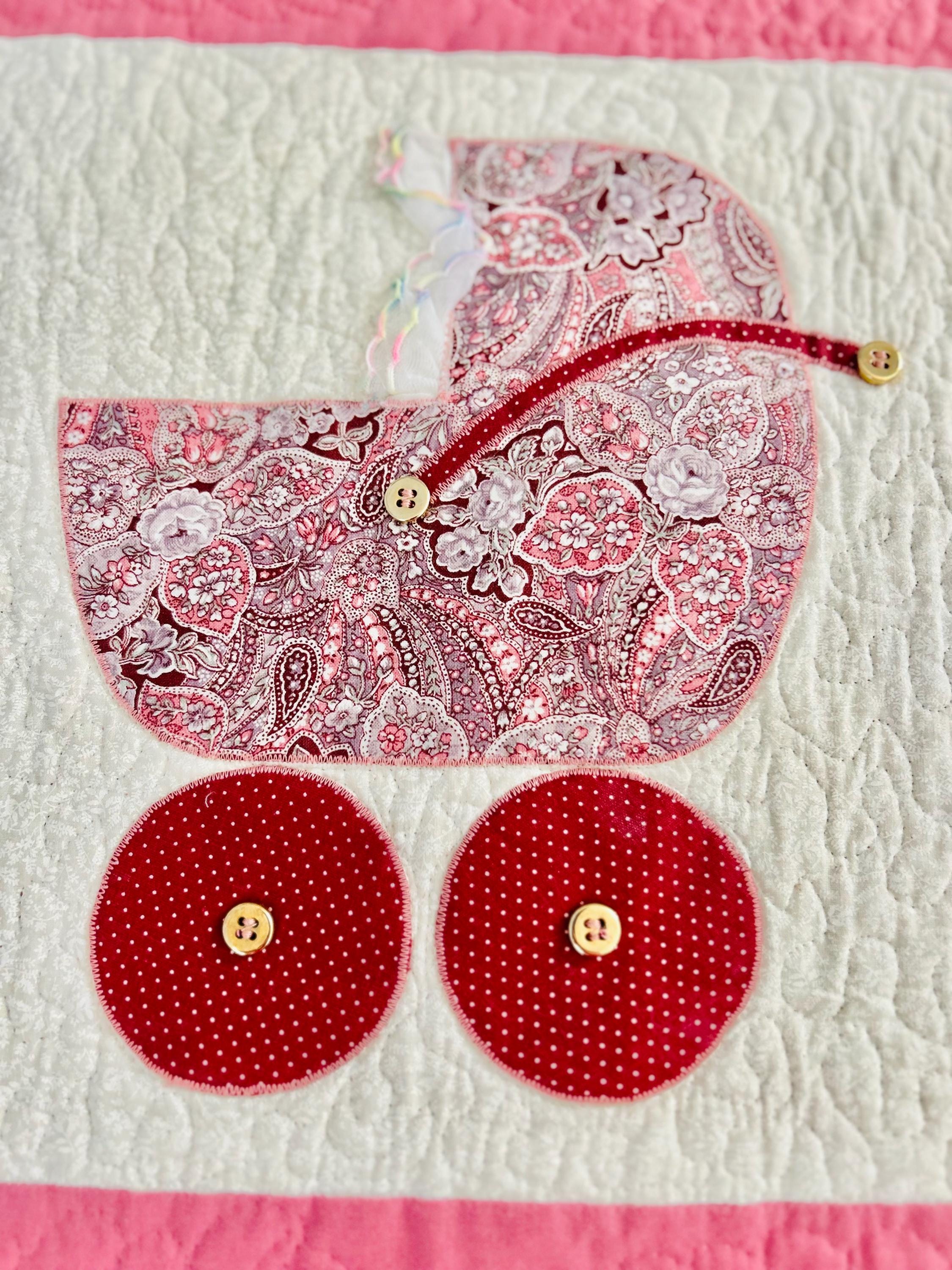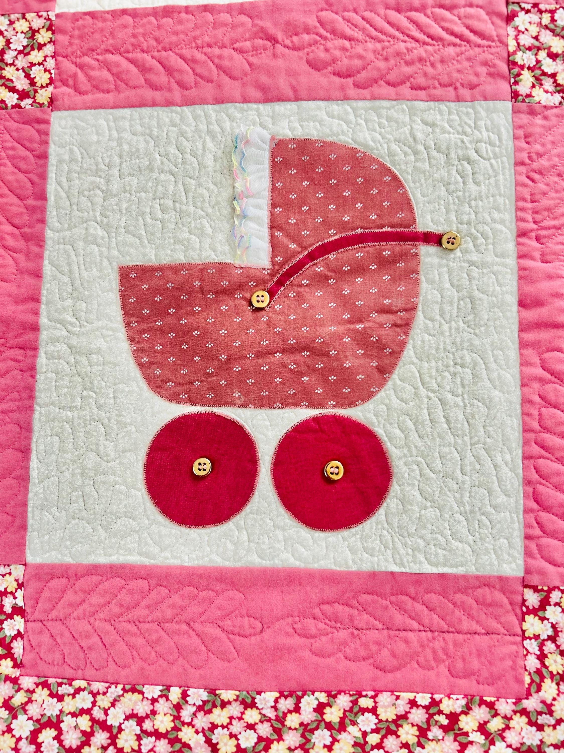 Very Sweet "Baby Buggies" Quilt signed "G.M. Sussman" and dated 2004, this quilt is intricately longarm quilted in feathers and curlicues. It is machine embroidered around the "buggies" which have embellishments like buttons and lace.