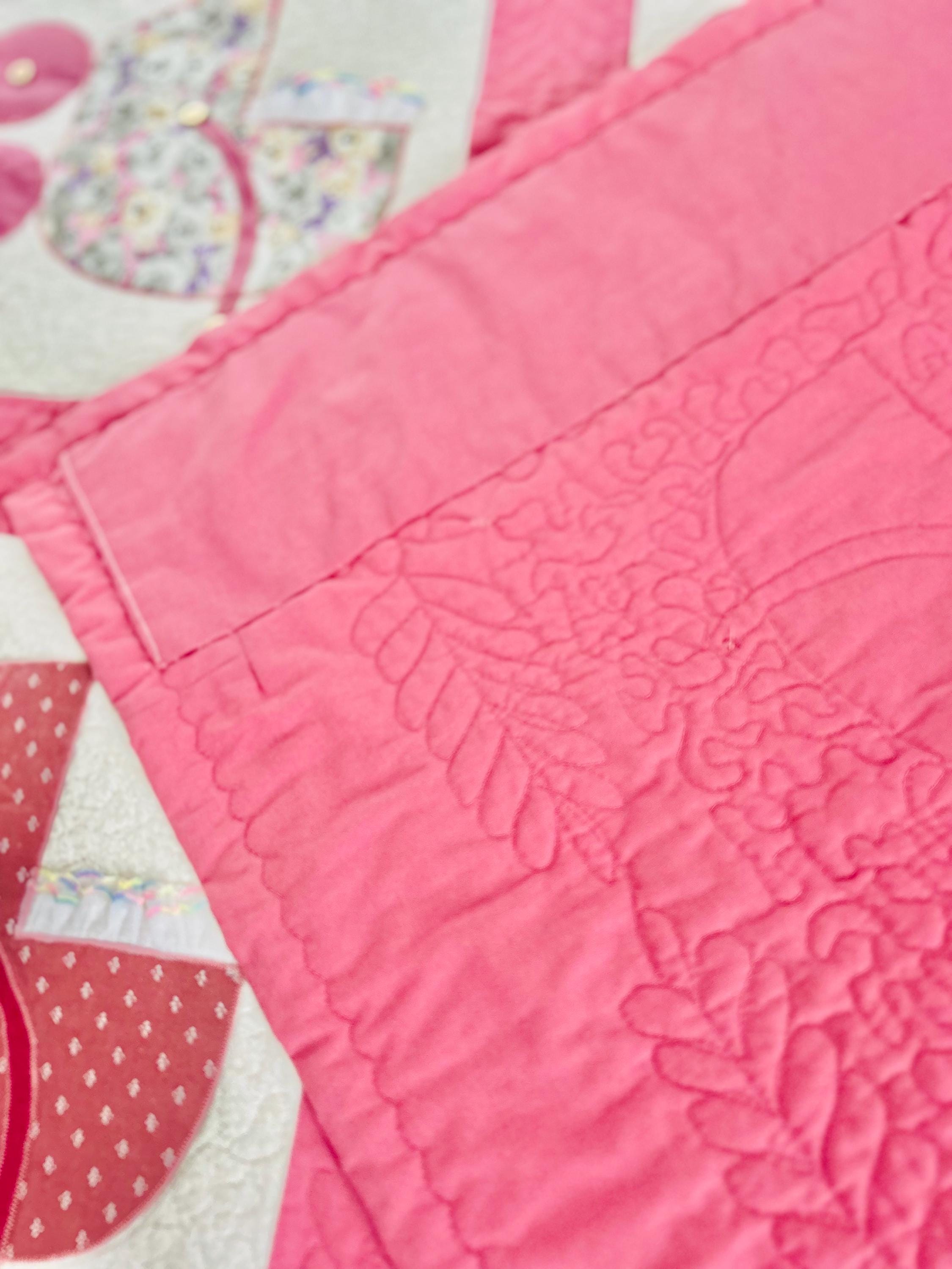 The back is a rose-colored cotton that has been turned to the front and machine-stitched to form the binding. The batting is very lightweight.