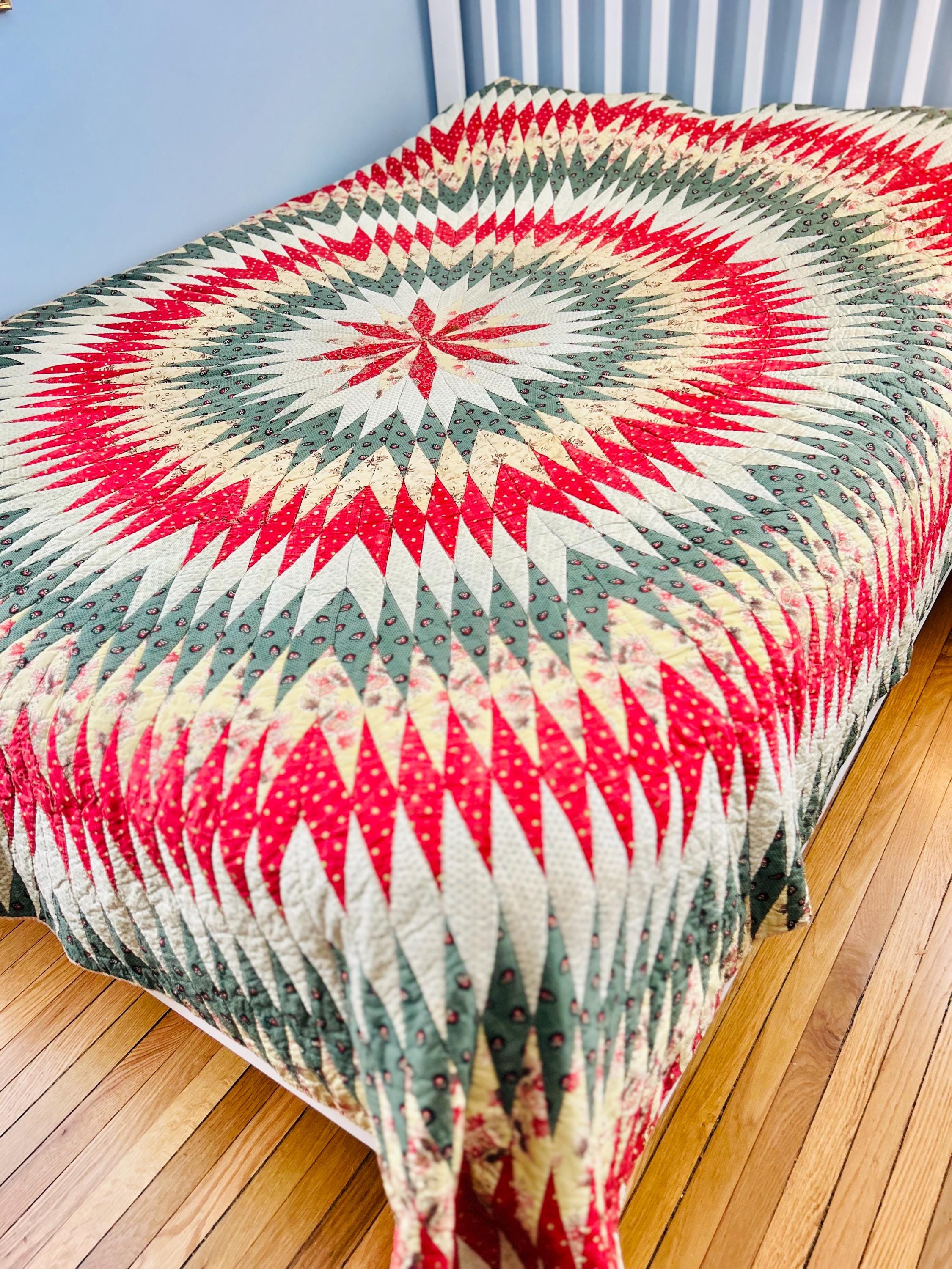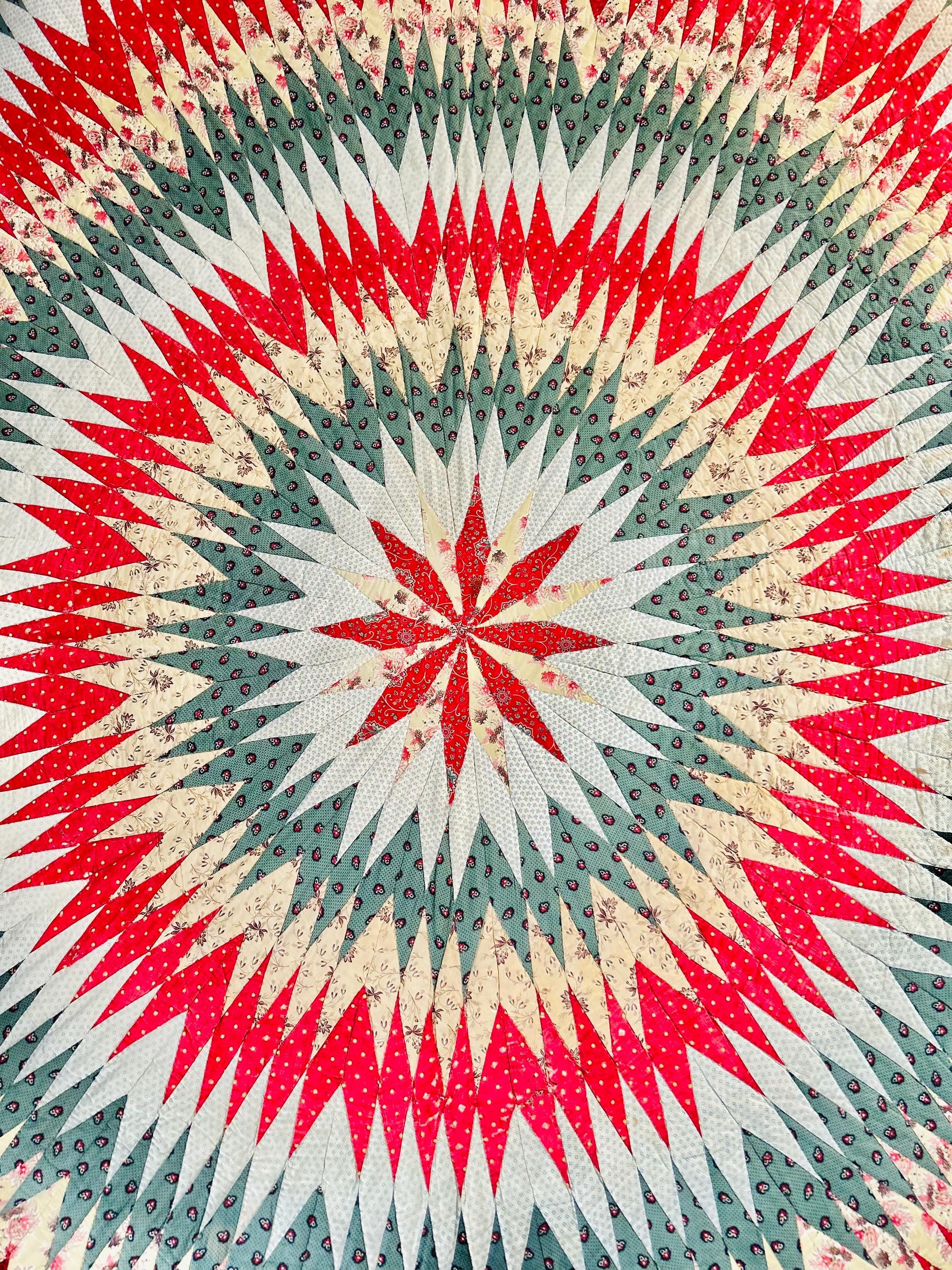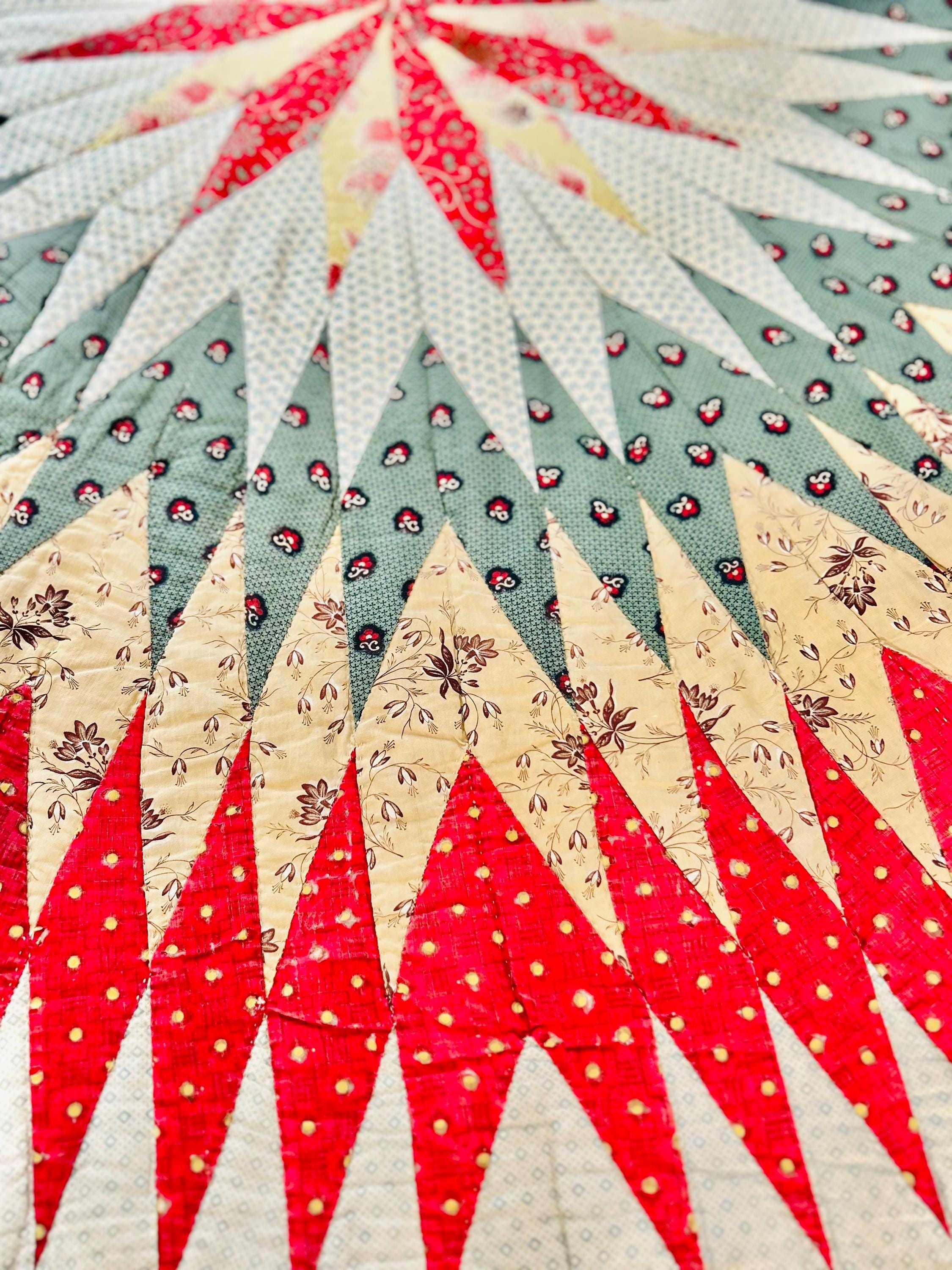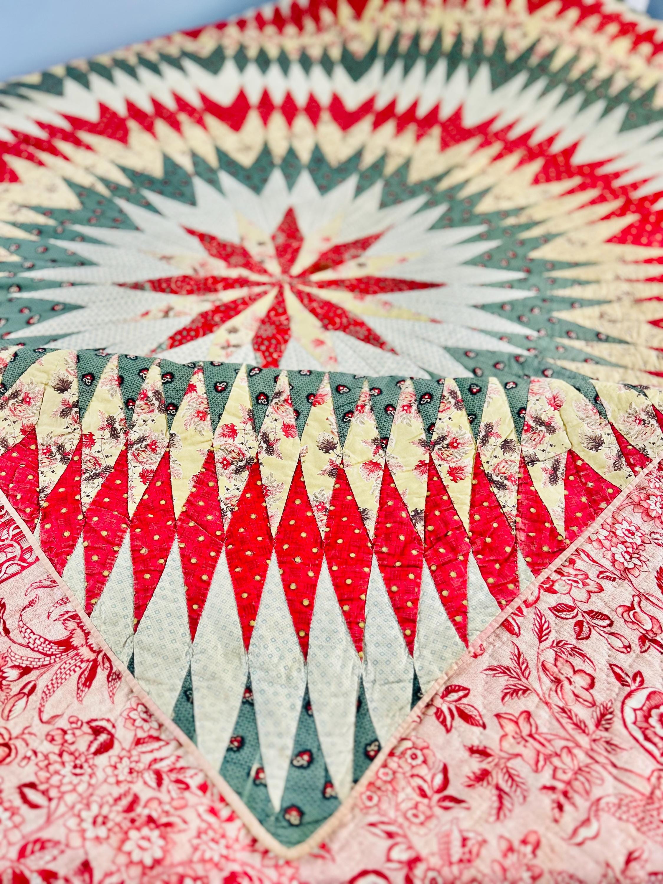 This amazing Starburst Quilt, circa 1870s, is made of unique elongated diamonds that meet dramatically in a center medallion and cascade out in waves of color. The hand-quilting is in very tiny stitches in outlines of the more than 3,000 diamonds.