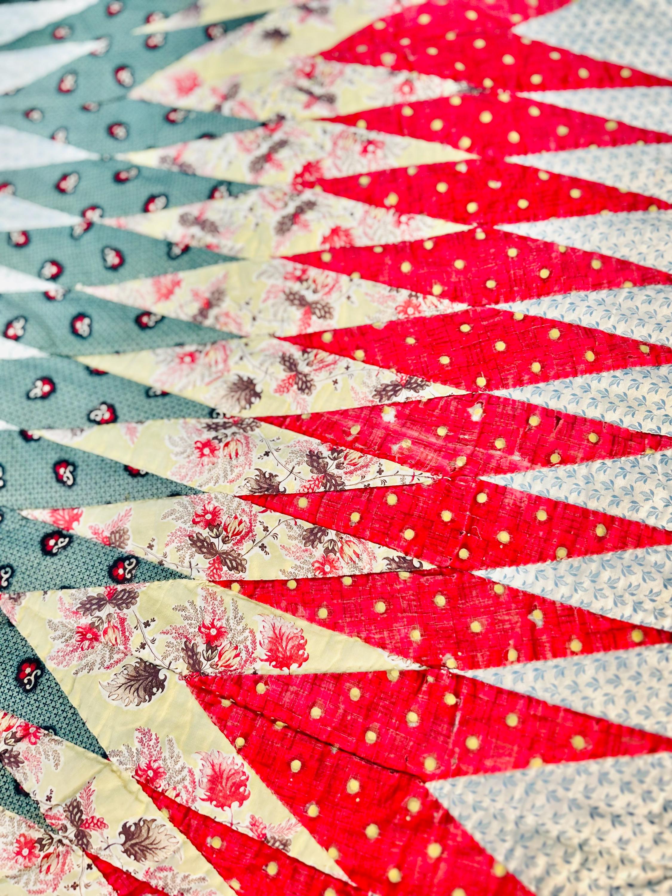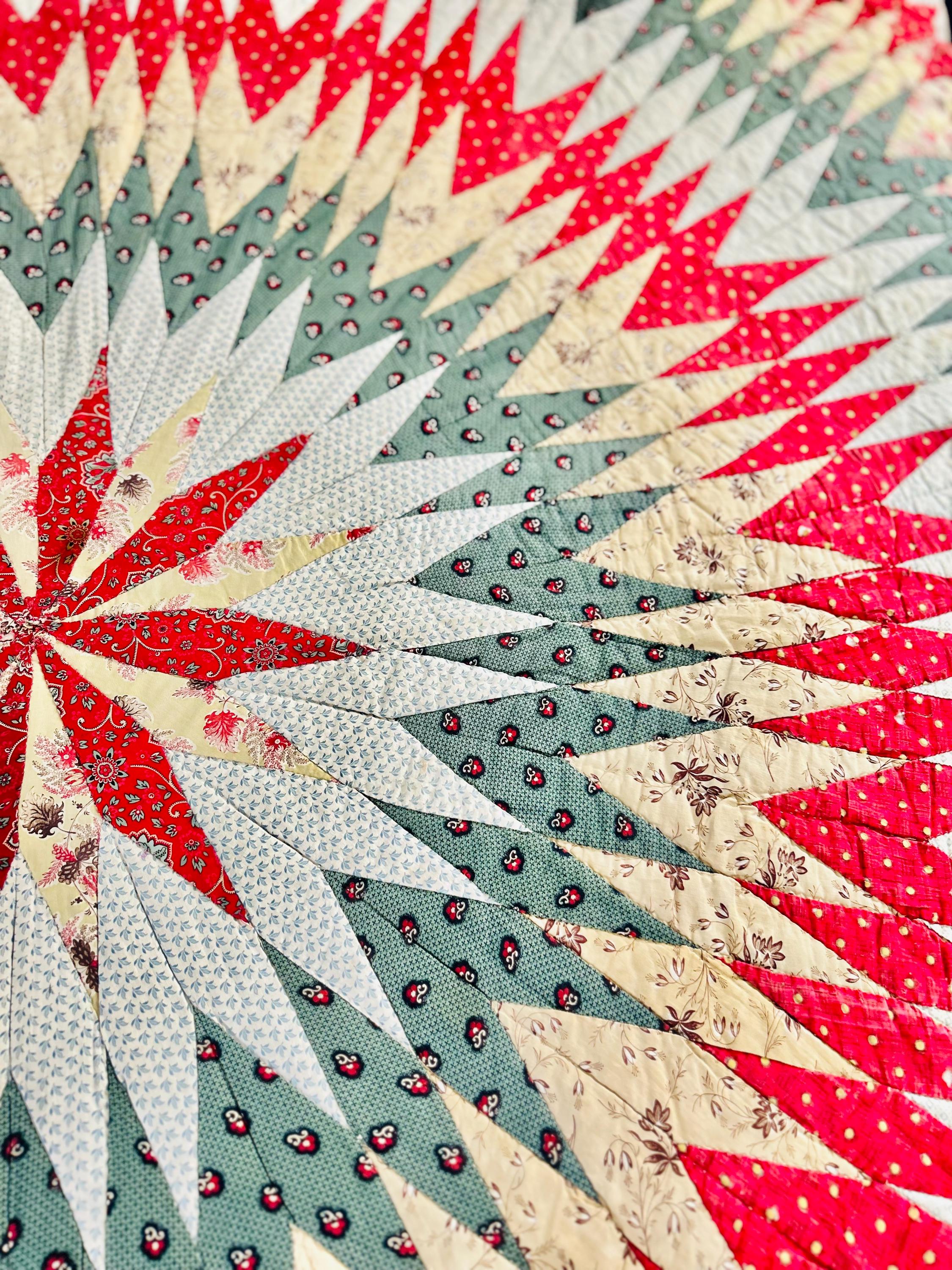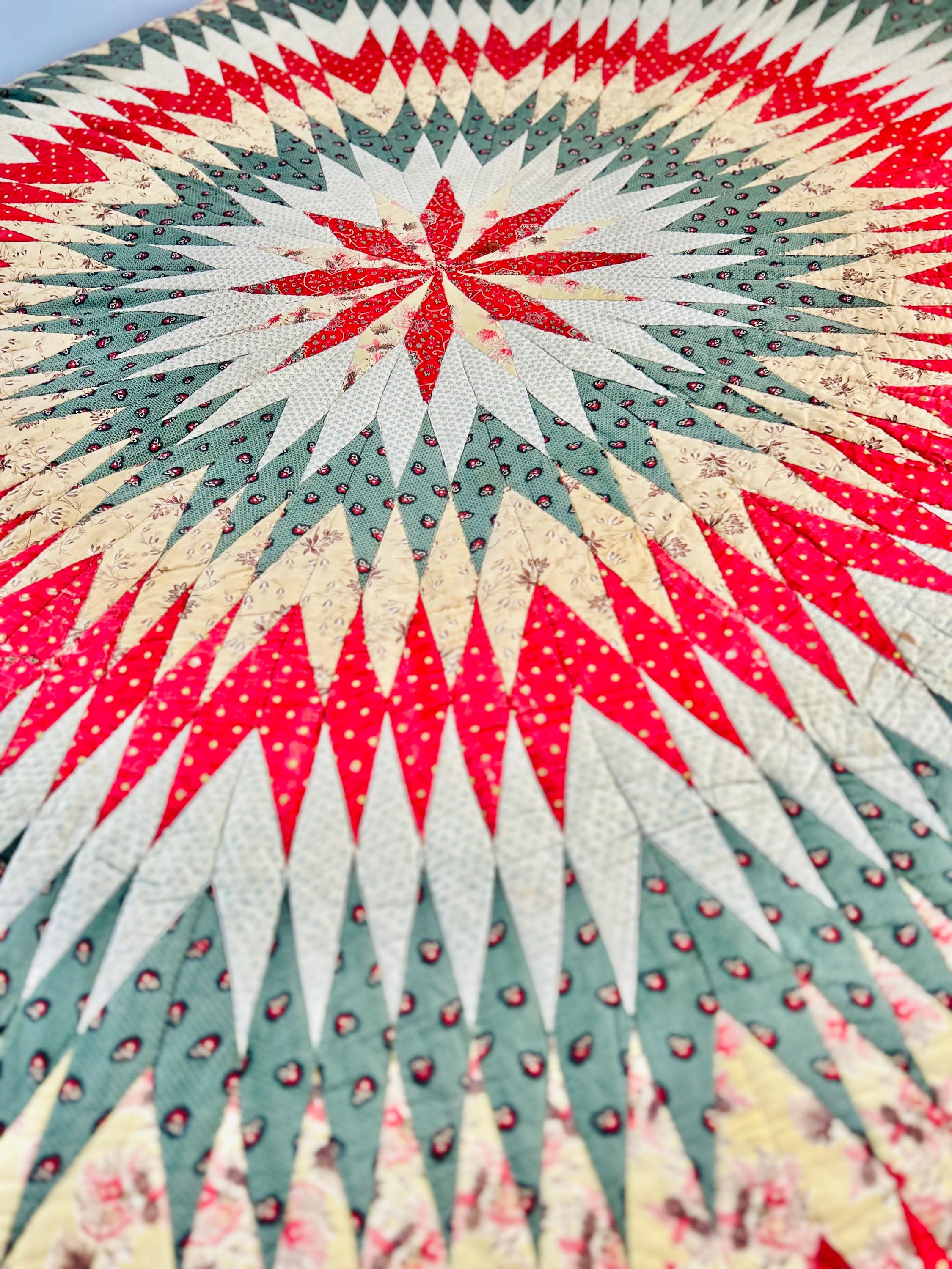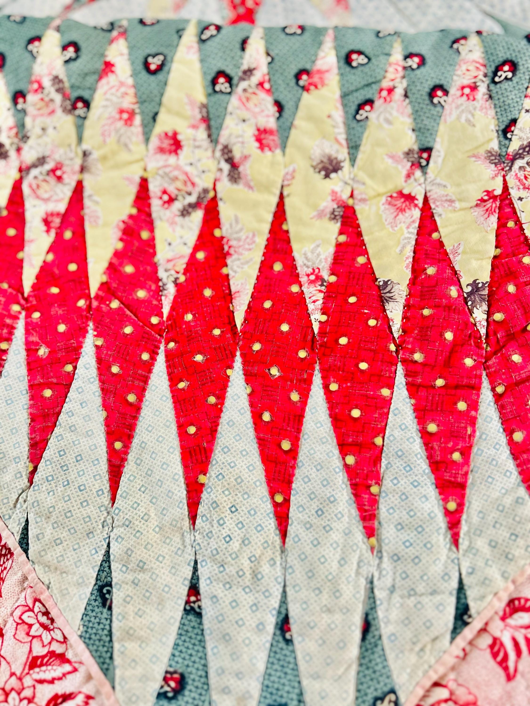This amazing Starburst Quilt, circa 1870s, is made of unique elongated diamonds that meet dramatically in a center medallion and cascade out in waves of color. The hand-quilting is in very tiny stitches in outlines of the more than 3,000 diamonds.