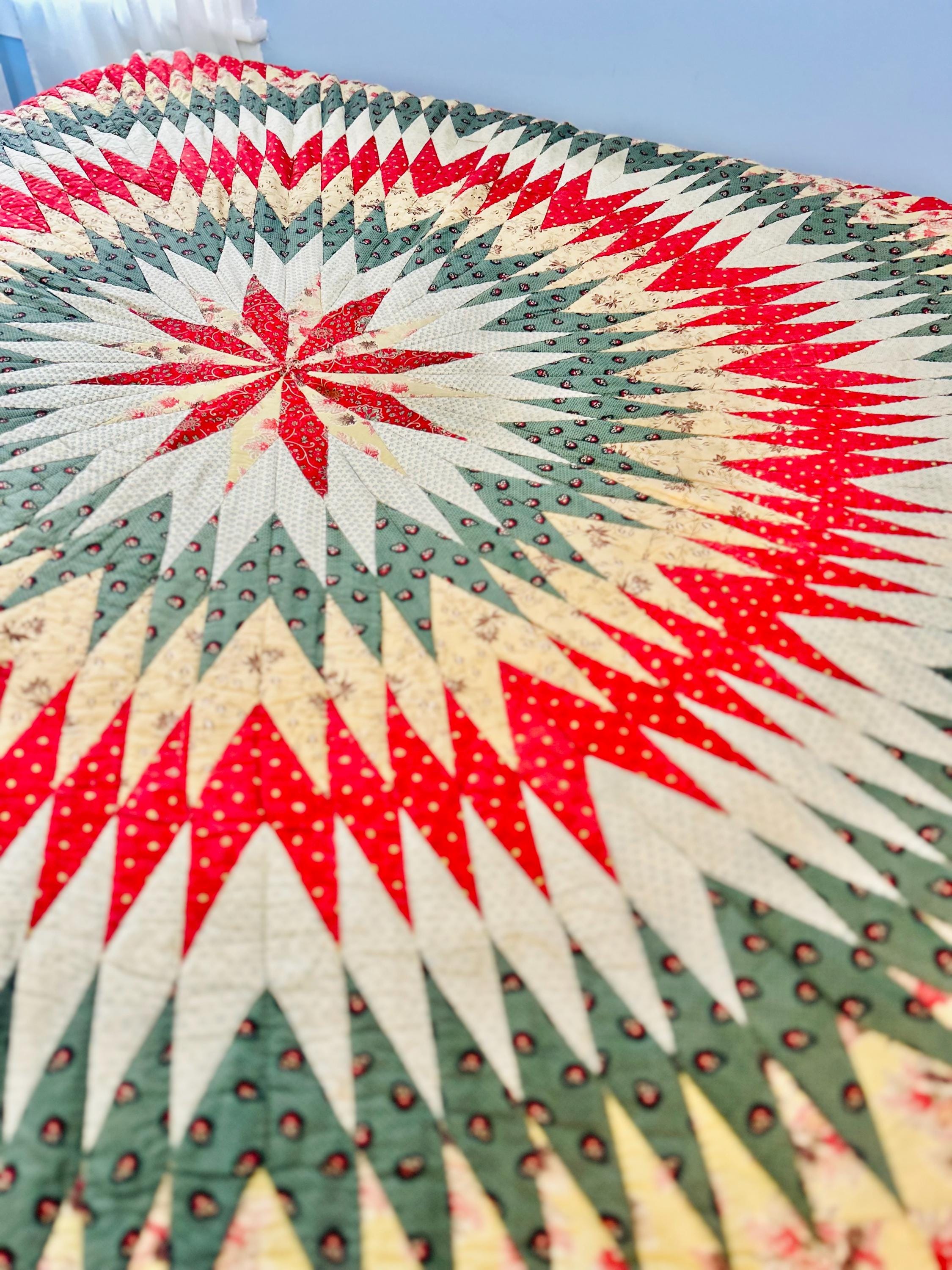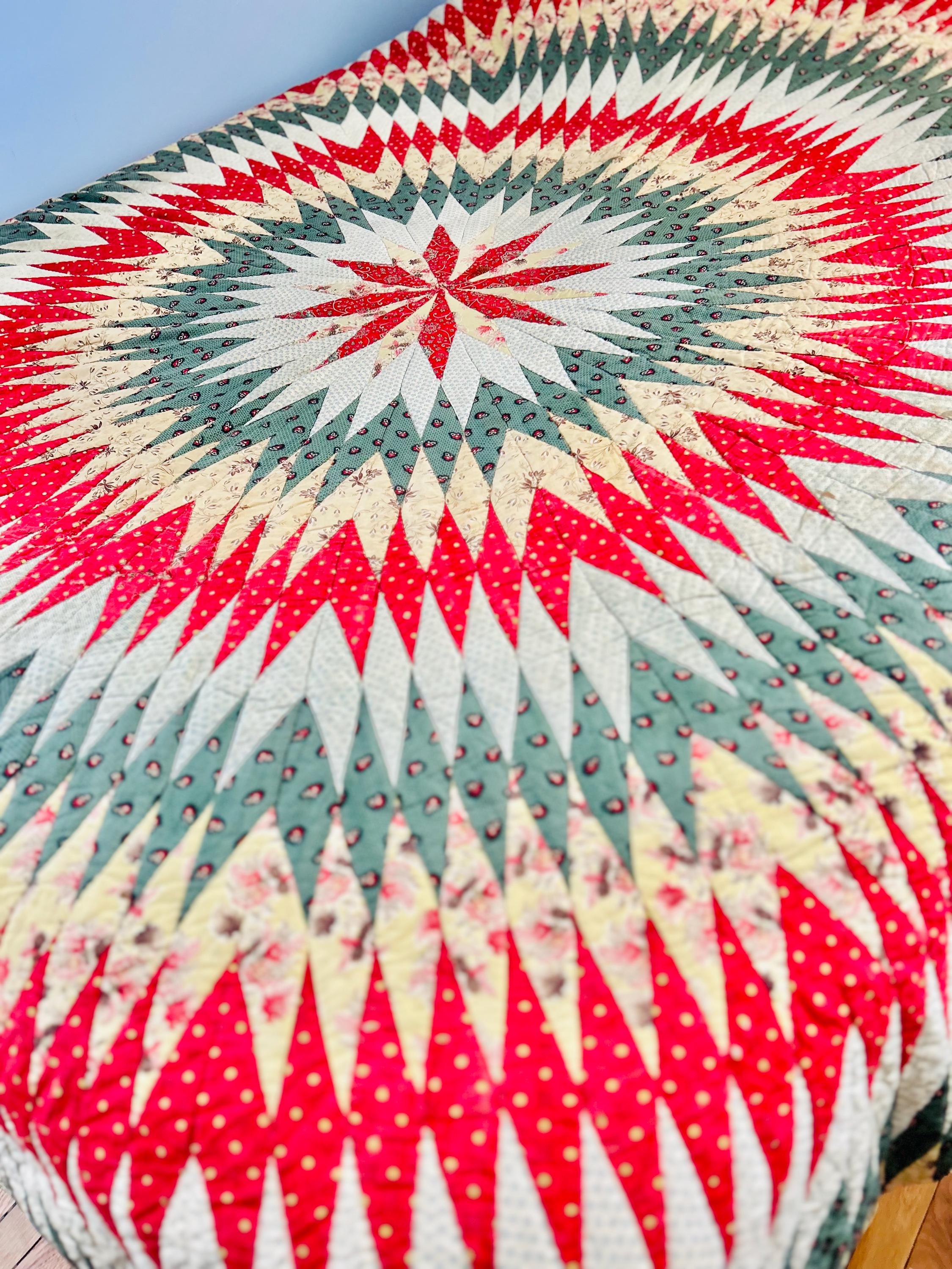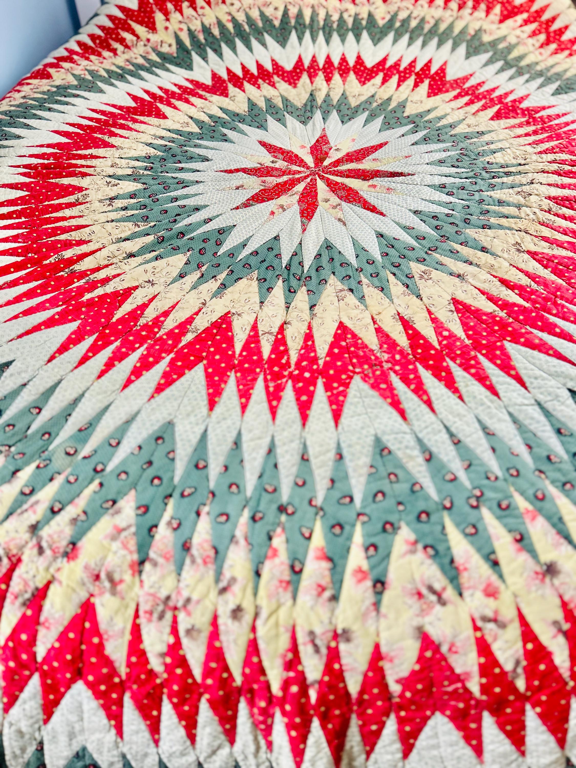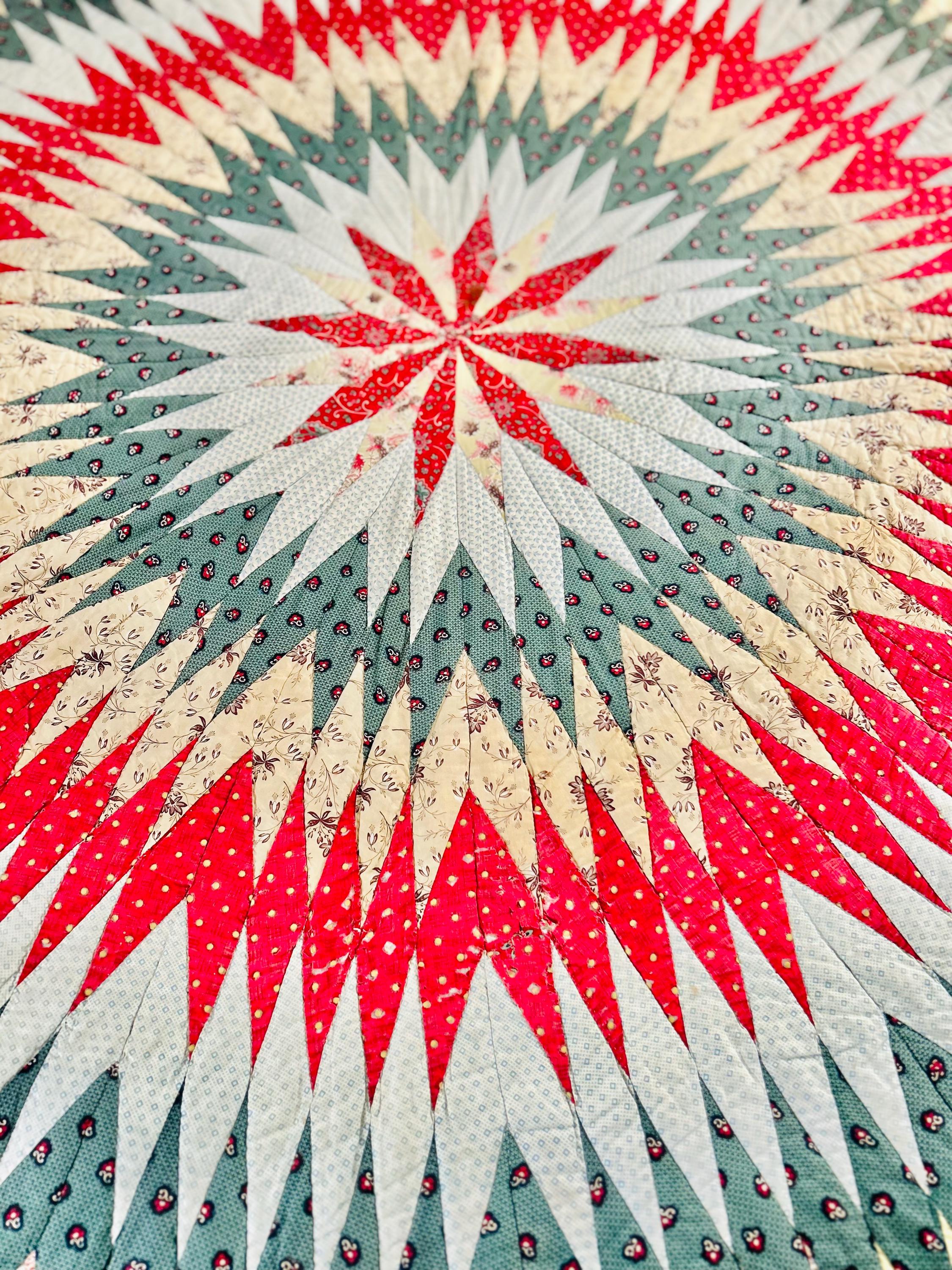 This amazing Starburst Quilt, circa 1870s, is made of unique elongated diamonds that meet dramatically in a center medallion and cascade out in waves of color. The hand-quilting is in very tiny stitches in outlines of the more than 3,000 diamonds.