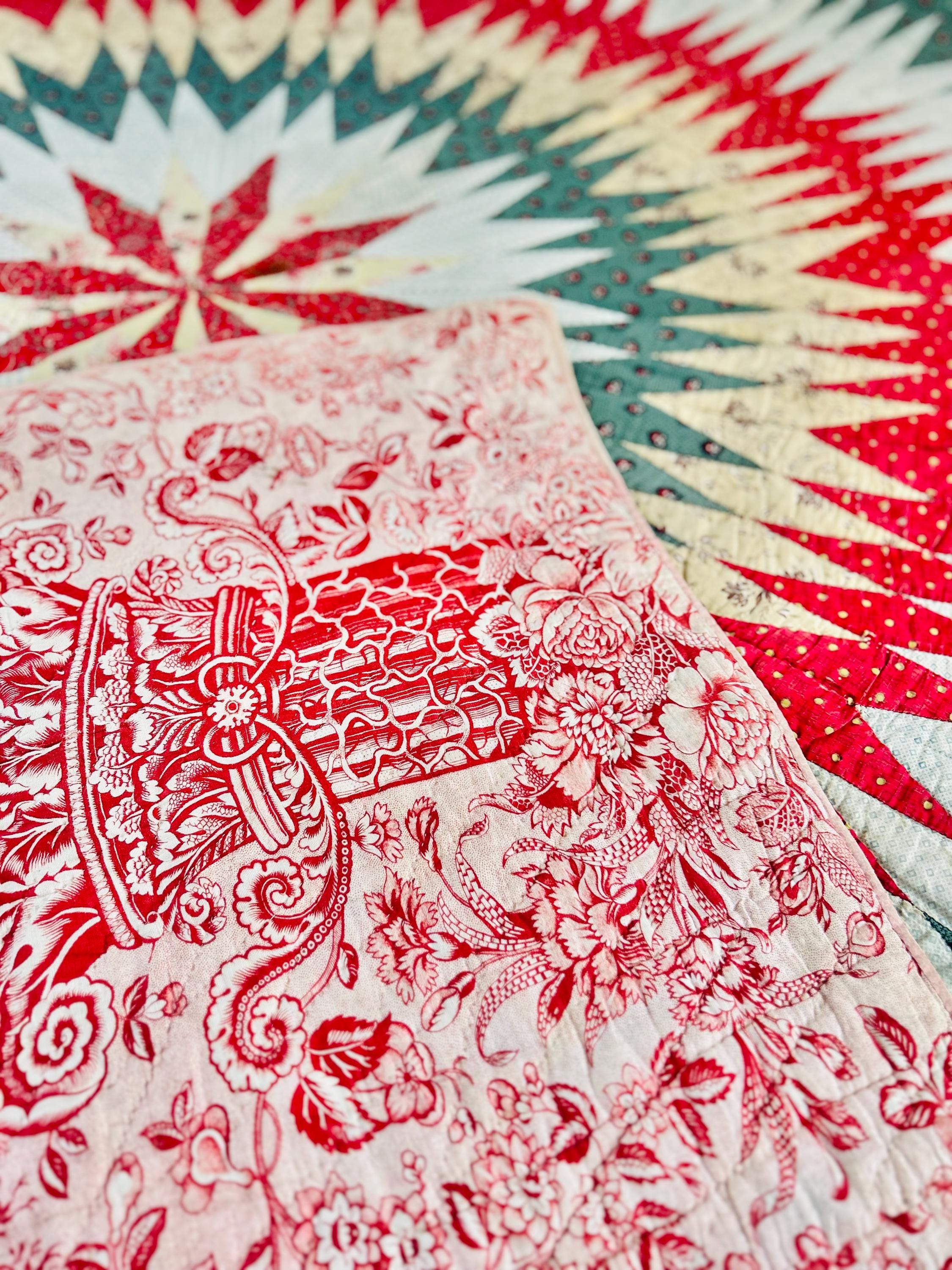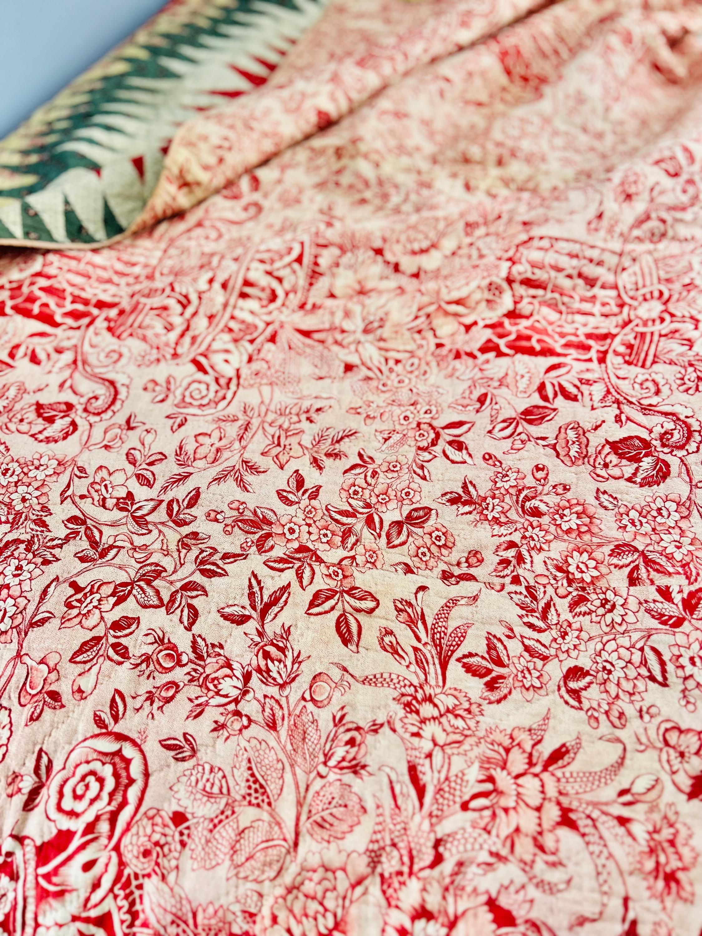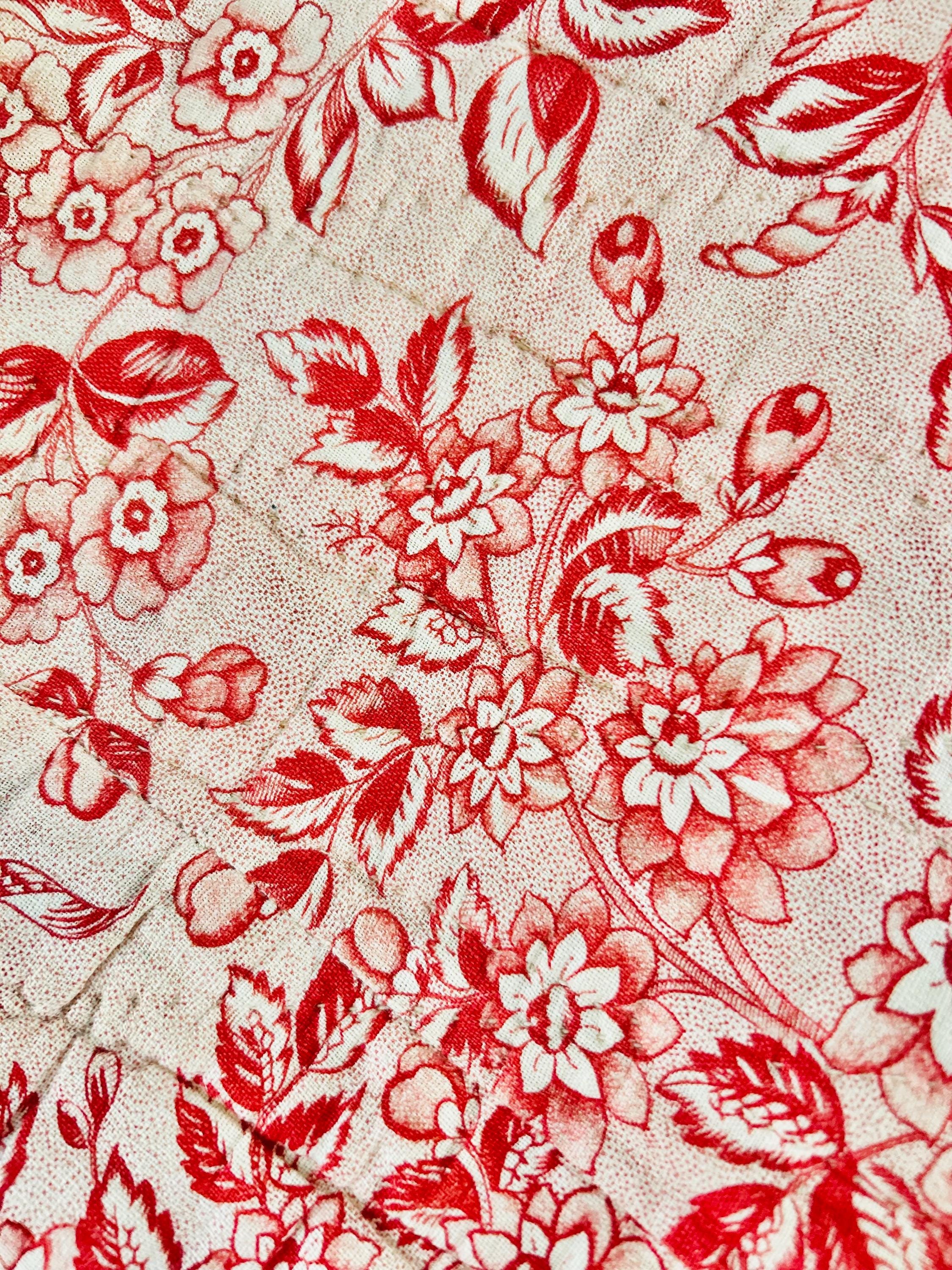 The back is a red and white floral chintz, while the binding is impossibly thin light pink cotton that has been hand-stitched to both sides. The cotton batting is unsized and very lightweight.