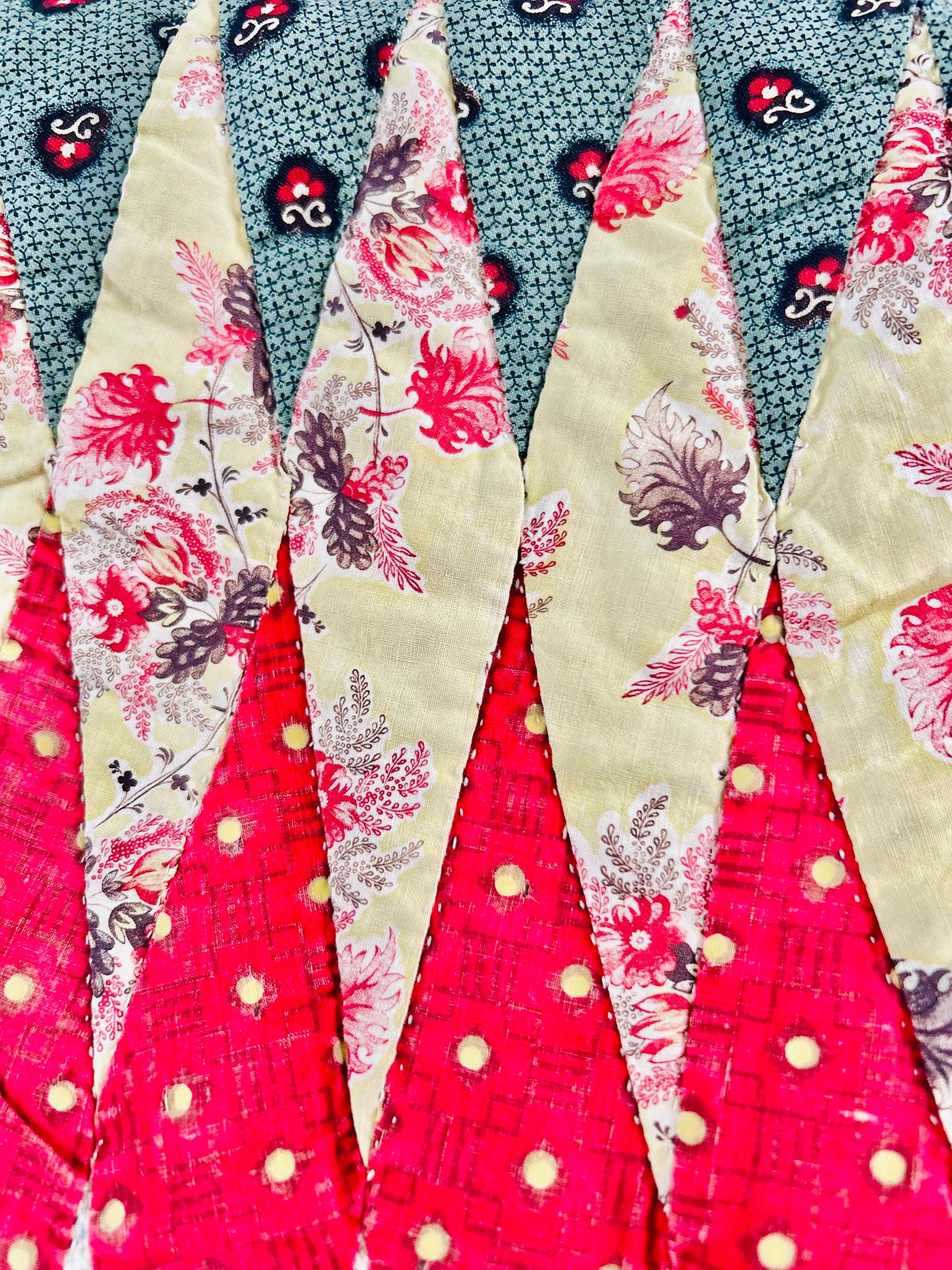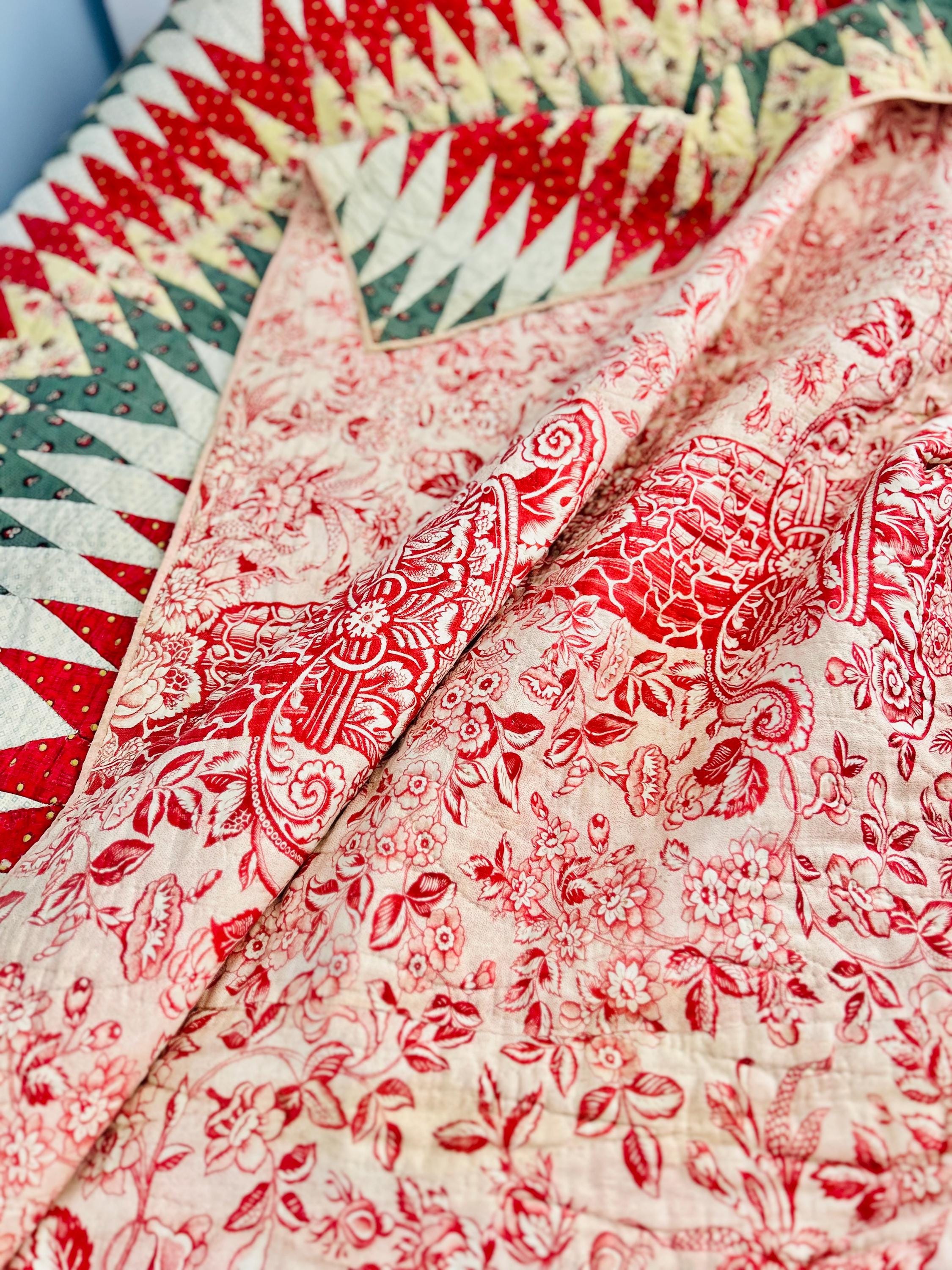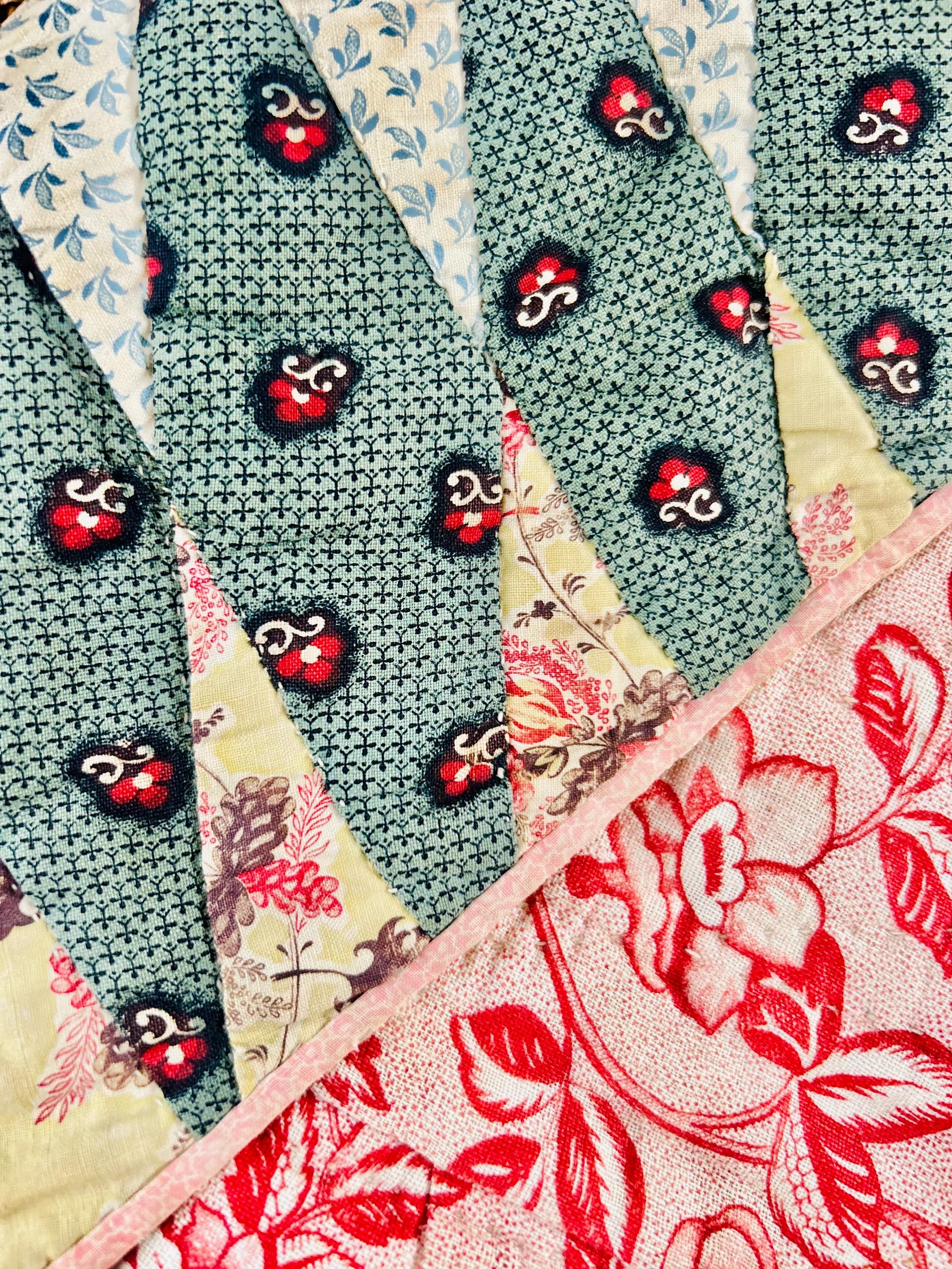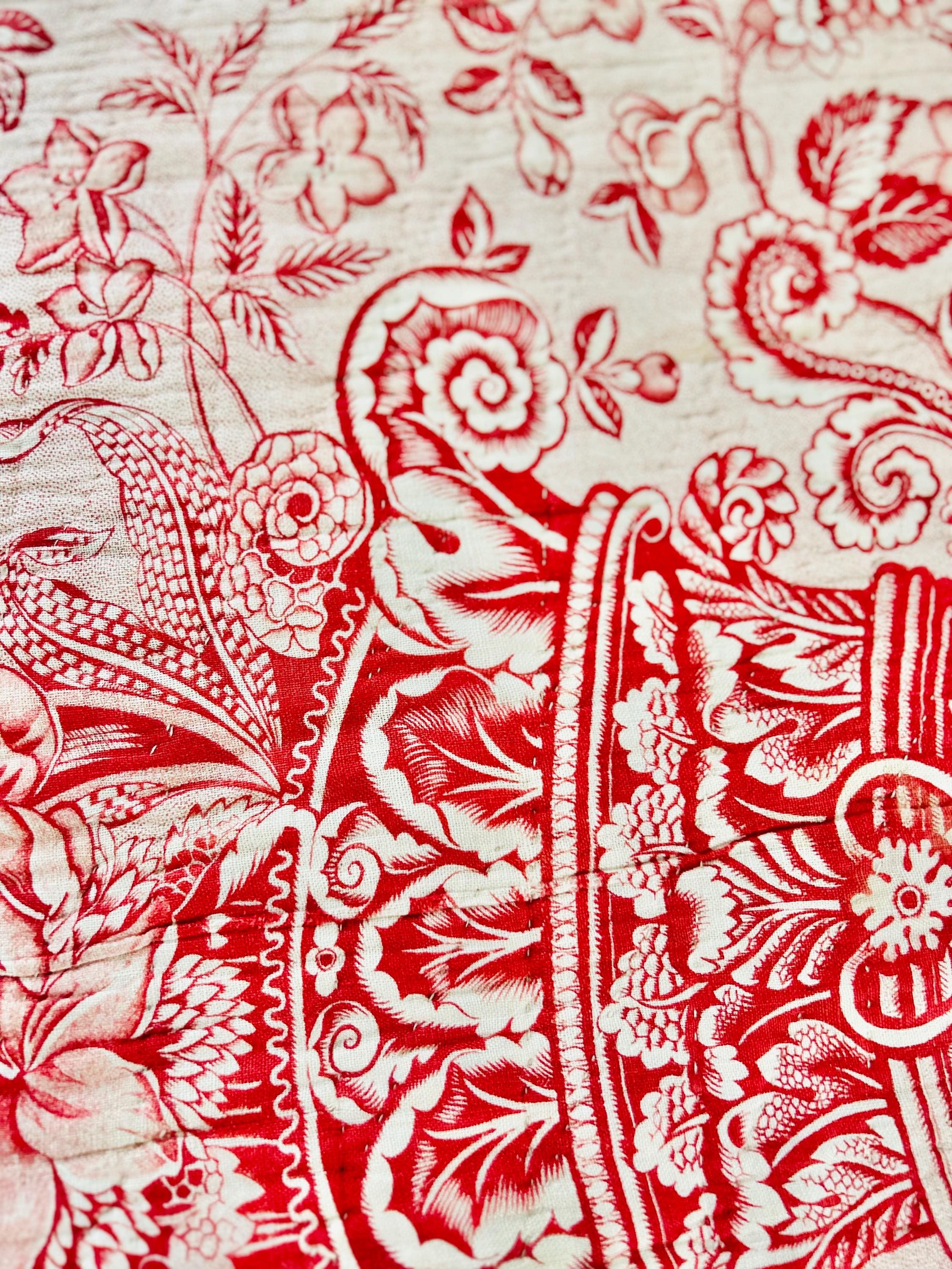 The back is a red and white floral chintz, while the binding is impossibly thin light pink cotton that has been hand-stitched to both sides. The cotton batting is unsized and very lightweight.