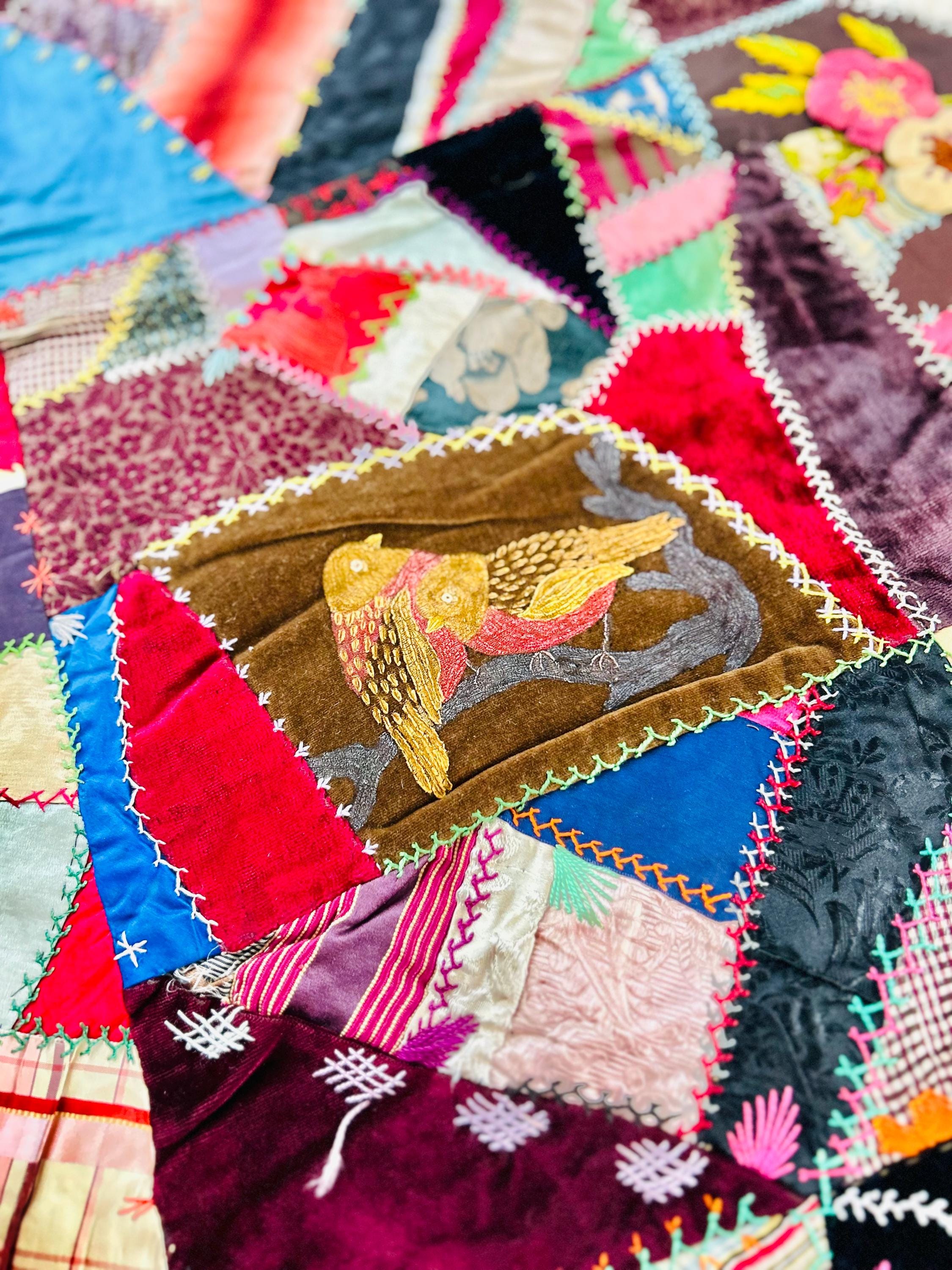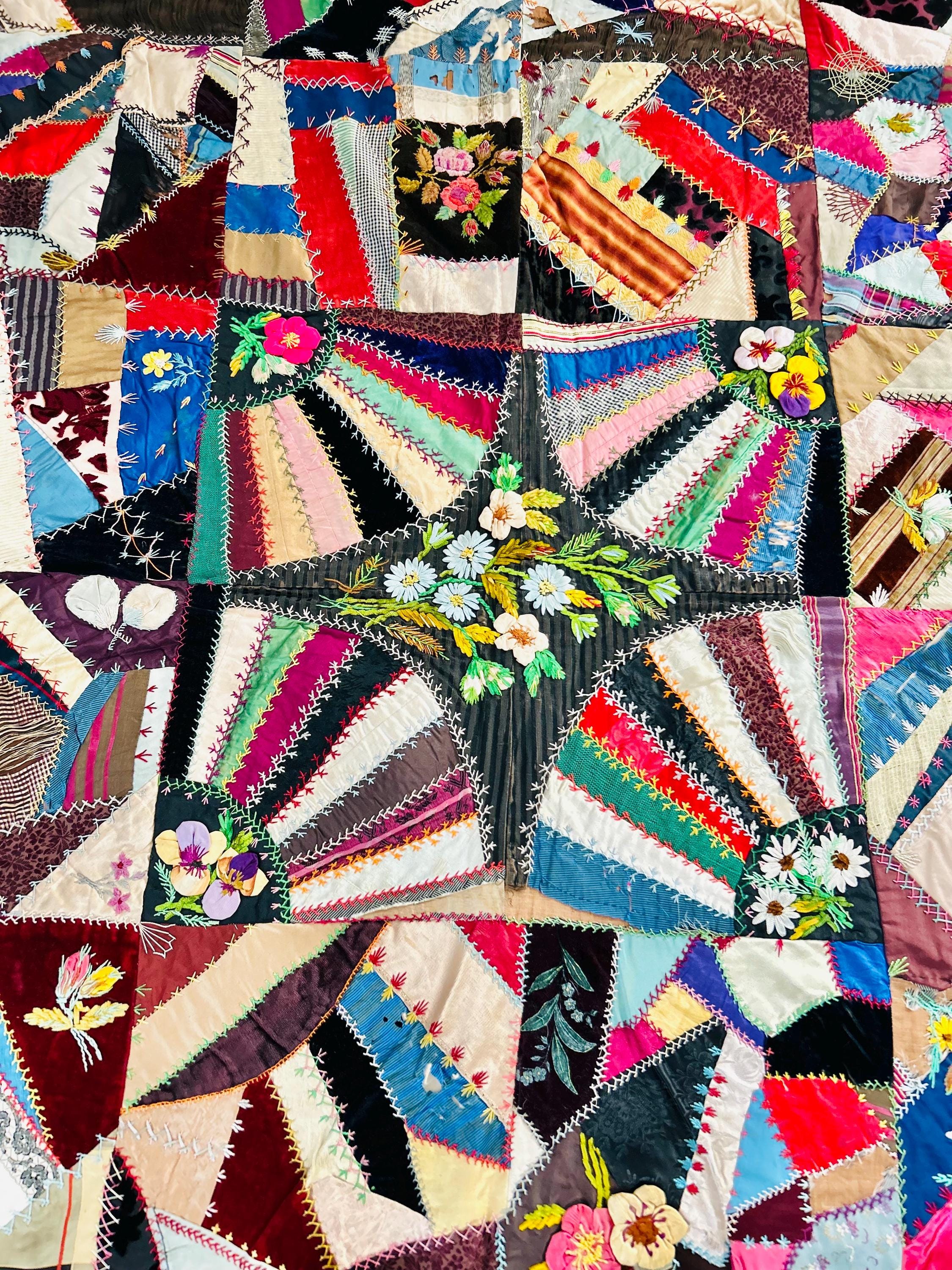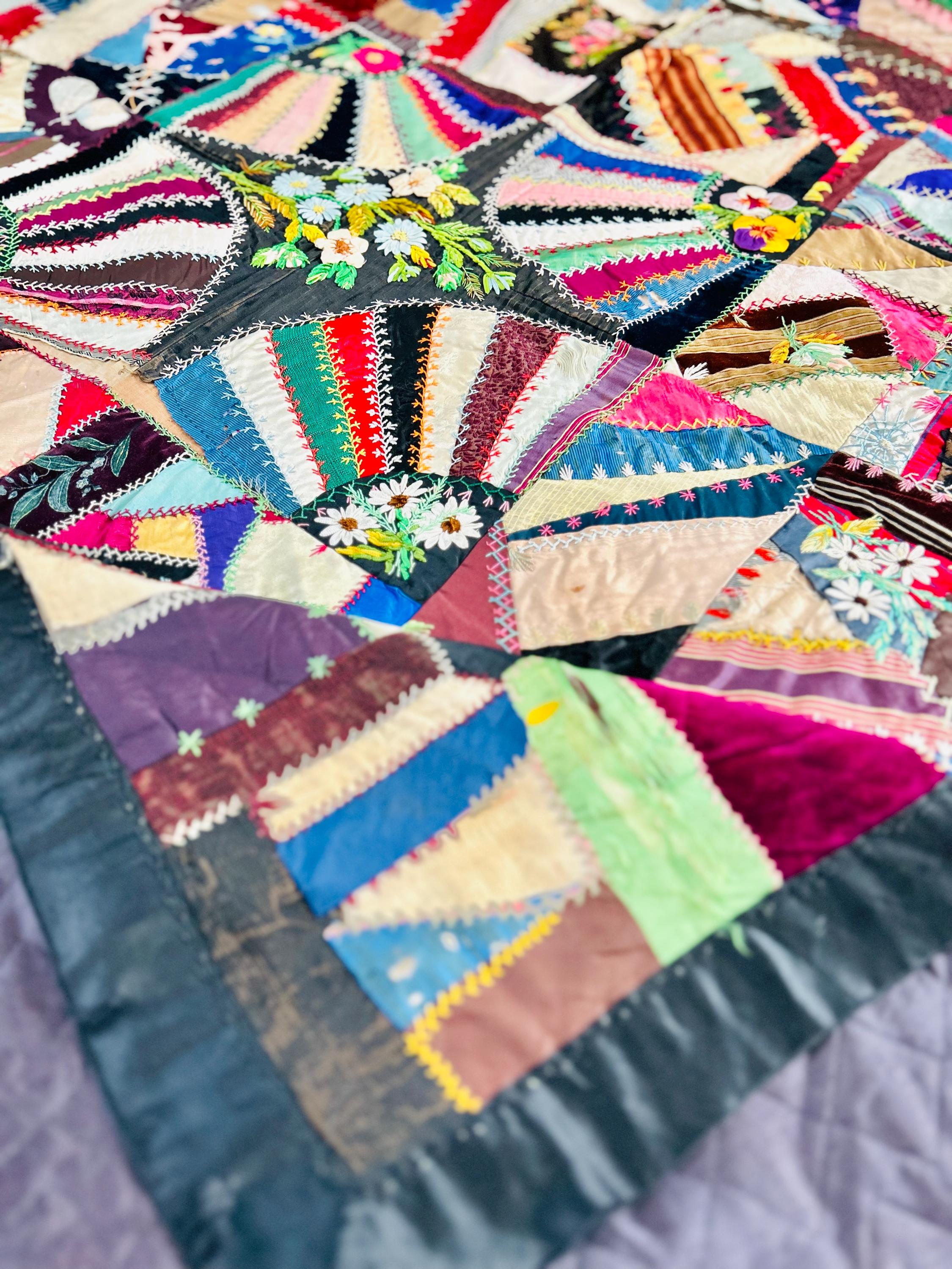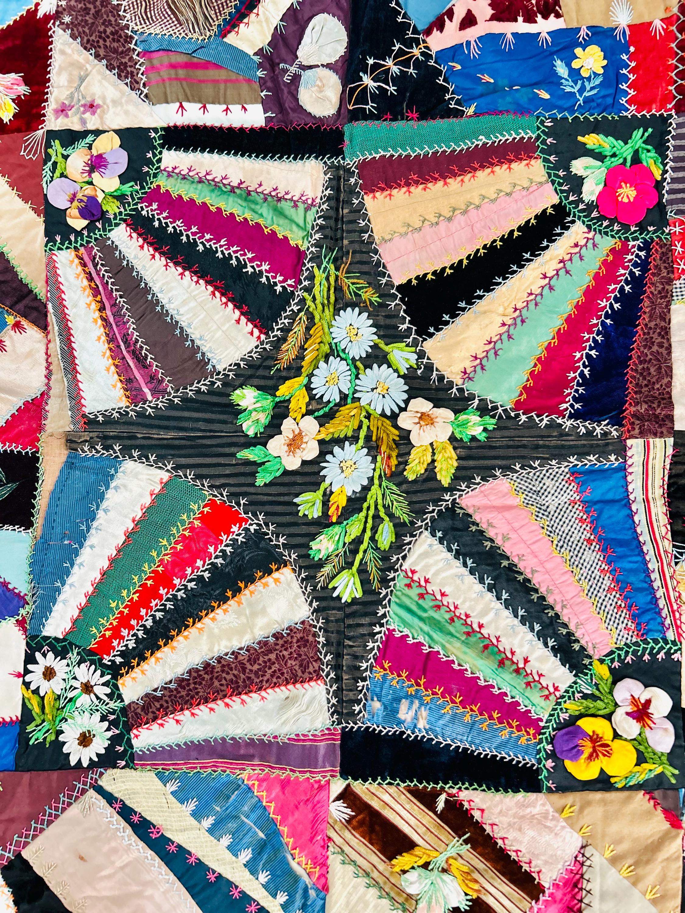 This is a spectacular Crazy Quilt, circa 1890s, initialed T.E.C. and H.P. It has more than 100 different embroidery stitches and a central motif of four elaborate fans, along with many, many flowers, spider webs, leaves, a pair of hand-painted birds and much more.