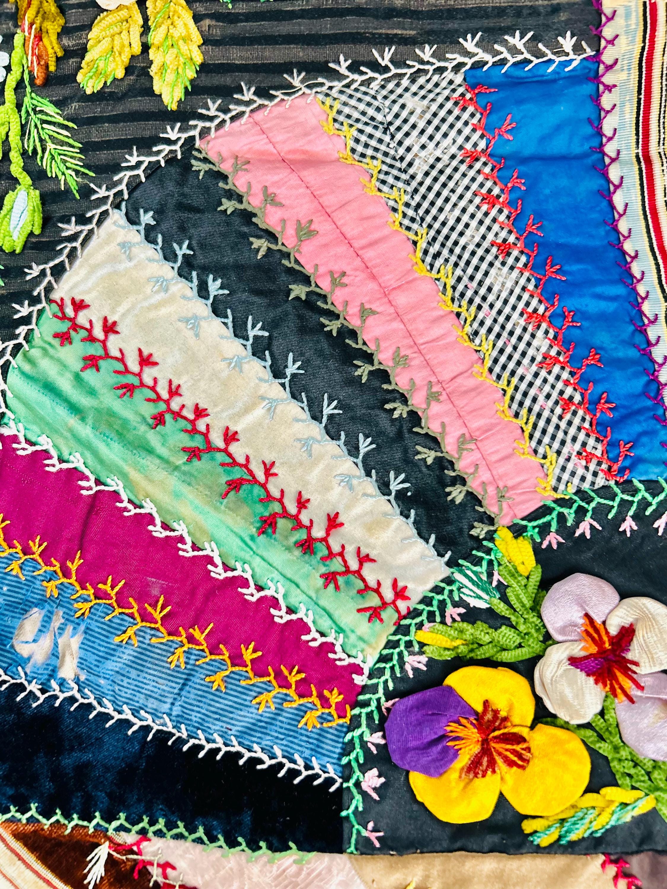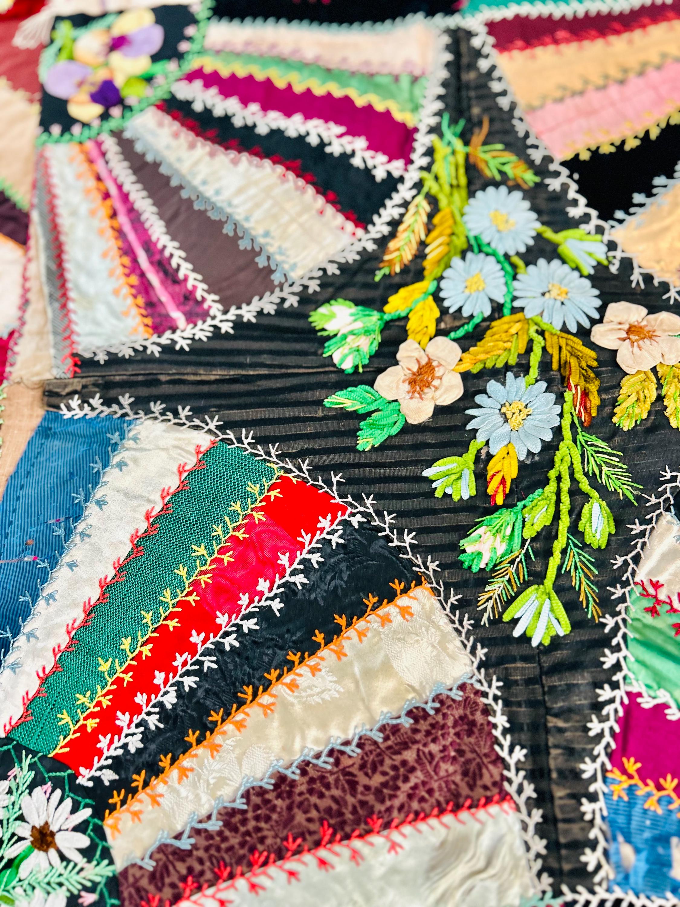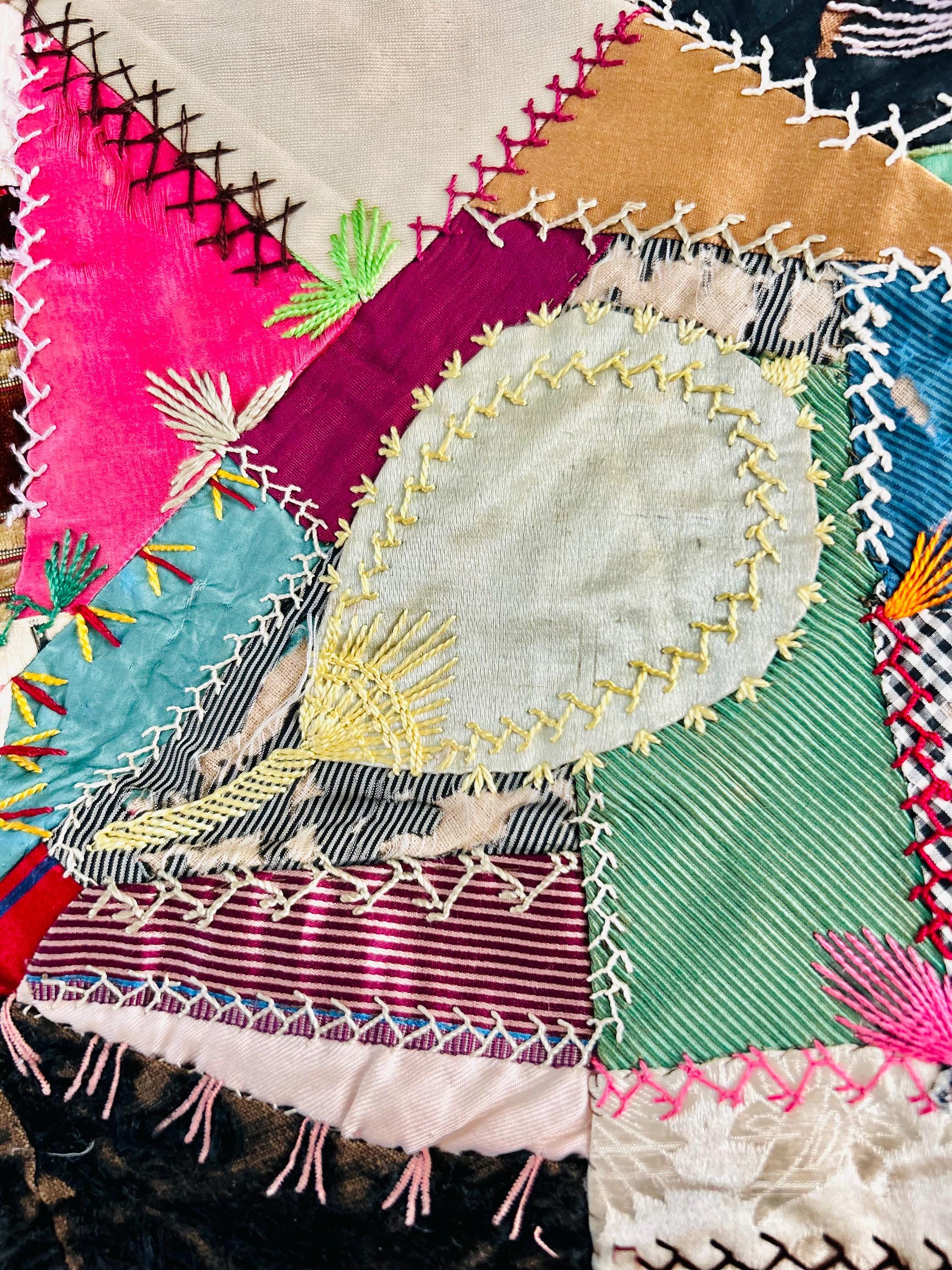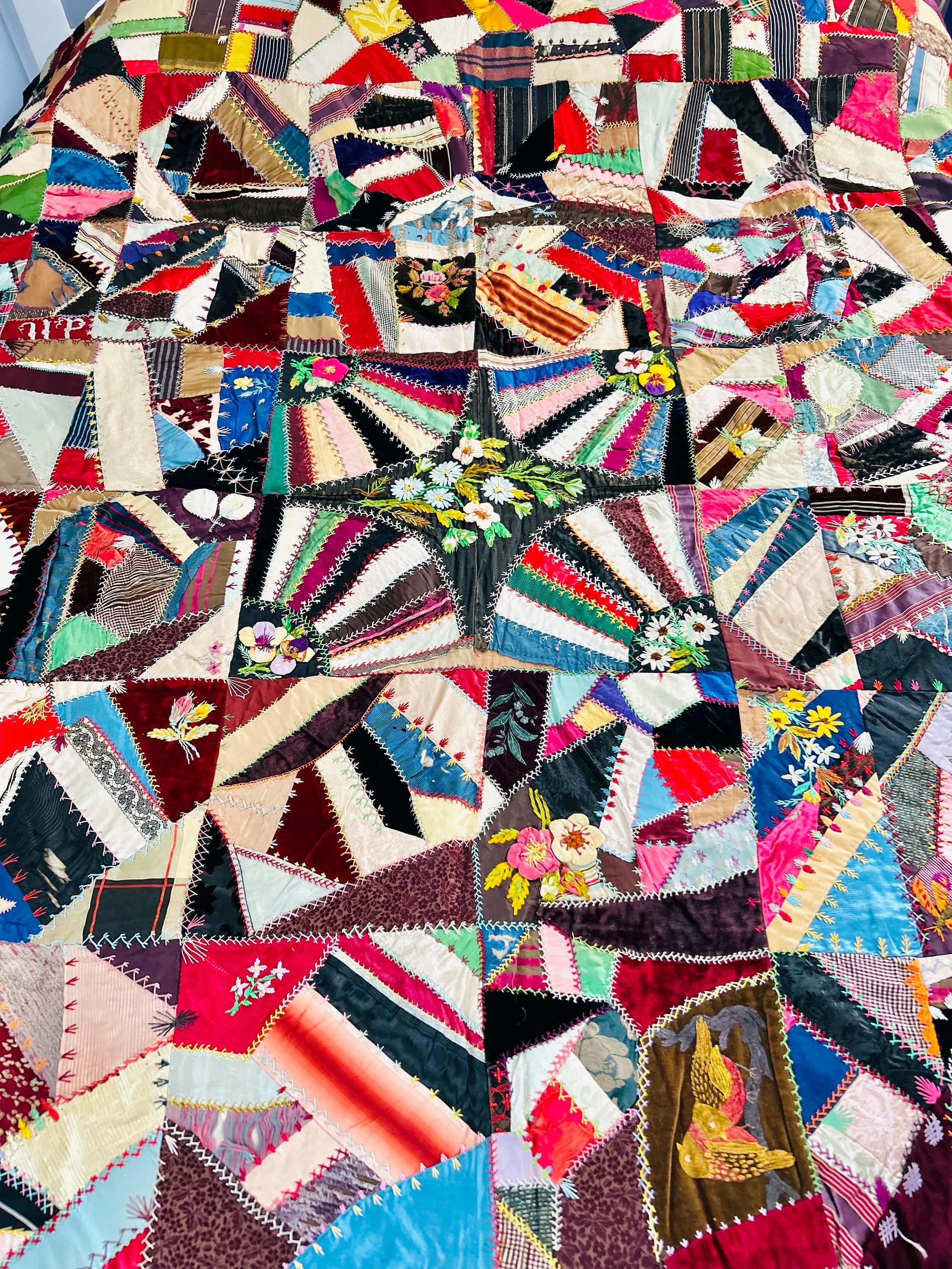 This is a spectacular Crazy Quilt, circa 1890s, initialed T.E.C. and H.P. It has more than 100 different embroidery stitches and a central motif of four elaborate fans, along with many, many flowers, spider webs, leaves, a pair of hand-painted birds and much more.