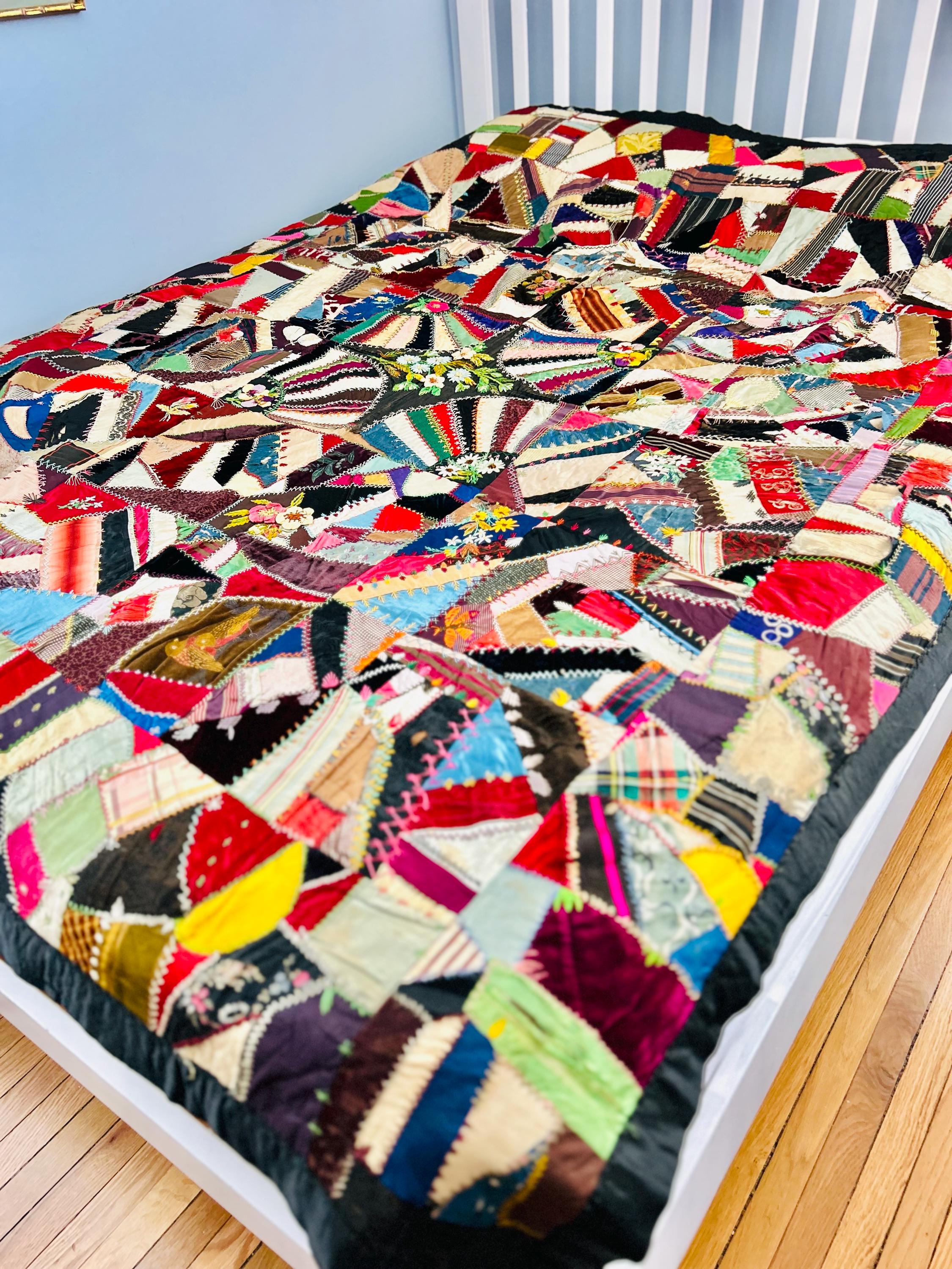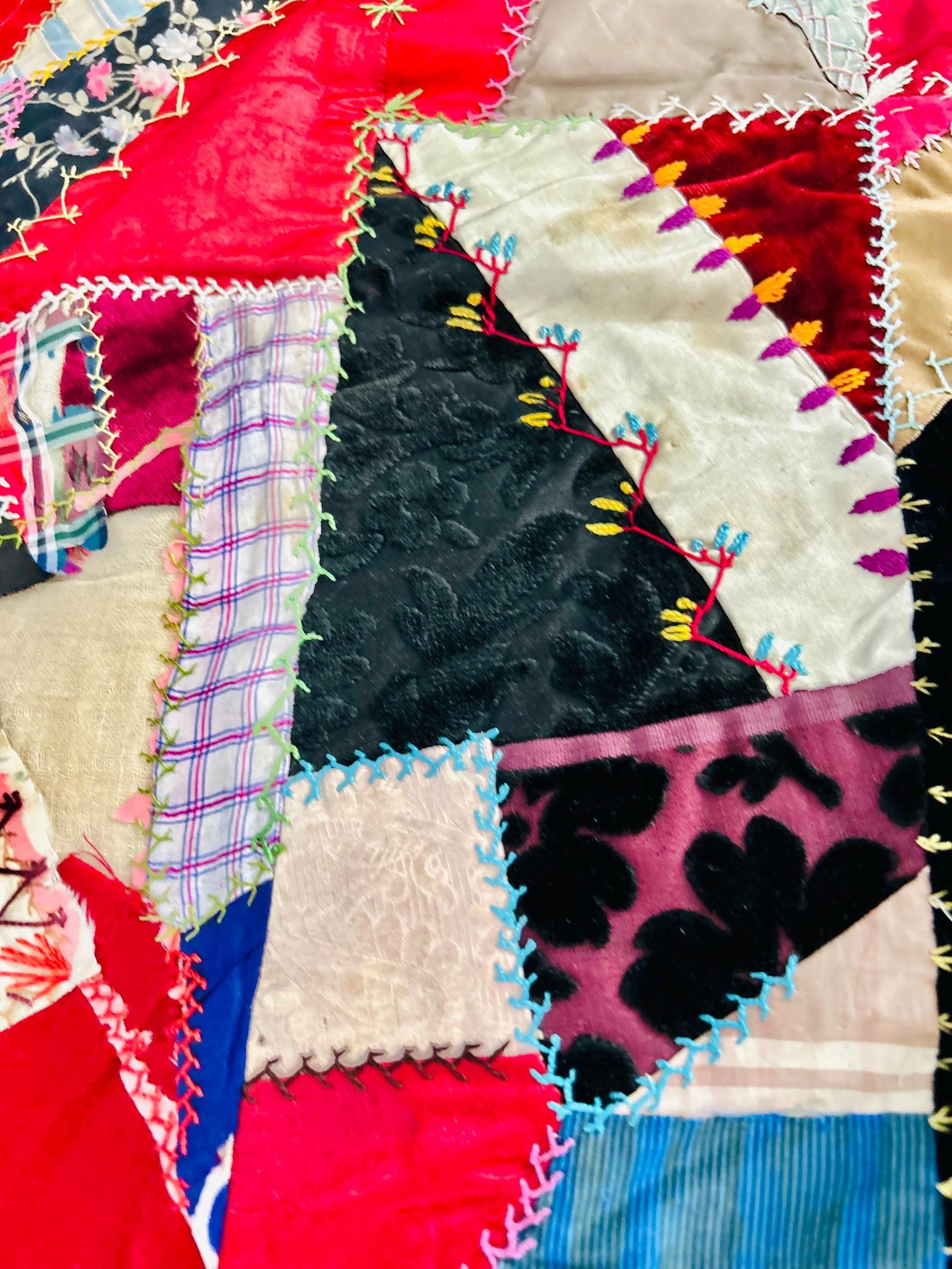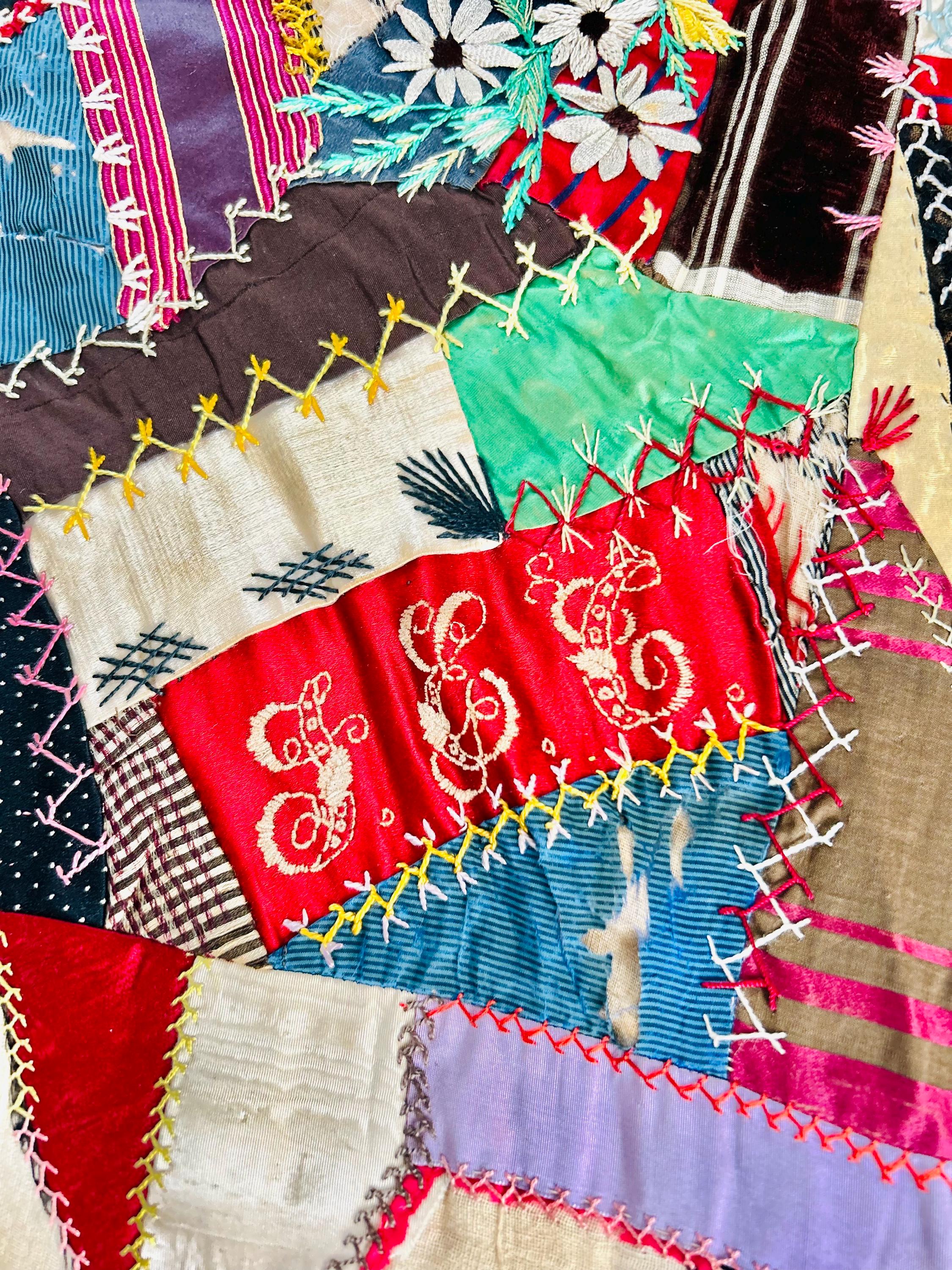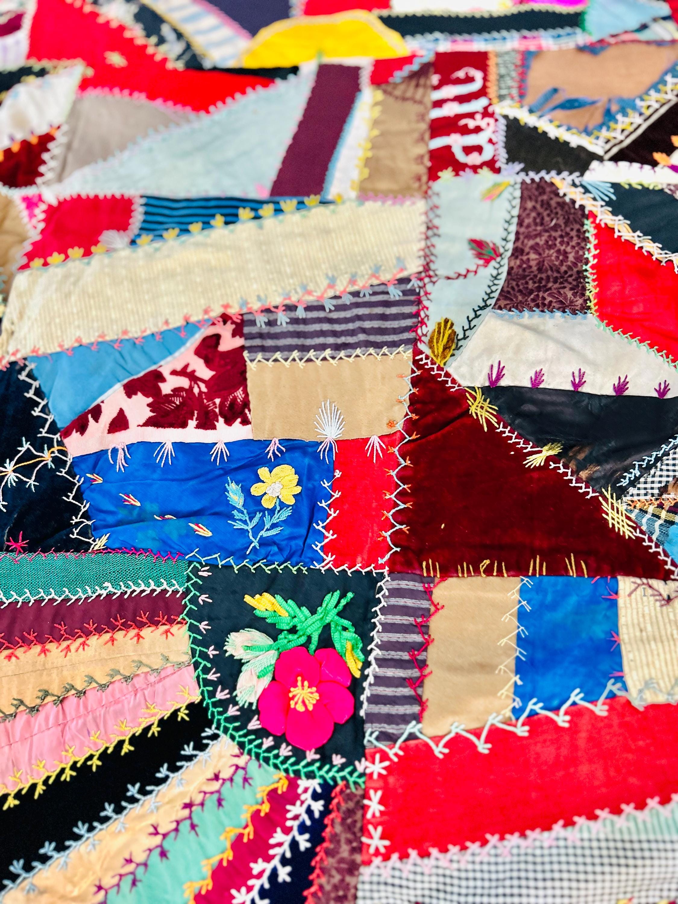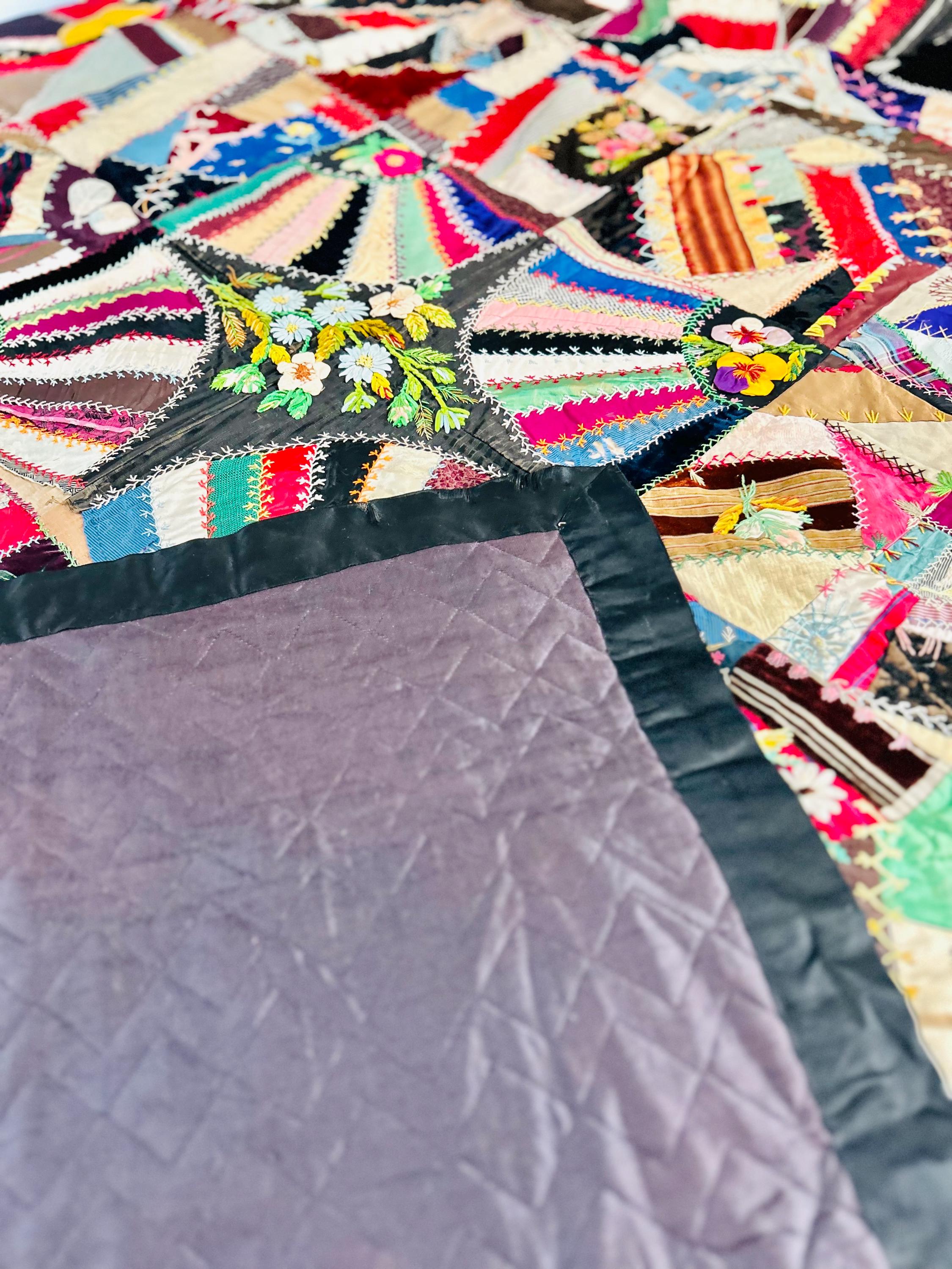 This is a spectacular Crazy Quilt, circa 1890s, initialed T.E.C. and H.P. It has more than 100 different embroidery stitches and a central motif of four elaborate fans, along with many, many flowers, spider webs, leaves, a pair of hand-painted birds and much more.