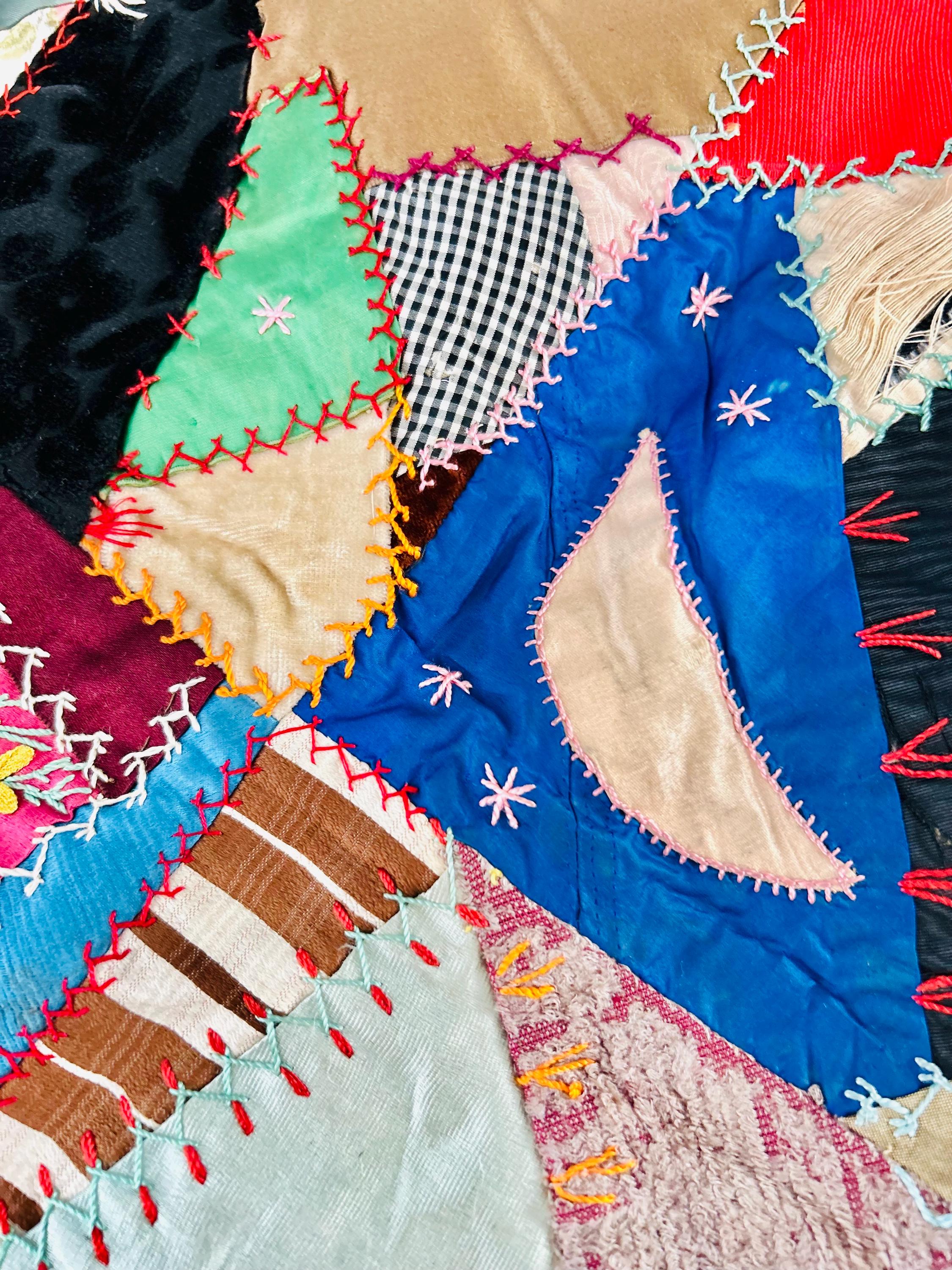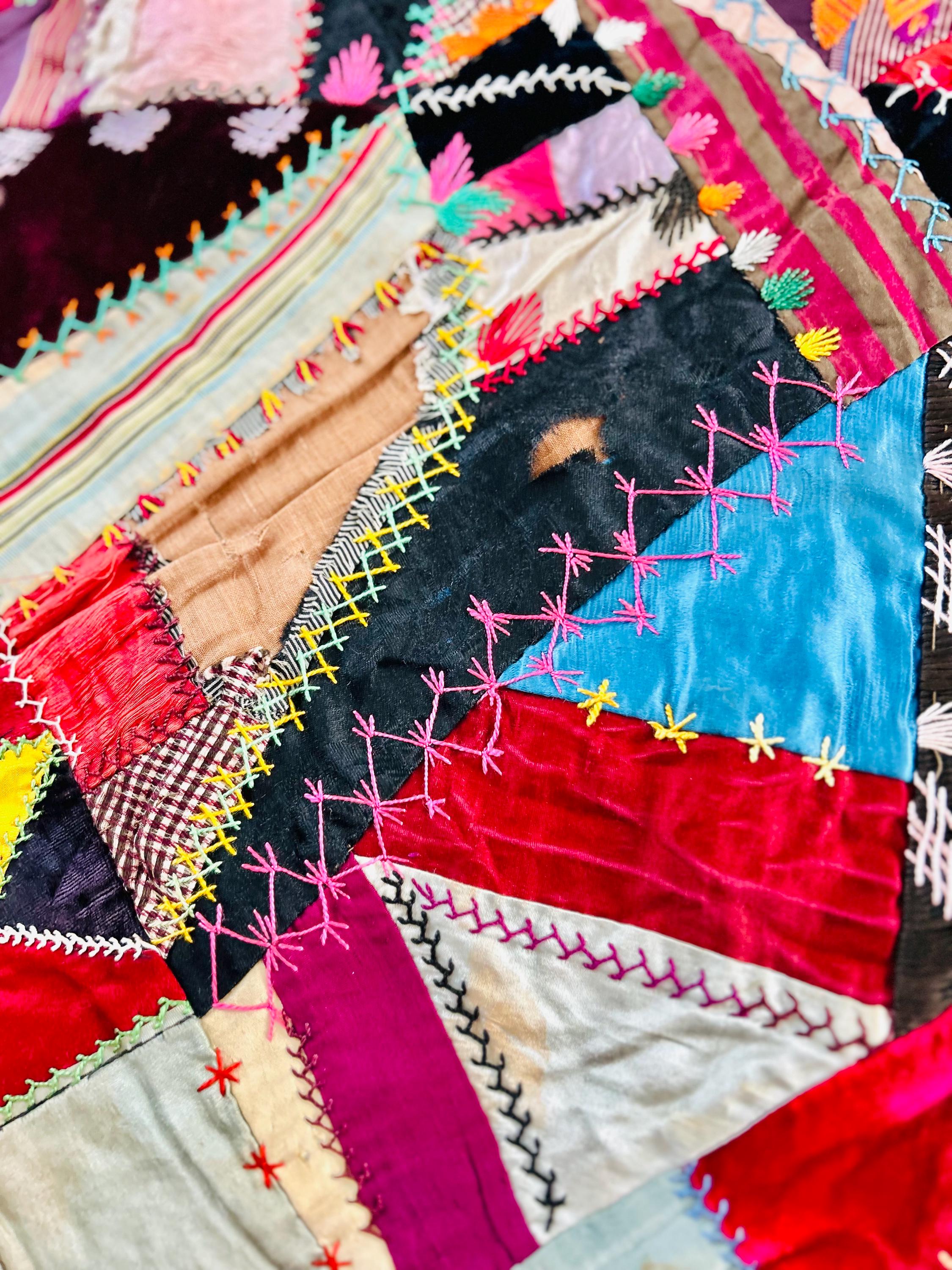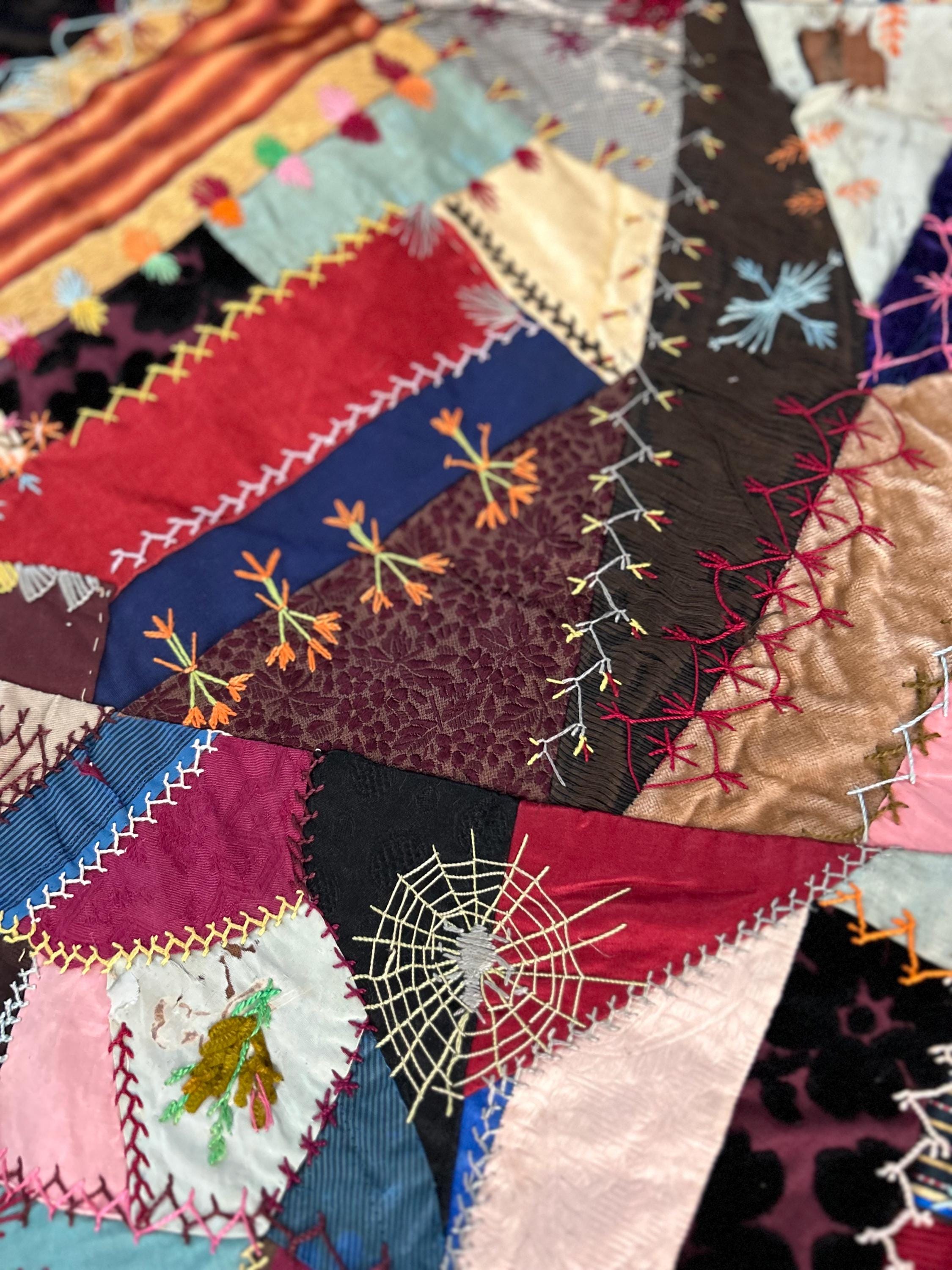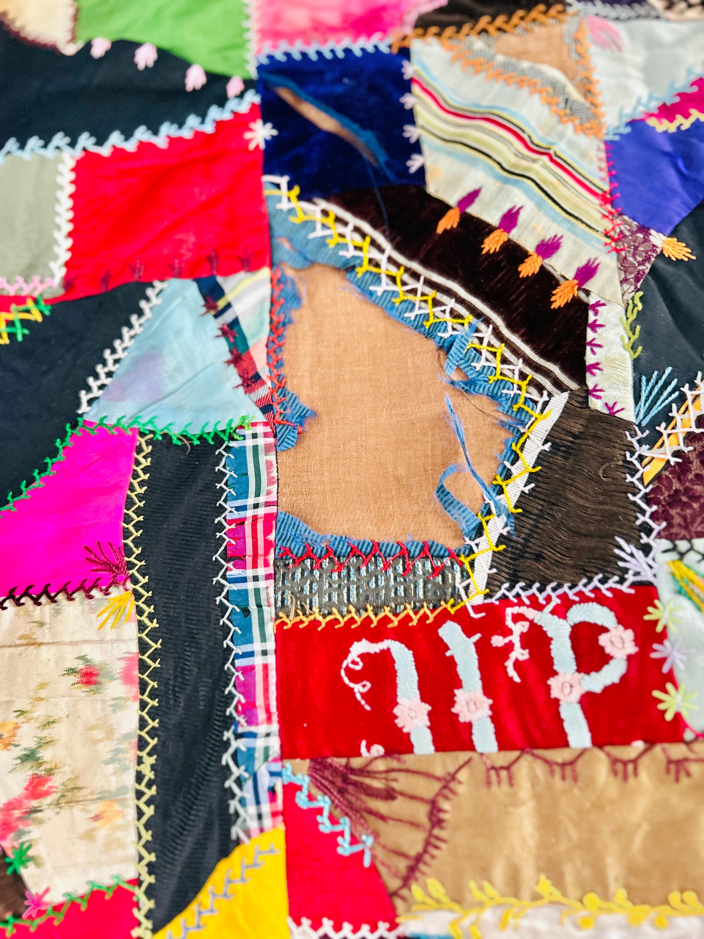 This is a spectacular Crazy Quilt, circa 1890s, initialed T.E.C. and H.P. It has more than 100 different embroidery stitches and a central motif of four elaborate fans, along with many, many flowers, spider webs, leaves, a pair of hand-painted birds and much more.