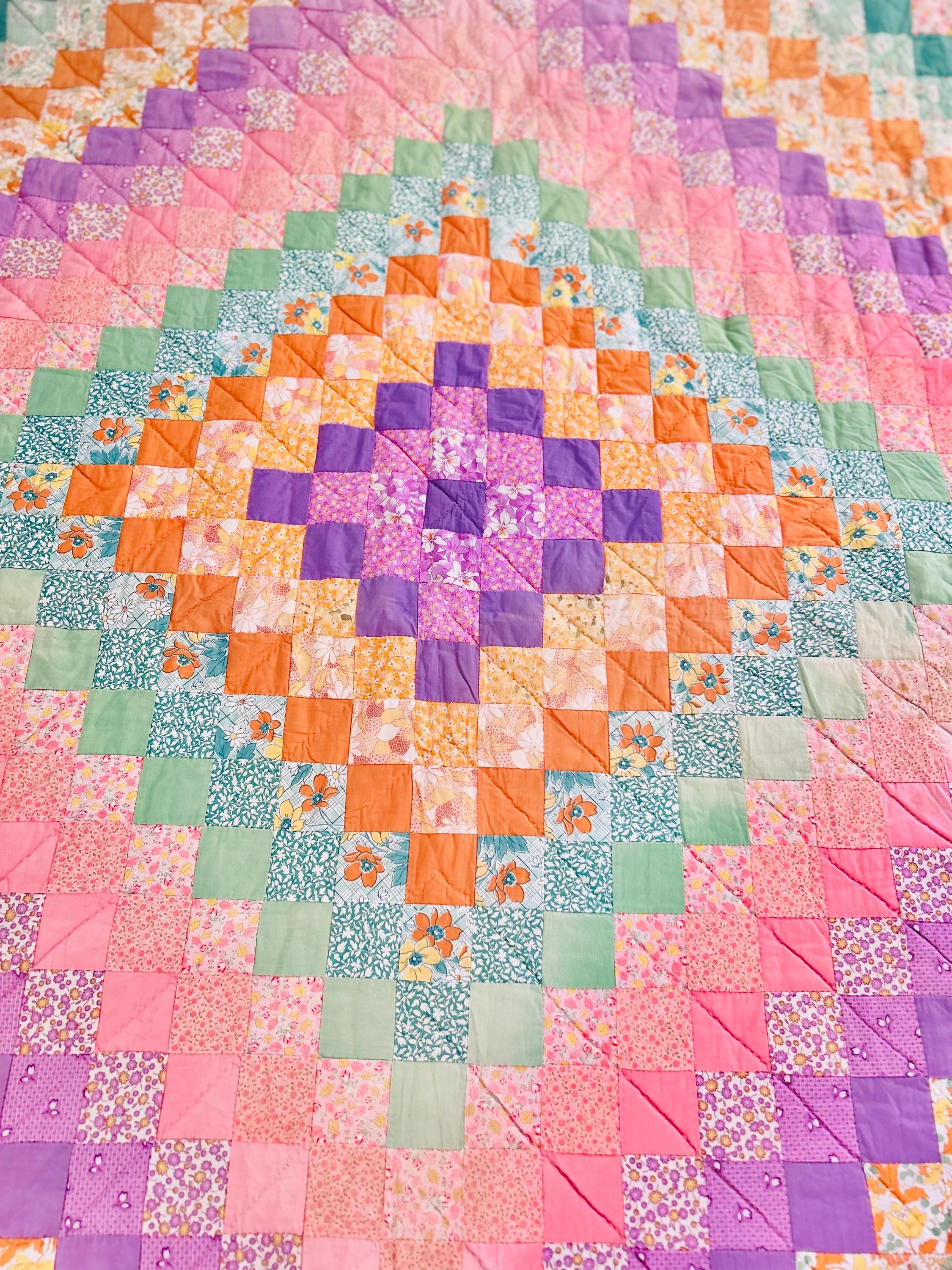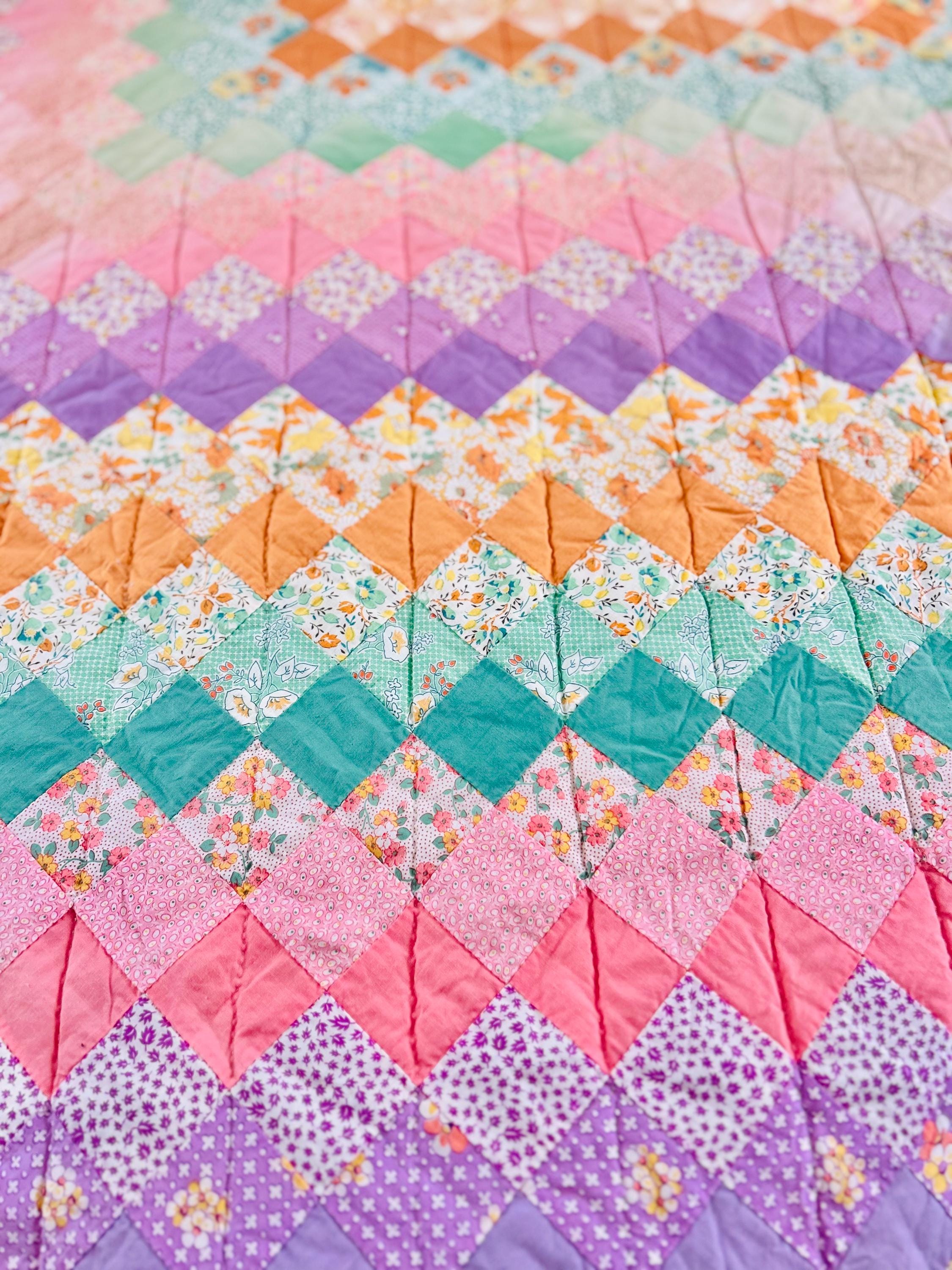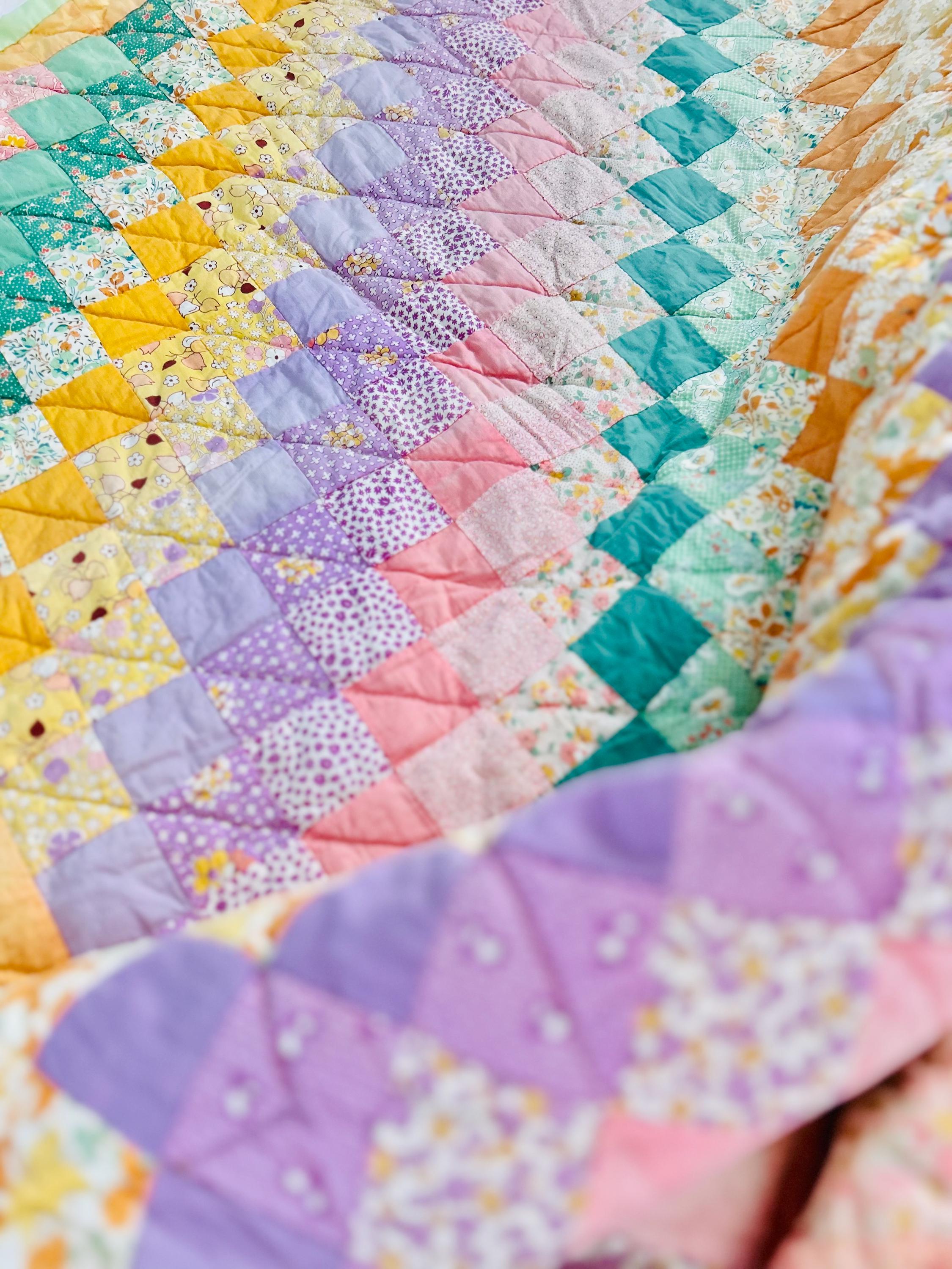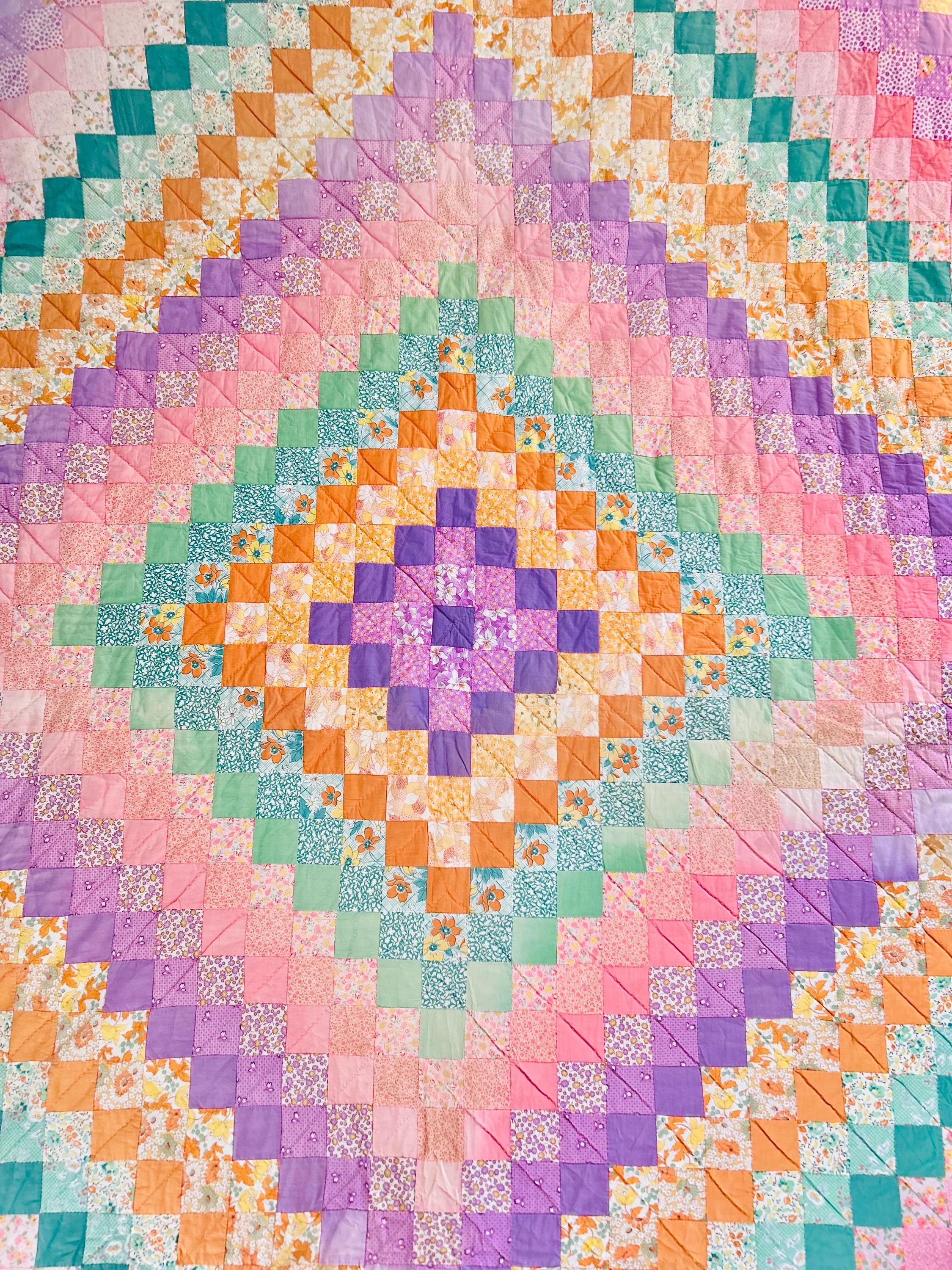 This Trip Around the World Quilt is made from more than 2,000 scrappy patchwork squares in cascading pastel colors. The hand-quilting is in diagonal lines through the patchwork.