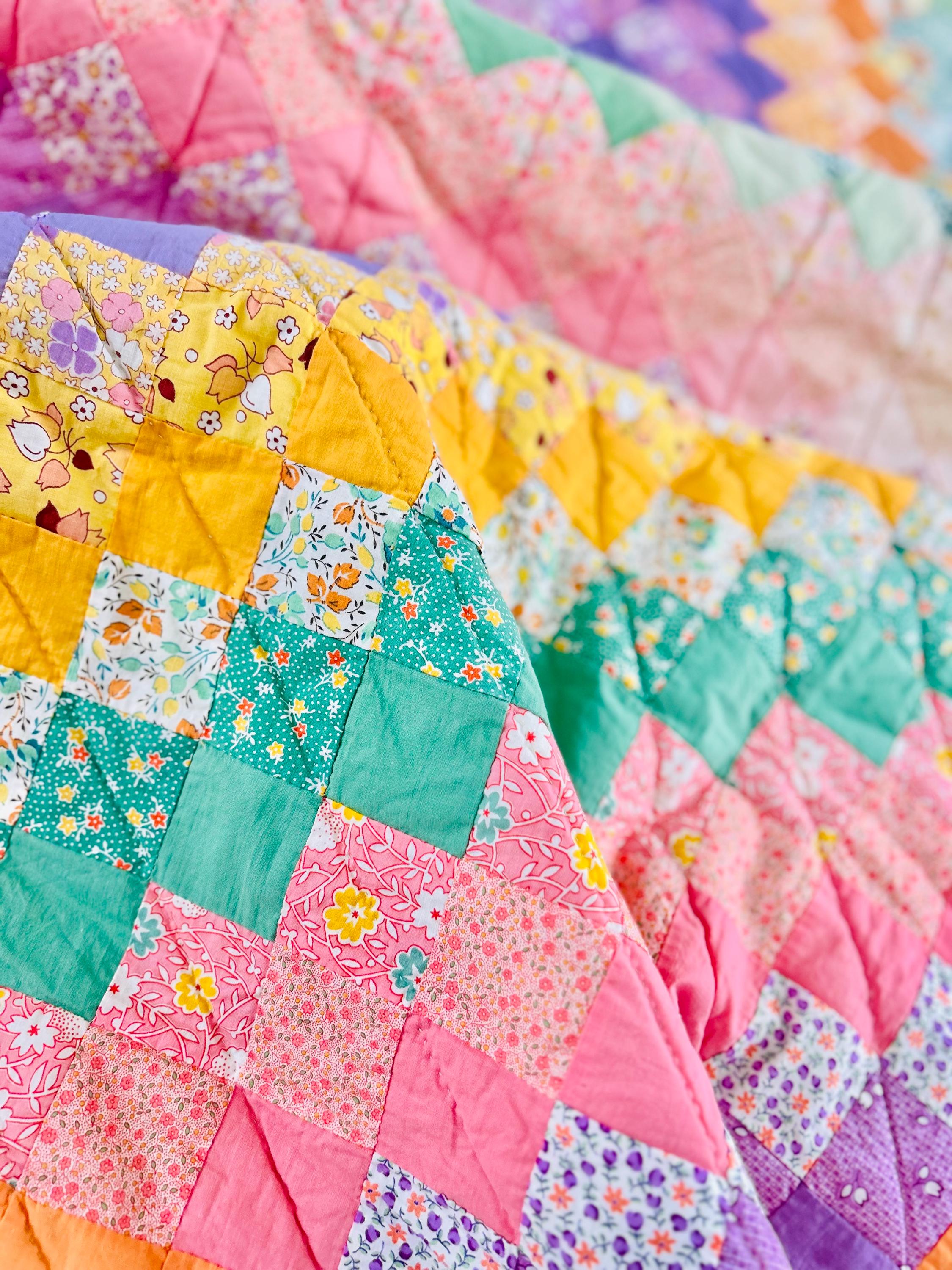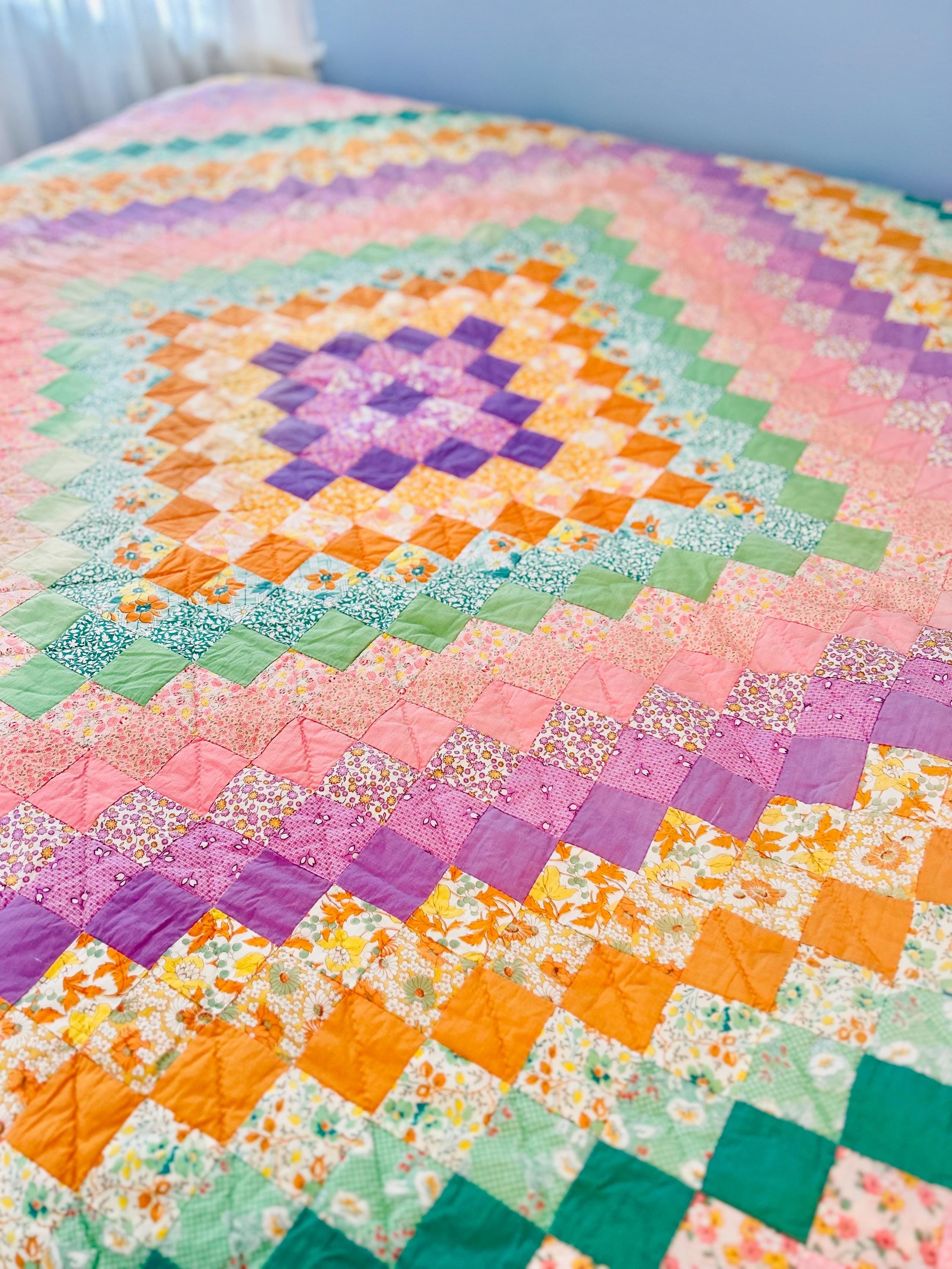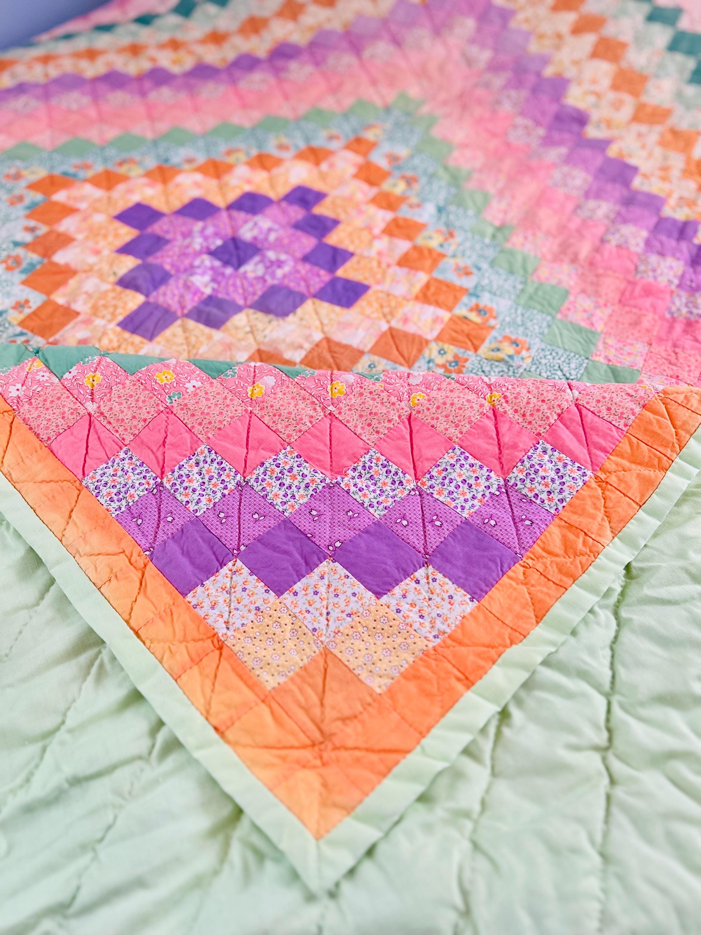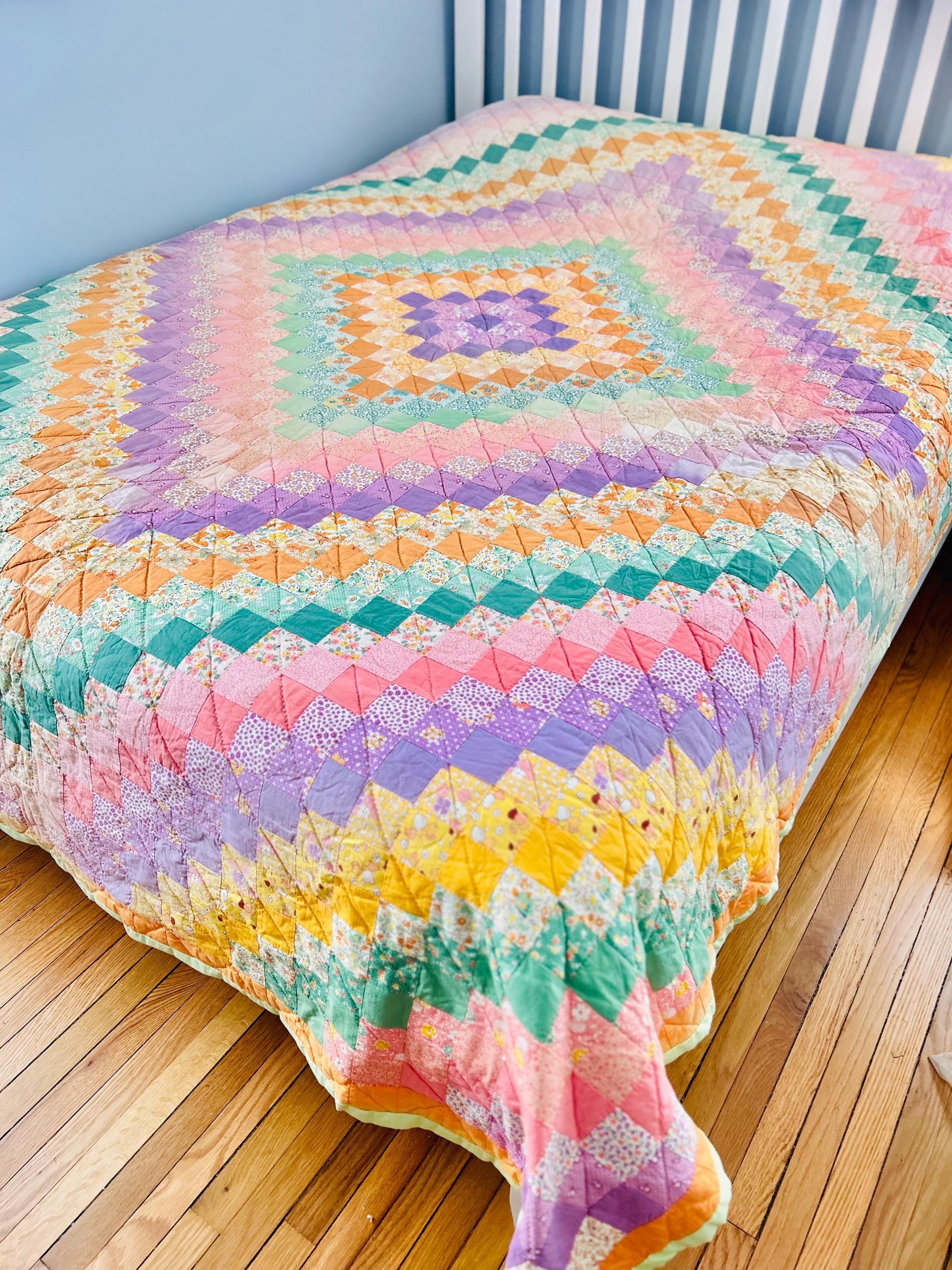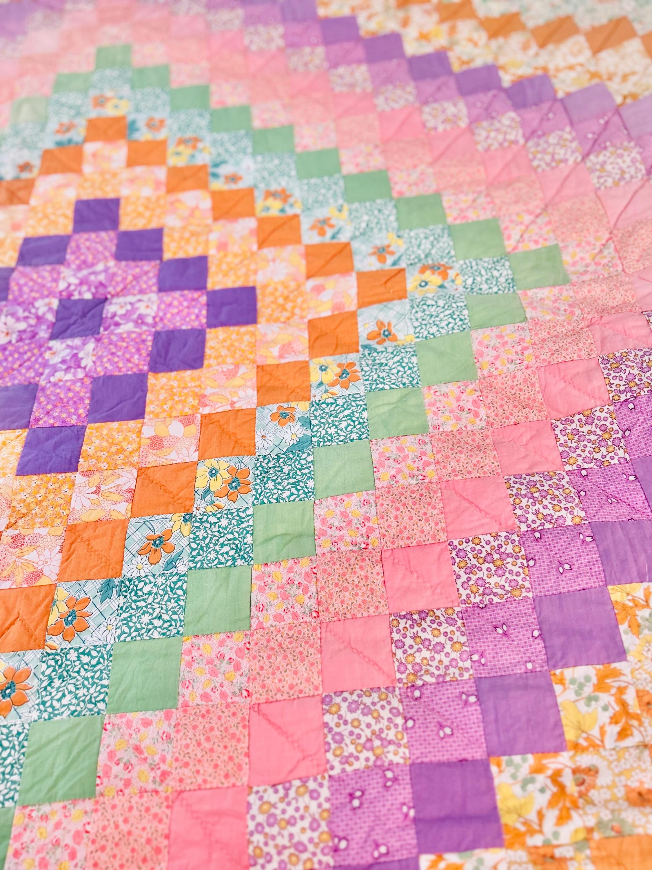 This Trip Around the World Quilt is made from more than 2,000 scrappy patchwork squares in cascading pastel colors. The hand-quilting is in diagonal lines through the patchwork.