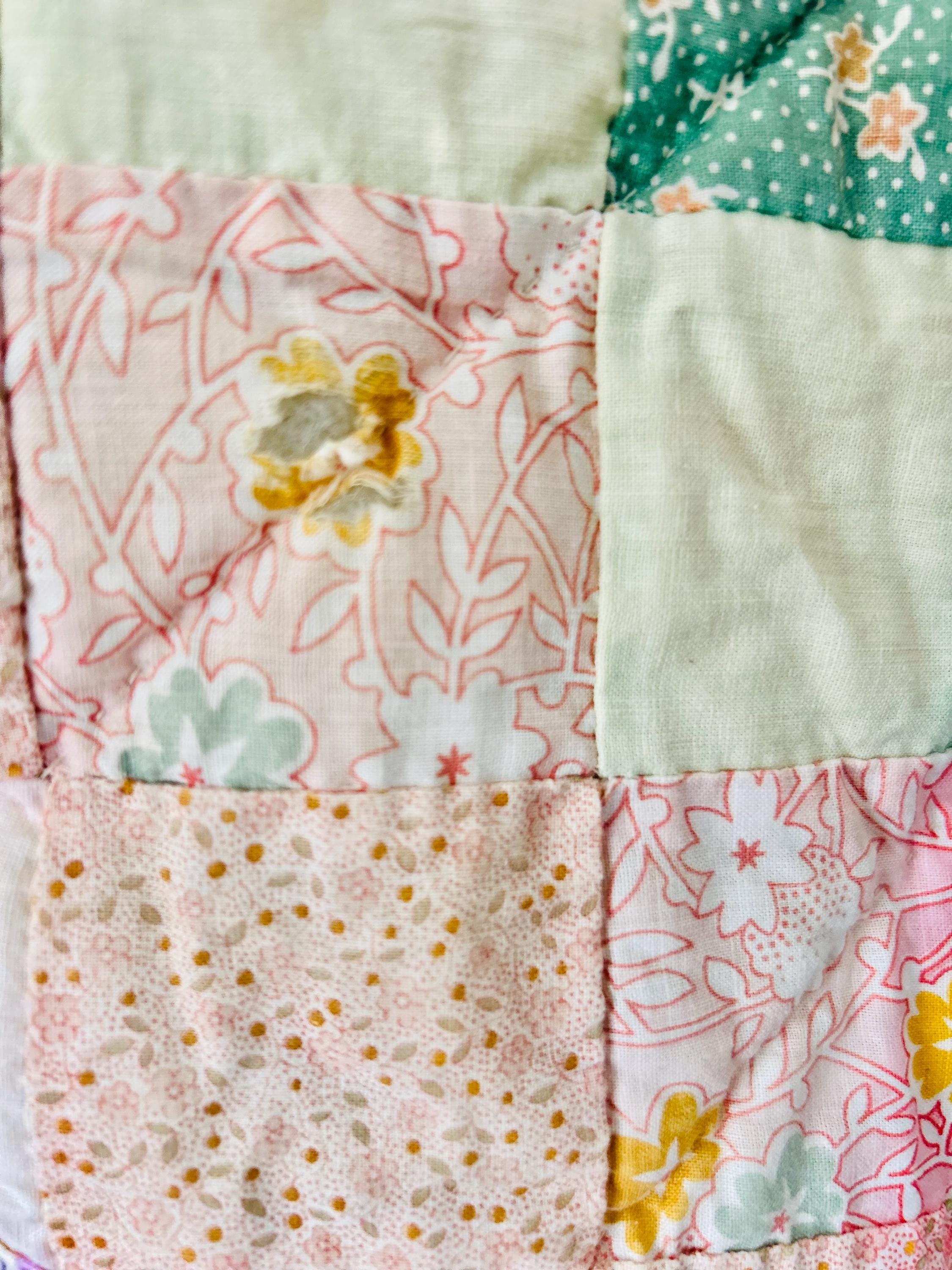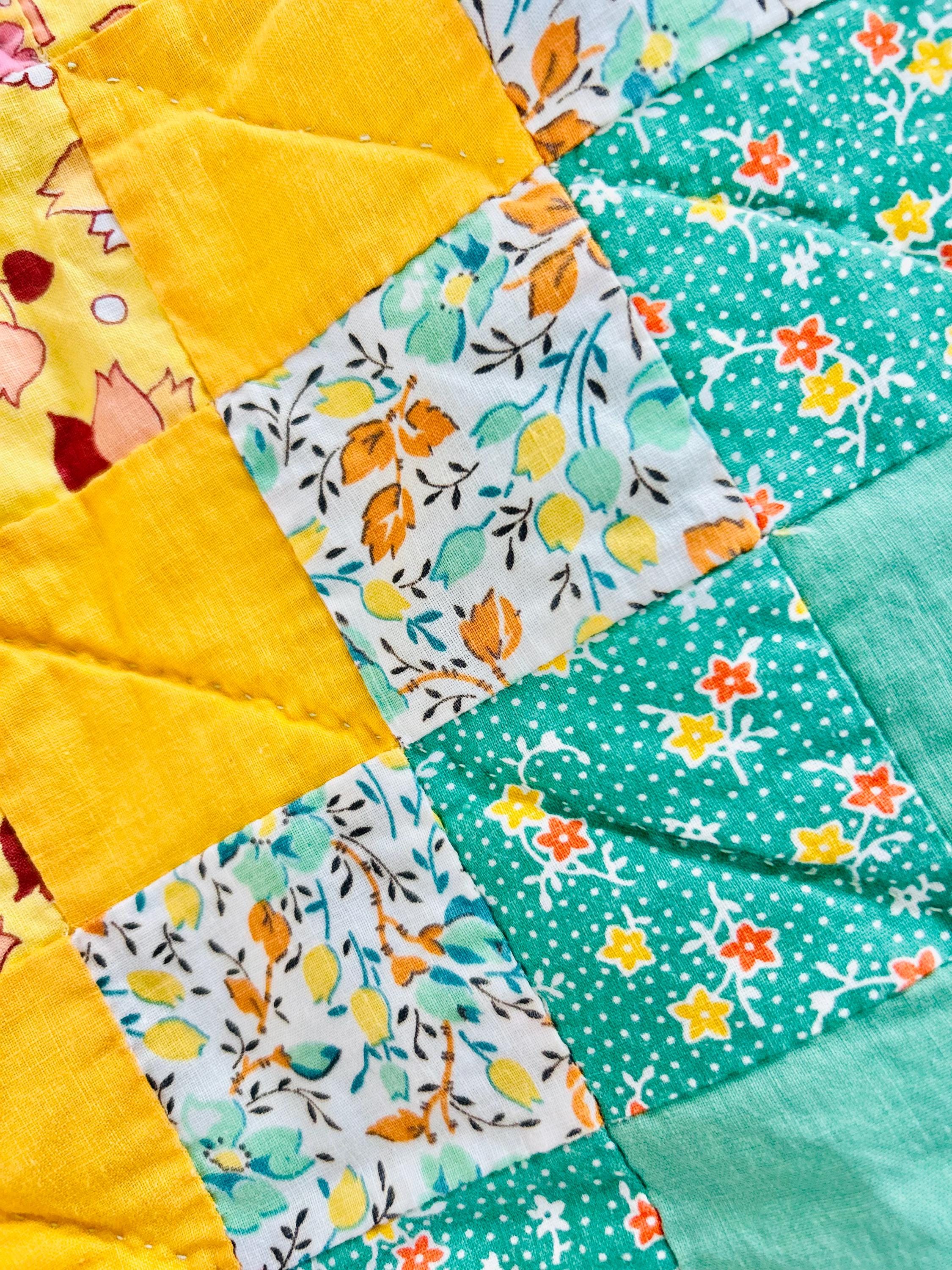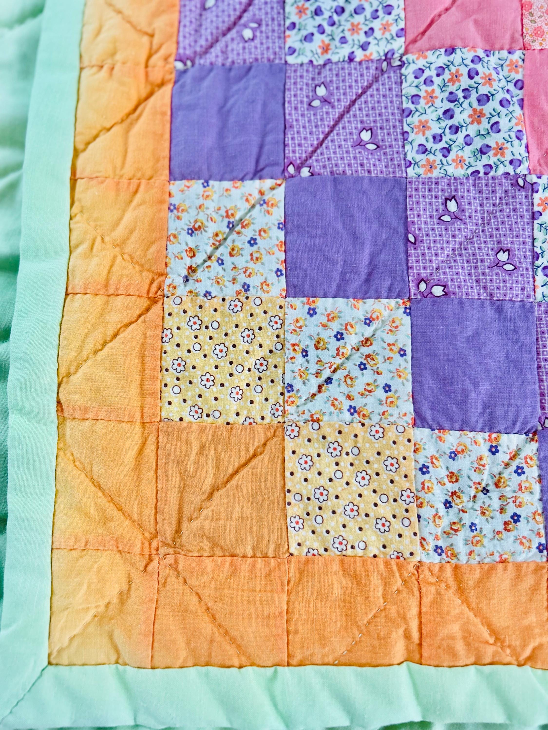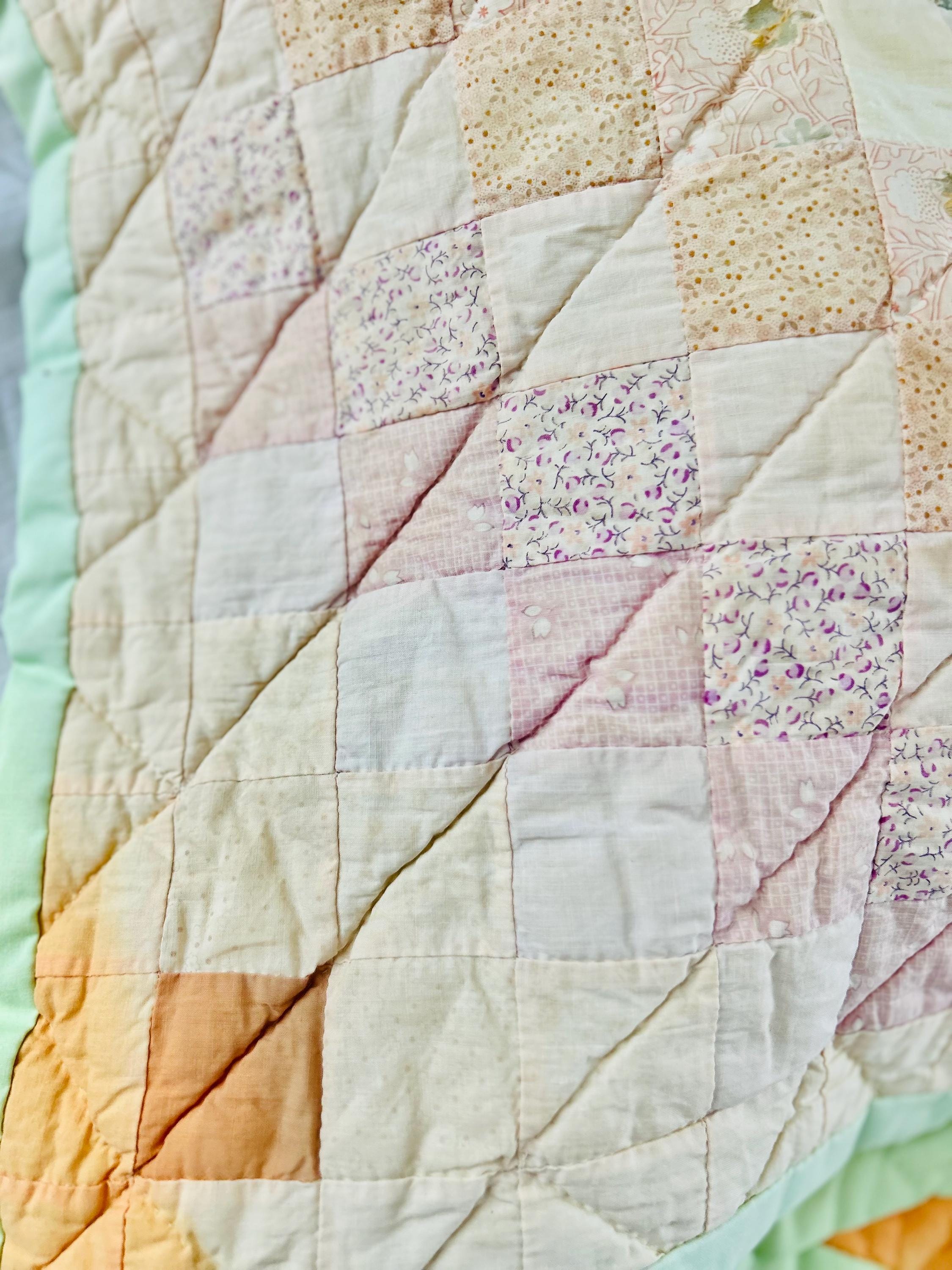 The back is mint green cotton that has been turned to the front and hand-stitched to form the binding. The batting is light to medium weight.