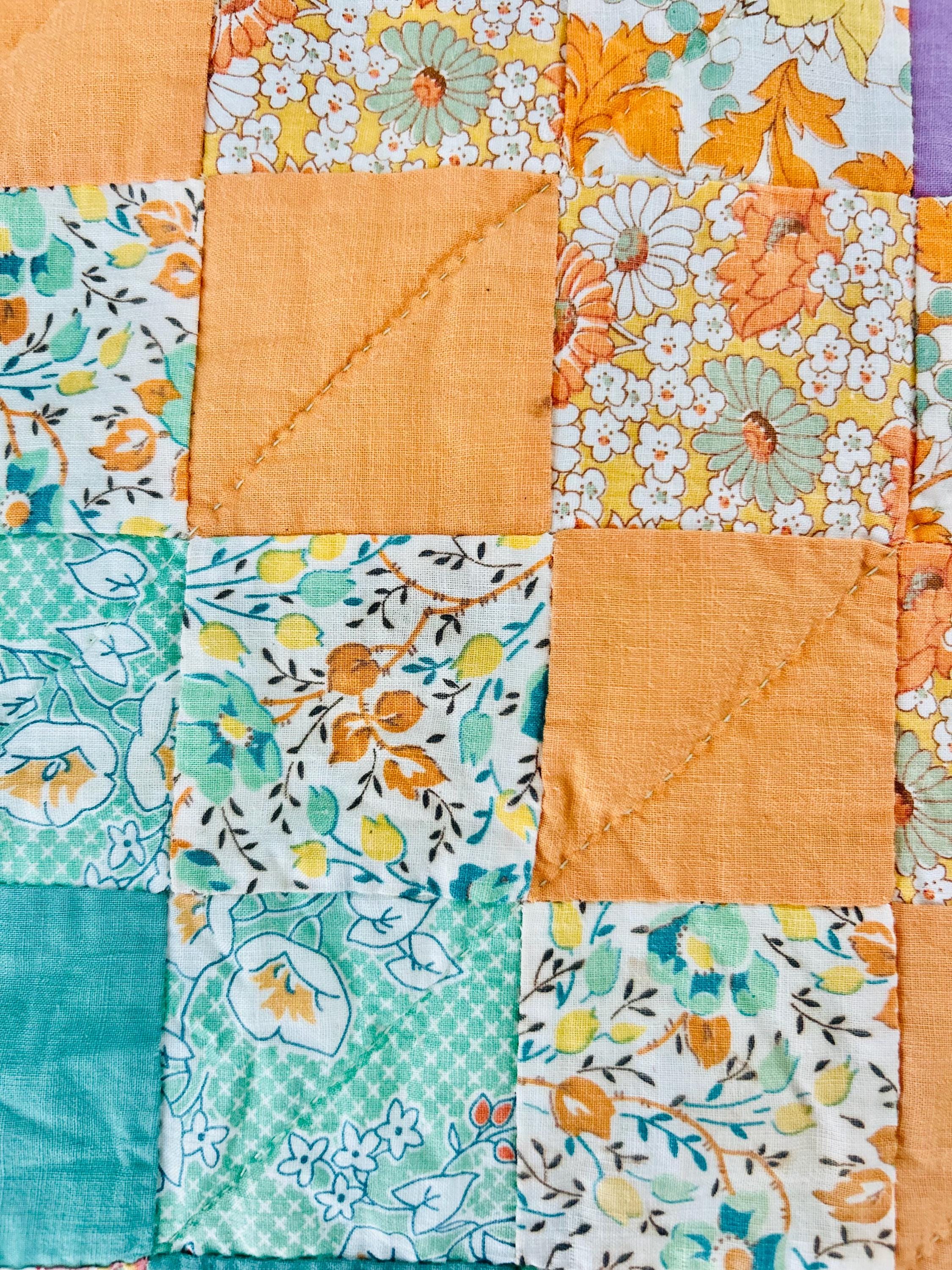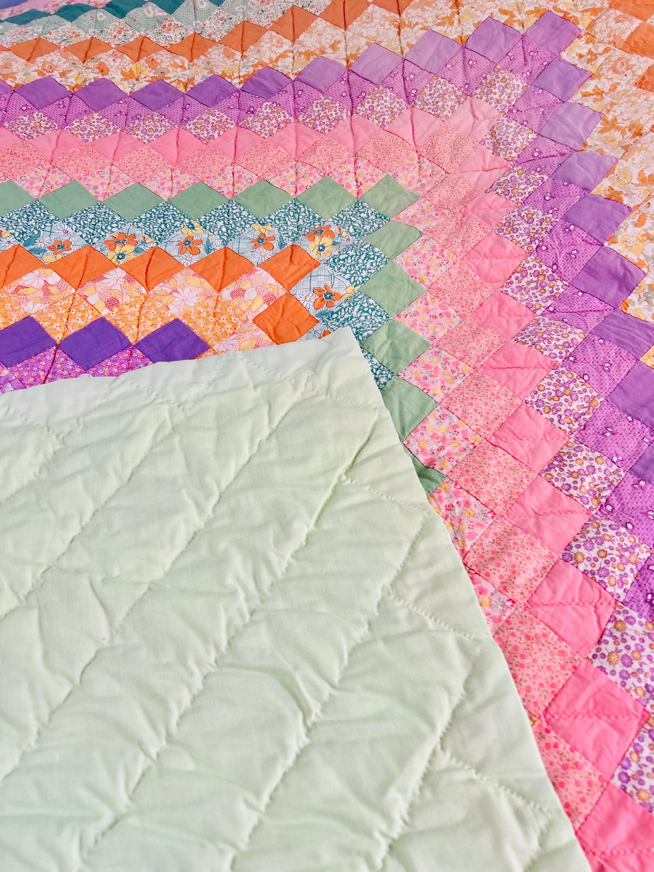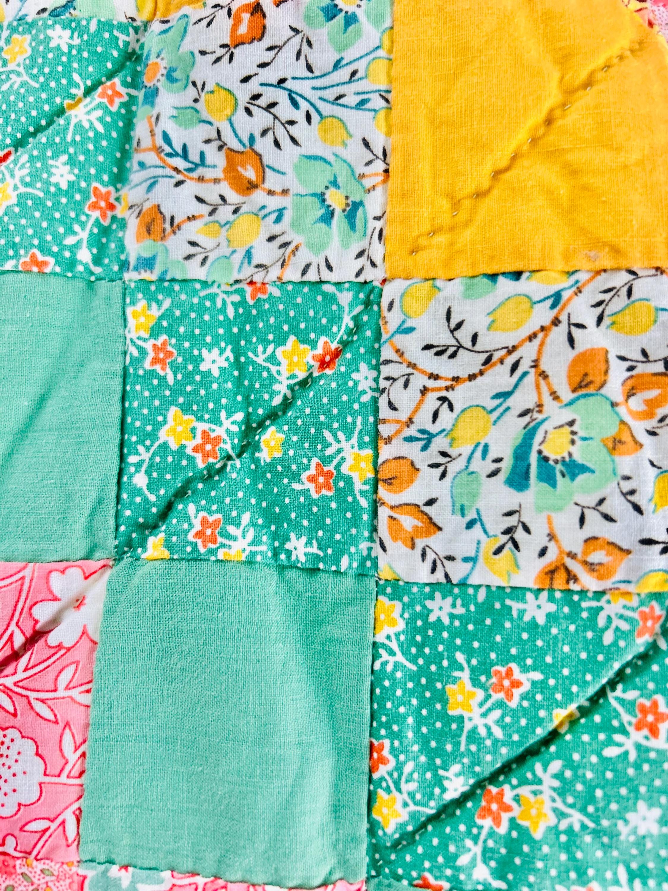The back is mint green cotton that has been turned to the front and hand-stitched to form the binding. The batting is light to medium weight.