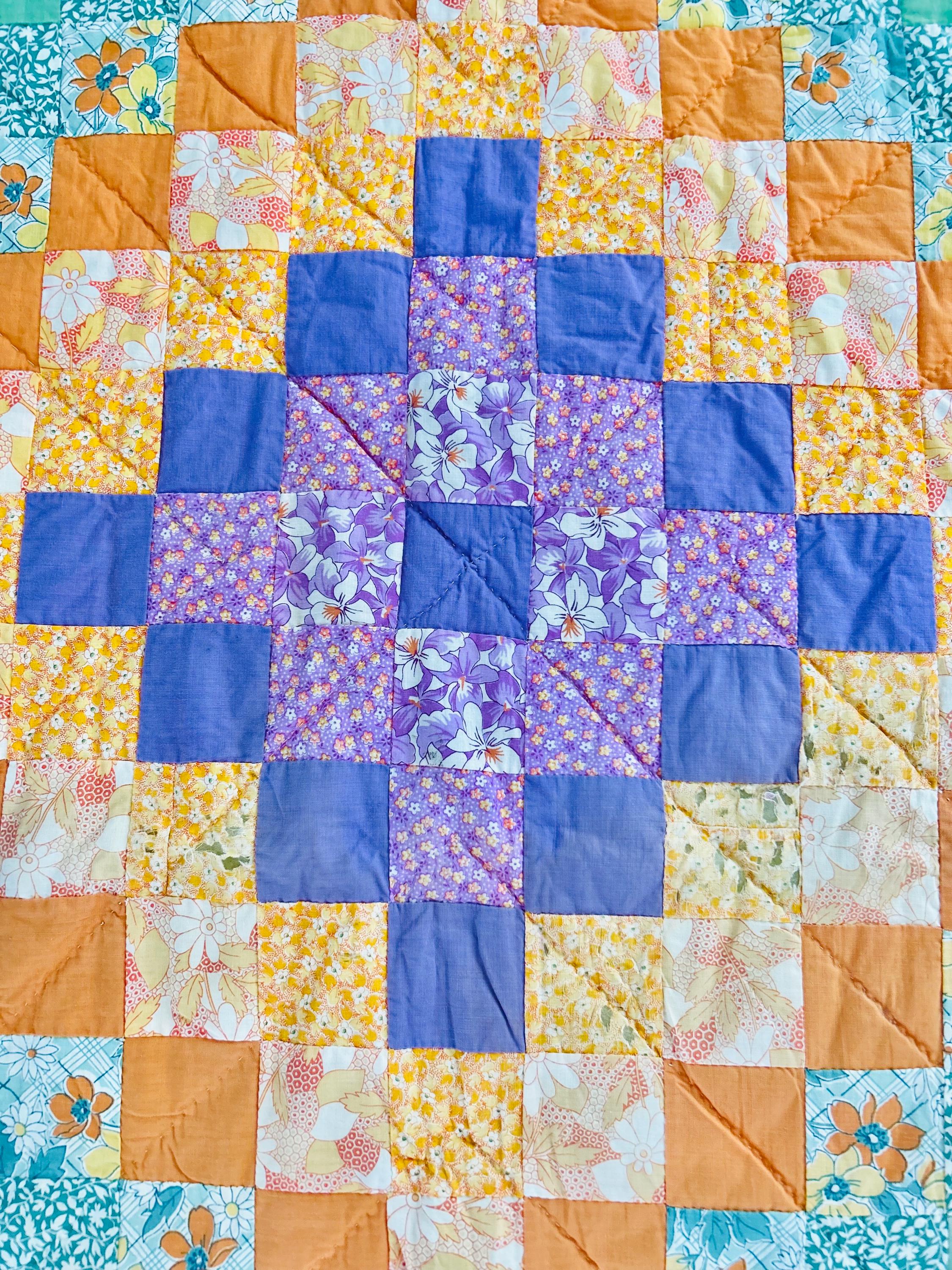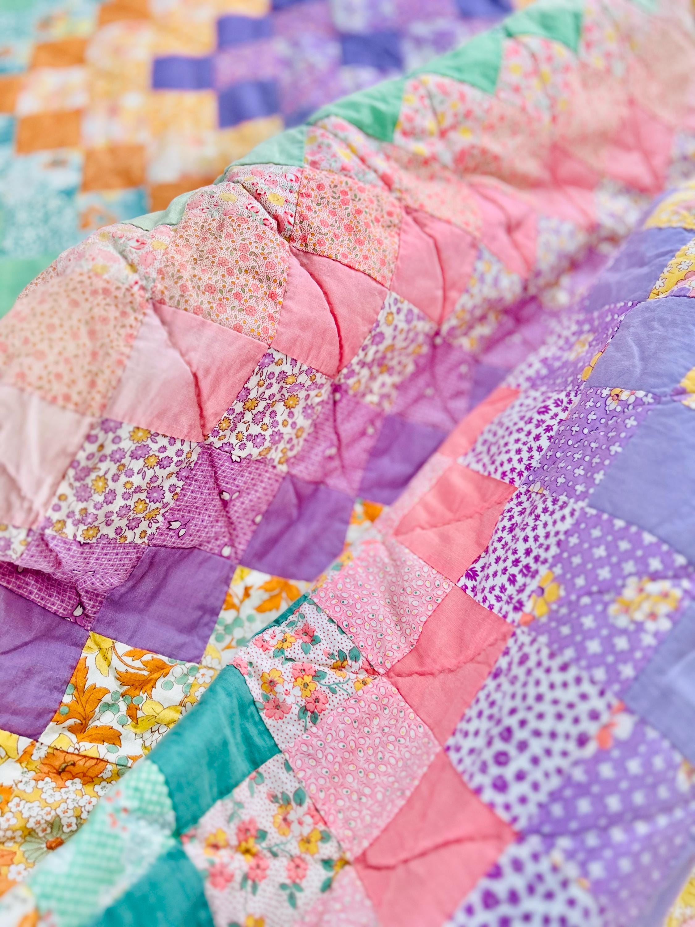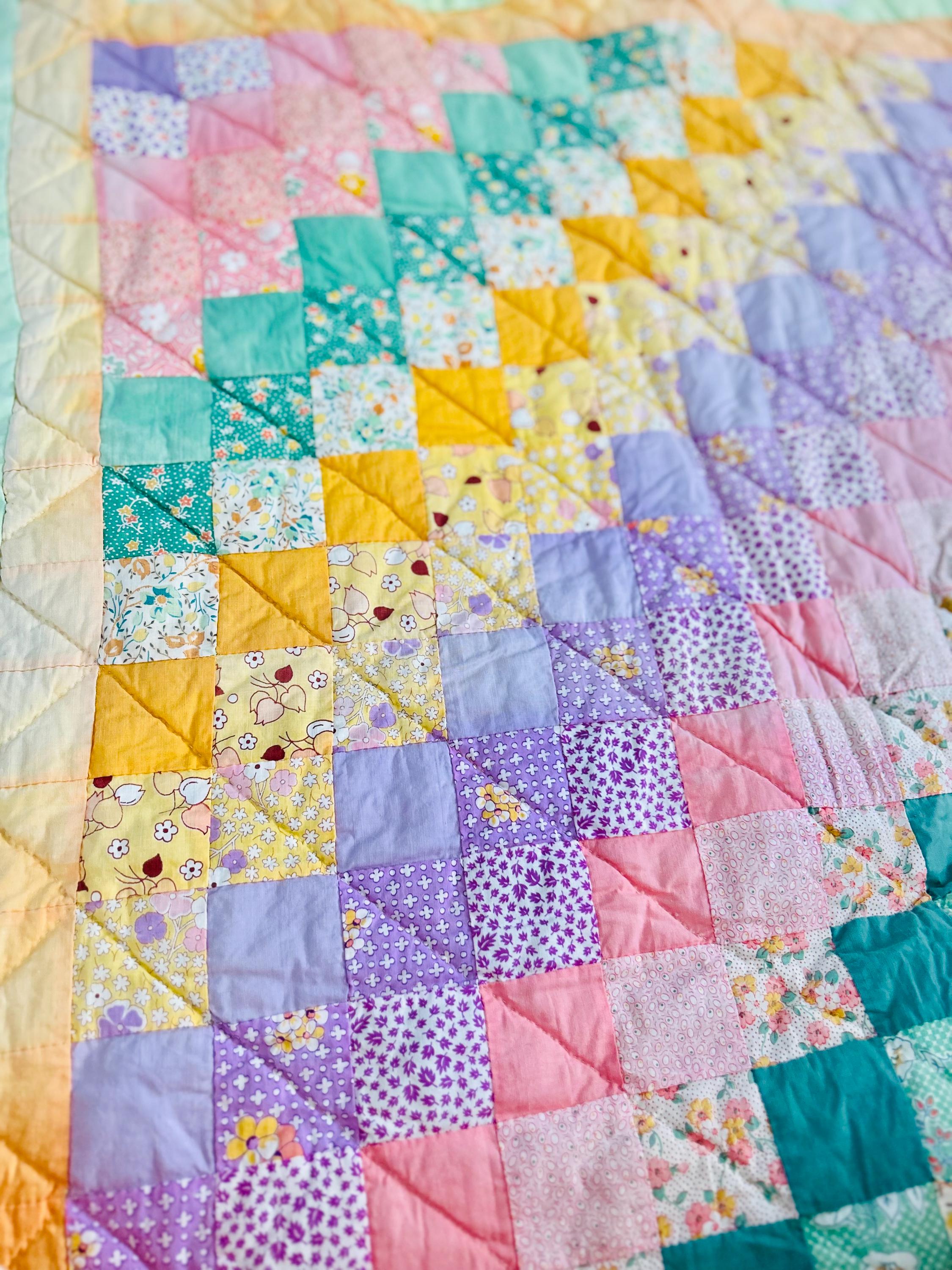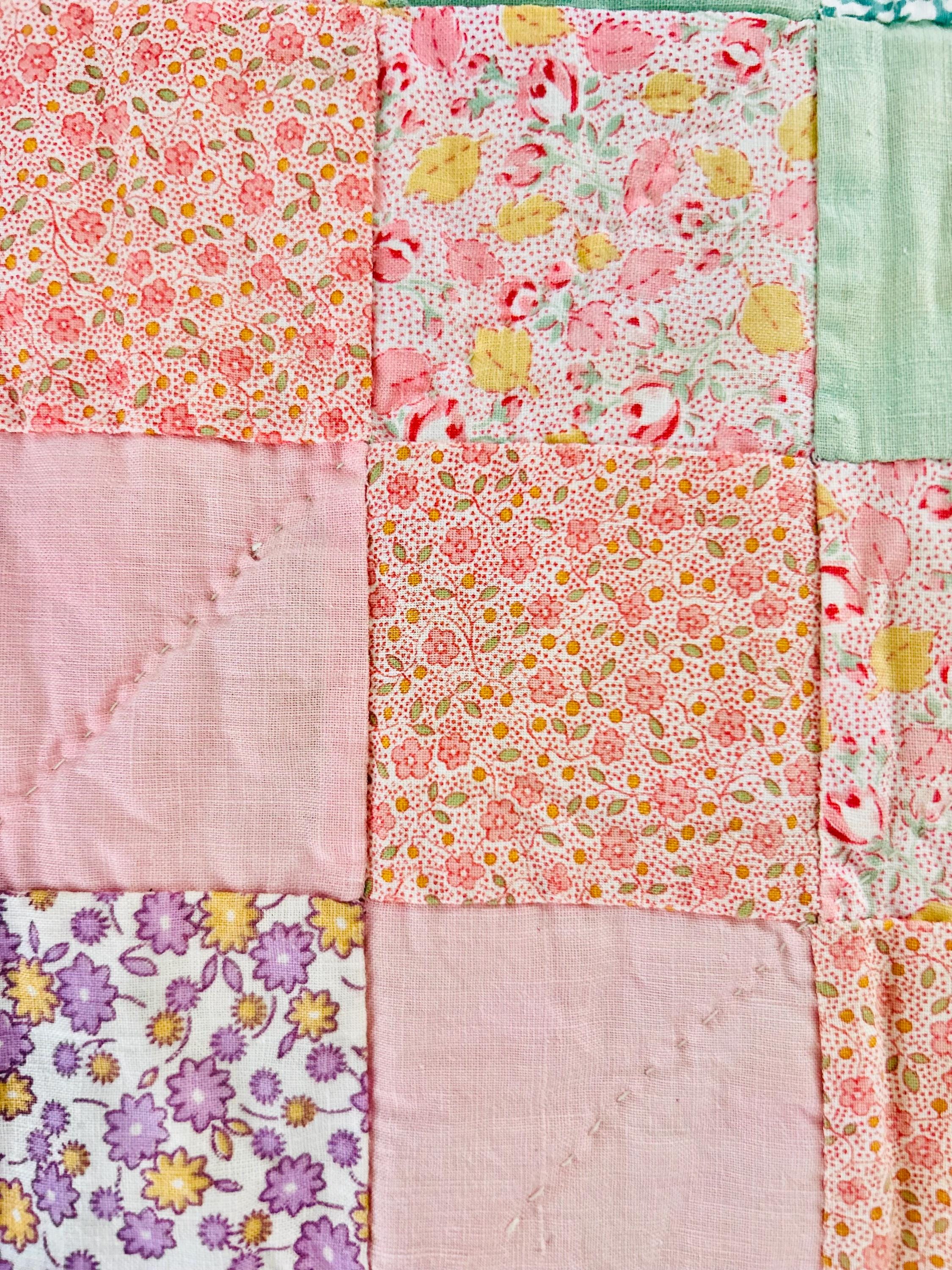 The back is mint green cotton that has been turned to the front and hand-stitched to form the binding. The batting is light to medium weight.