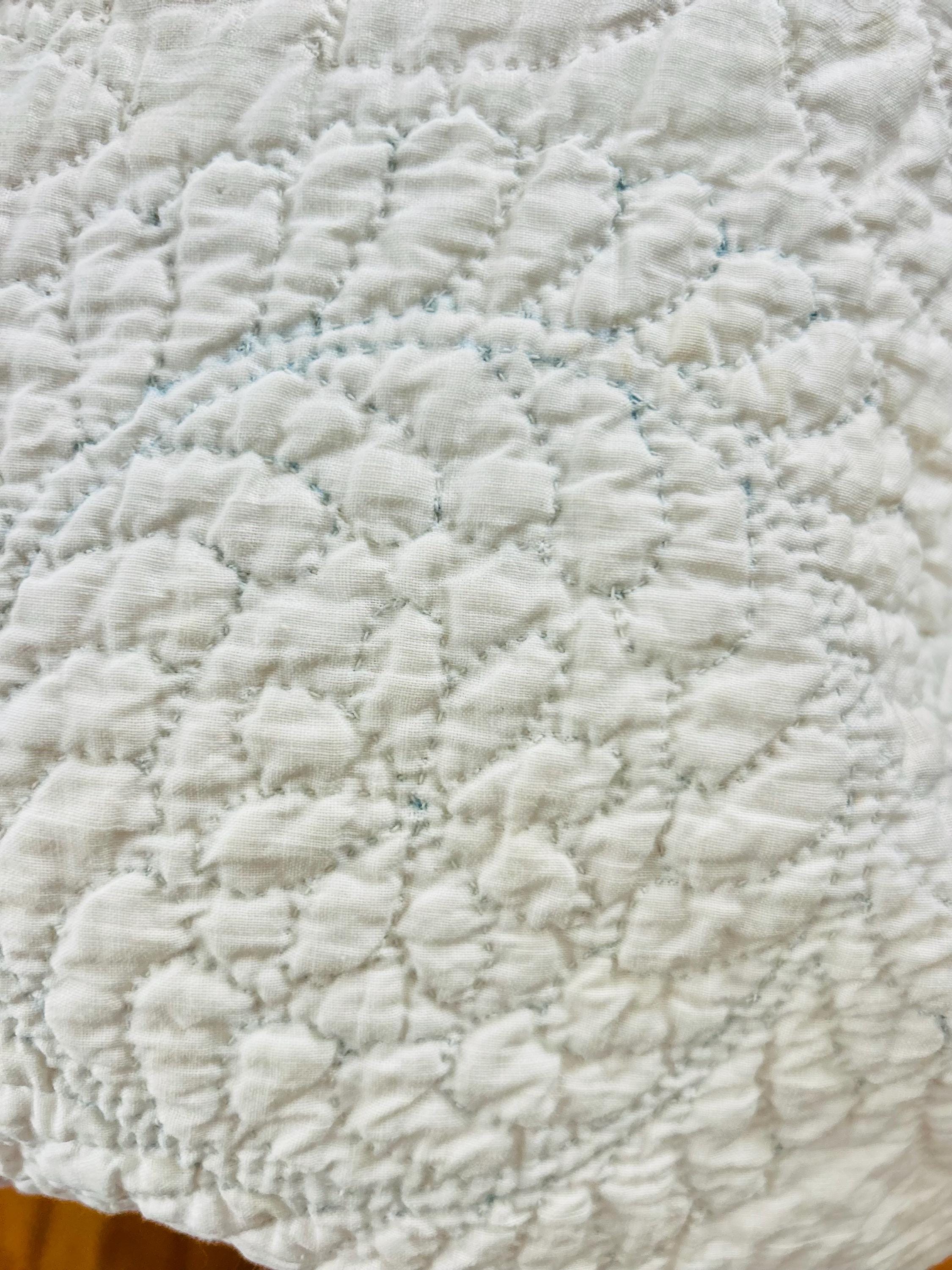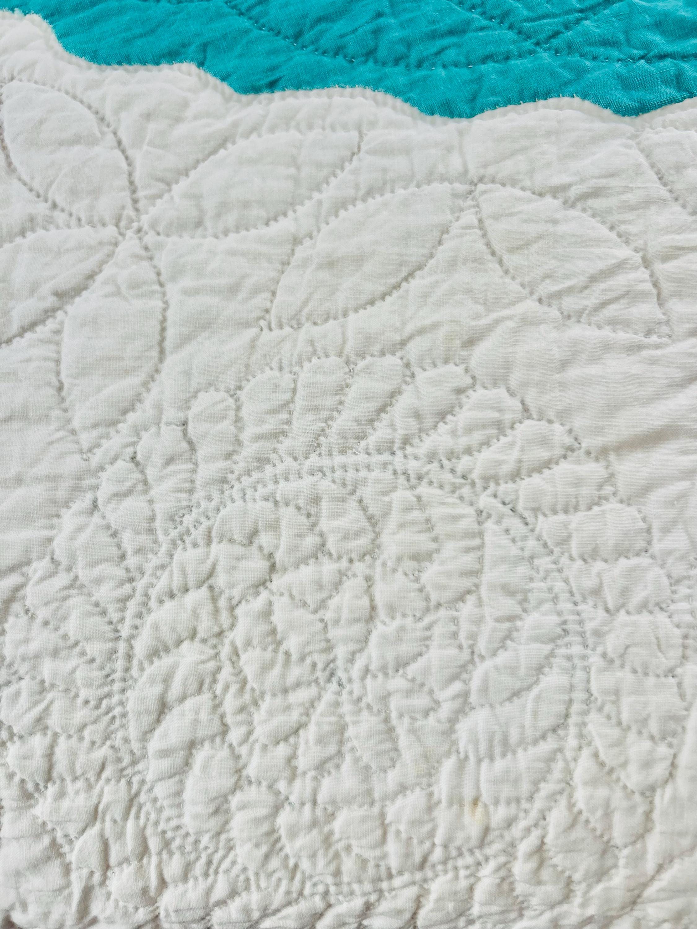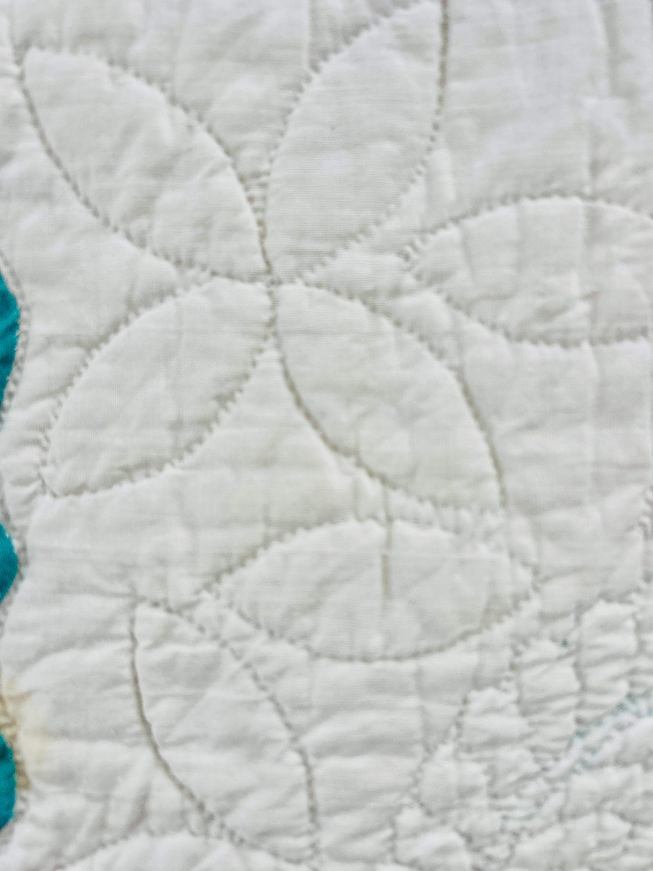 The back is white cotton while the binding is light blue cotton that has been machine stitched to the front and hand-stitched to the back. The cotton batting is lightweight.