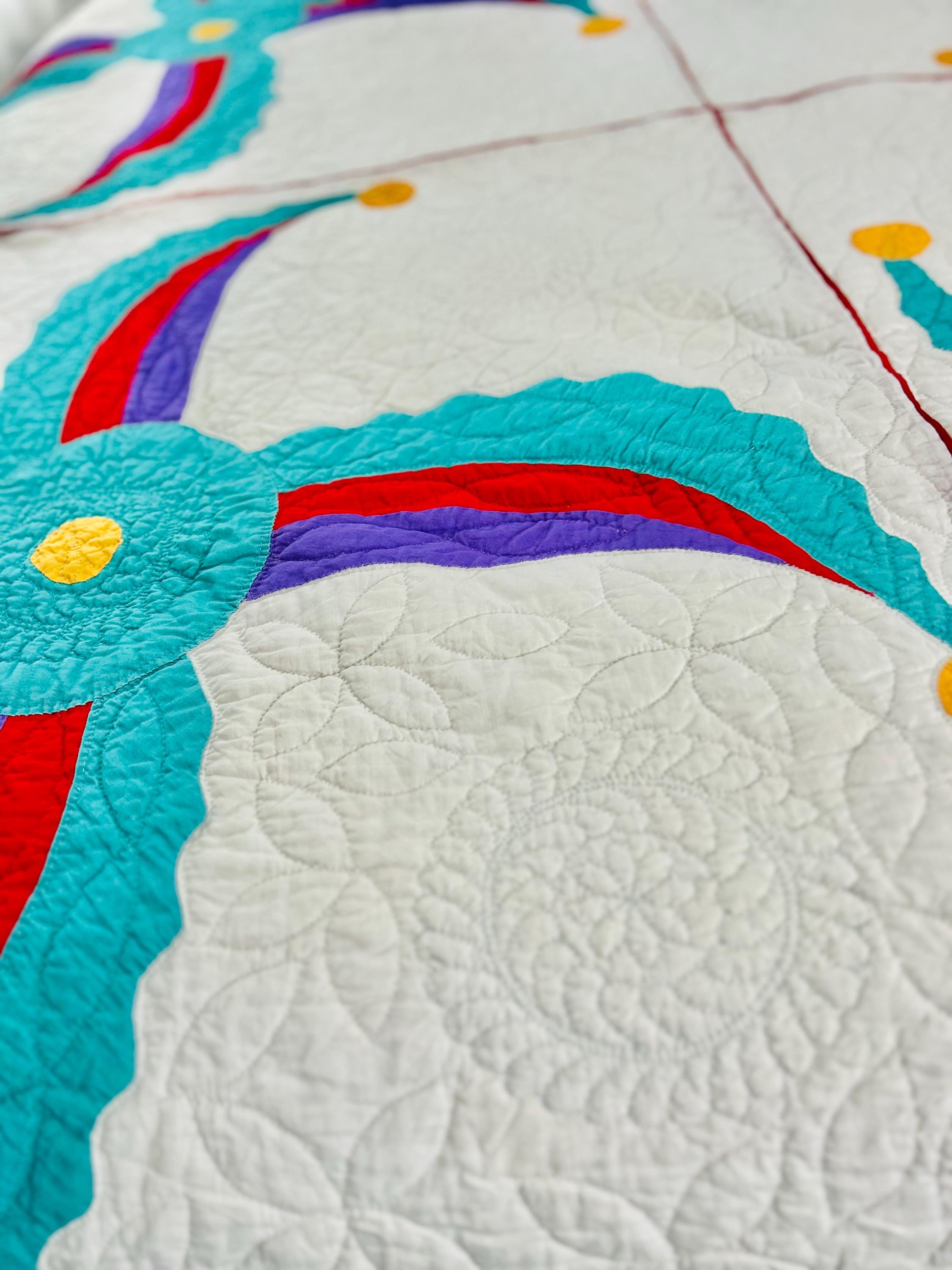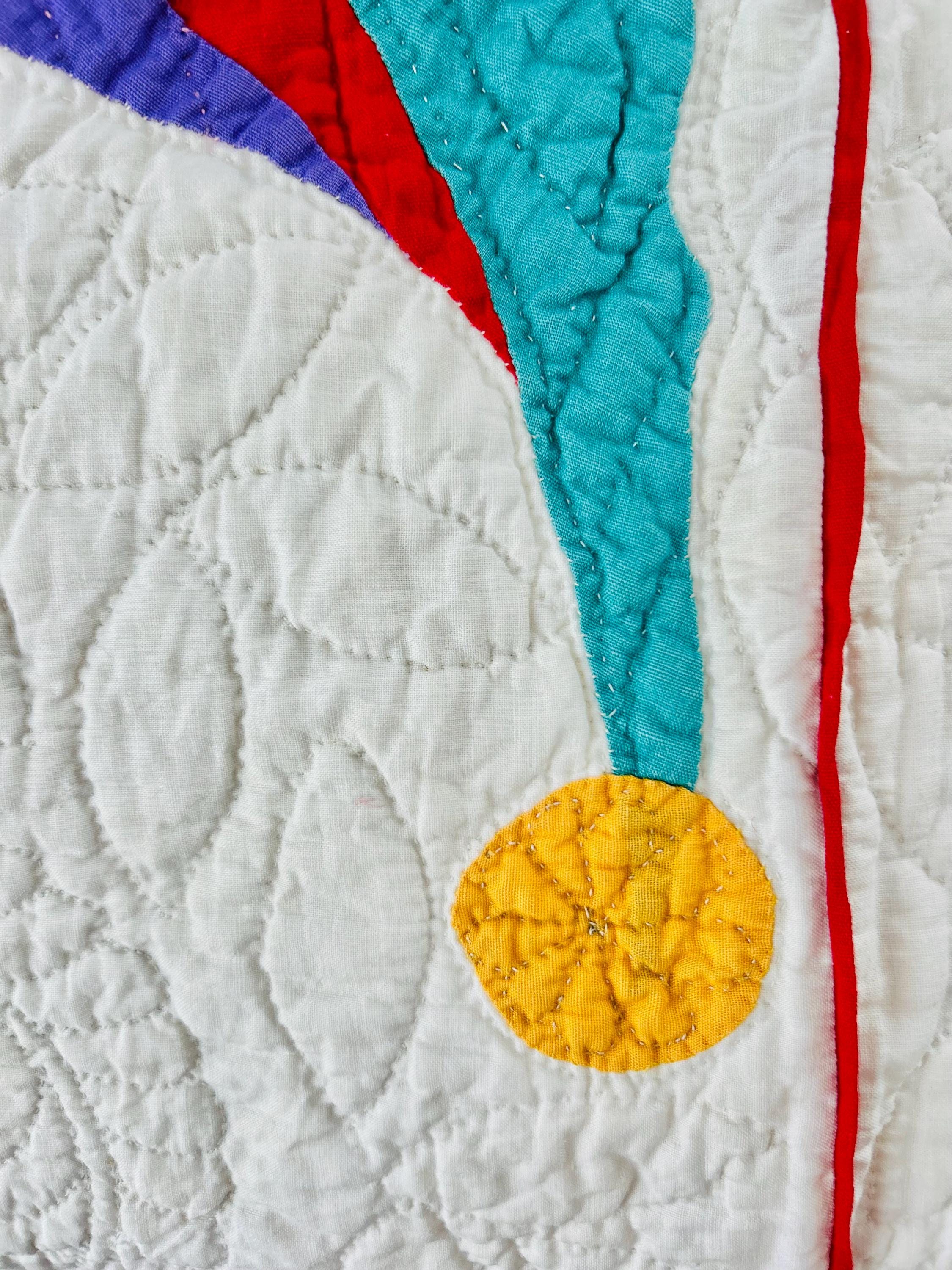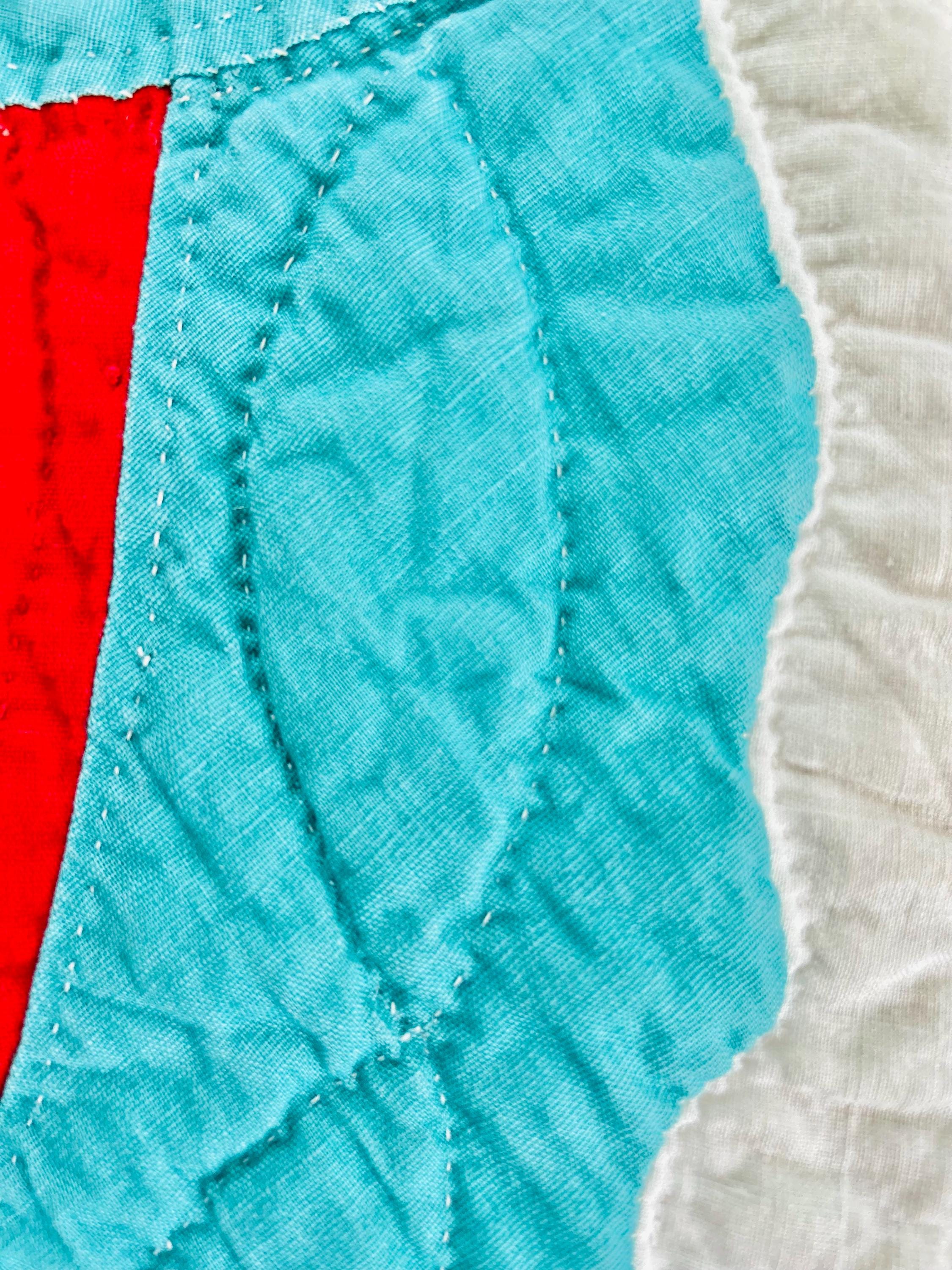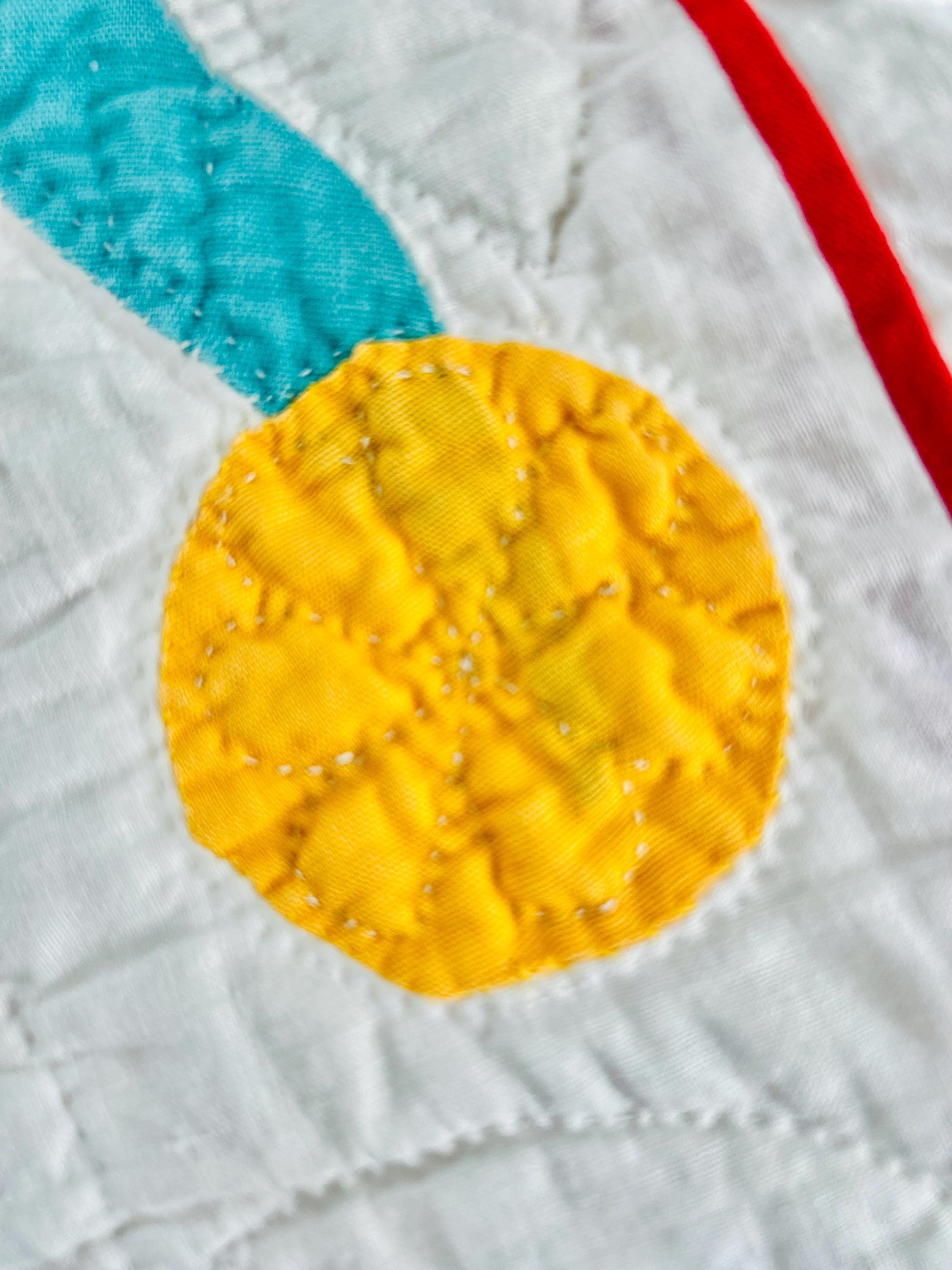 The back is white cotton while the binding is light blue cotton that has been machine stitched to the front and hand-stitched to the back. The cotton batting is lightweight.