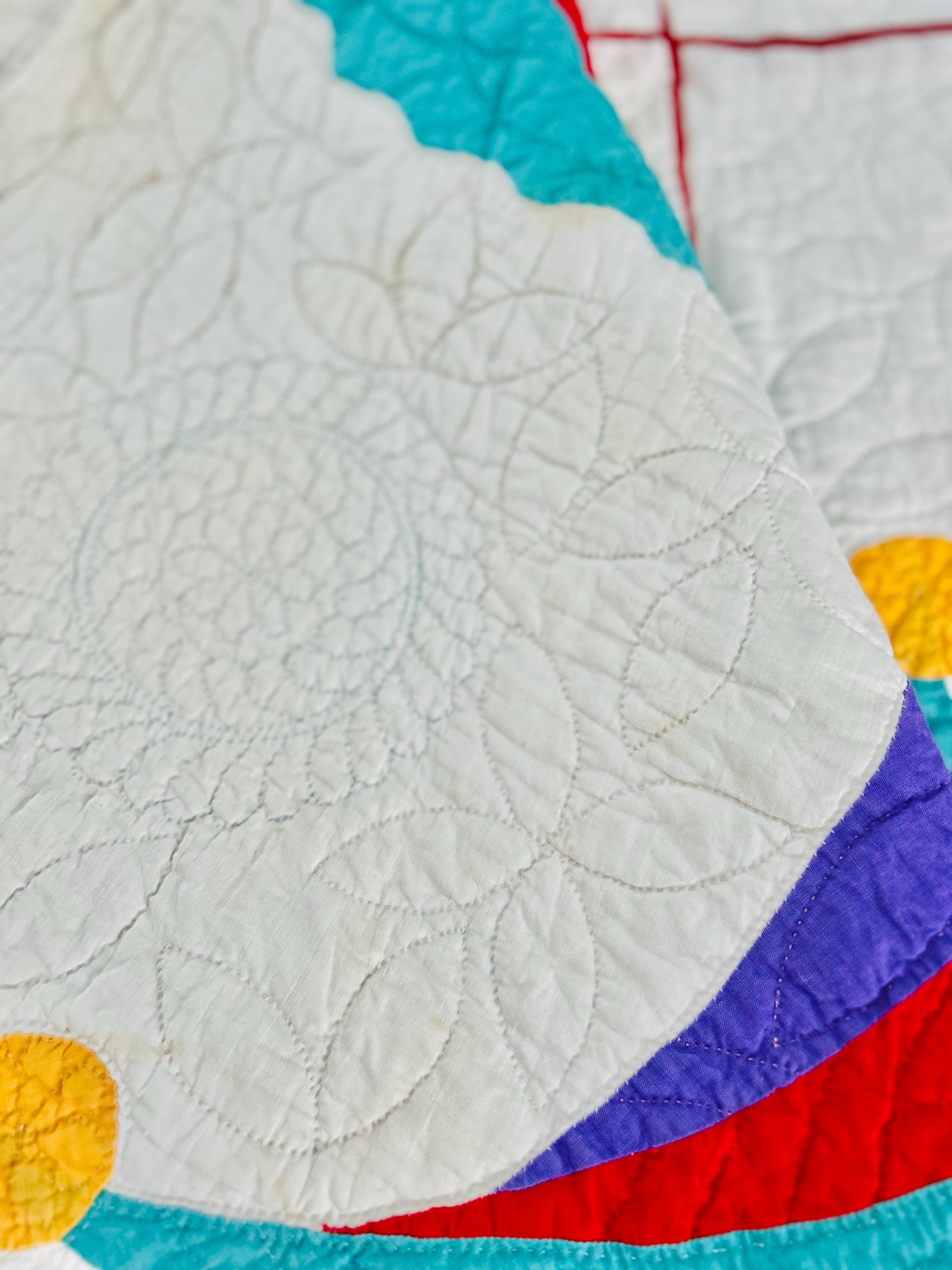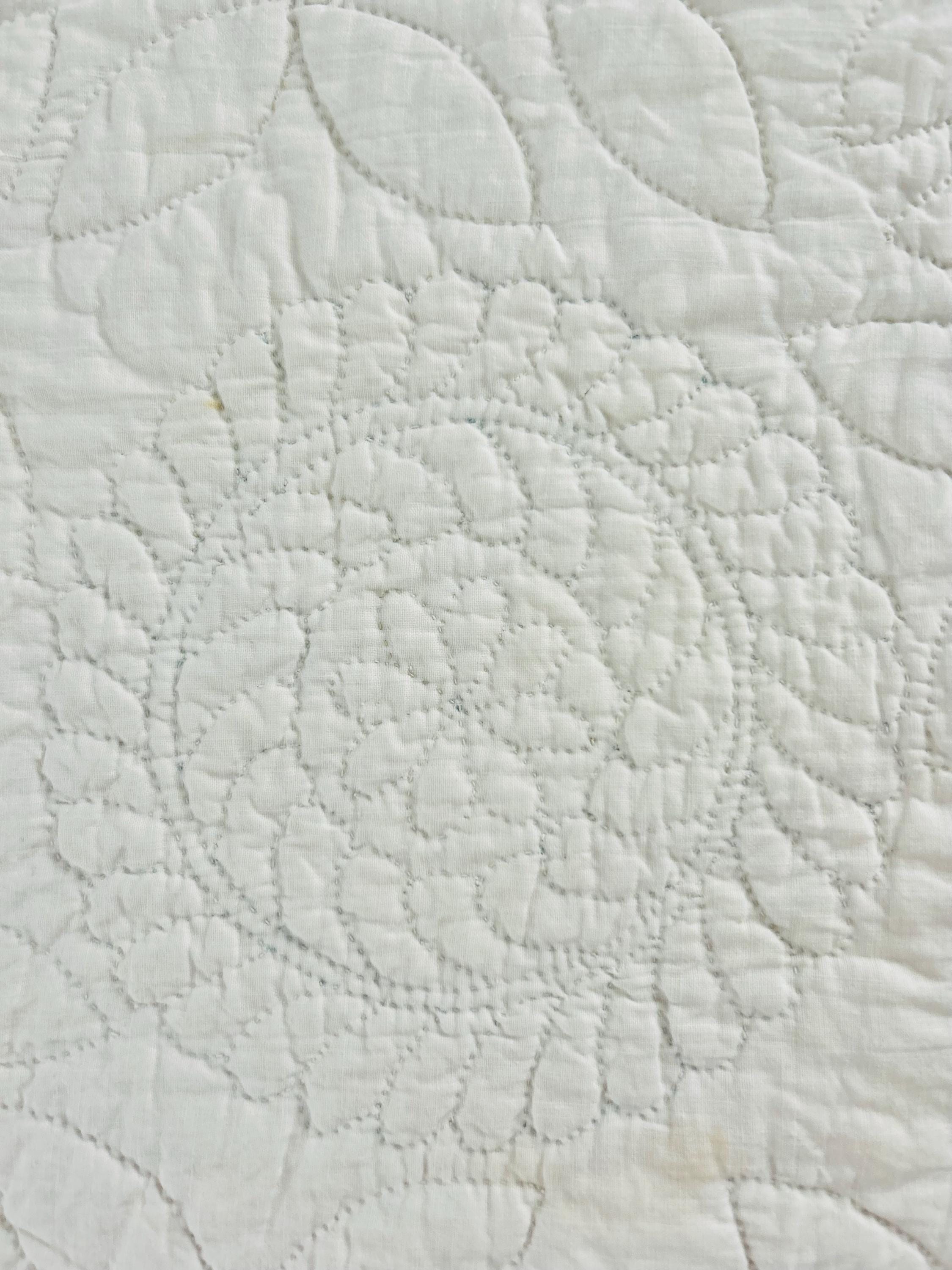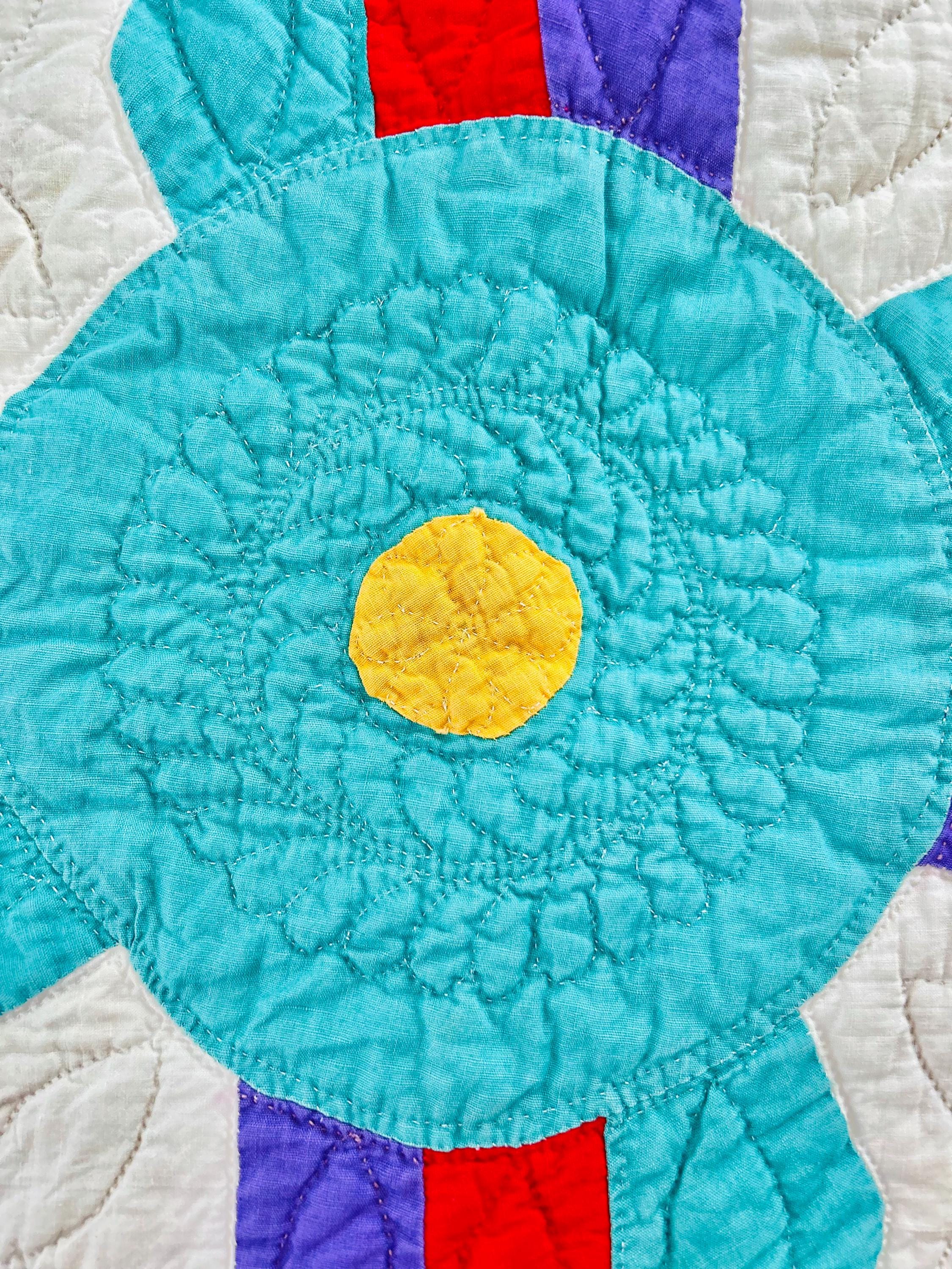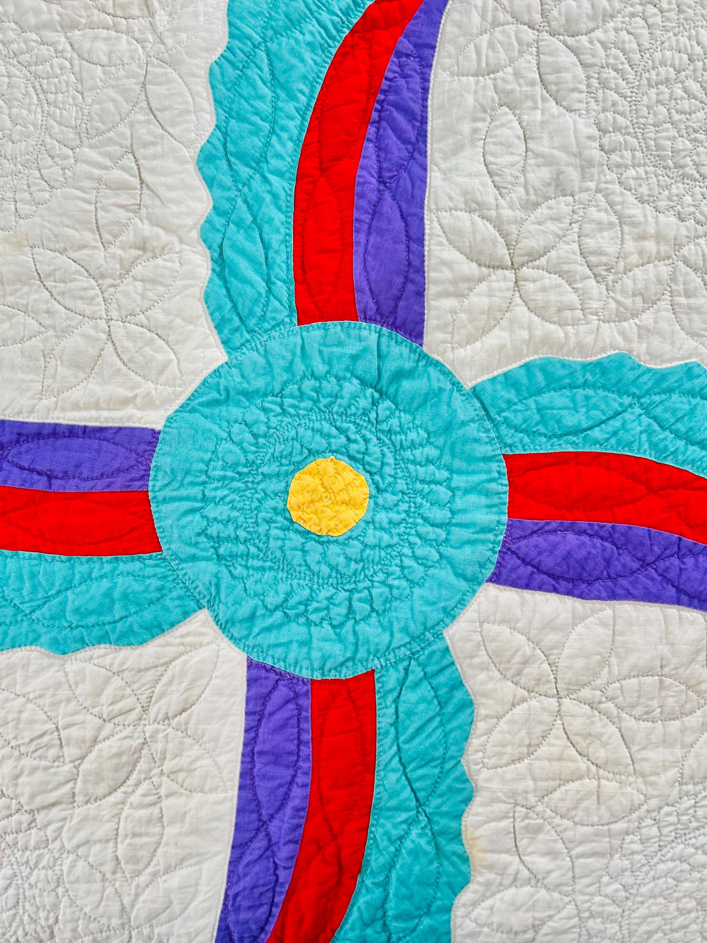 This stunning Chariot Wheel Quilt, circa 1920s, has four panels of Chariot Wheels, all hand-quilted in feathers, small feather wreaths, flower petals and geometric chains through the "wheels".