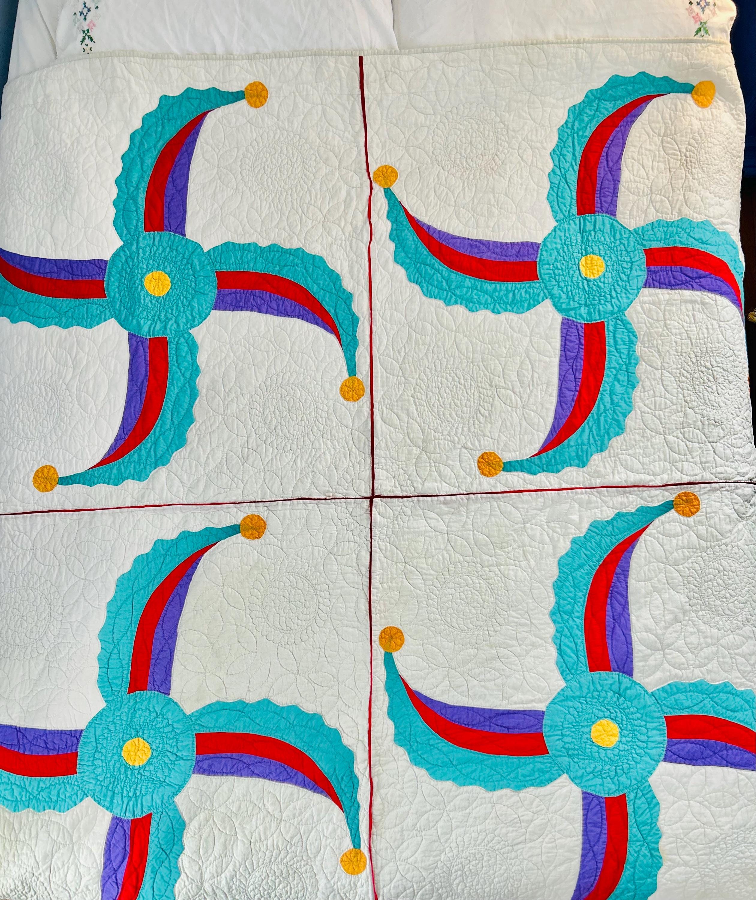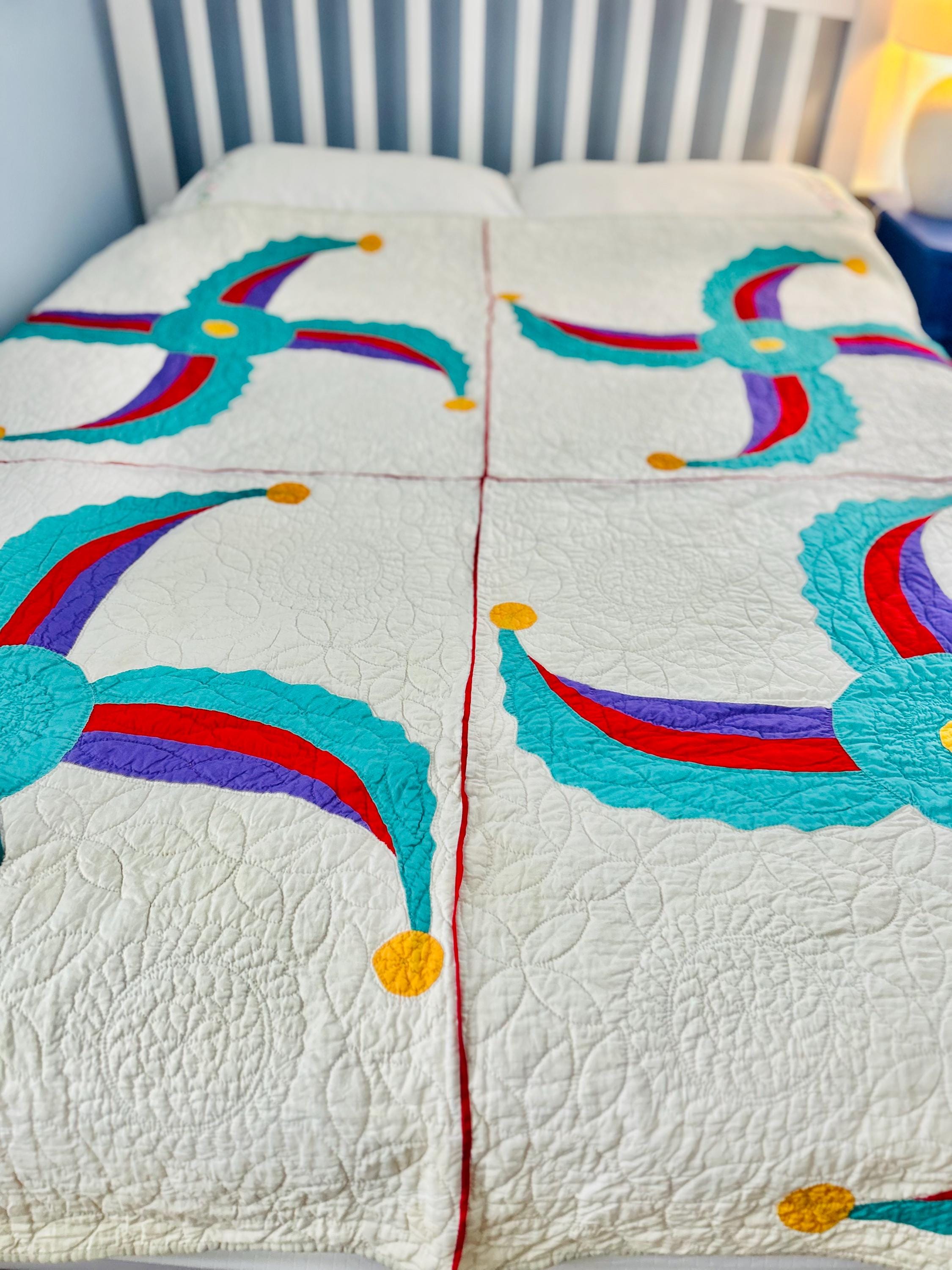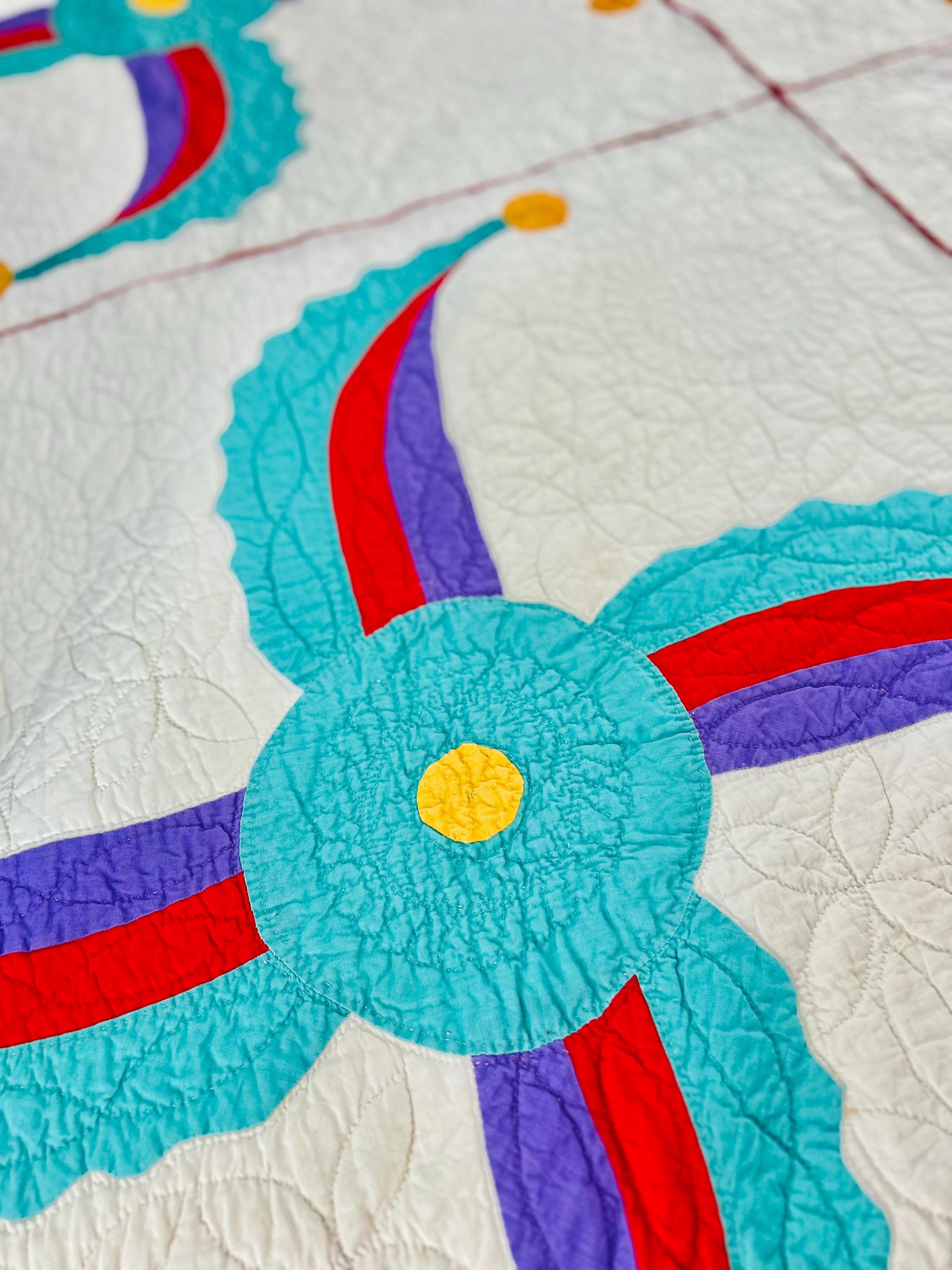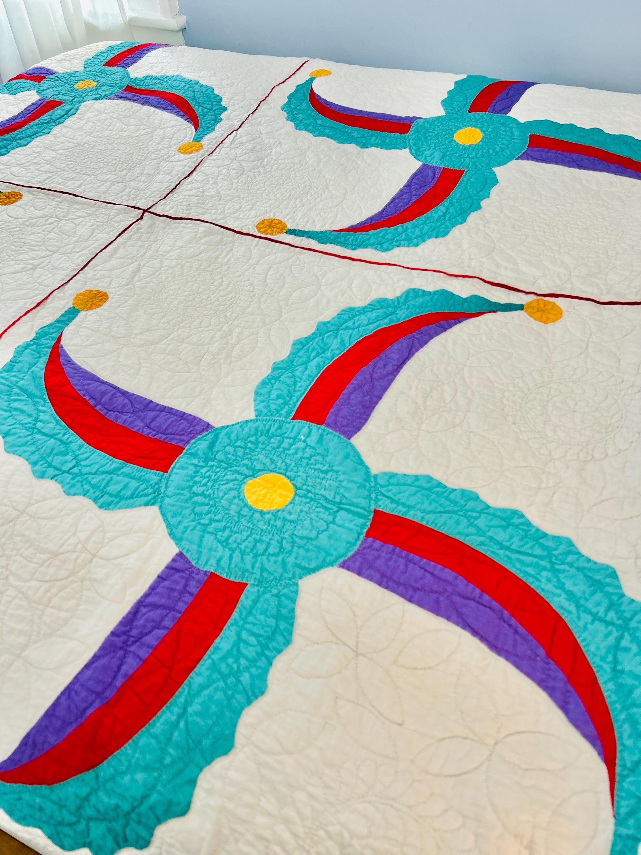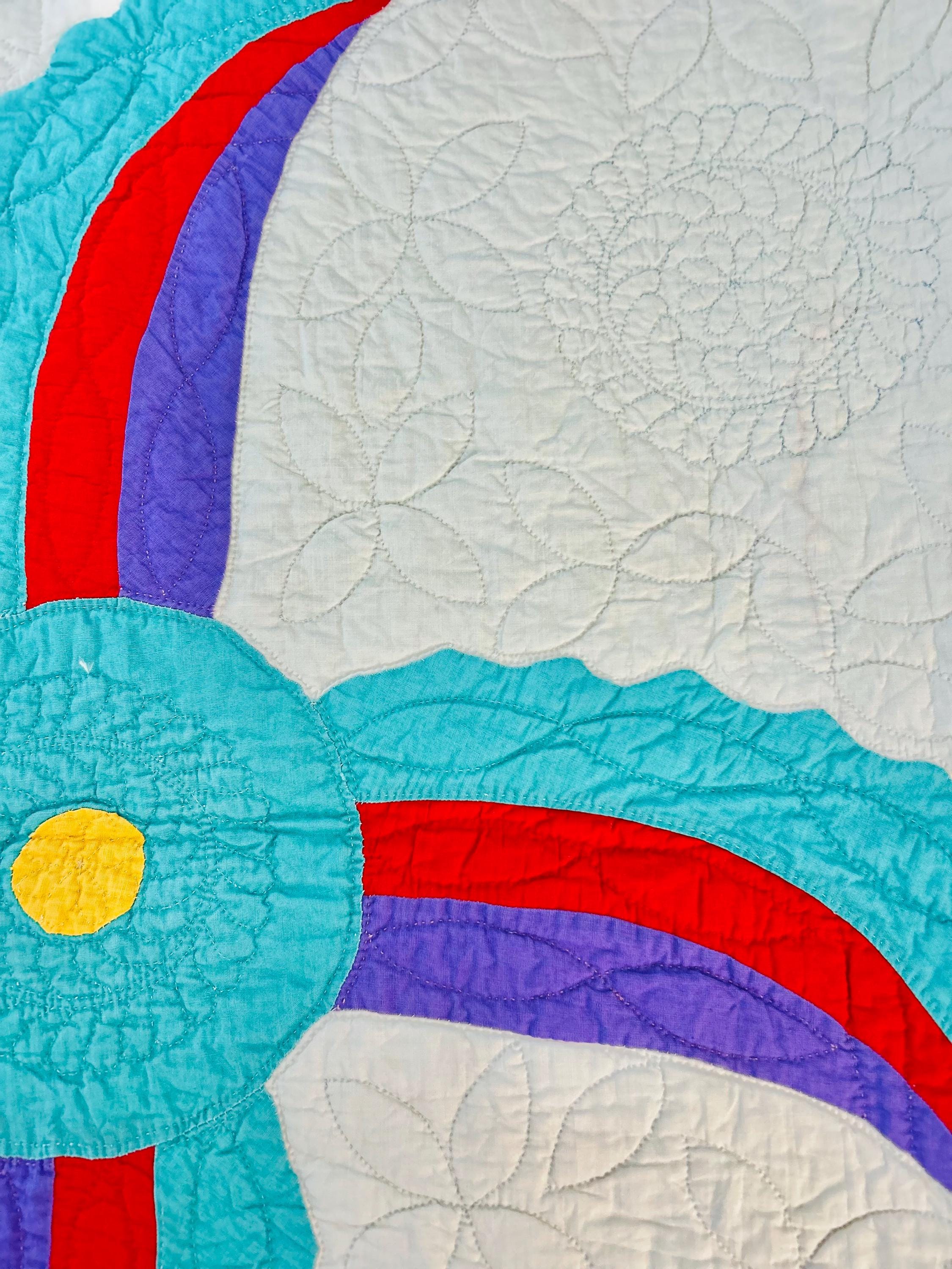 This stunning Chariot Wheel Quilt, circa 1920s, has four panels of Chariot Wheels, all hand-quilted in feathers, small feather wreaths, flower petals and geometric chains through the "wheels".