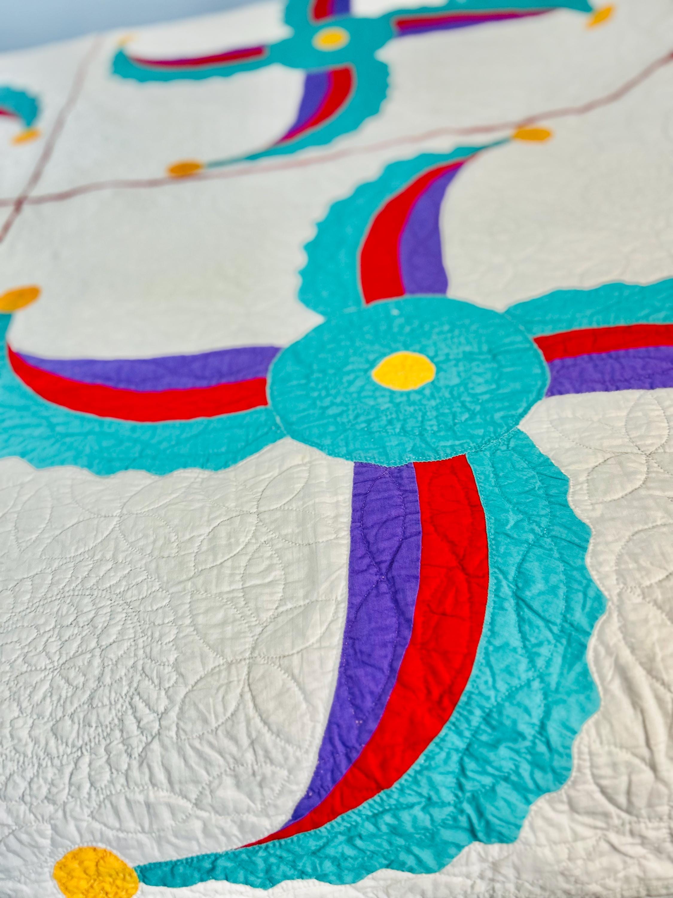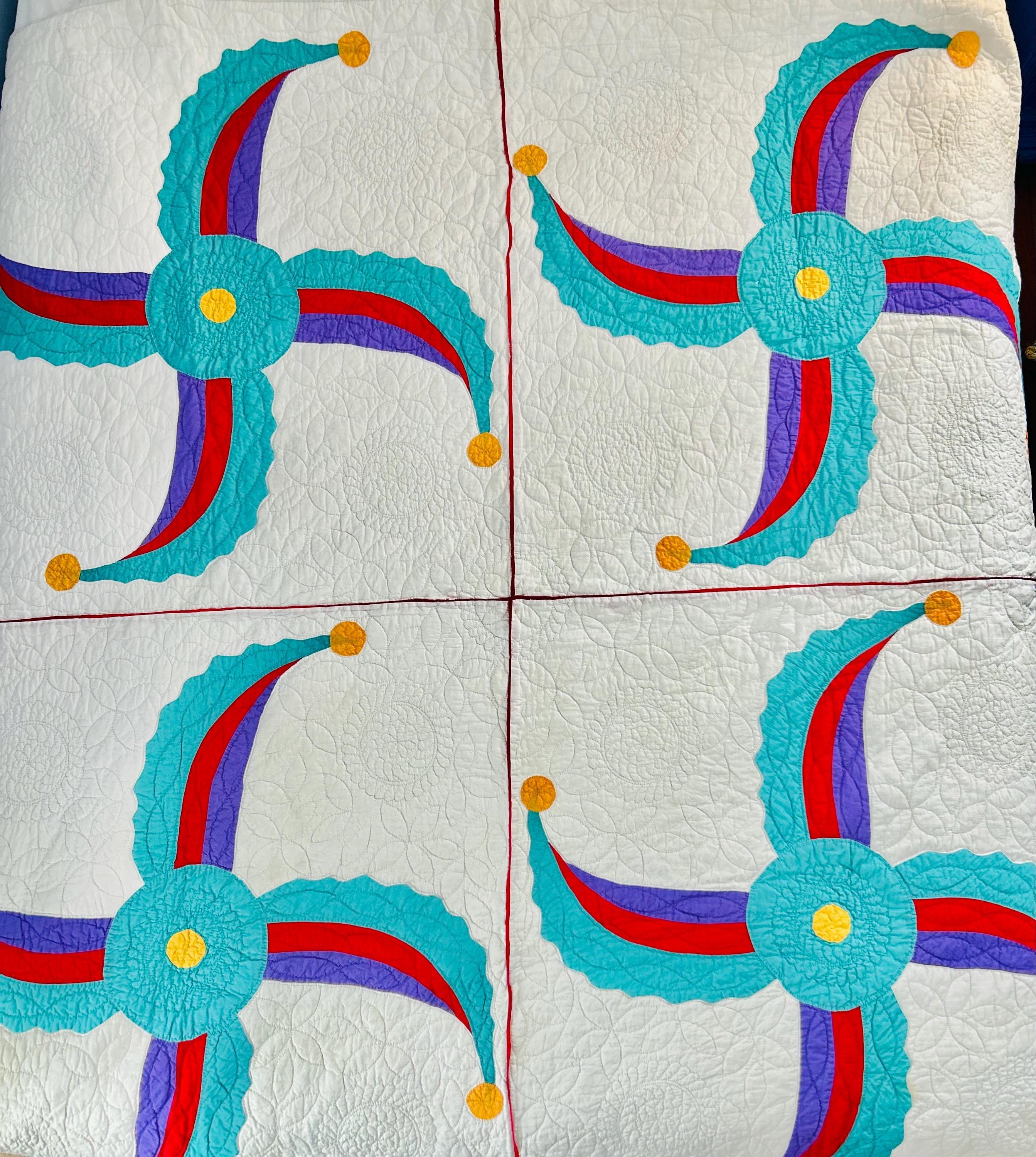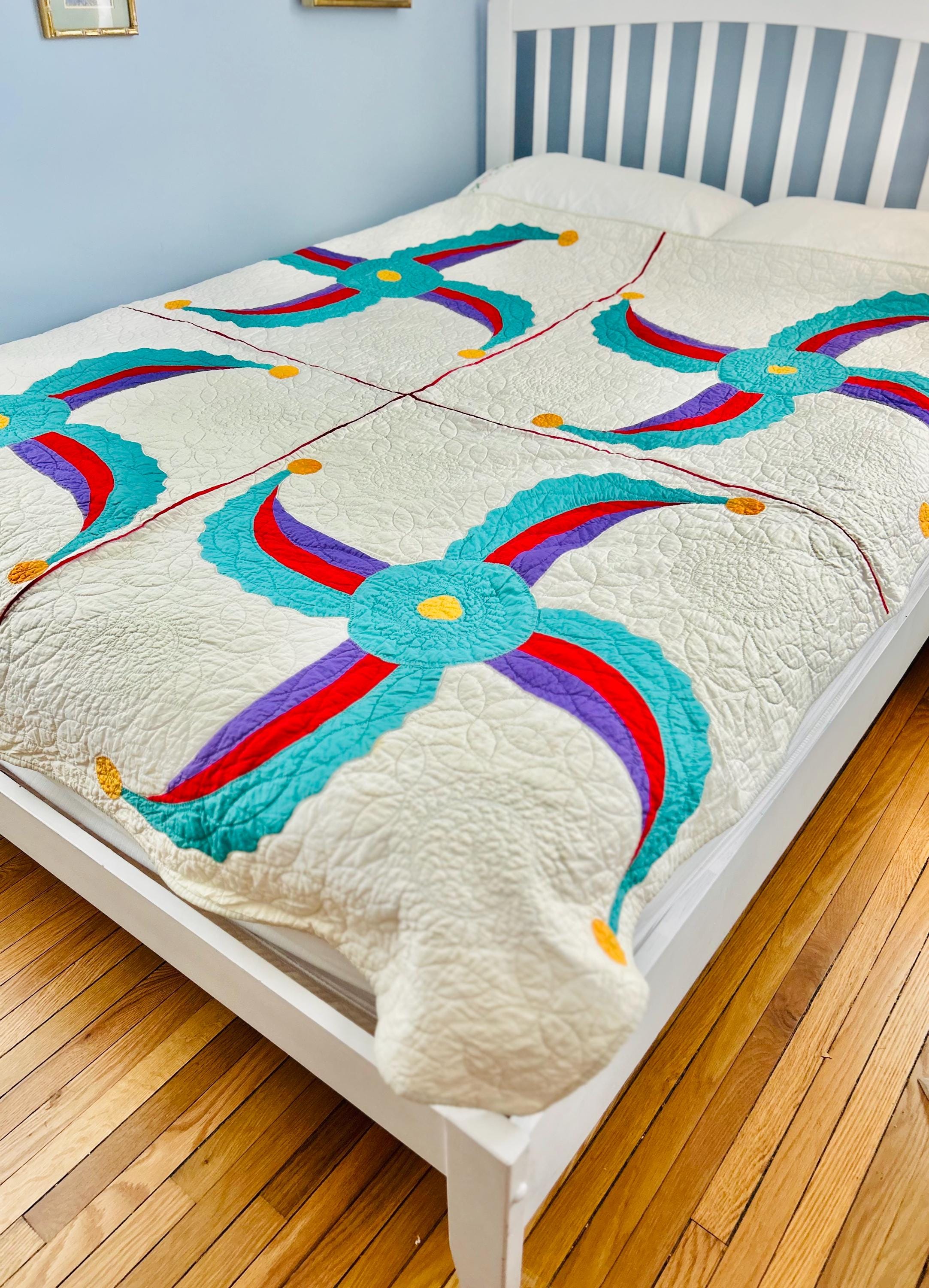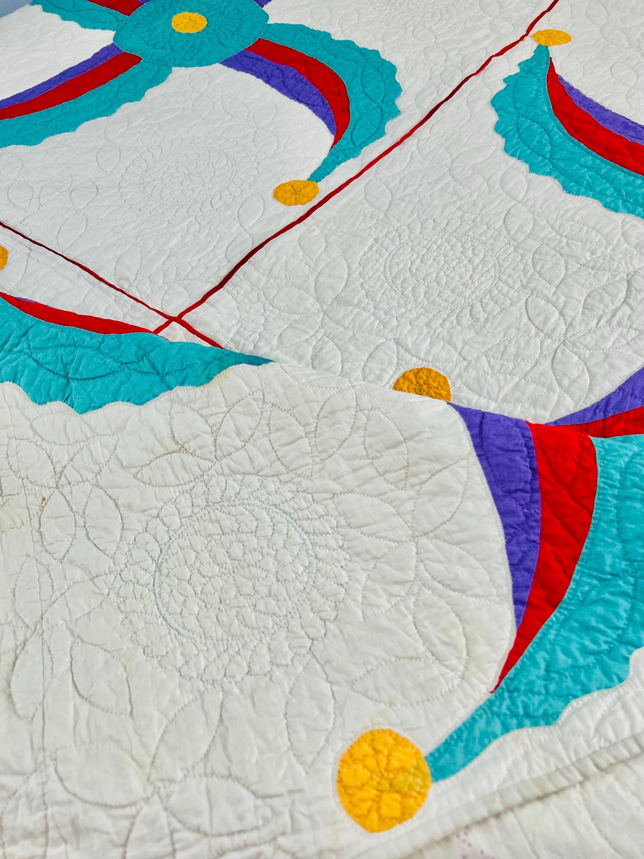 This stunning Chariot Wheel Quilt, circa 1920s, has four panels of Chariot Wheels, all hand-quilted in feathers, small feather wreaths, flower petals and geometric chains through the "wheels".
