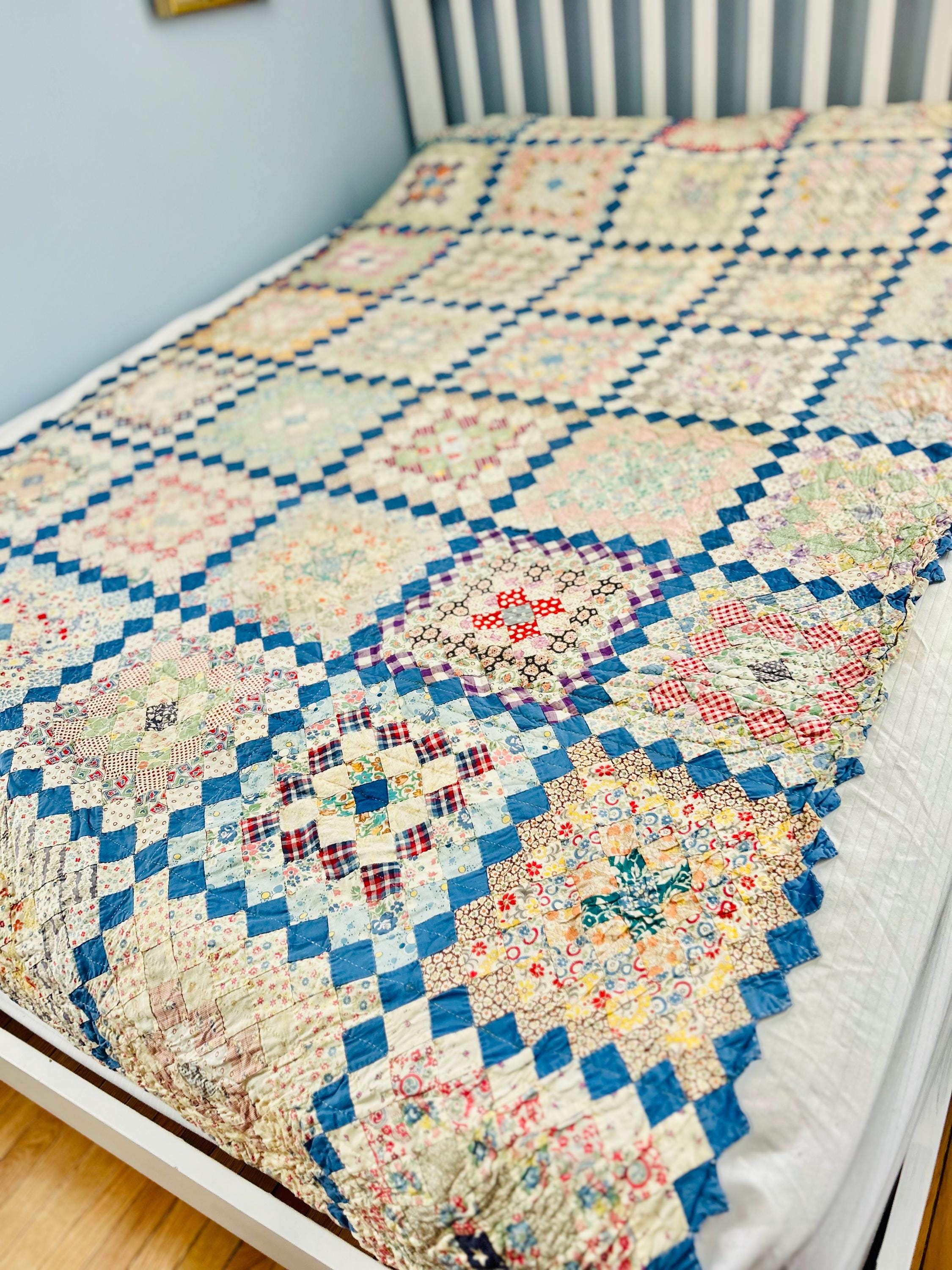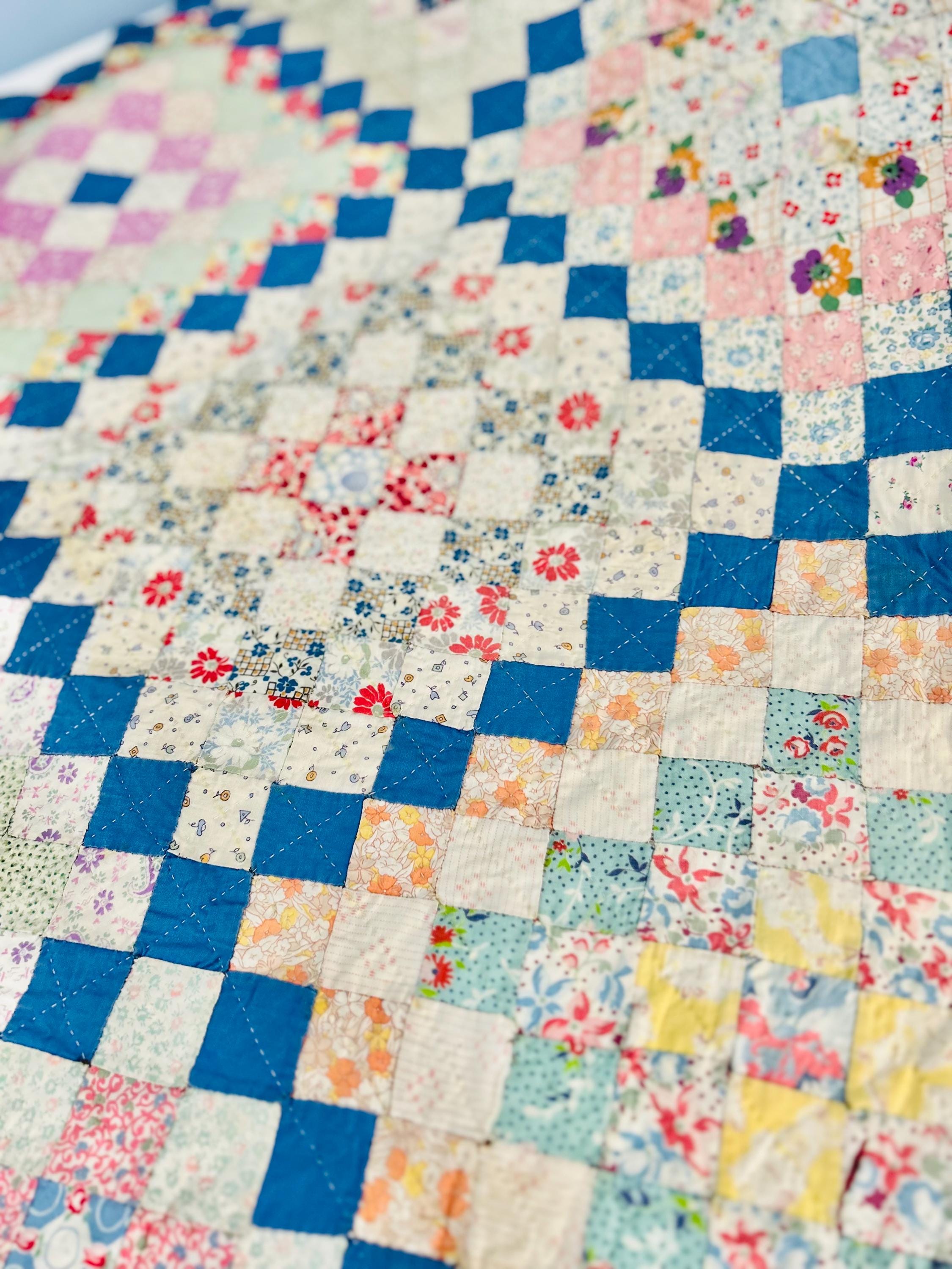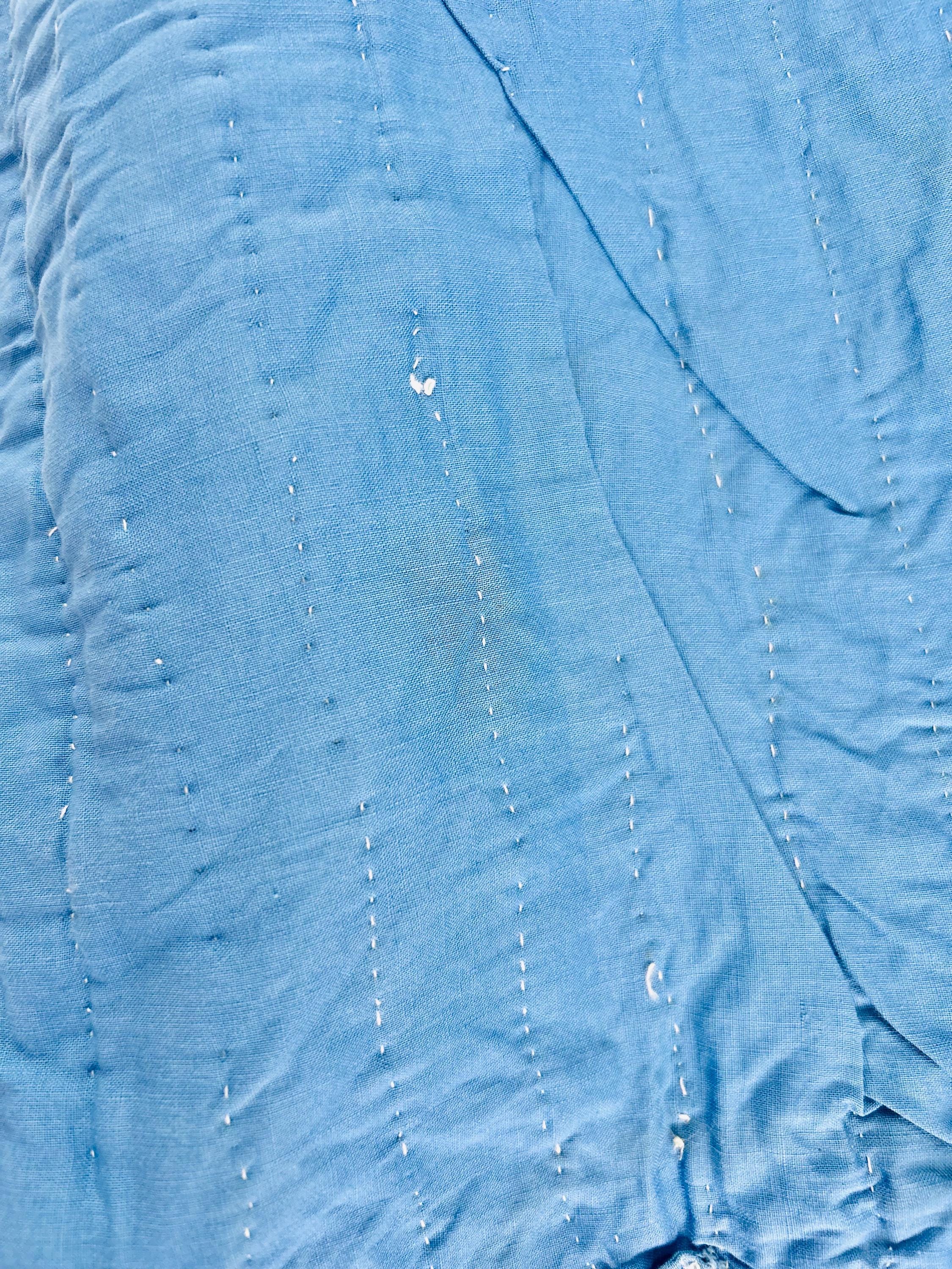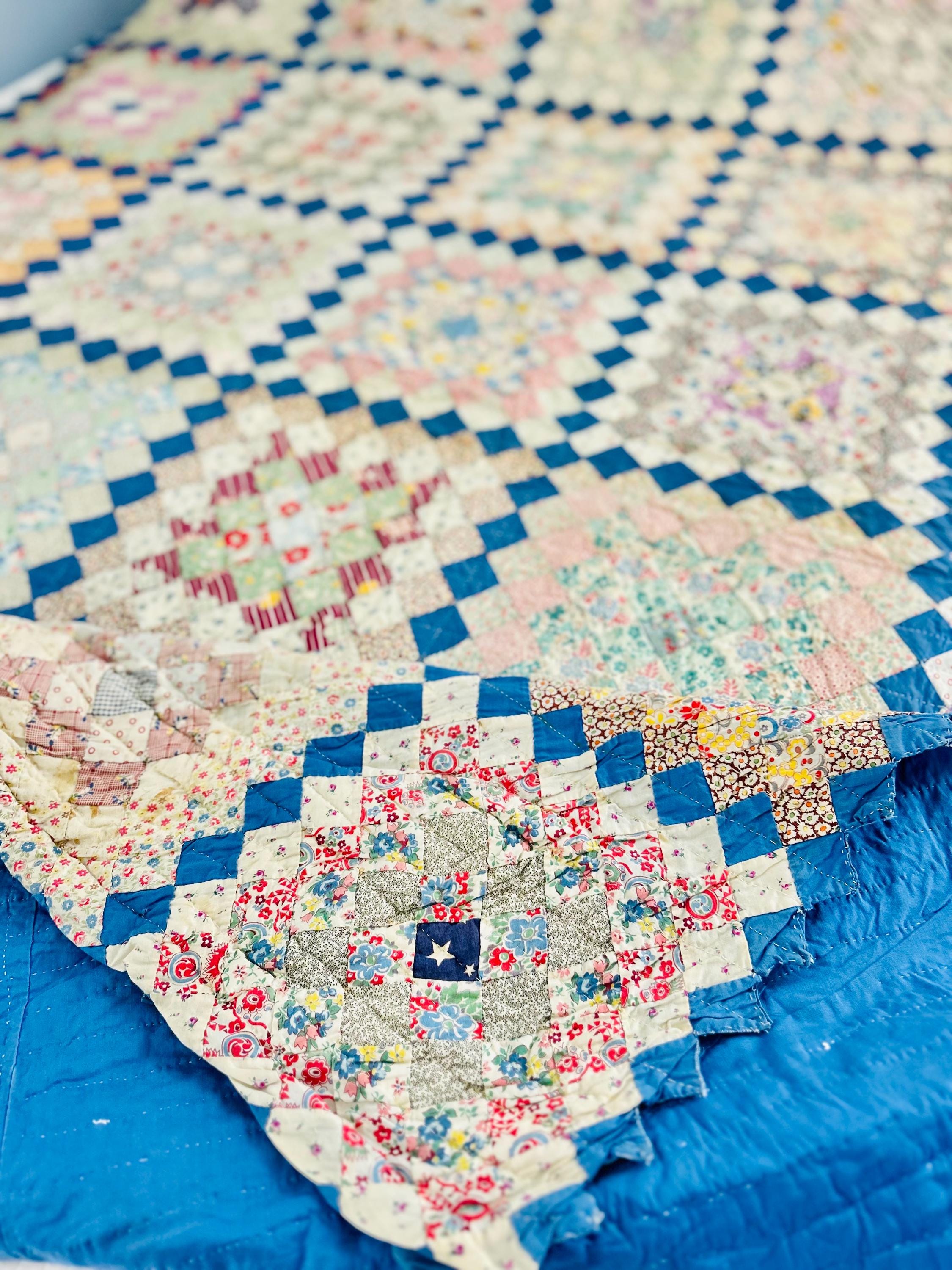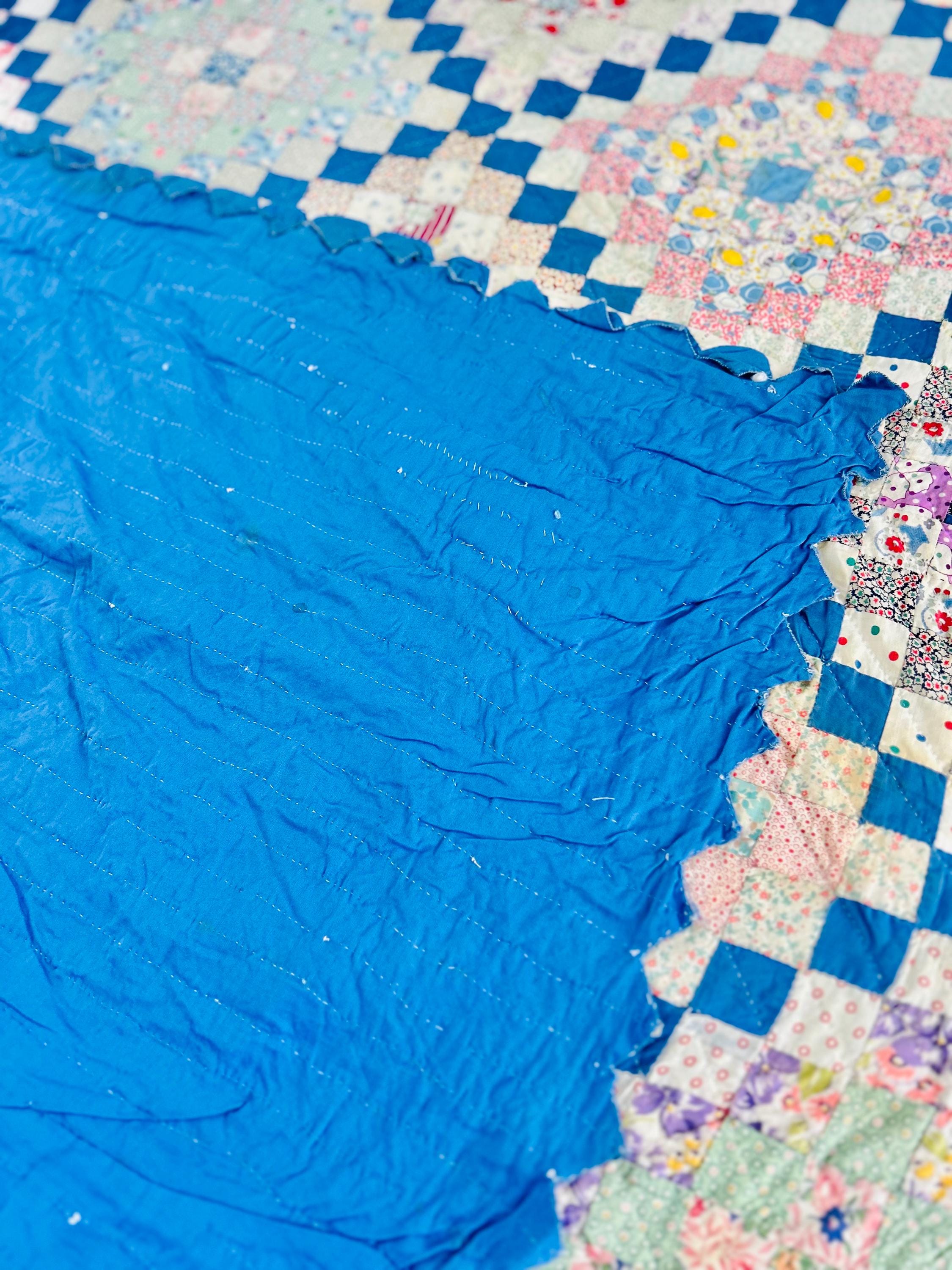 The back is blue cotton that has been hand-stitched directly to the top - there is no binding. The cotton batting is lightweight.