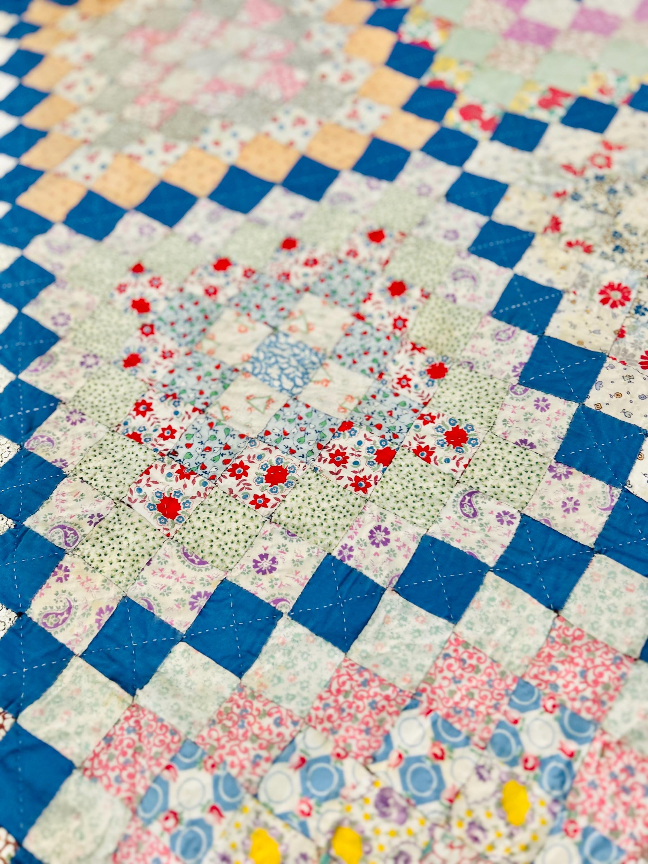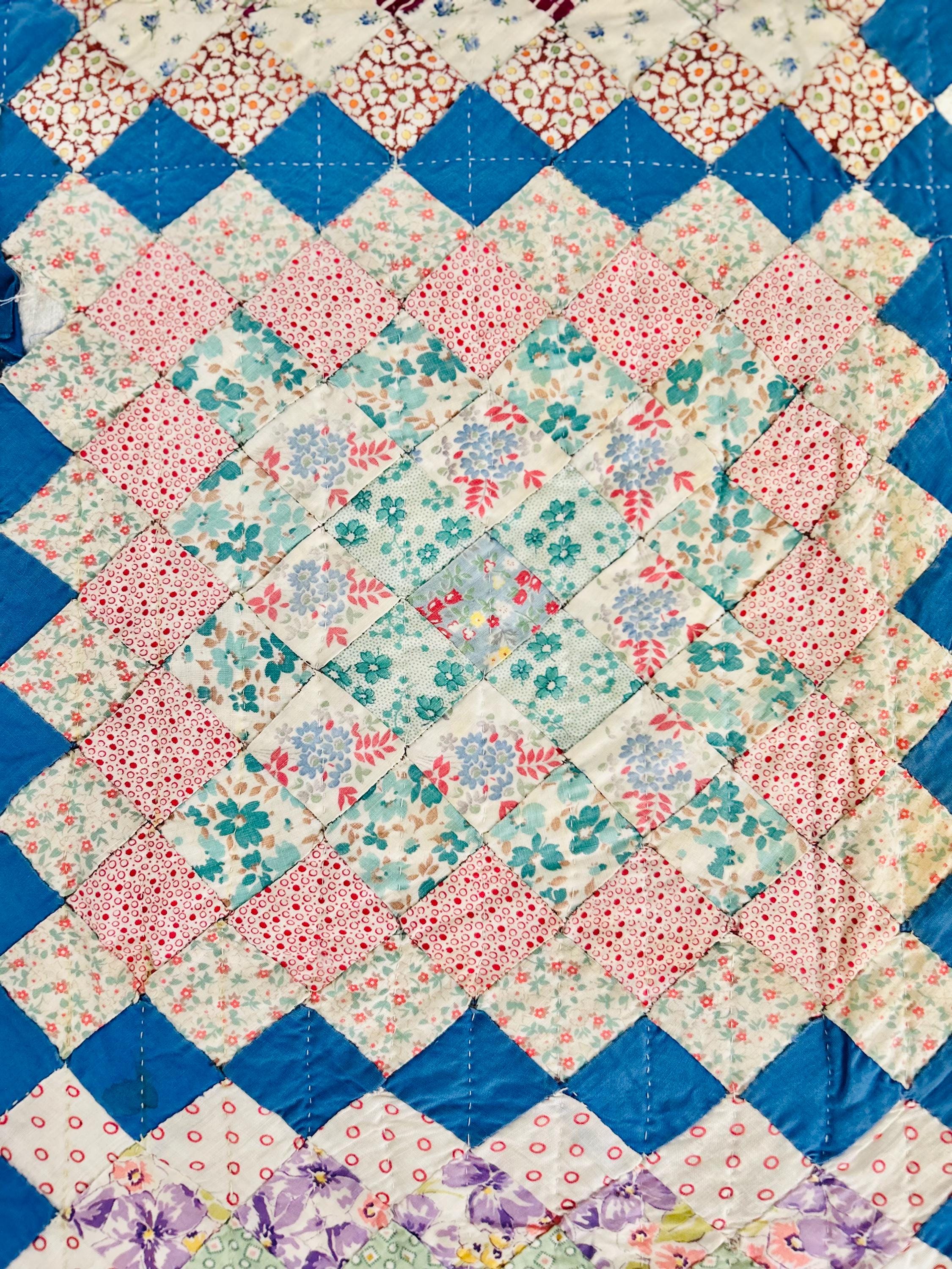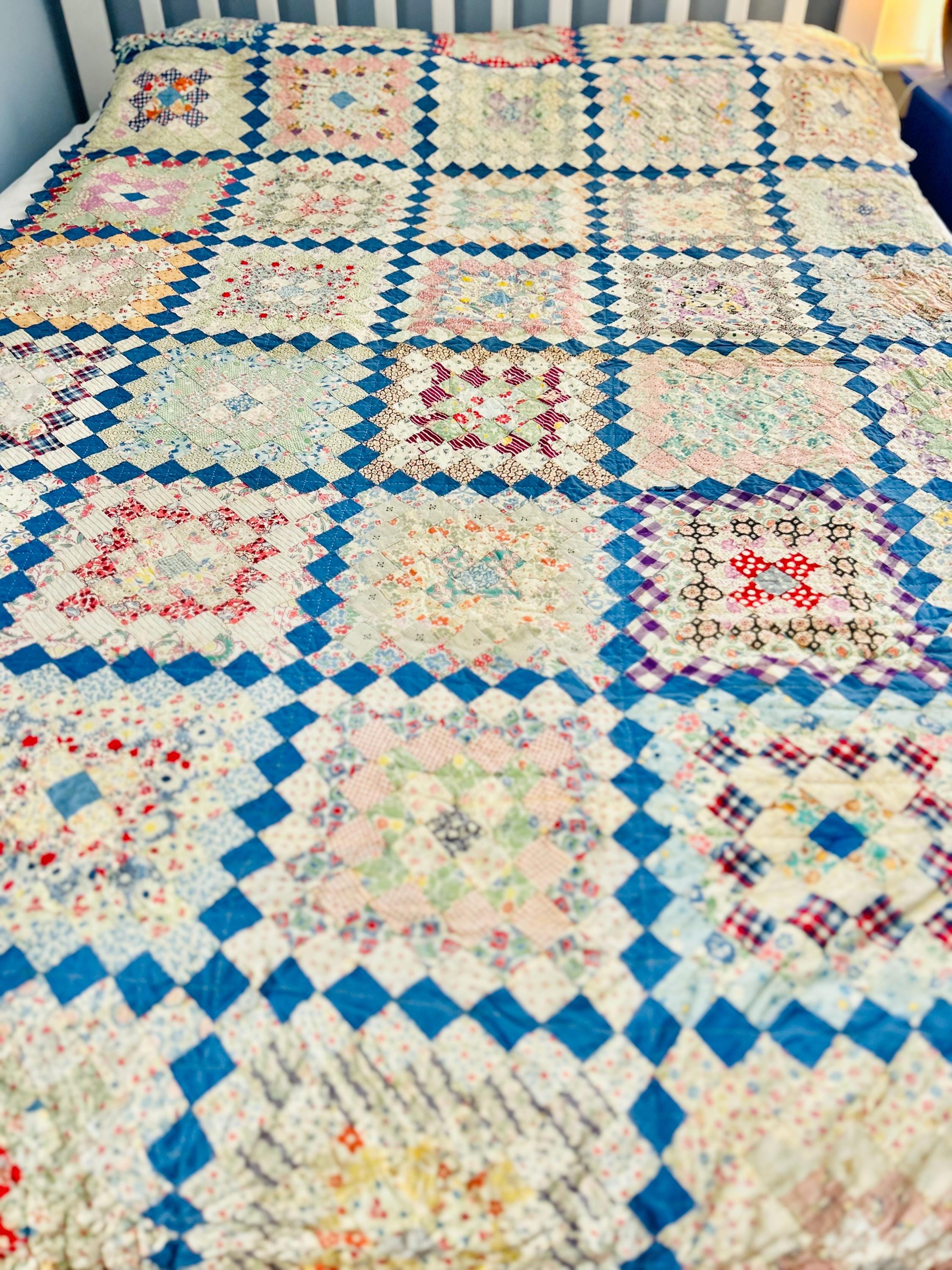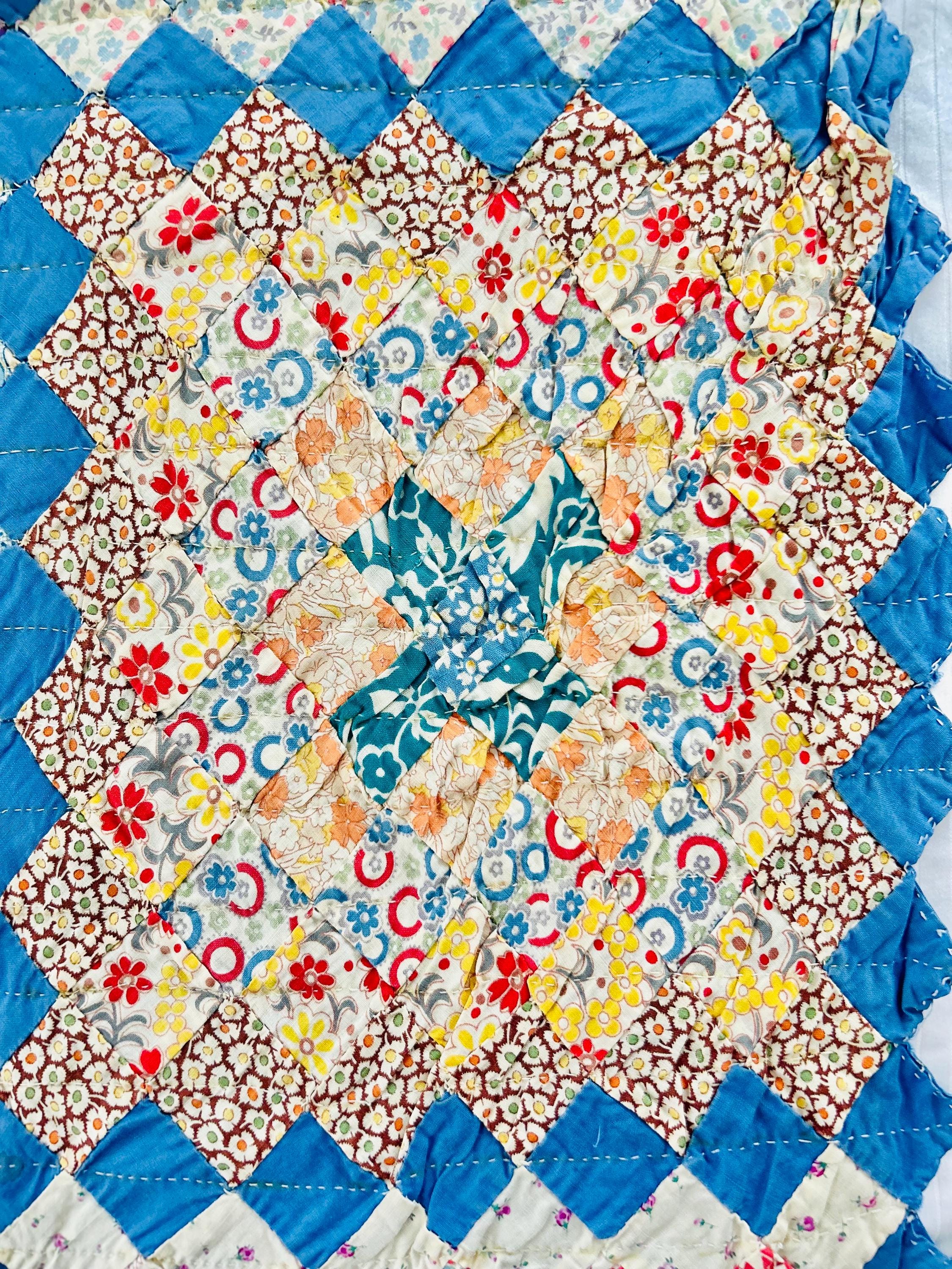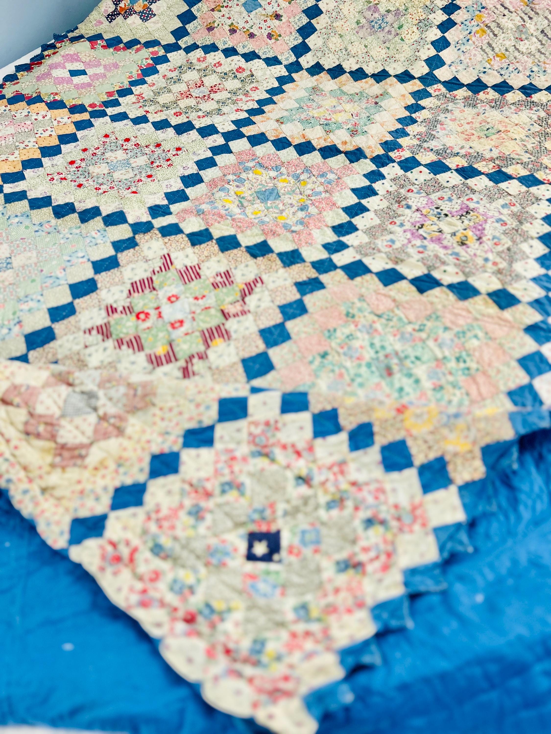 The back is blue cotton that has been hand-stitched directly to the top - there is no binding. The cotton batting is lightweight.