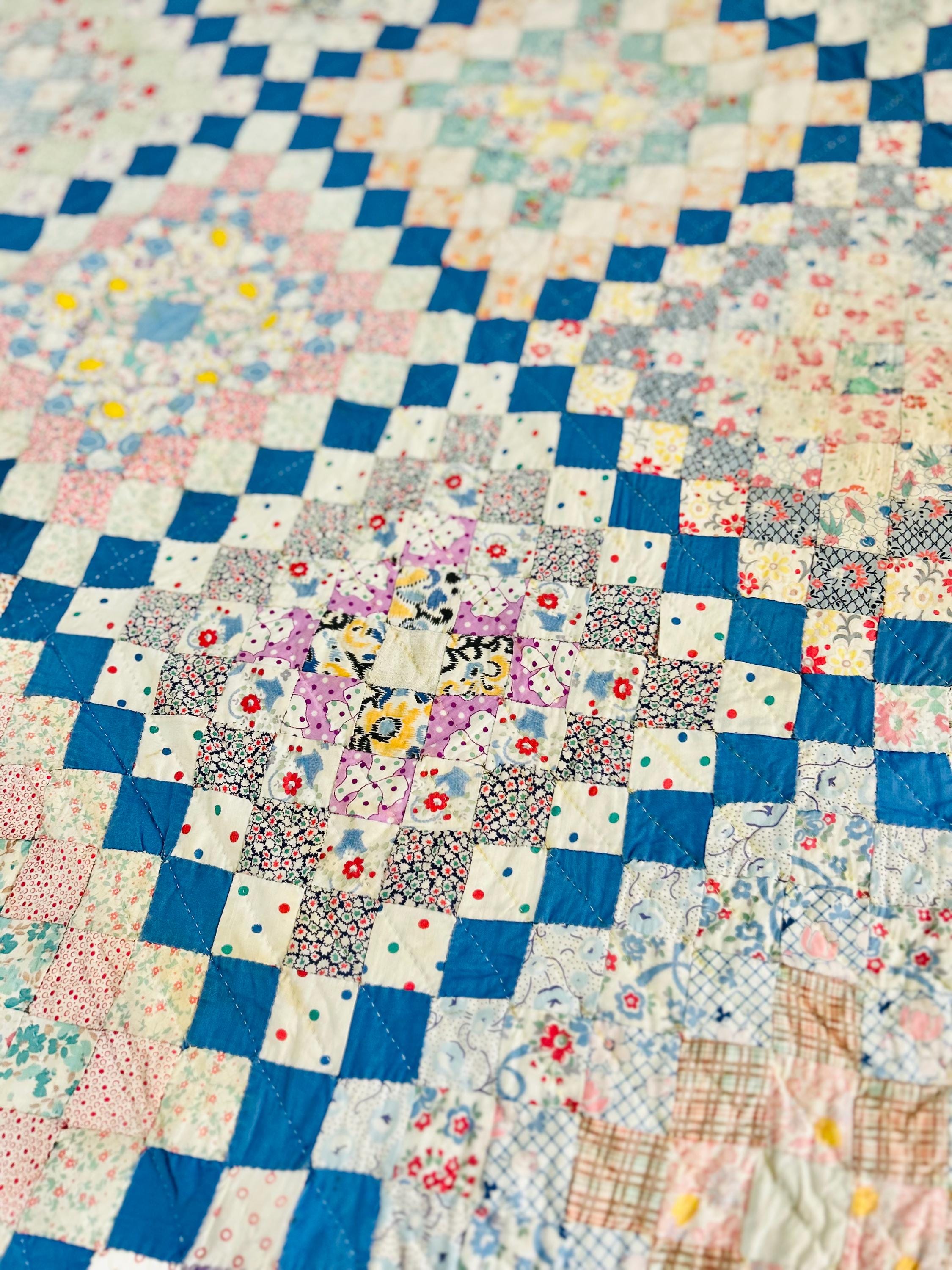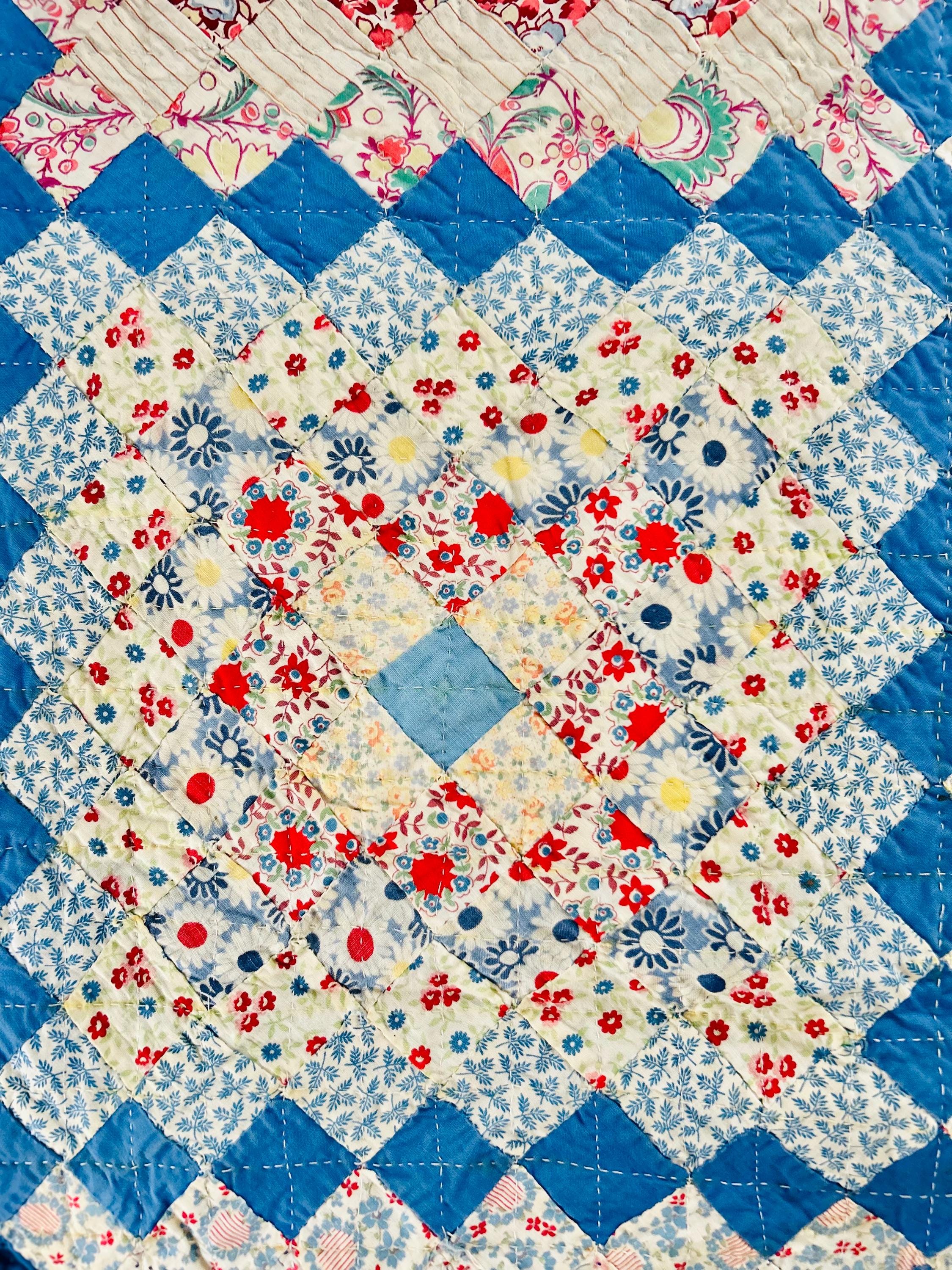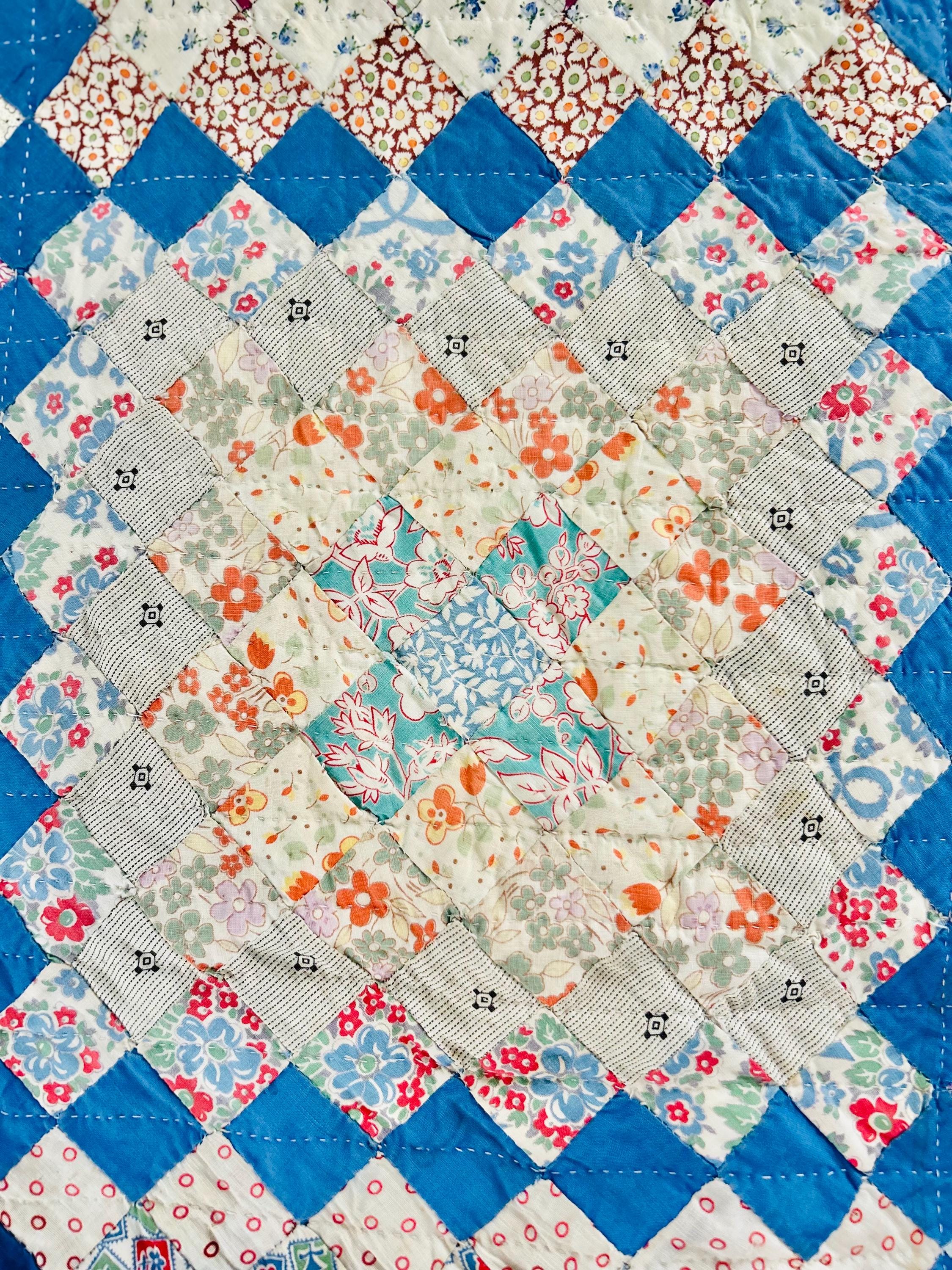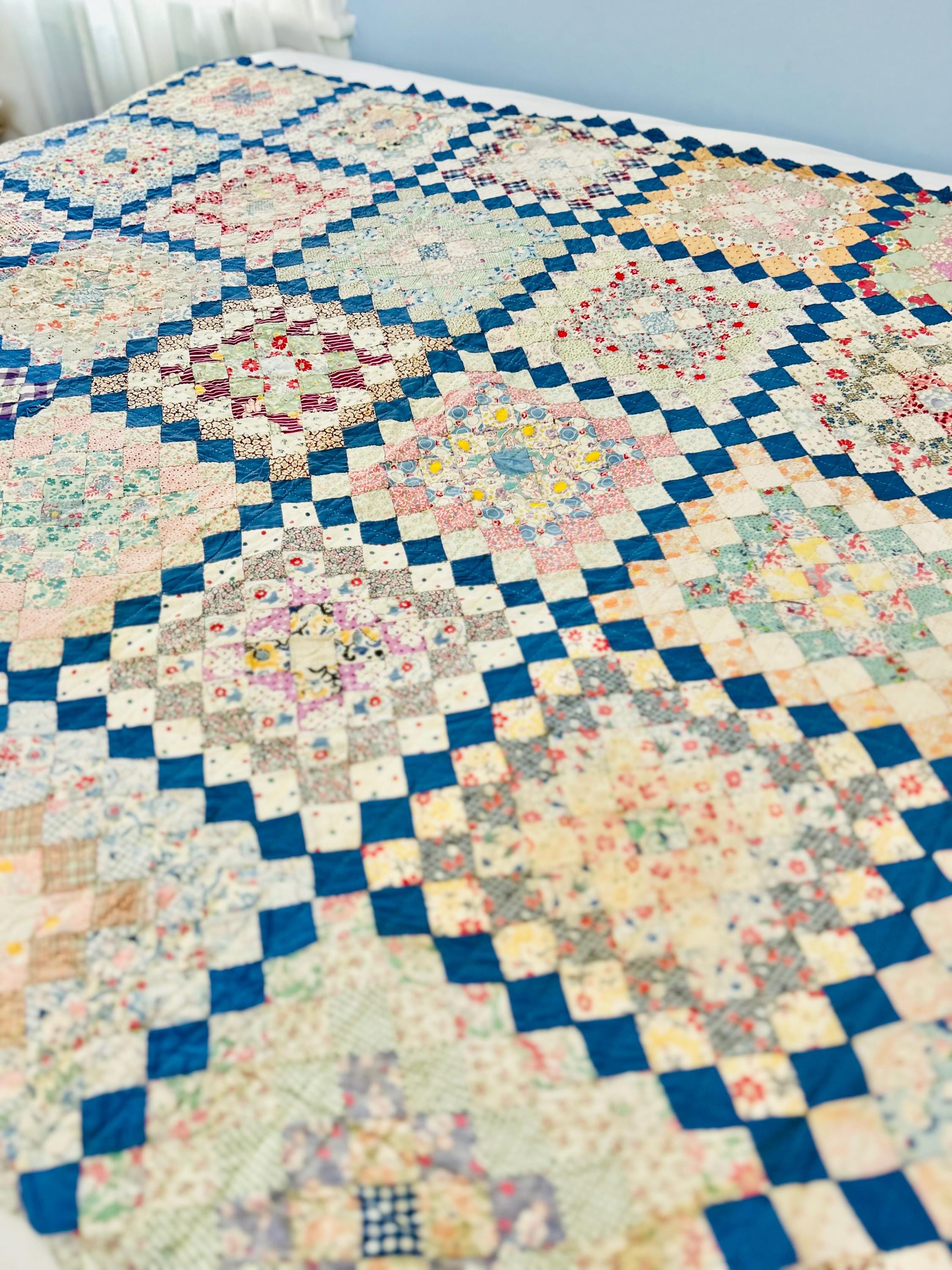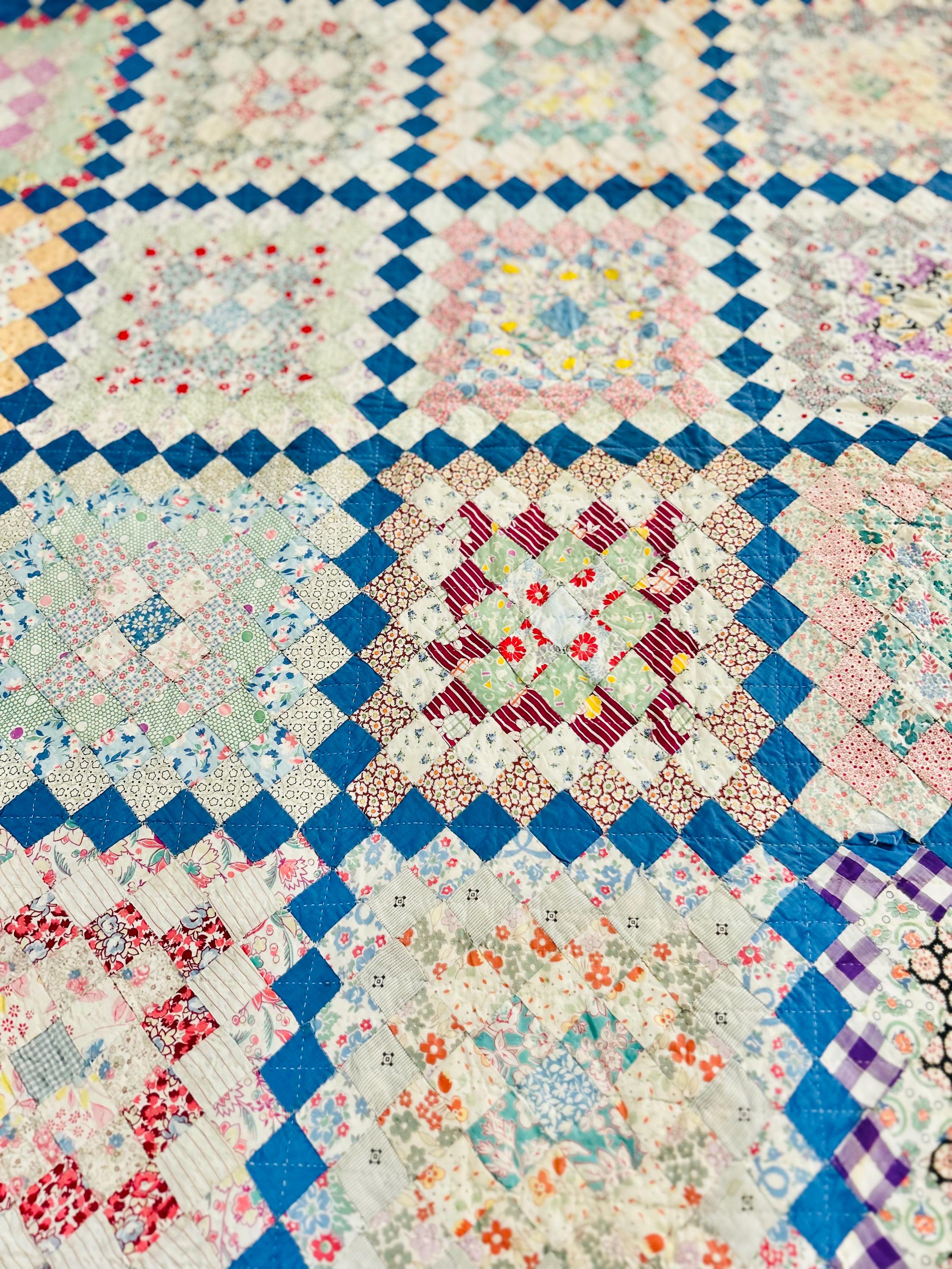 The back is blue cotton that has been hand-stitched directly to the top - there is no binding. The cotton batting is lightweight.