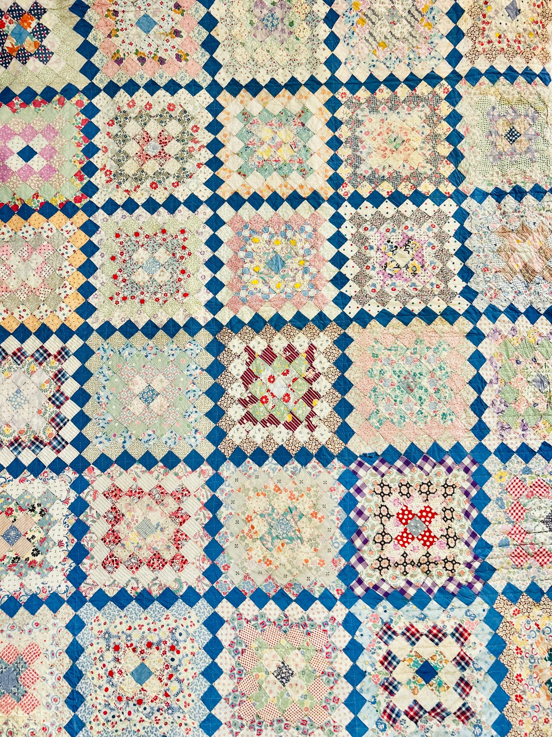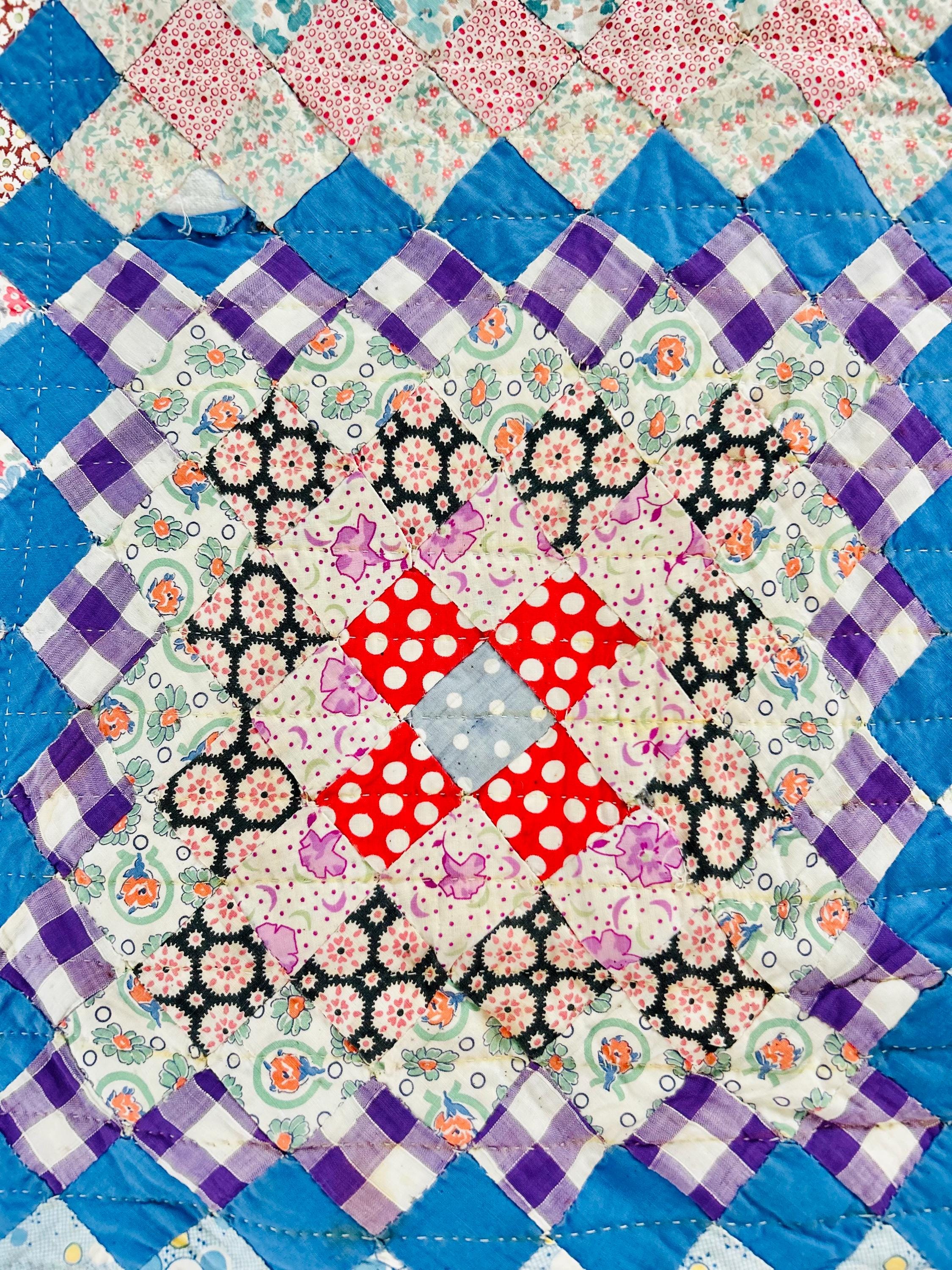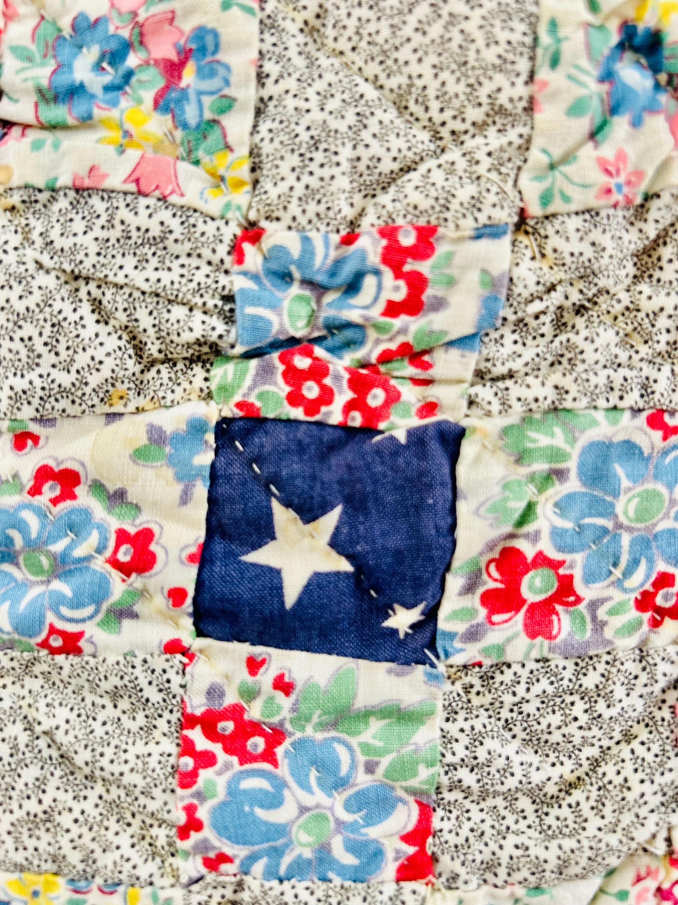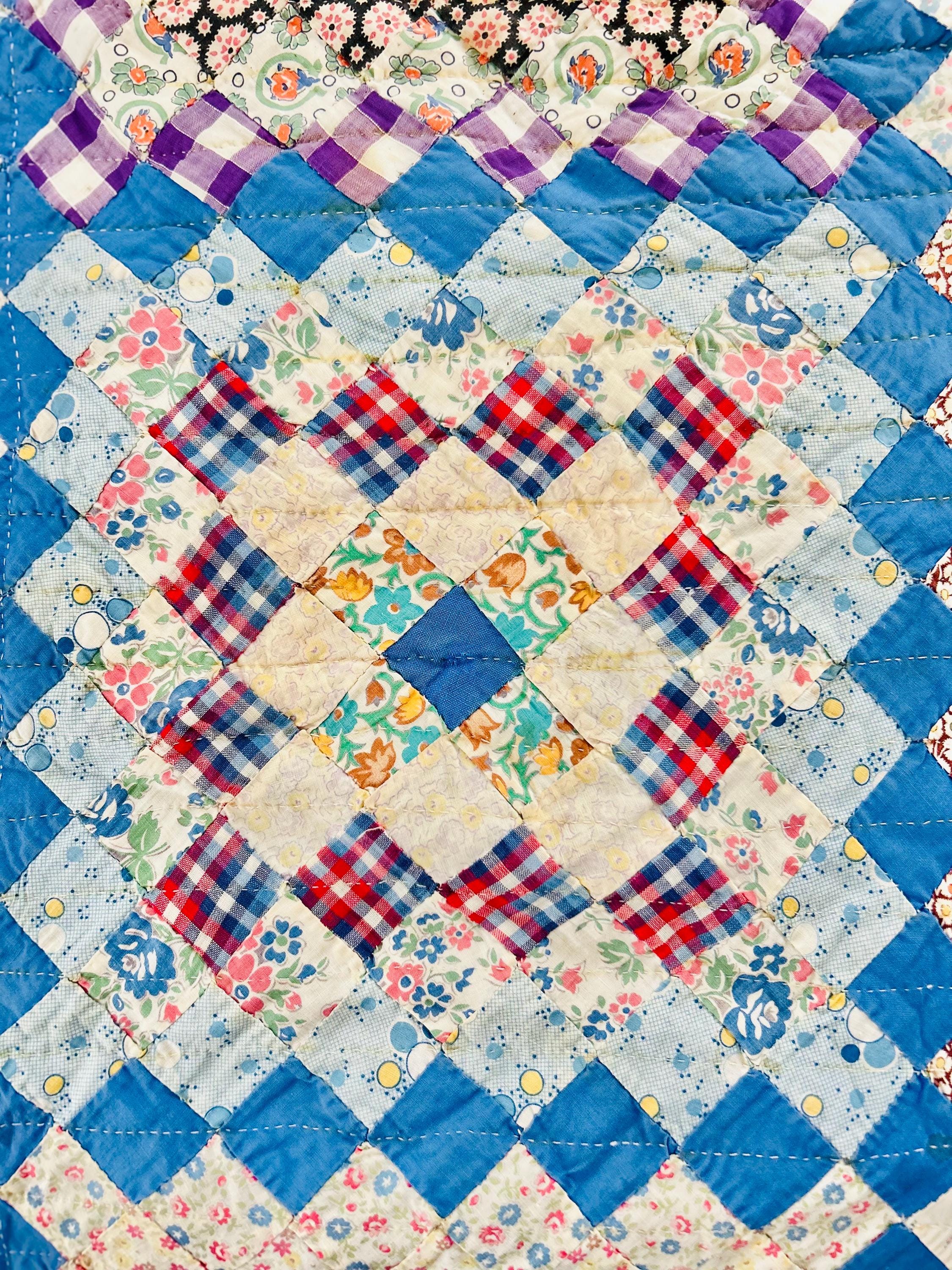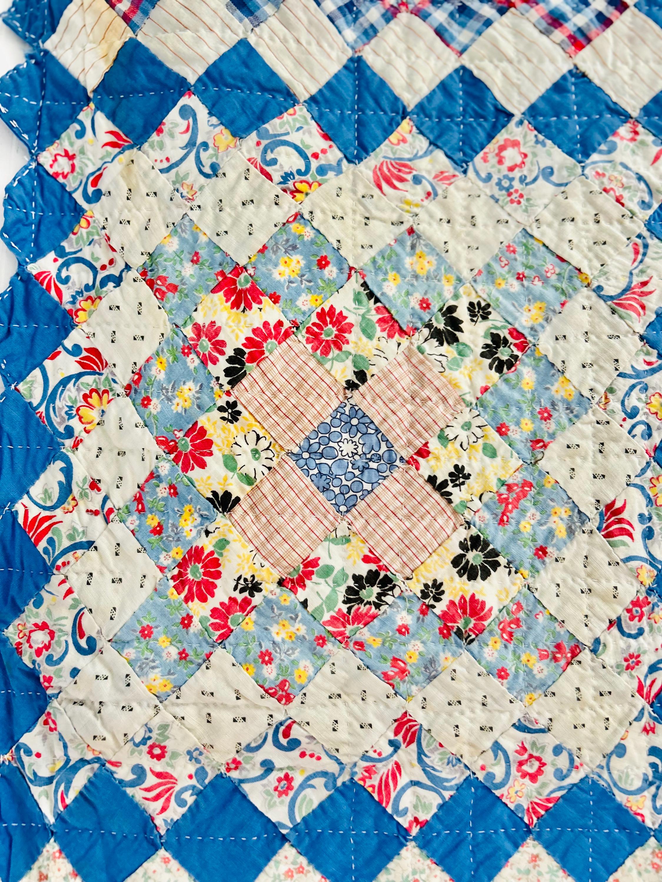 The back is blue cotton that has been hand-stitched directly to the top - there is no binding. The cotton batting is lightweight.