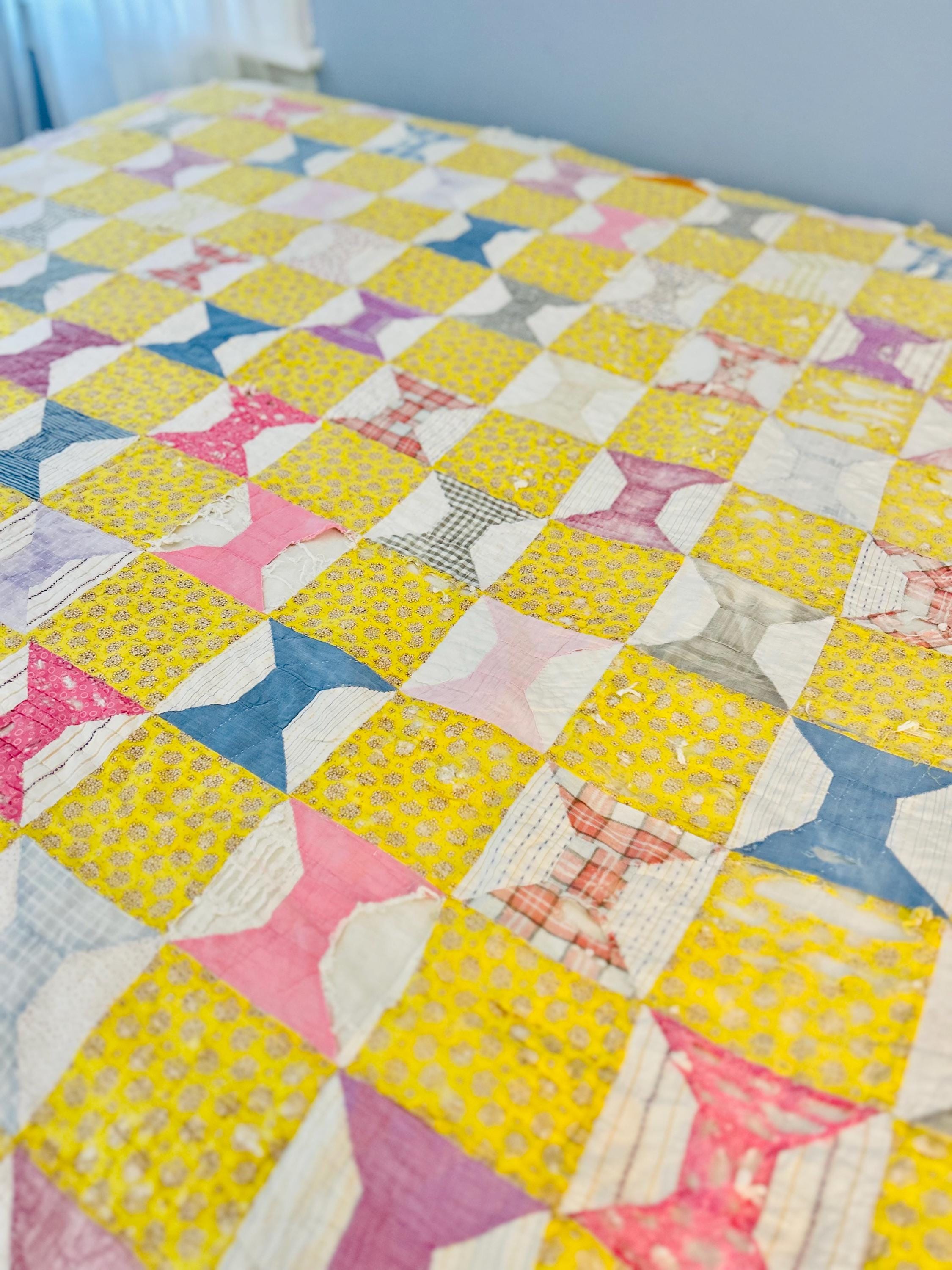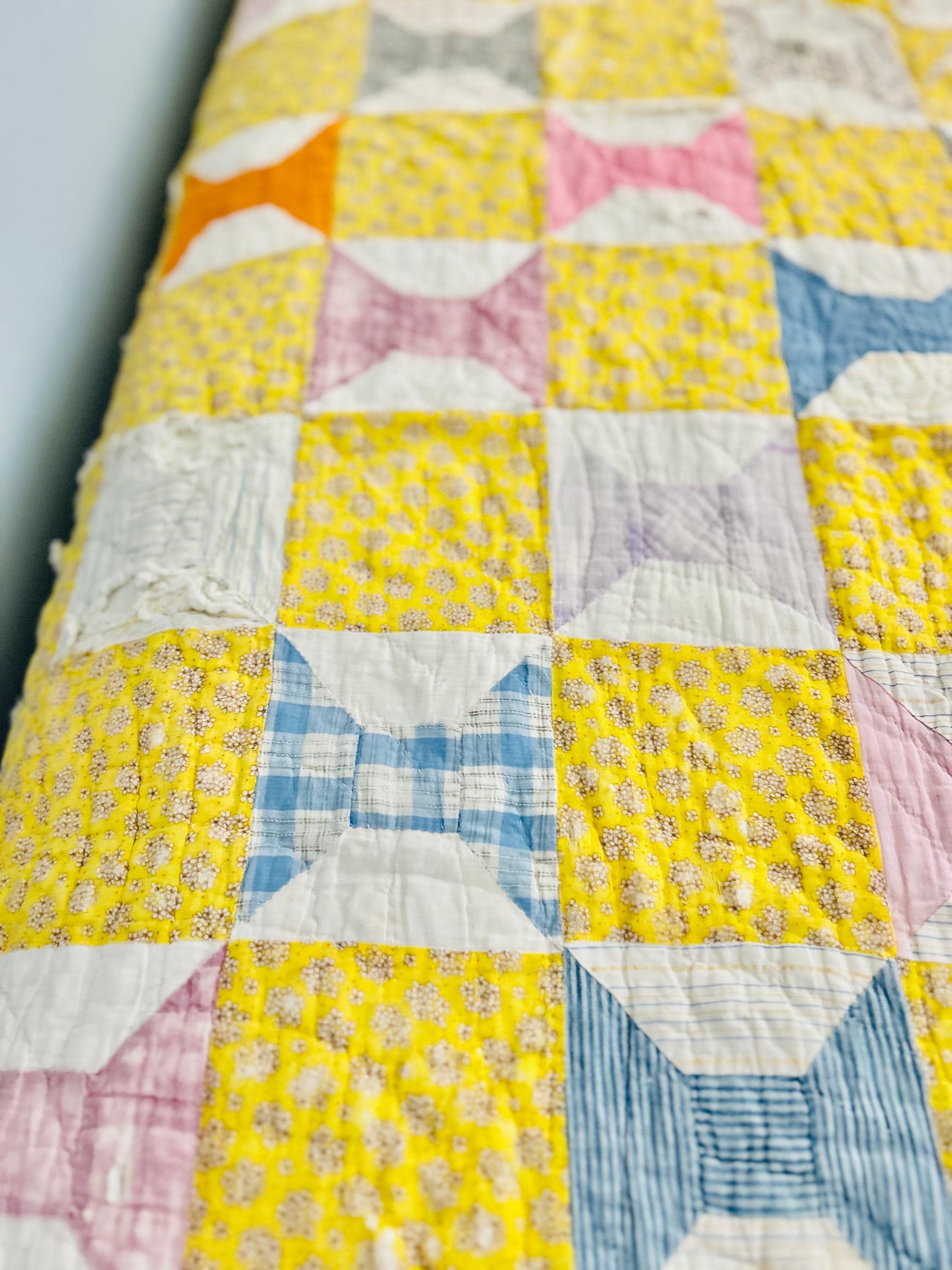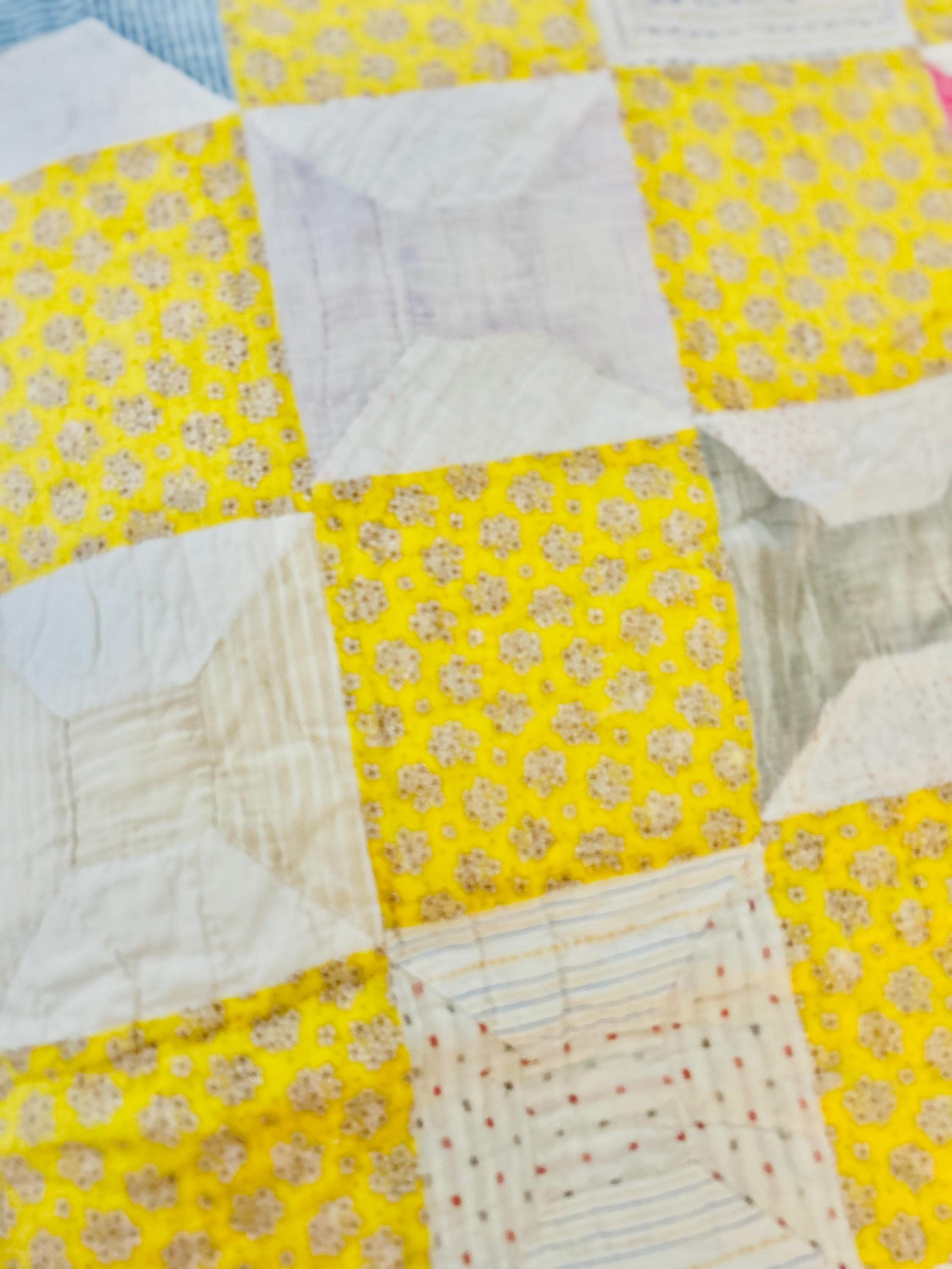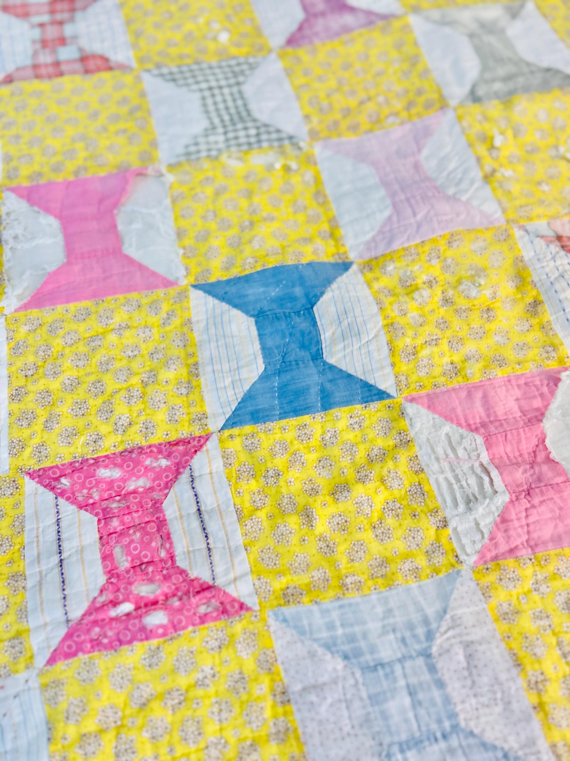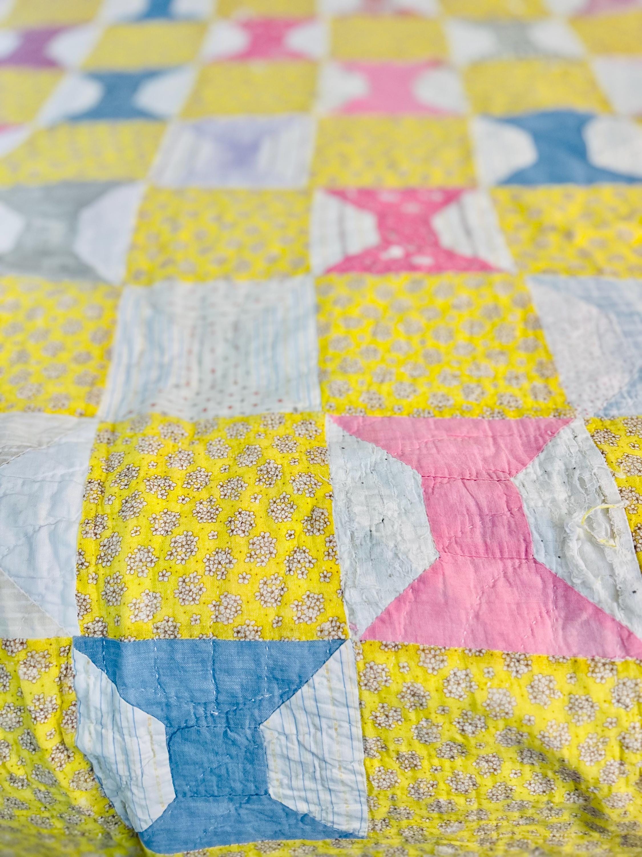 This Spool Quilt, circa 1930s, is still bright and lovely with its mix of yellow, blue, pink and other pastel calicos. The hand-quilting is in a repeating shell pattern which has been finely stitched.