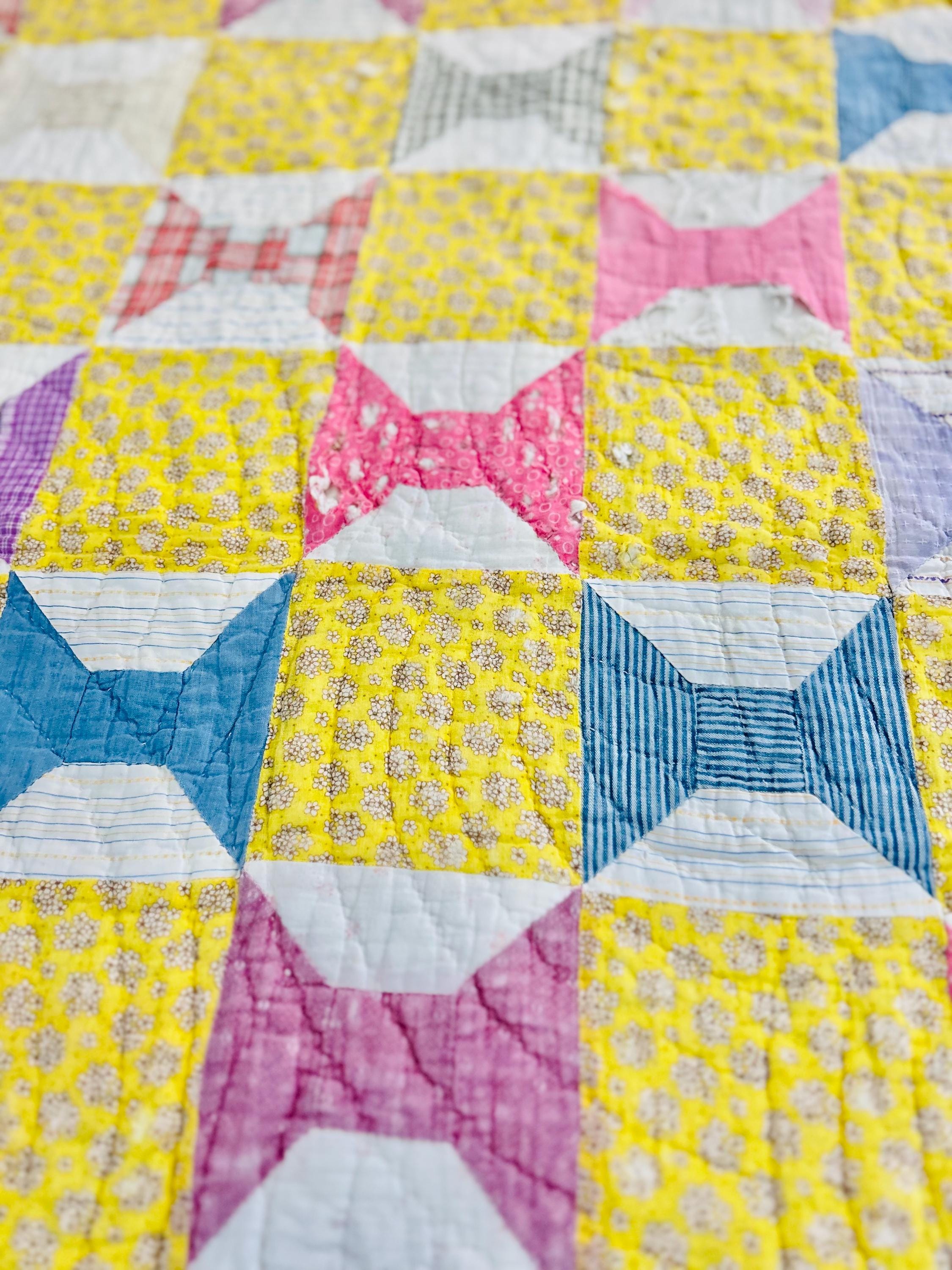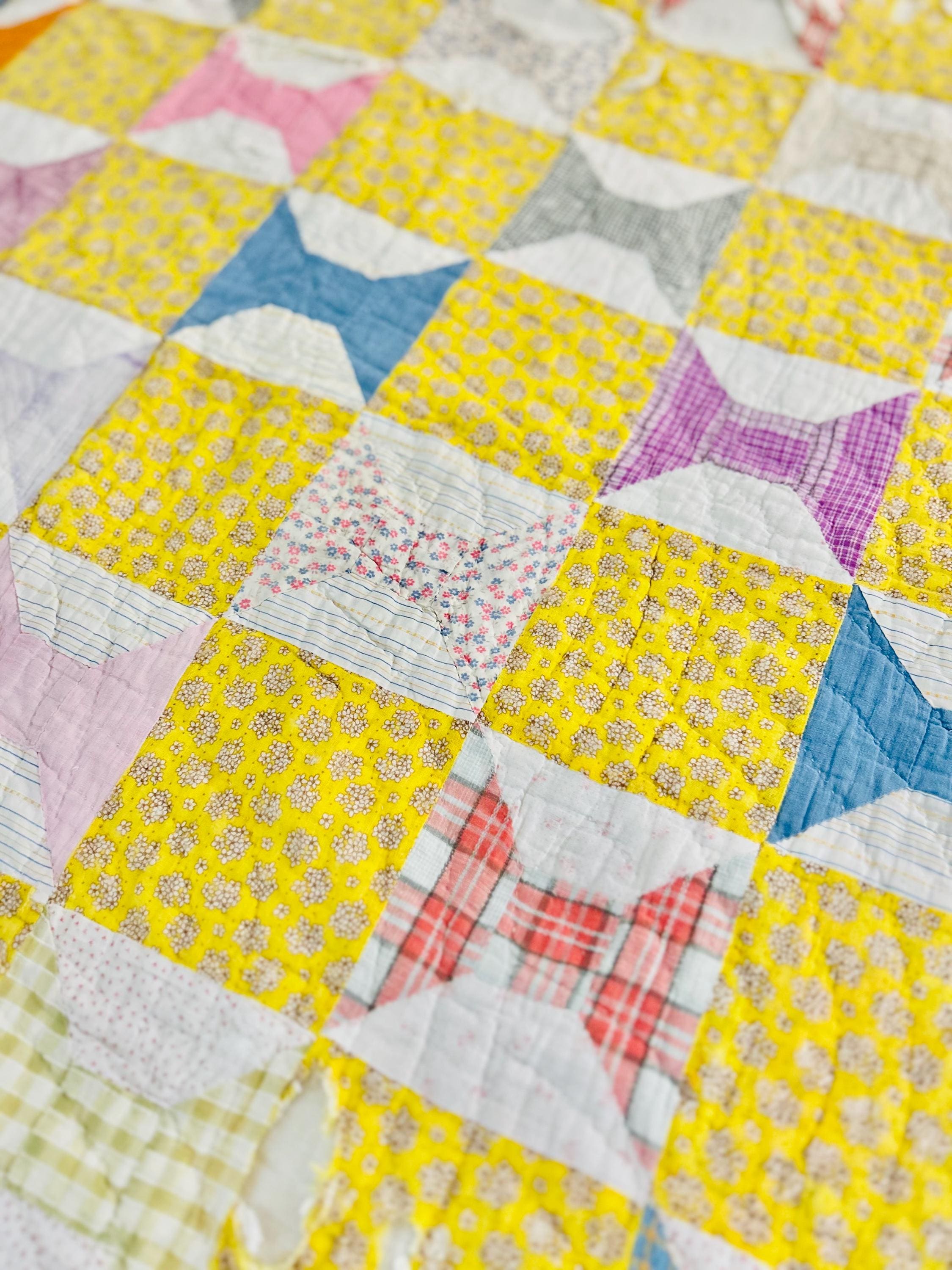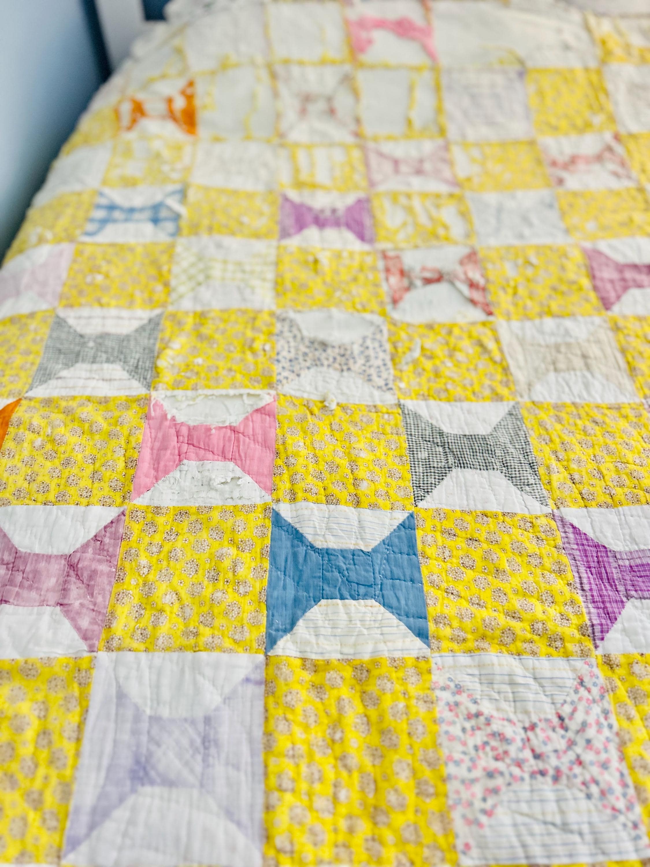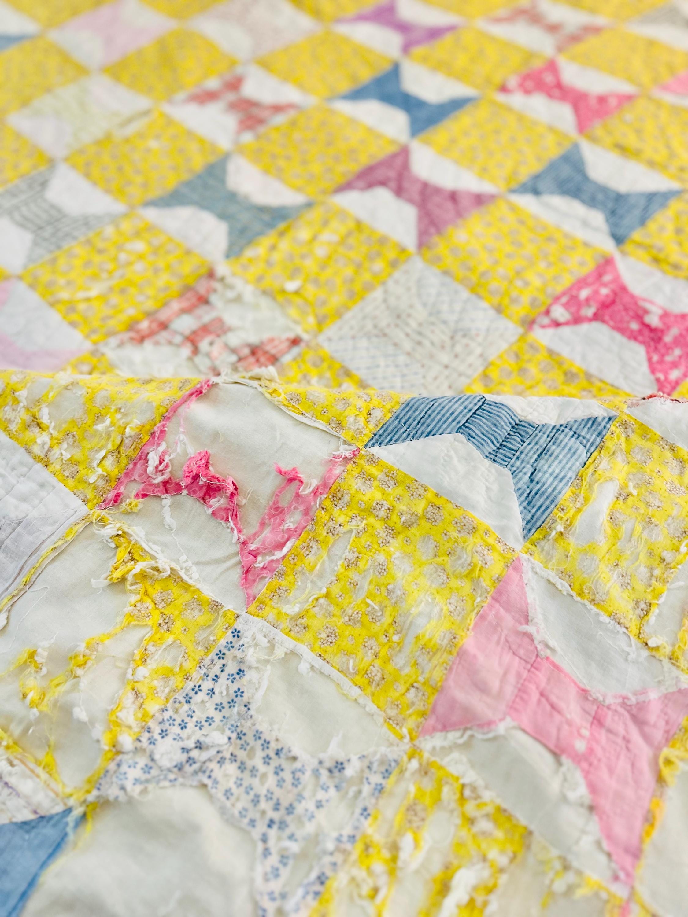 This Spool Quilt, circa 1930s, is still bright and lovely with its mix of yellow, blue, pink and other pastel calicos. The hand-quilting is in a repeating shell pattern which has been finely stitched.