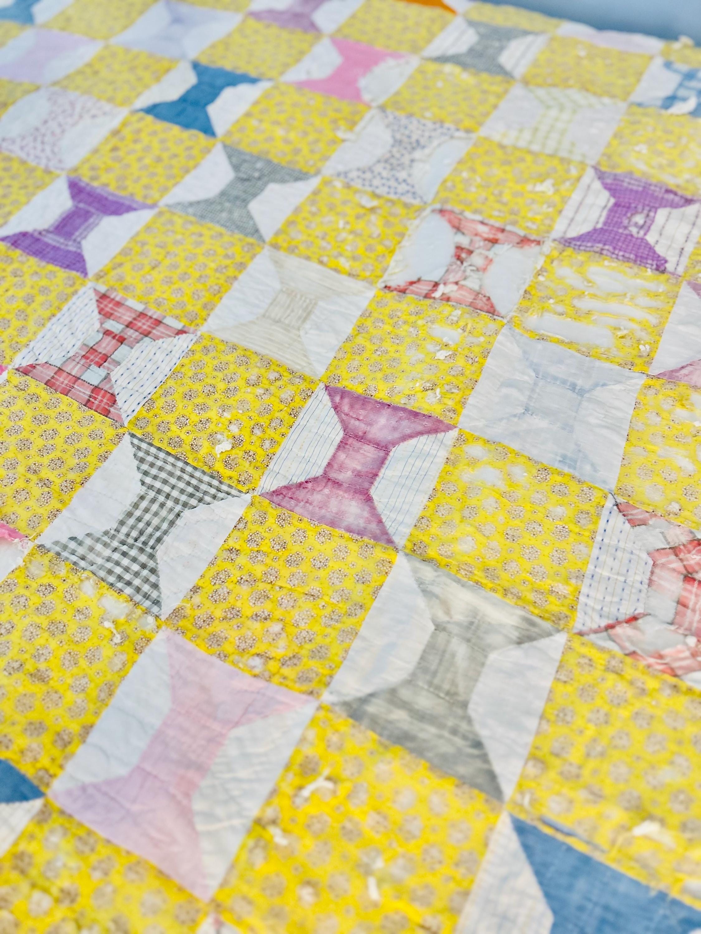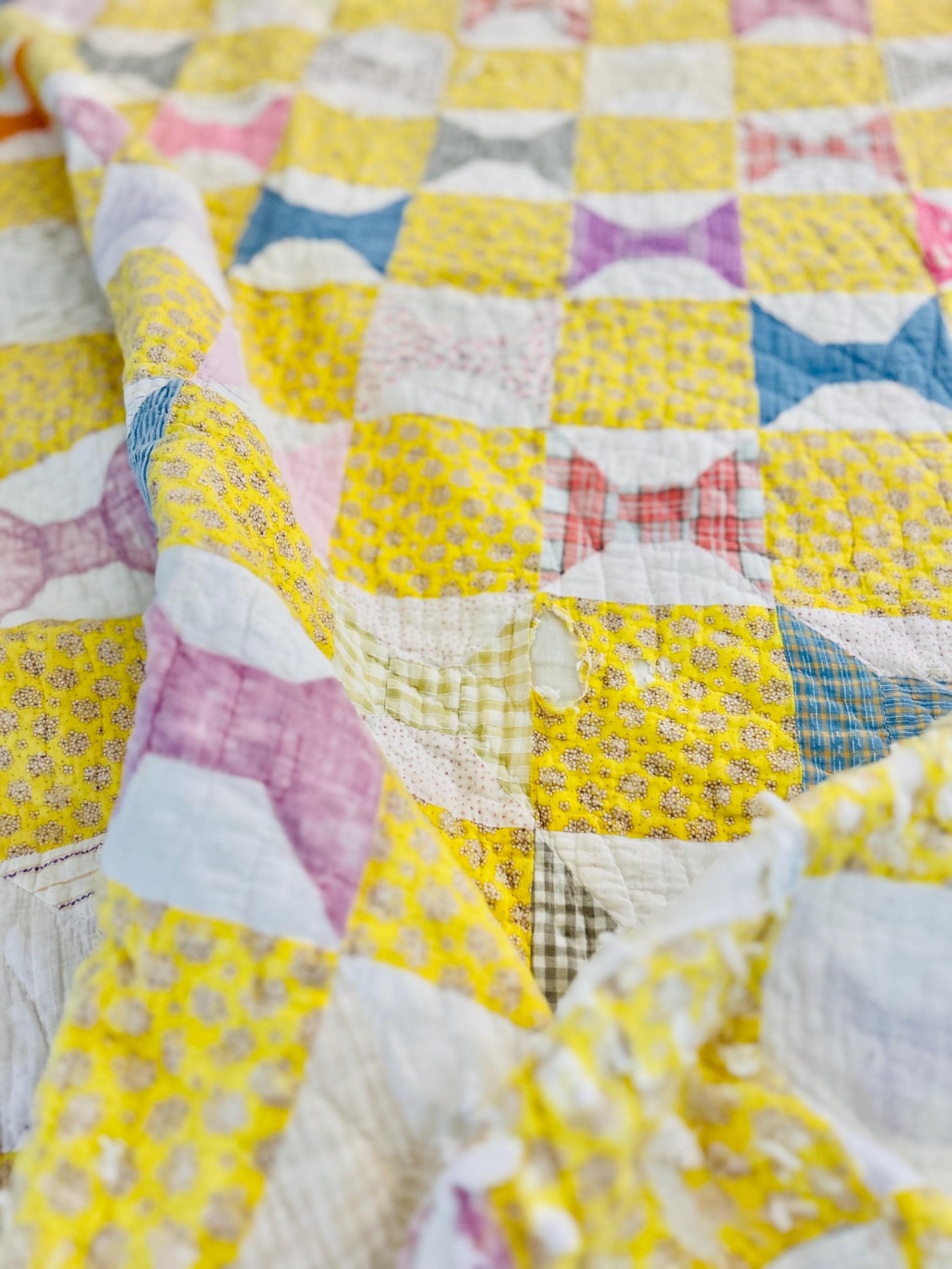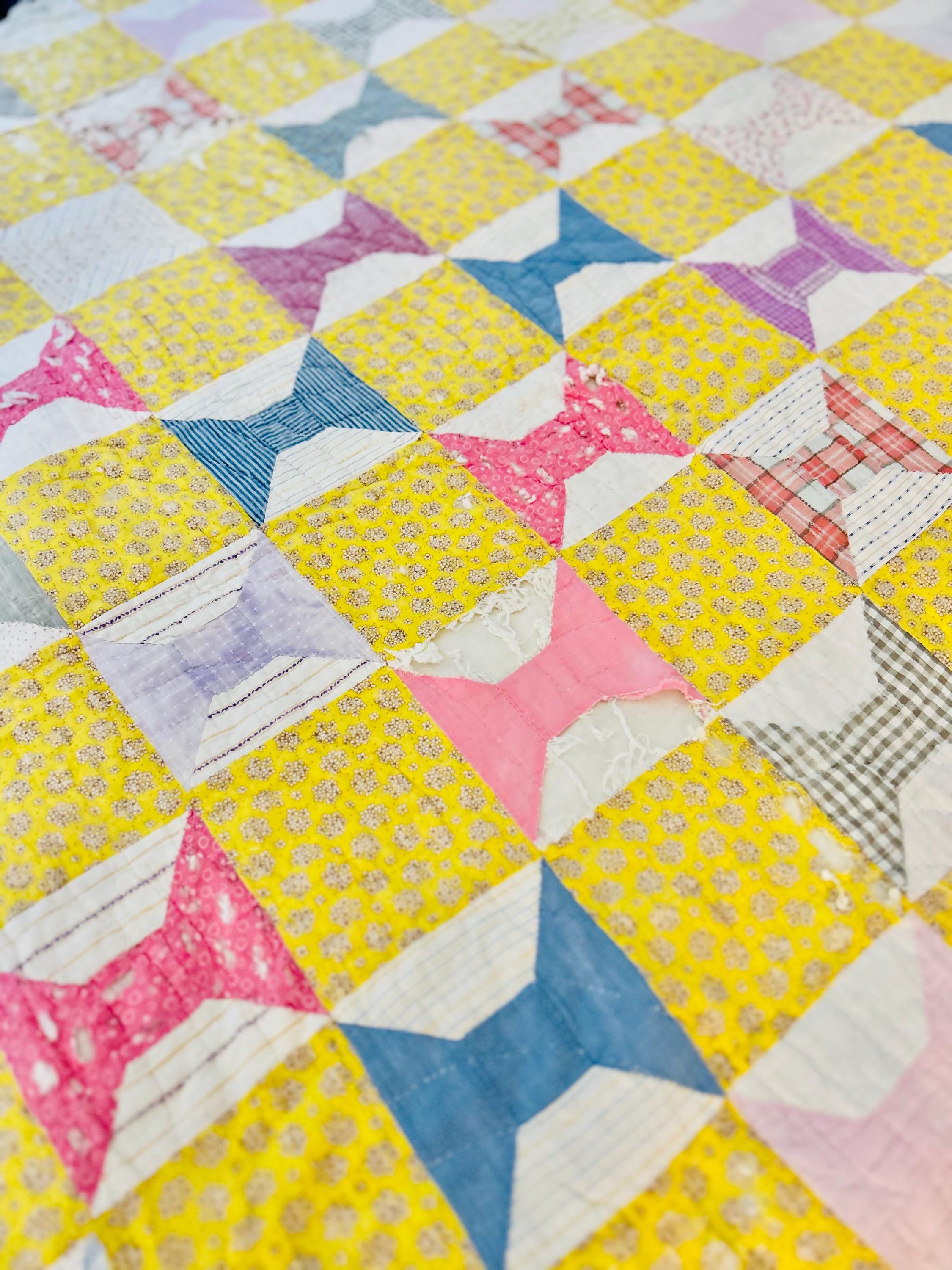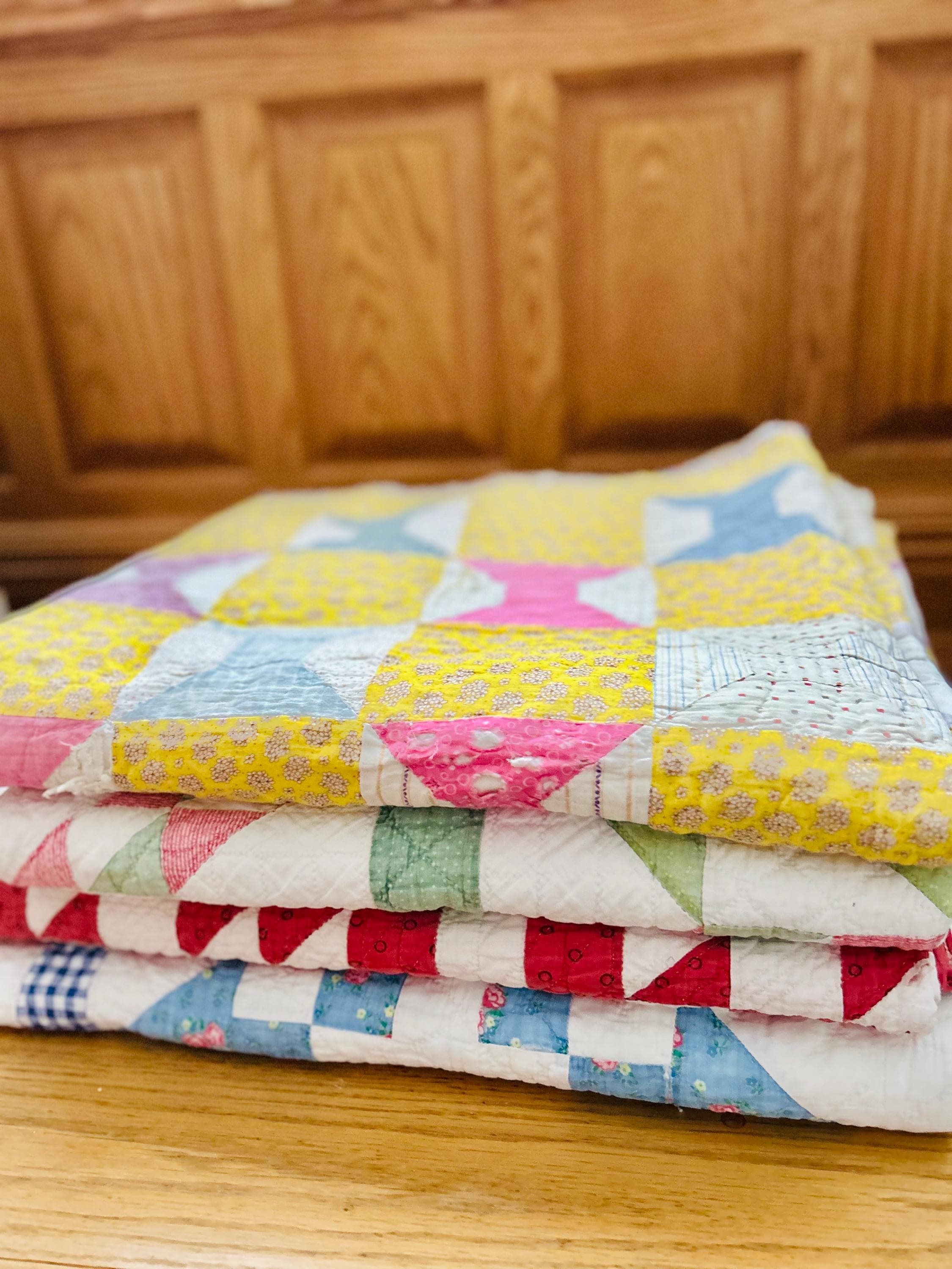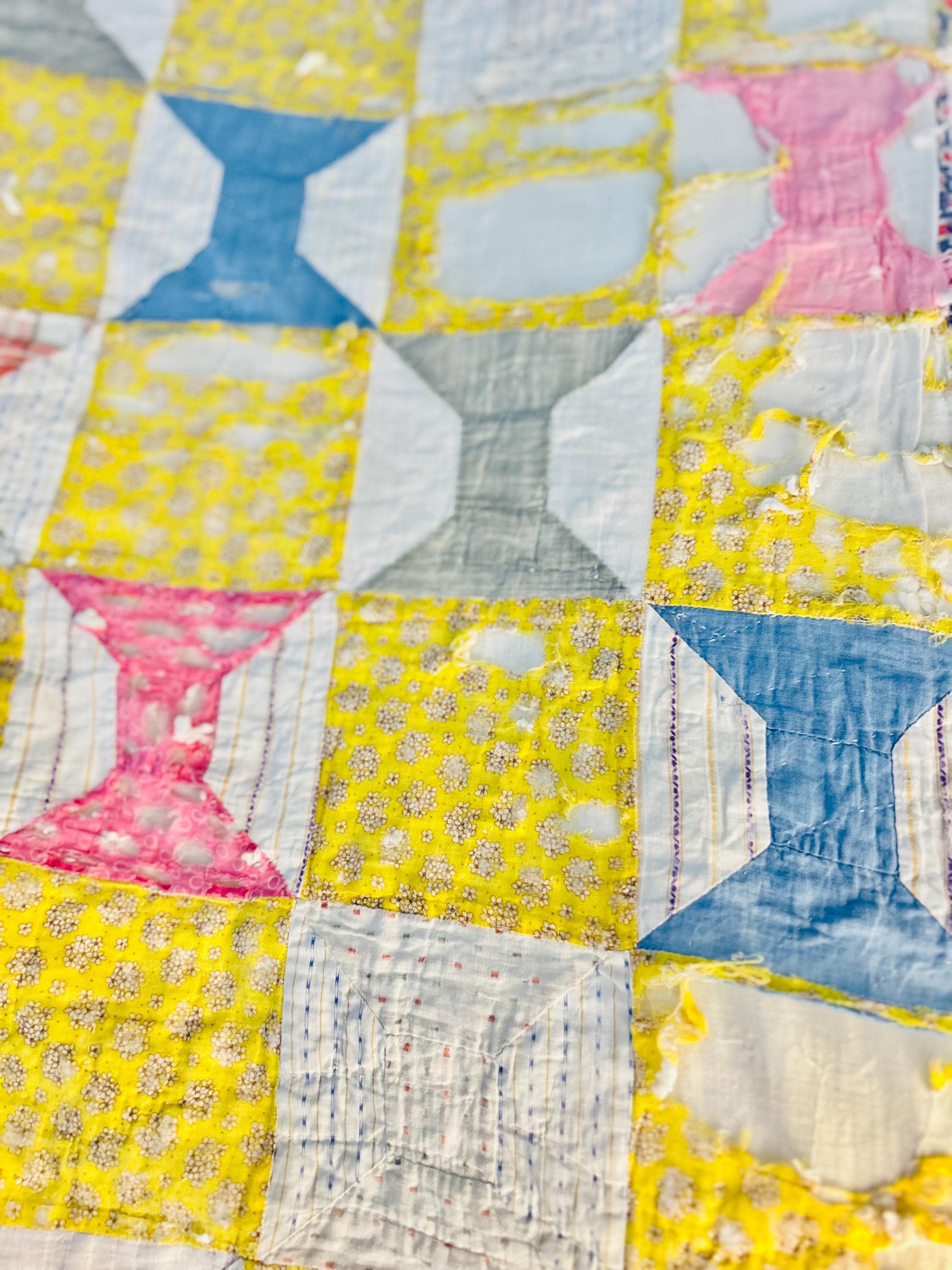 This Spool Quilt, circa 1930s, is still bright and lovely with its mix of yellow, blue, pink and other pastel calicos. The hand-quilting is in a repeating shell pattern which has been finely stitched.