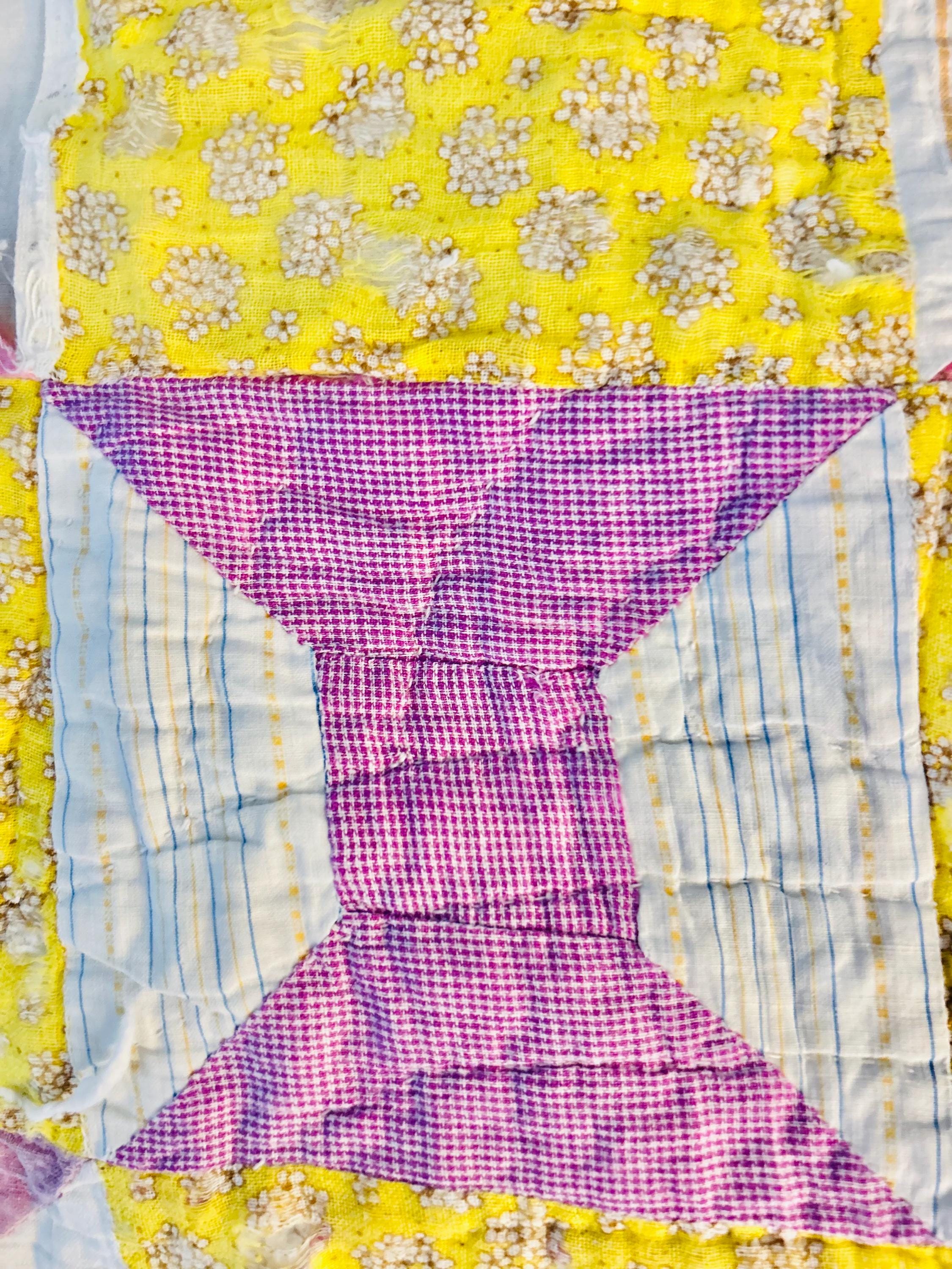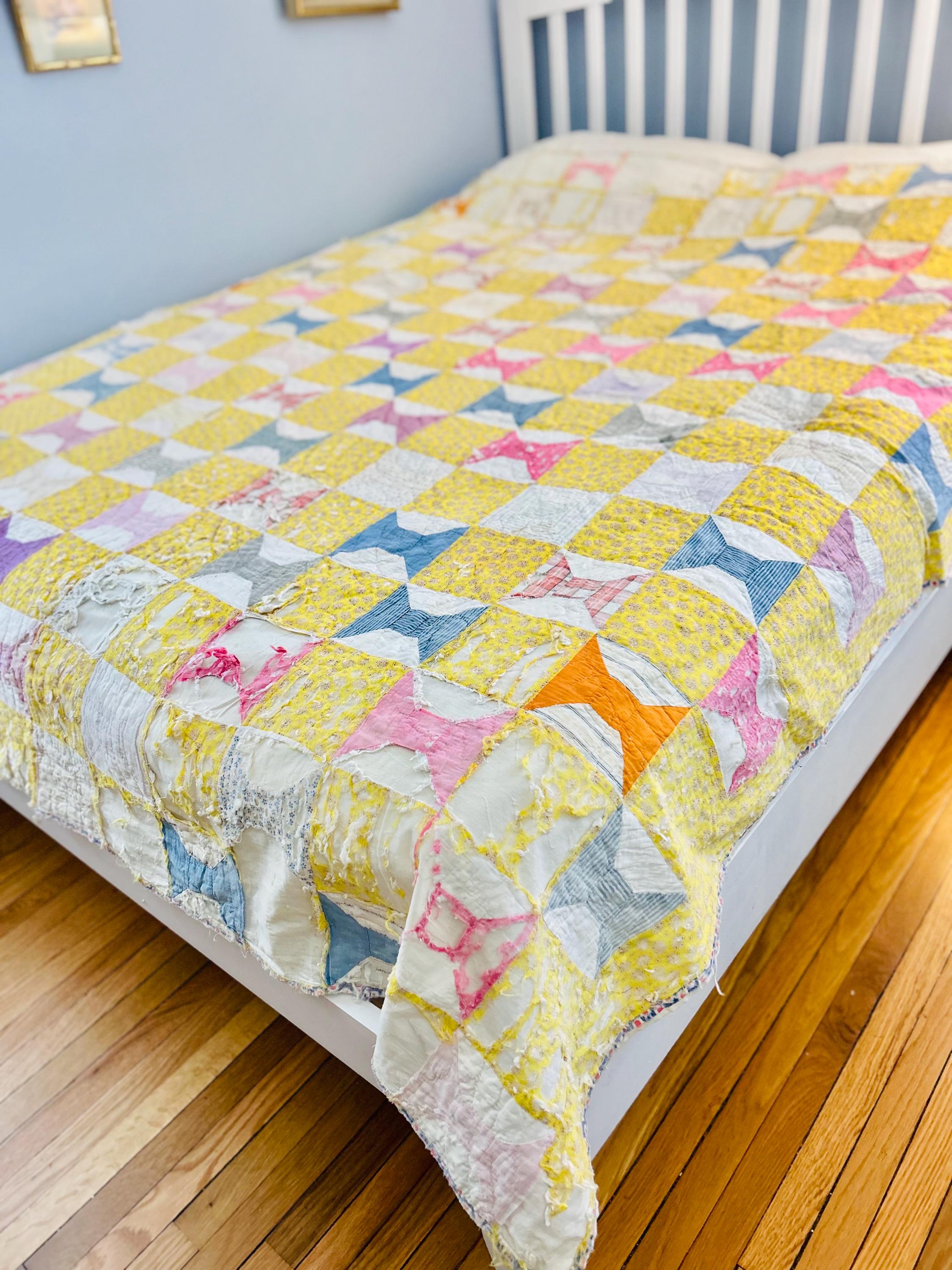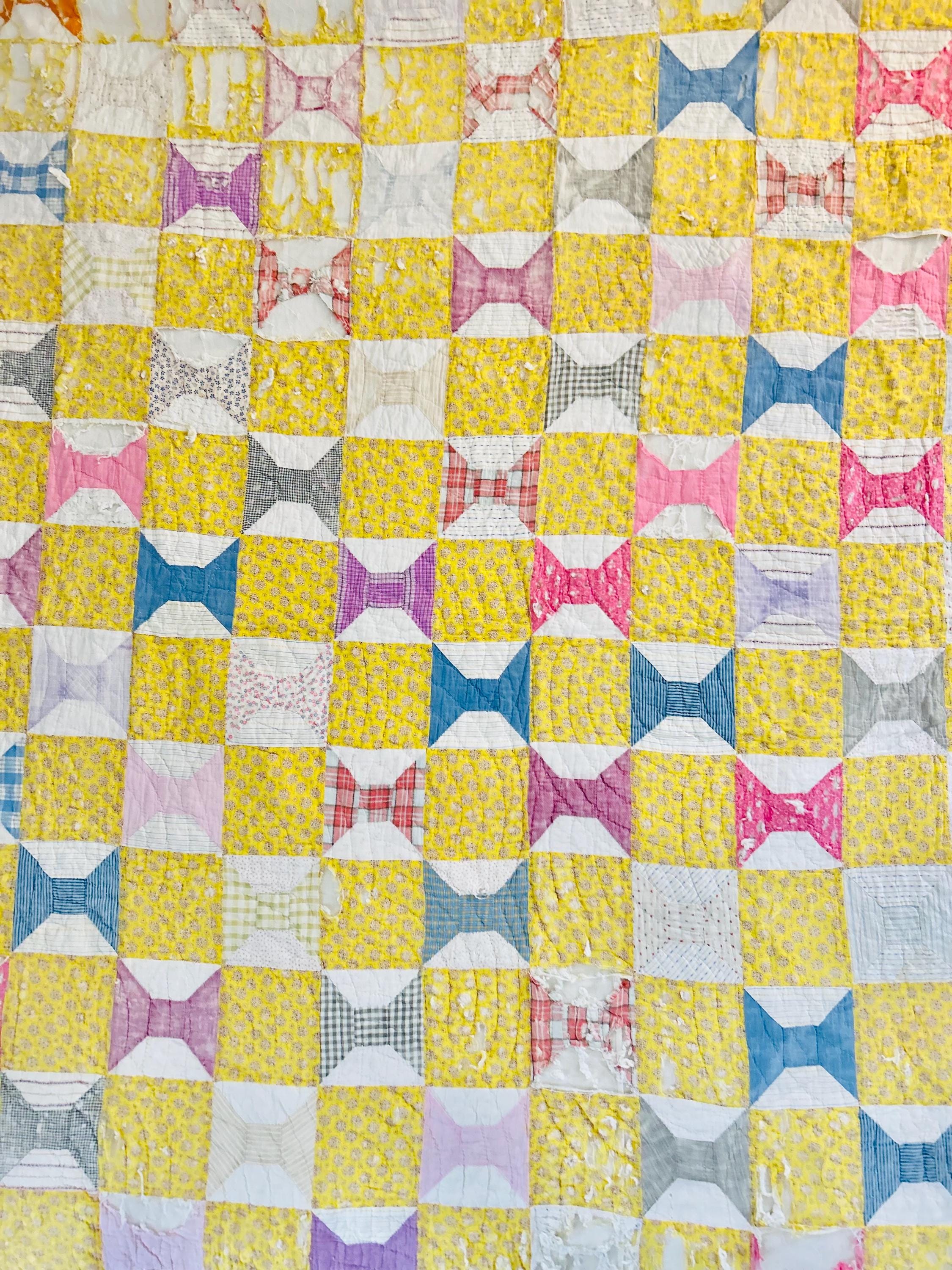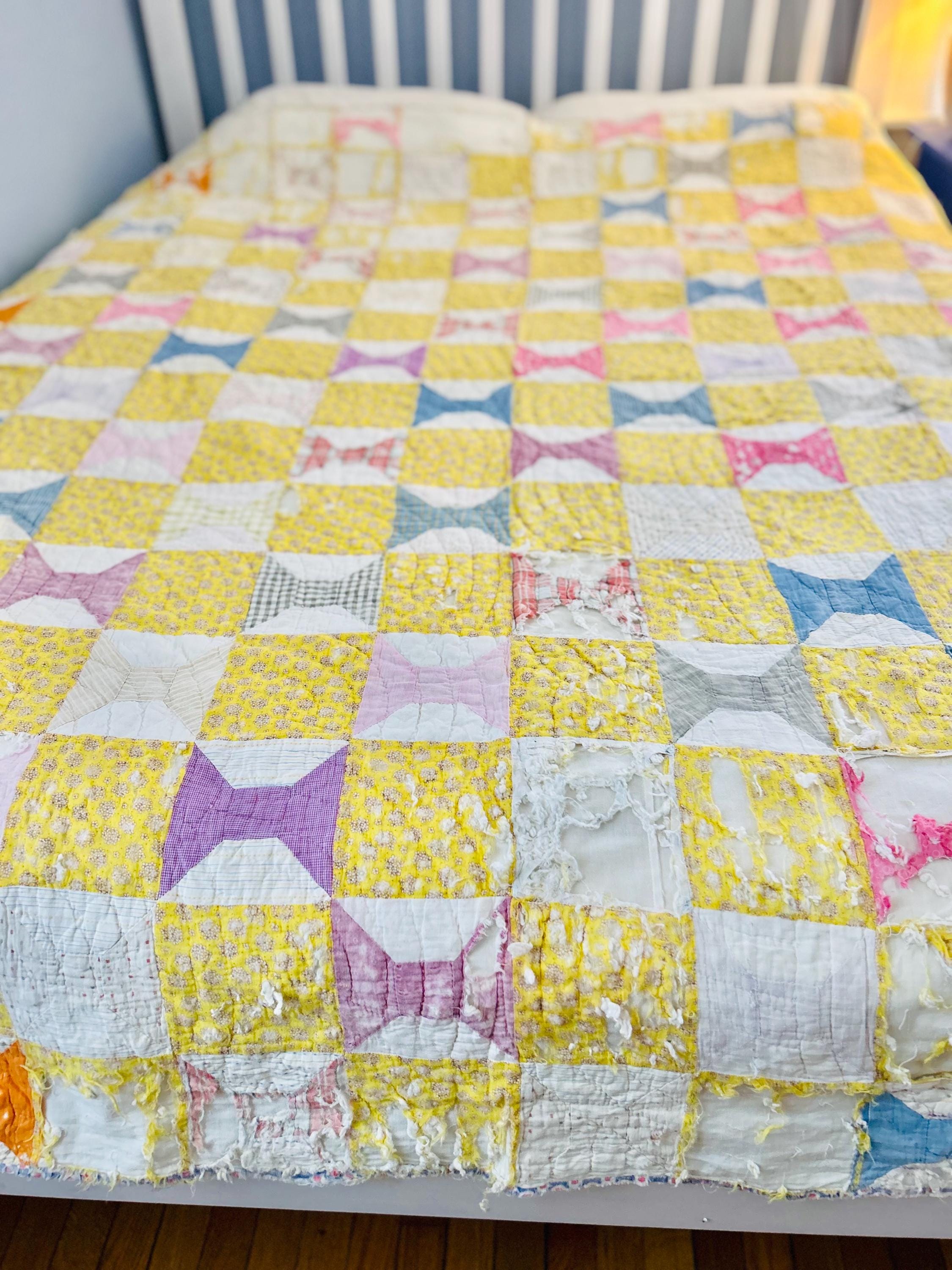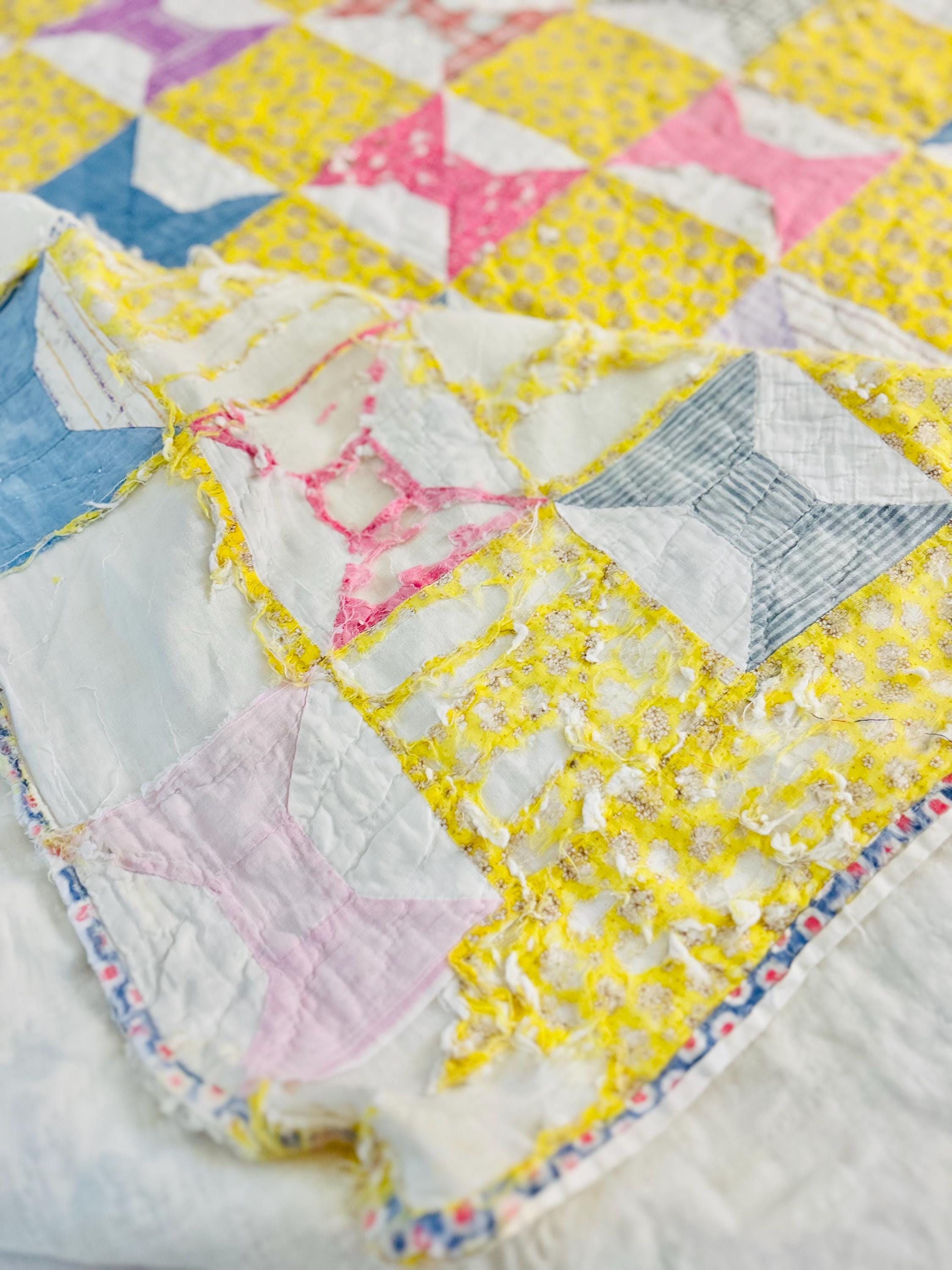 This Spool Quilt, circa 1930s, is still bright and lovely with its mix of yellow, blue, pink and other pastel calicos. The hand-quilting is in a repeating shell pattern which has been finely stitched.