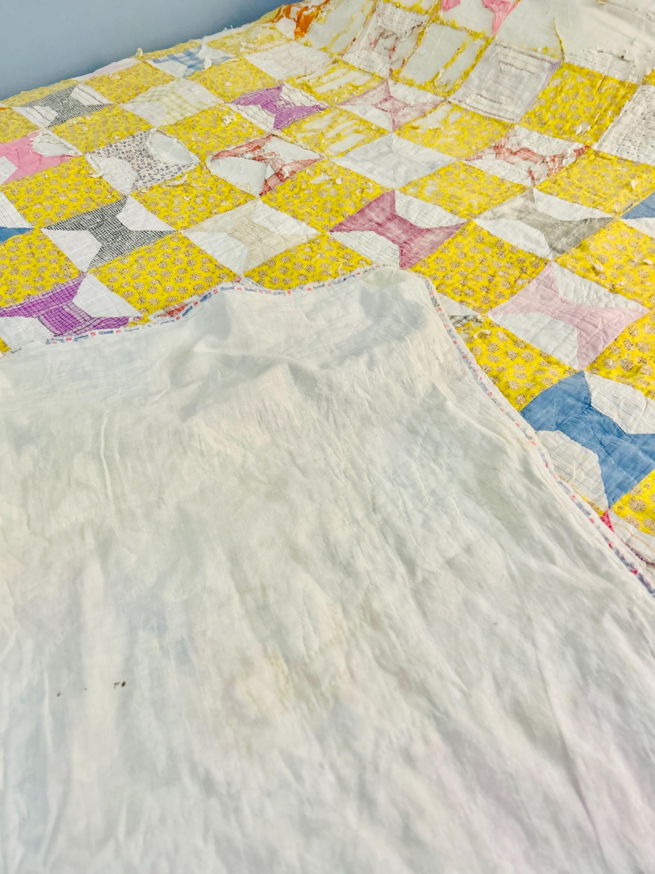The quilt is in poor or cutter condition. Though the back is completely intact and much of the front is intact, the front has extensive fabric loss especially in the white fabrics and a frayed border. See photos.