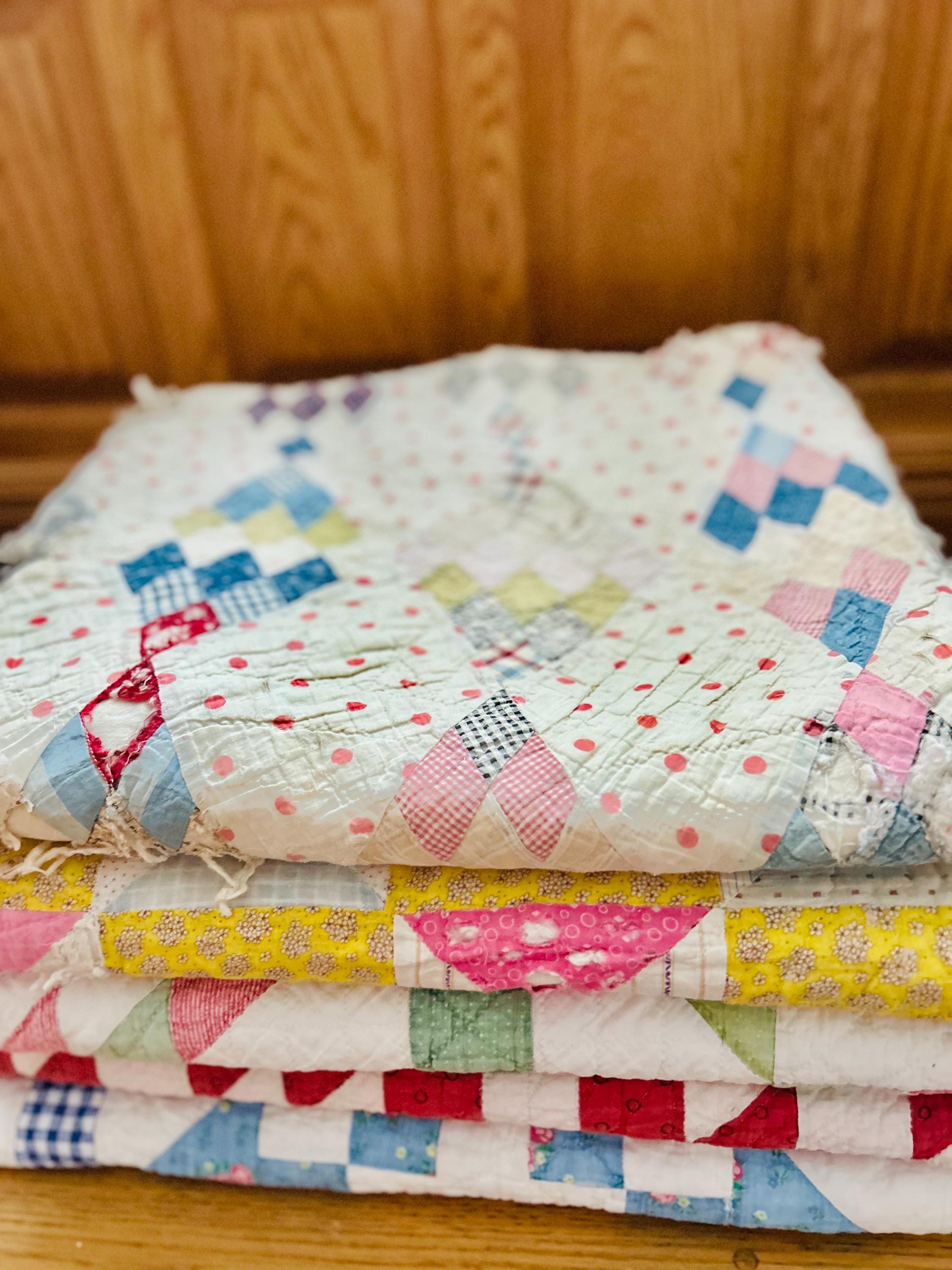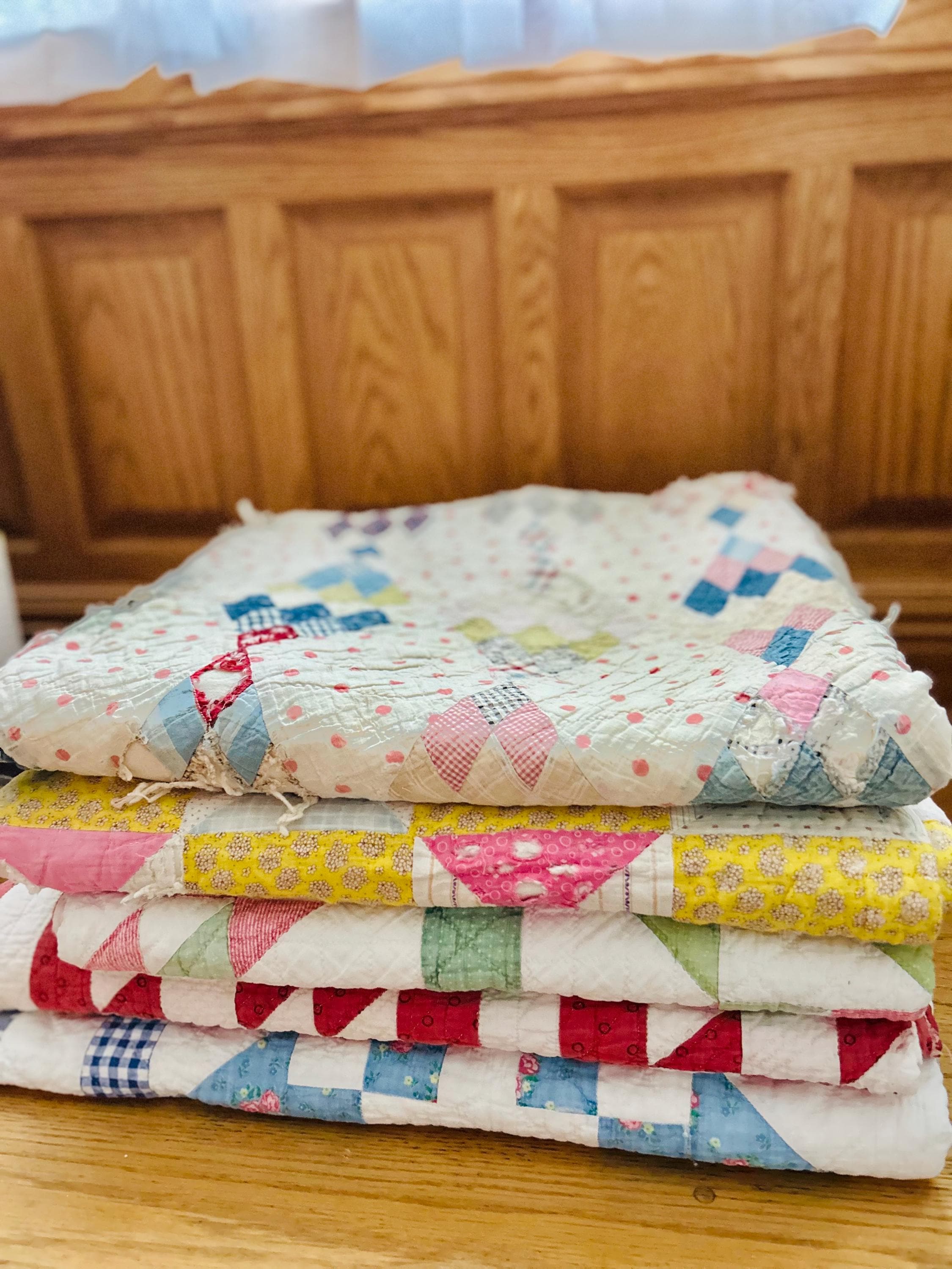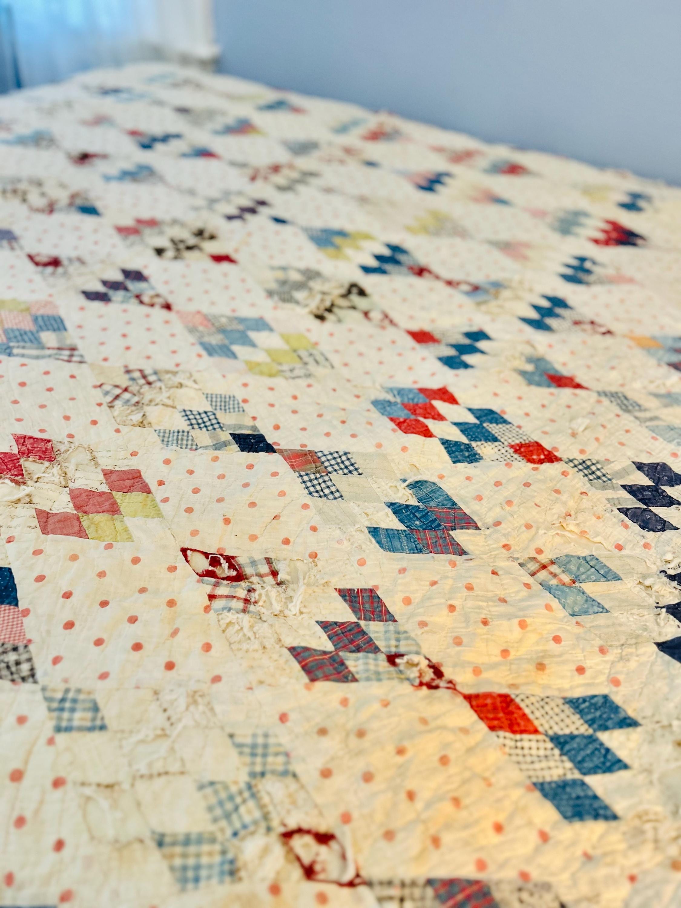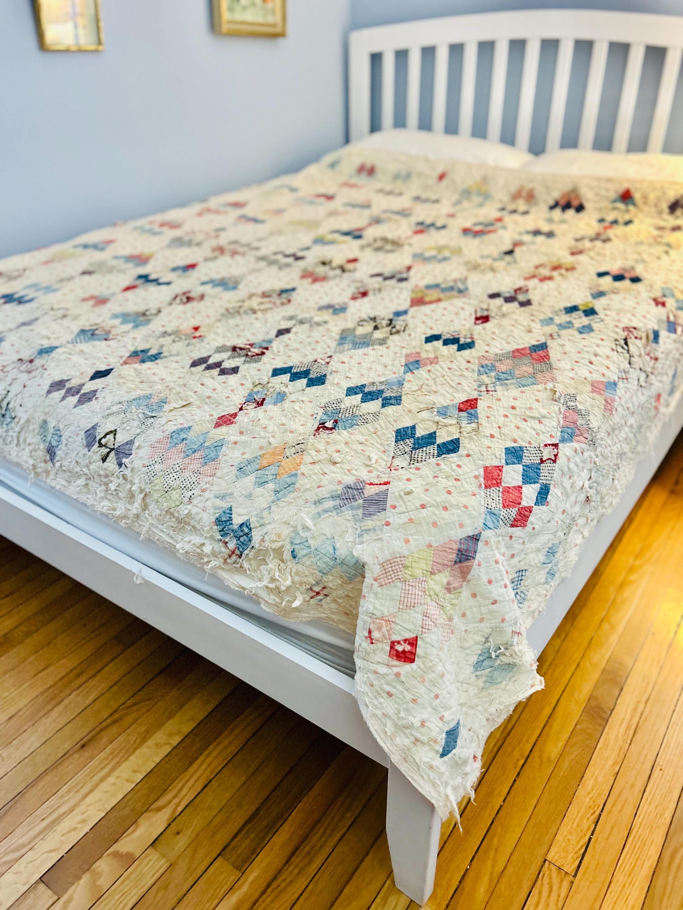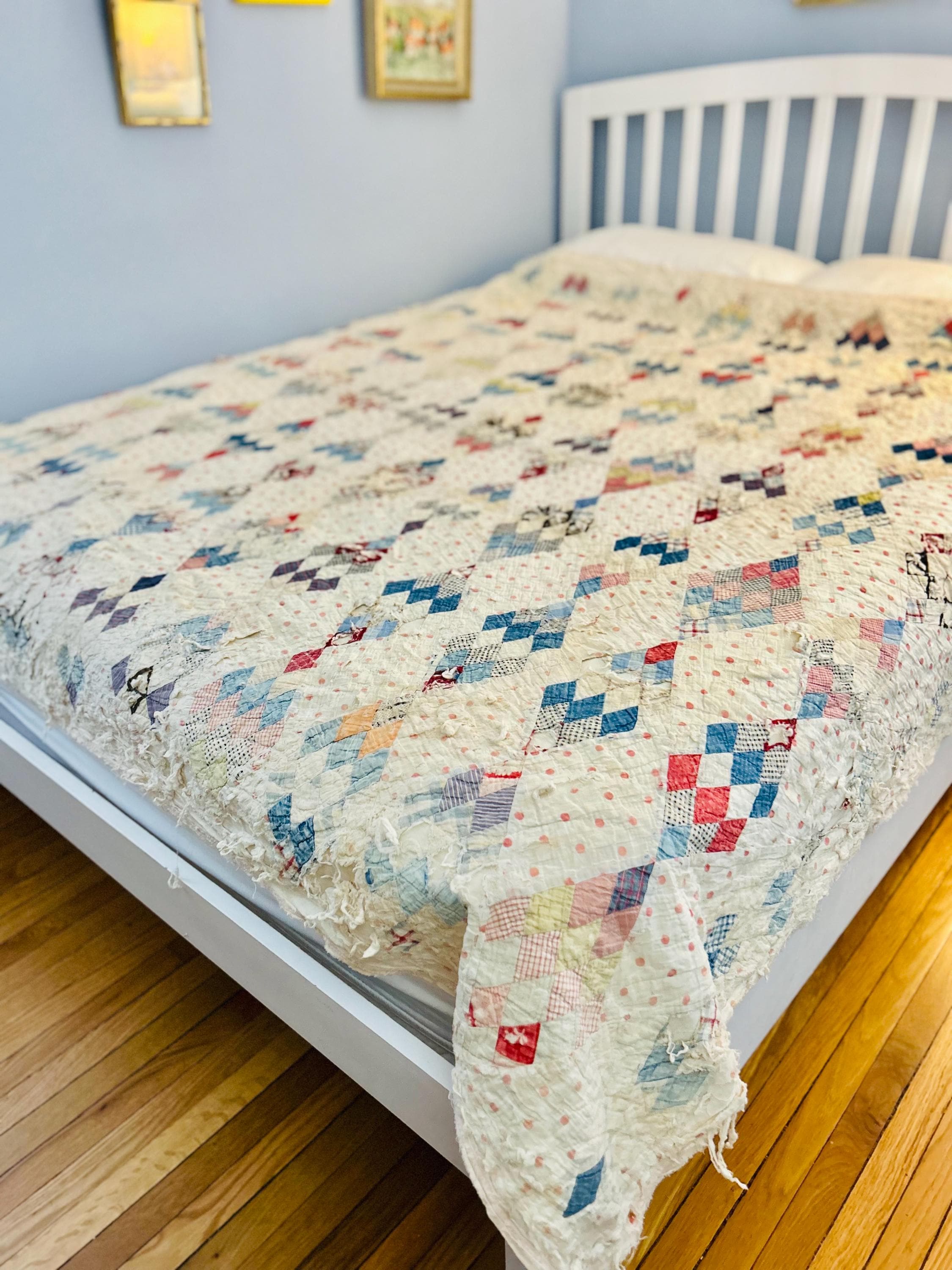 The quilt is clean and soft and comes from a smoke-free and pet-free home. It measures 70 inches by 79 inches. Shown on a queen-size bed.