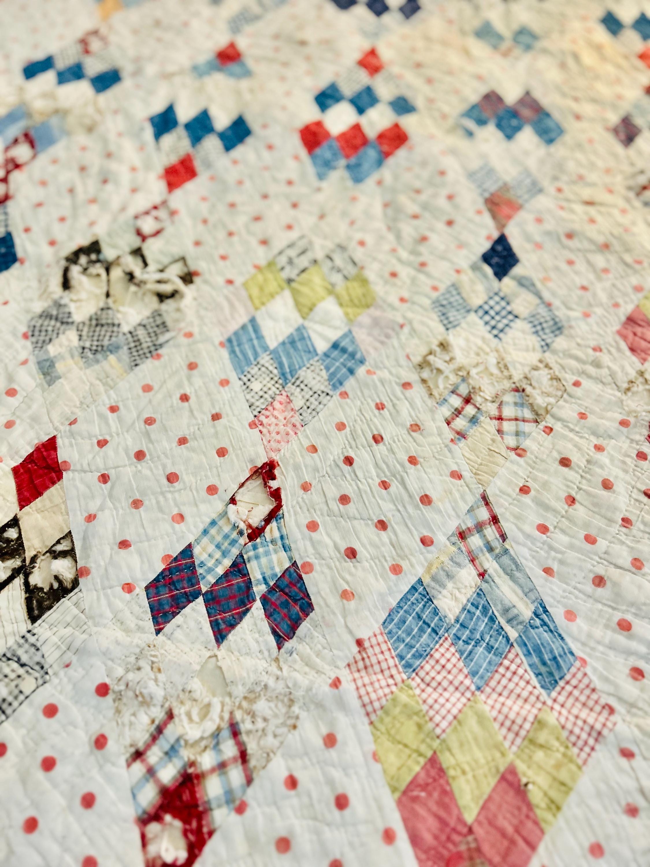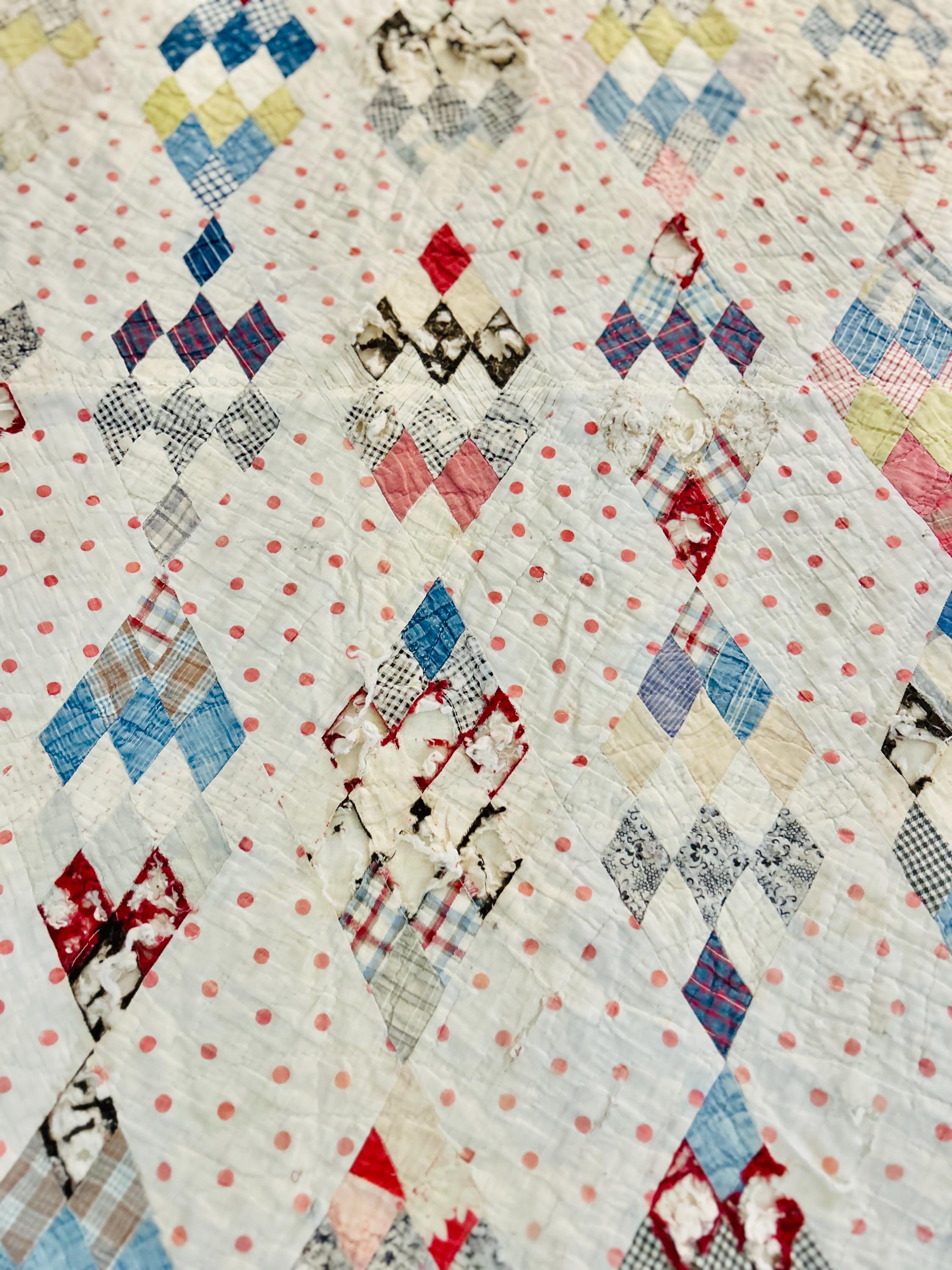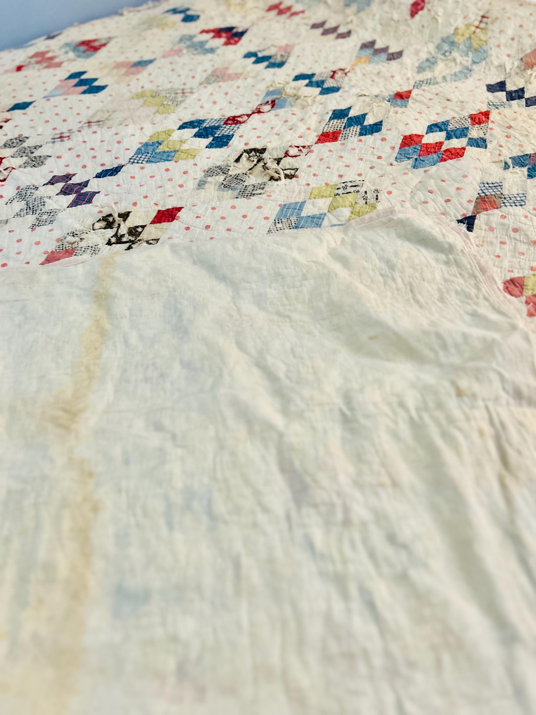 The quilt is in poor or cutter condition. The back has some tanning, but is intact, while the fabric loss on the quilt top is extensive and the binding is completely frayed. See photos.
