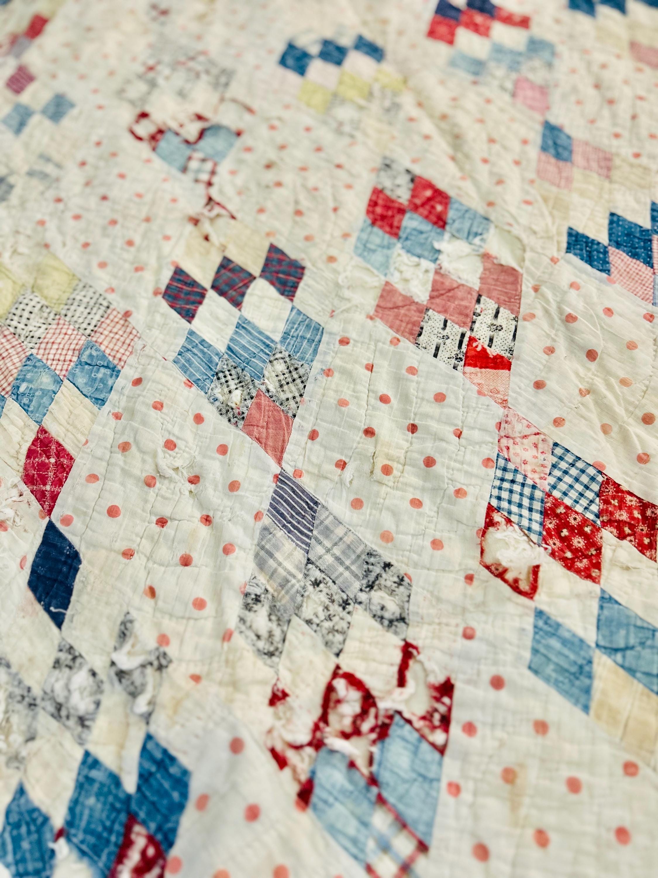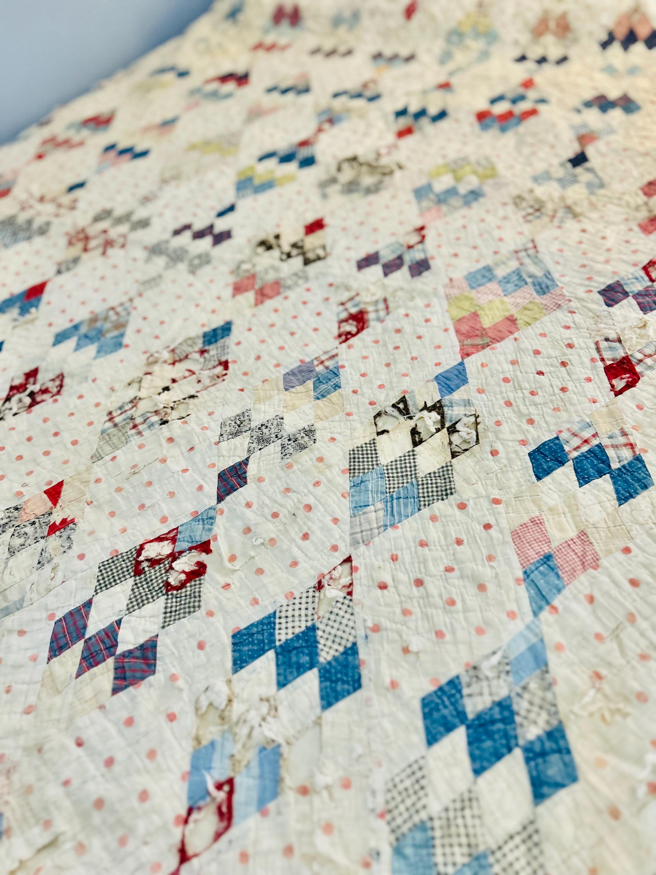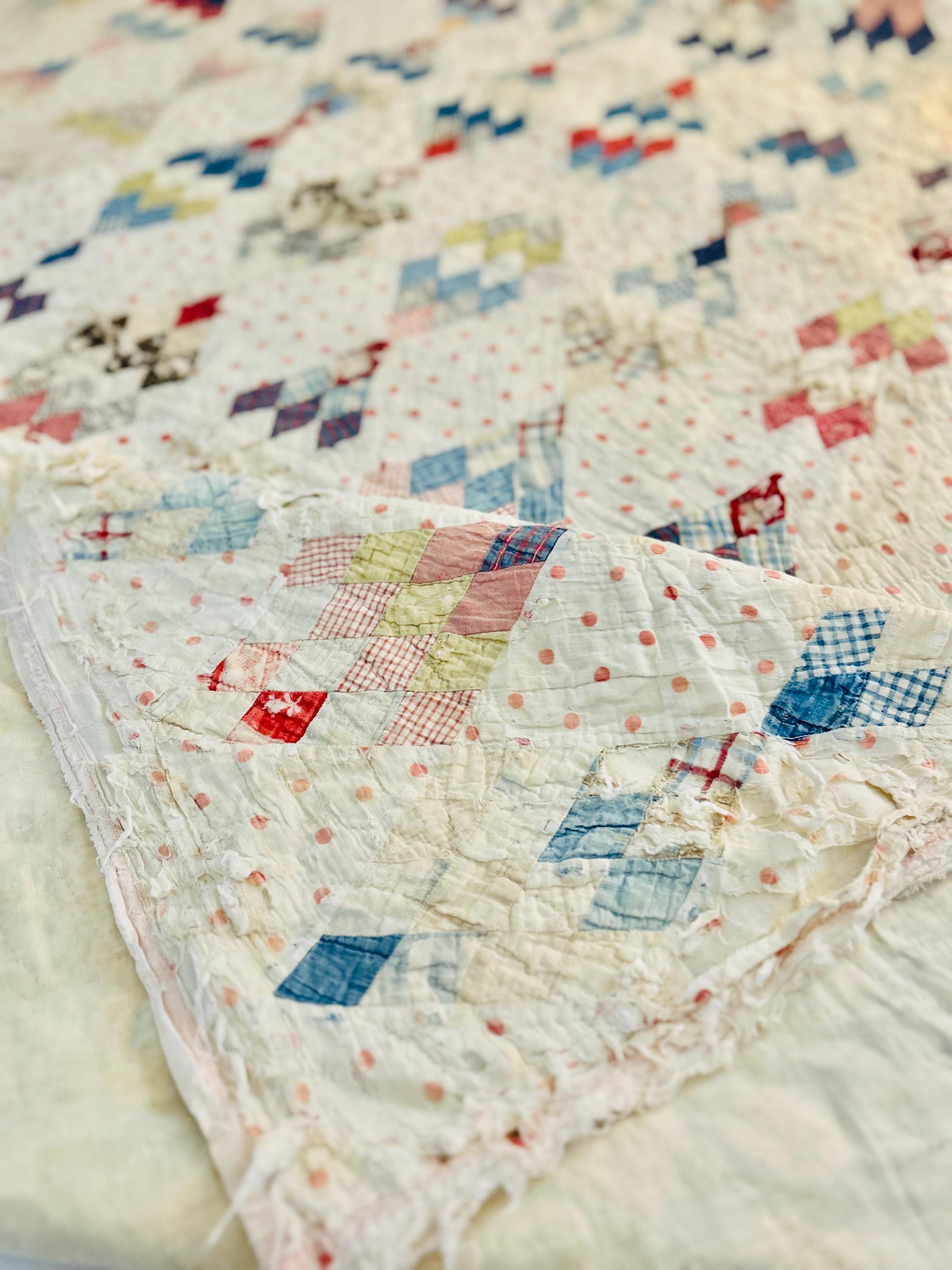 The quilt is in poor or cutter condition. The back has some tanning, but is intact, while the fabric loss on the quilt top is extensive and the binding is completely frayed. See photos.