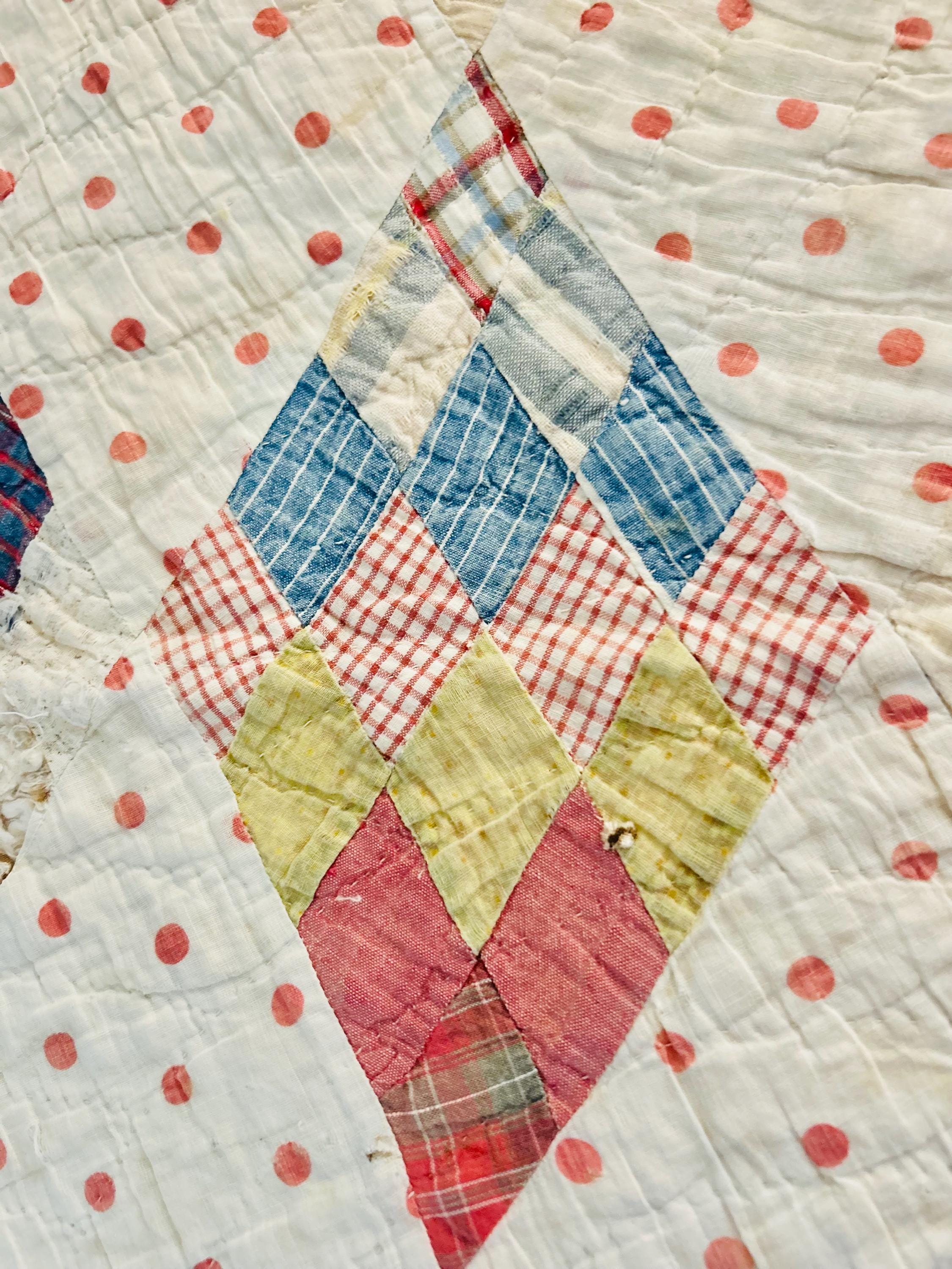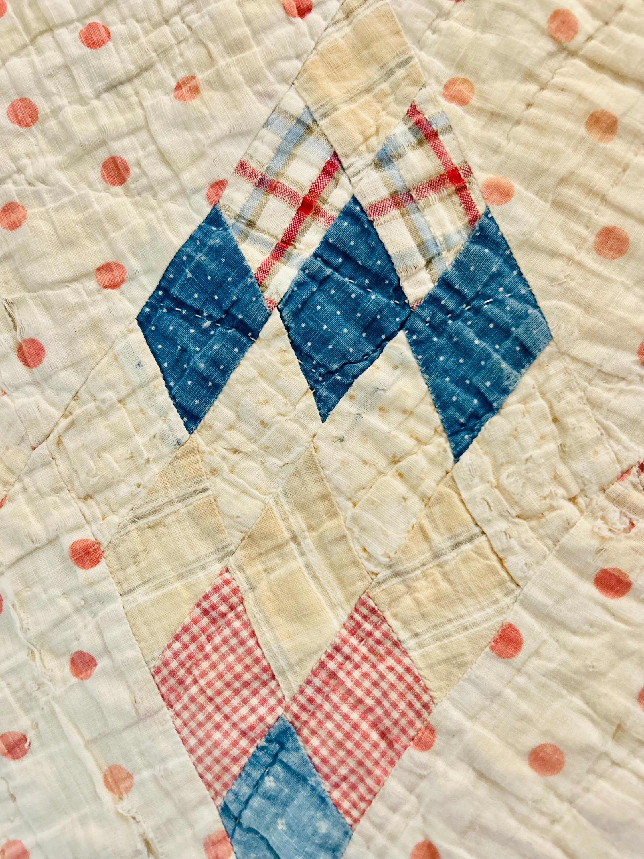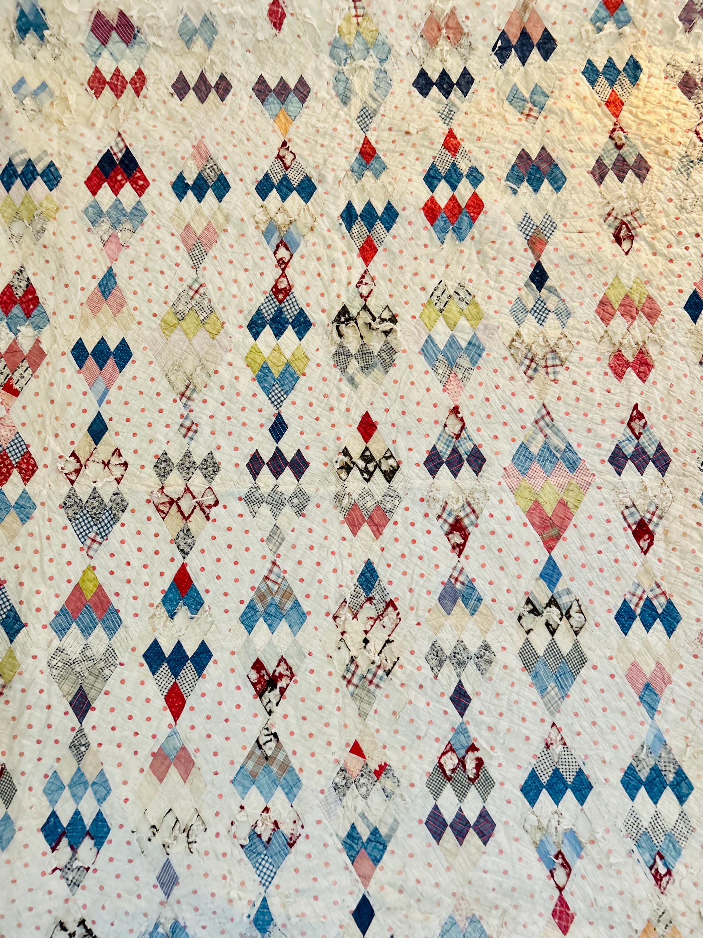 This beautiful old Charm Diamond Quilt was made in the 1880s or 1890s in a pattern not often seen today. It has been finely hand-quilted in a shell pattern in tiny stitches.