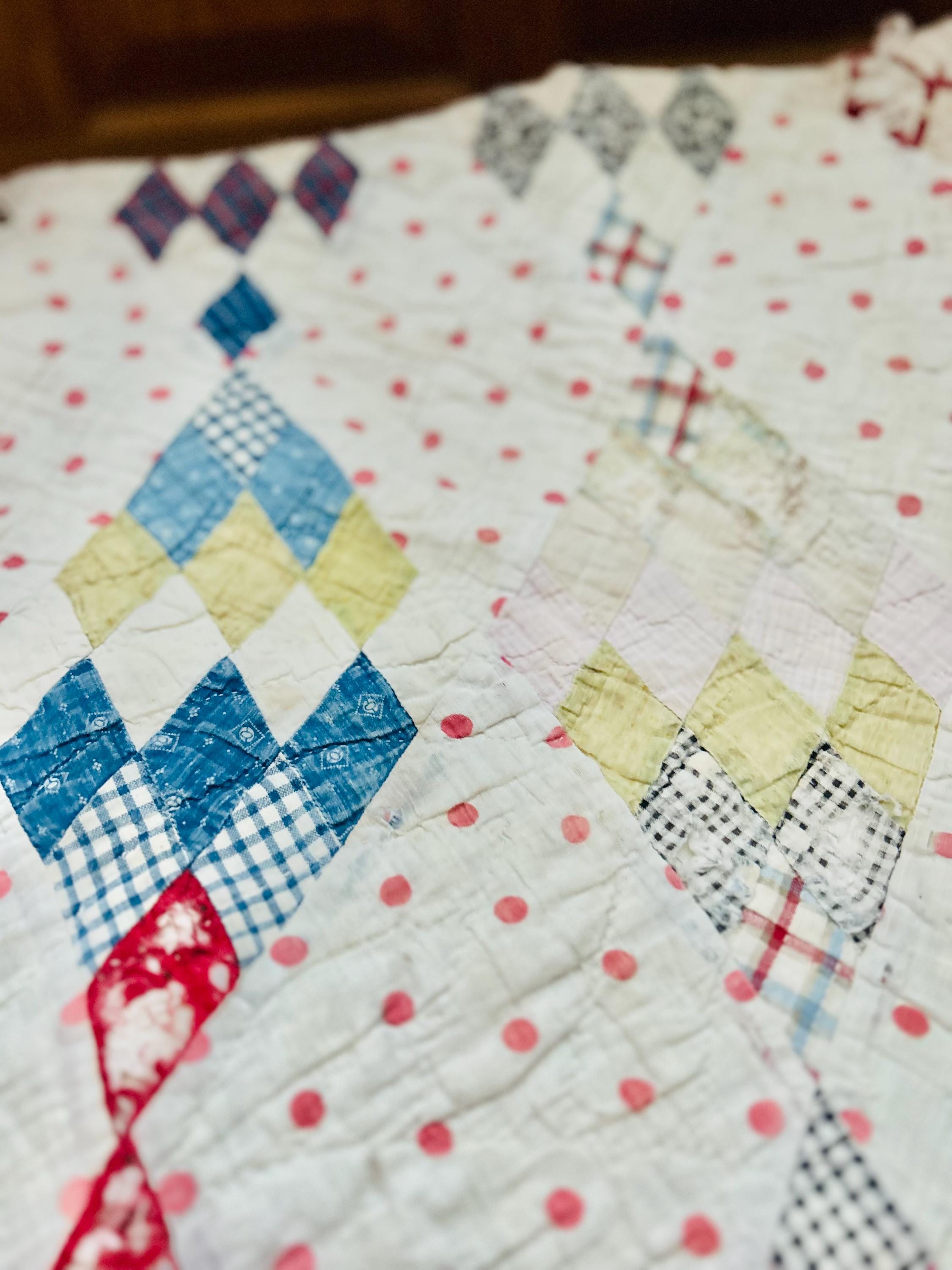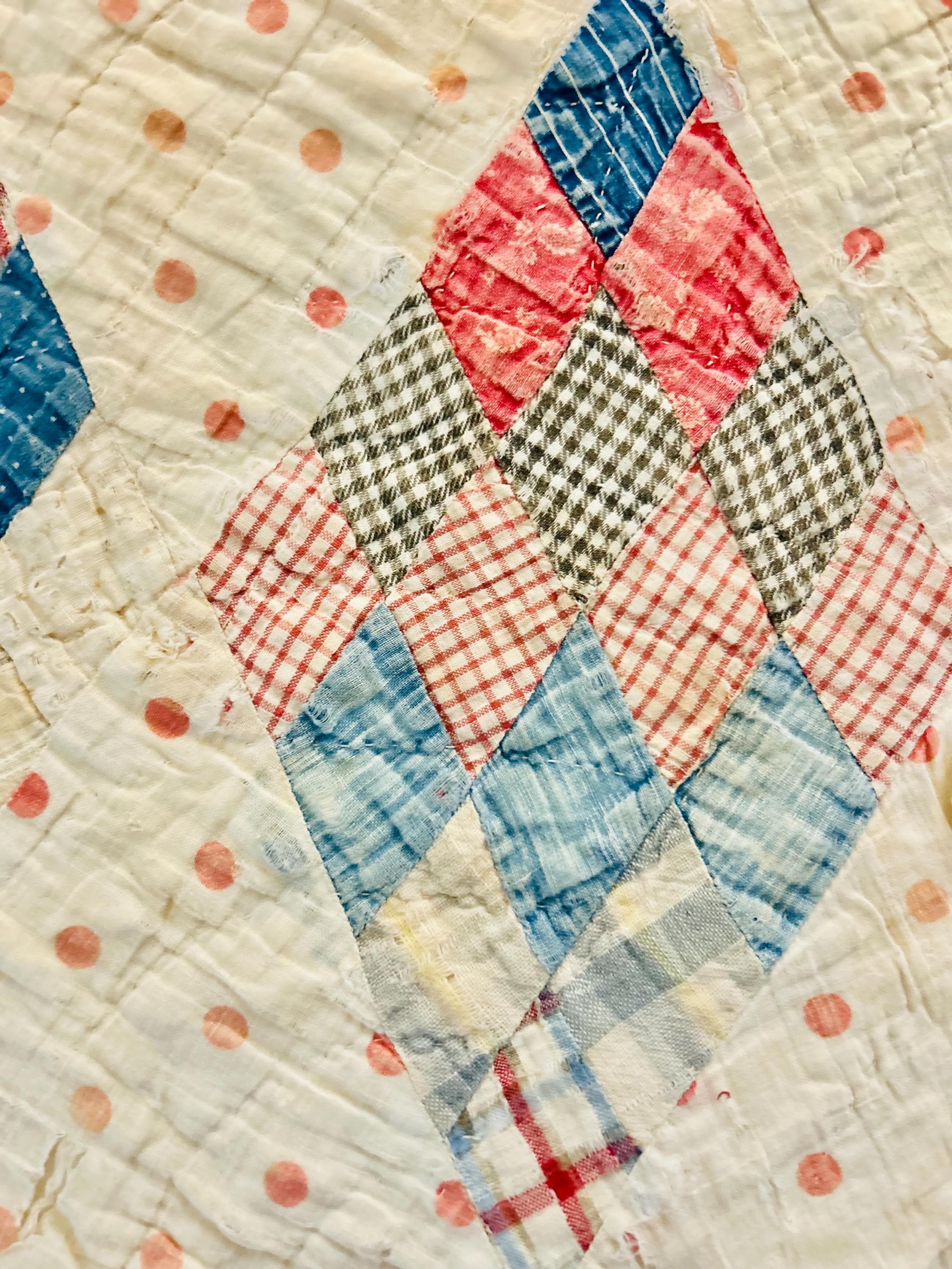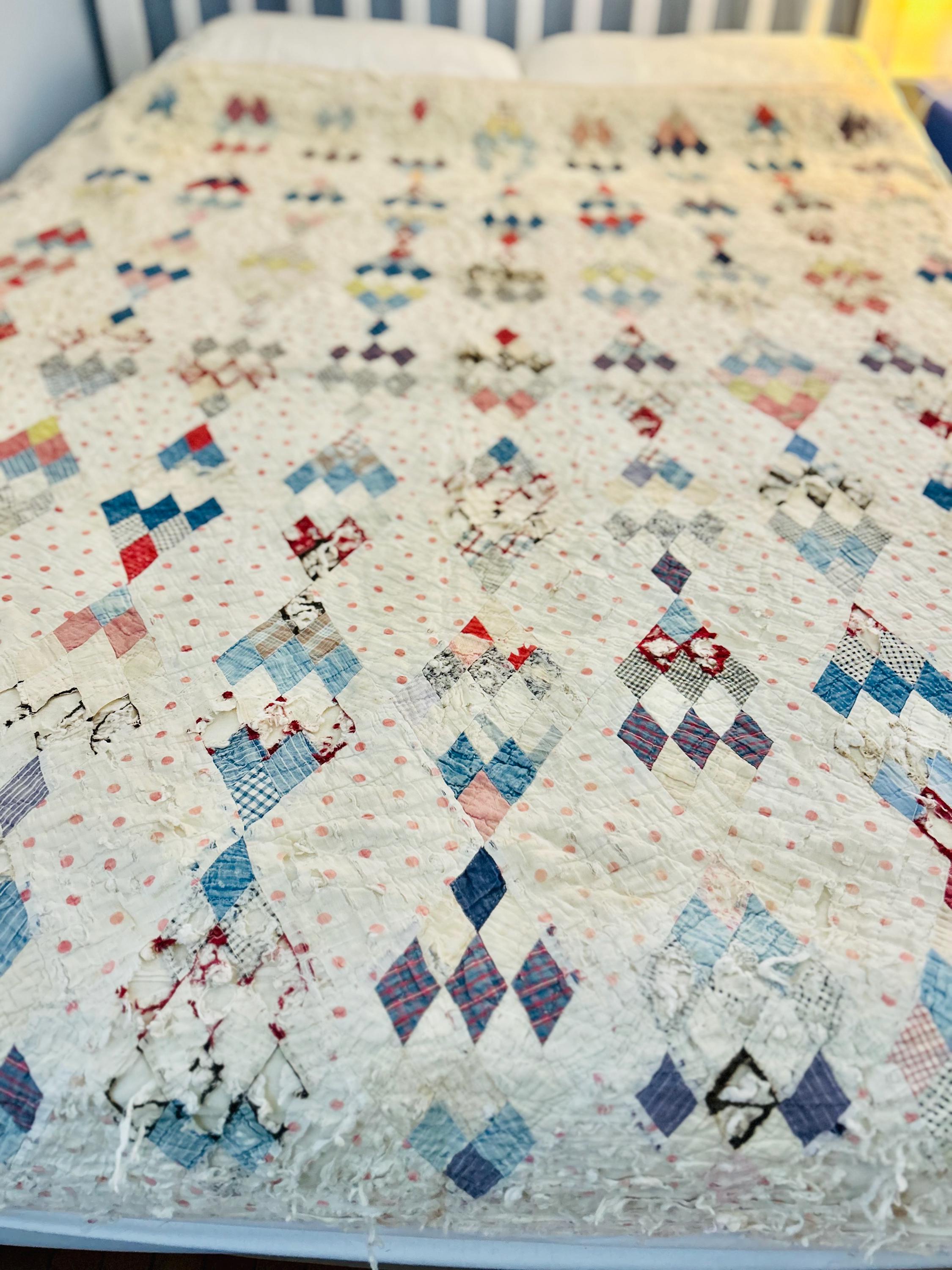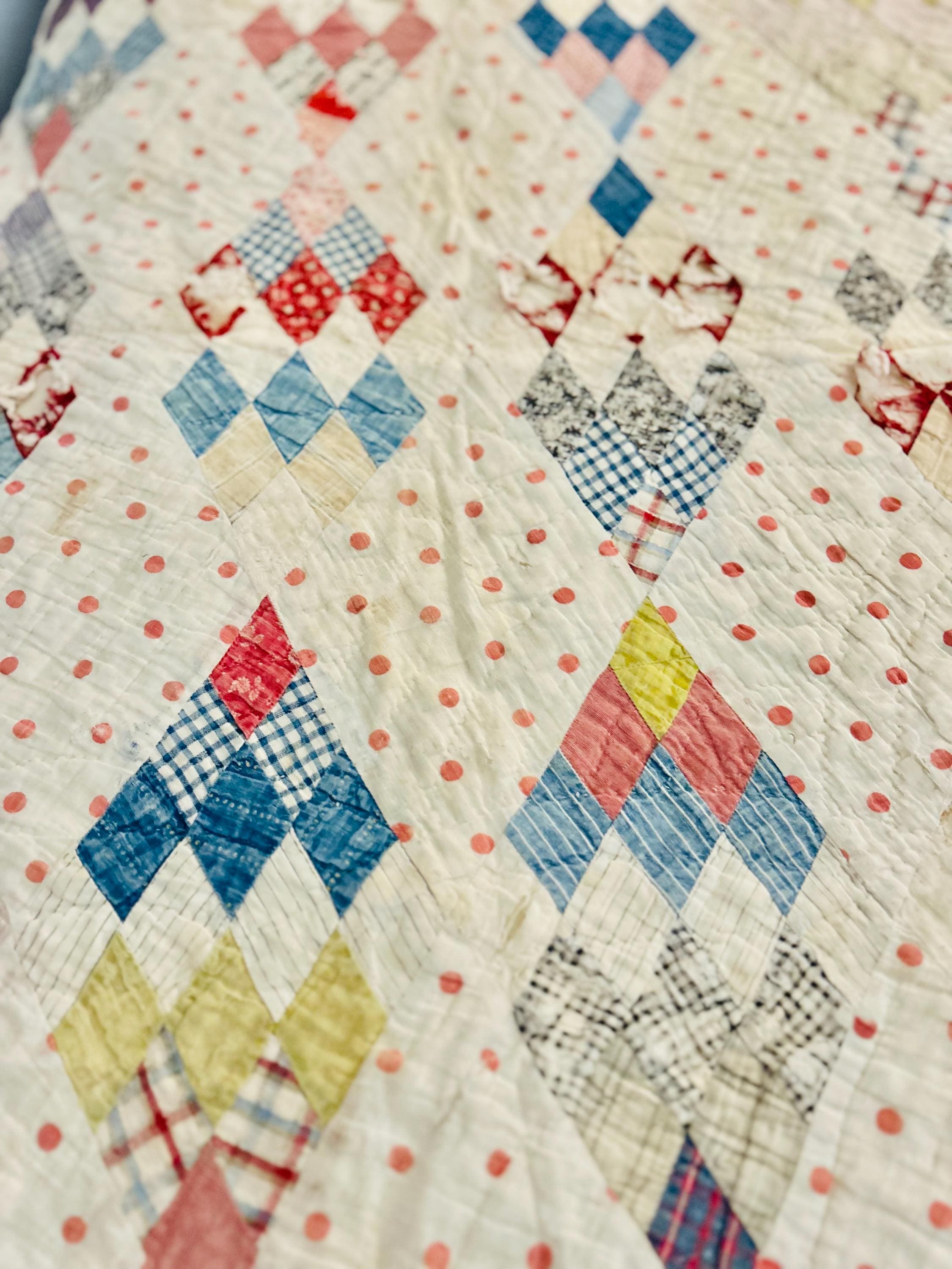 This beautiful old Charm Diamond Quilt was made in the 1880s or 1890s in a pattern not often seen today. It has been finely hand-quilted in a shell pattern in tiny stitches.