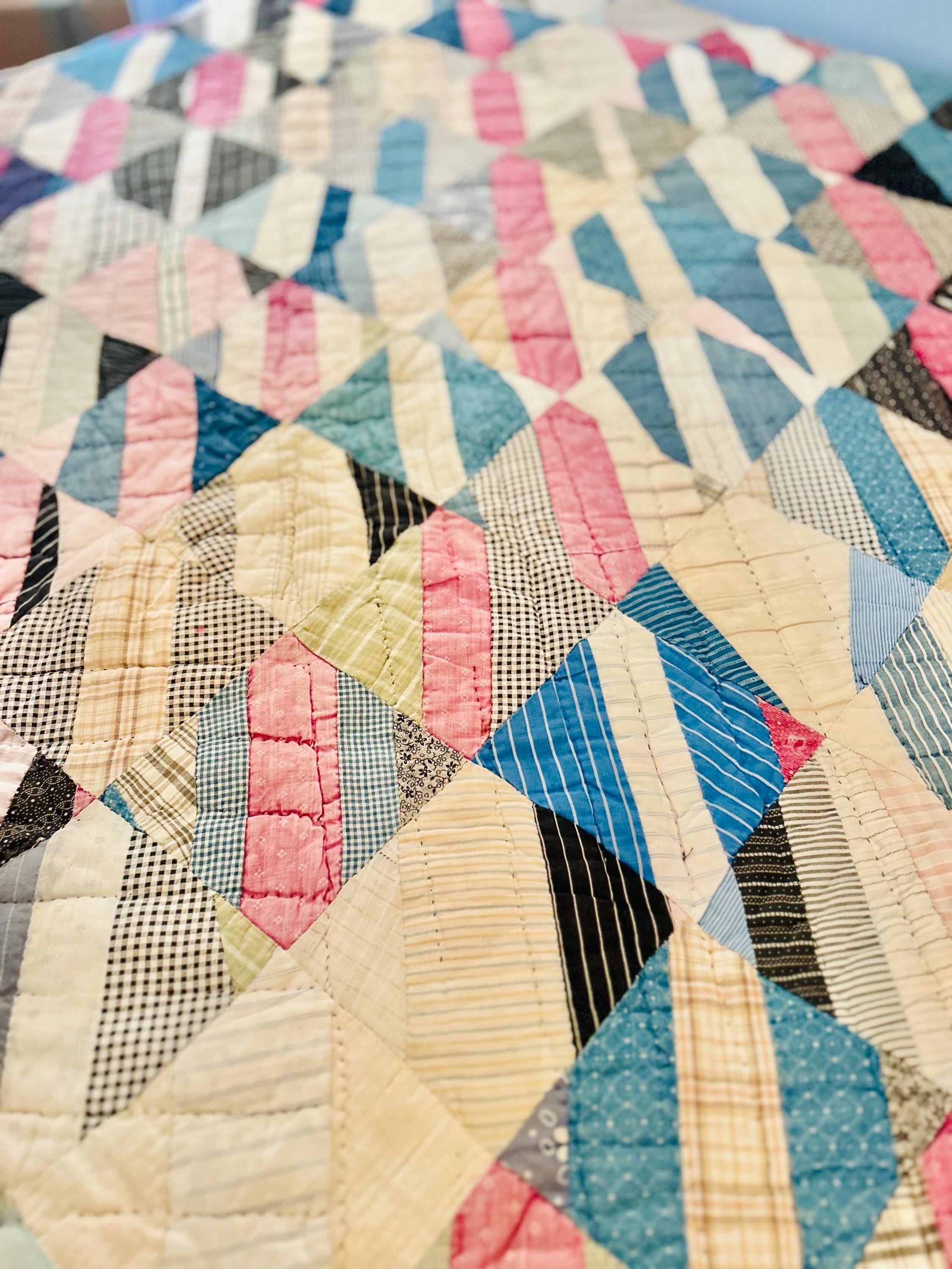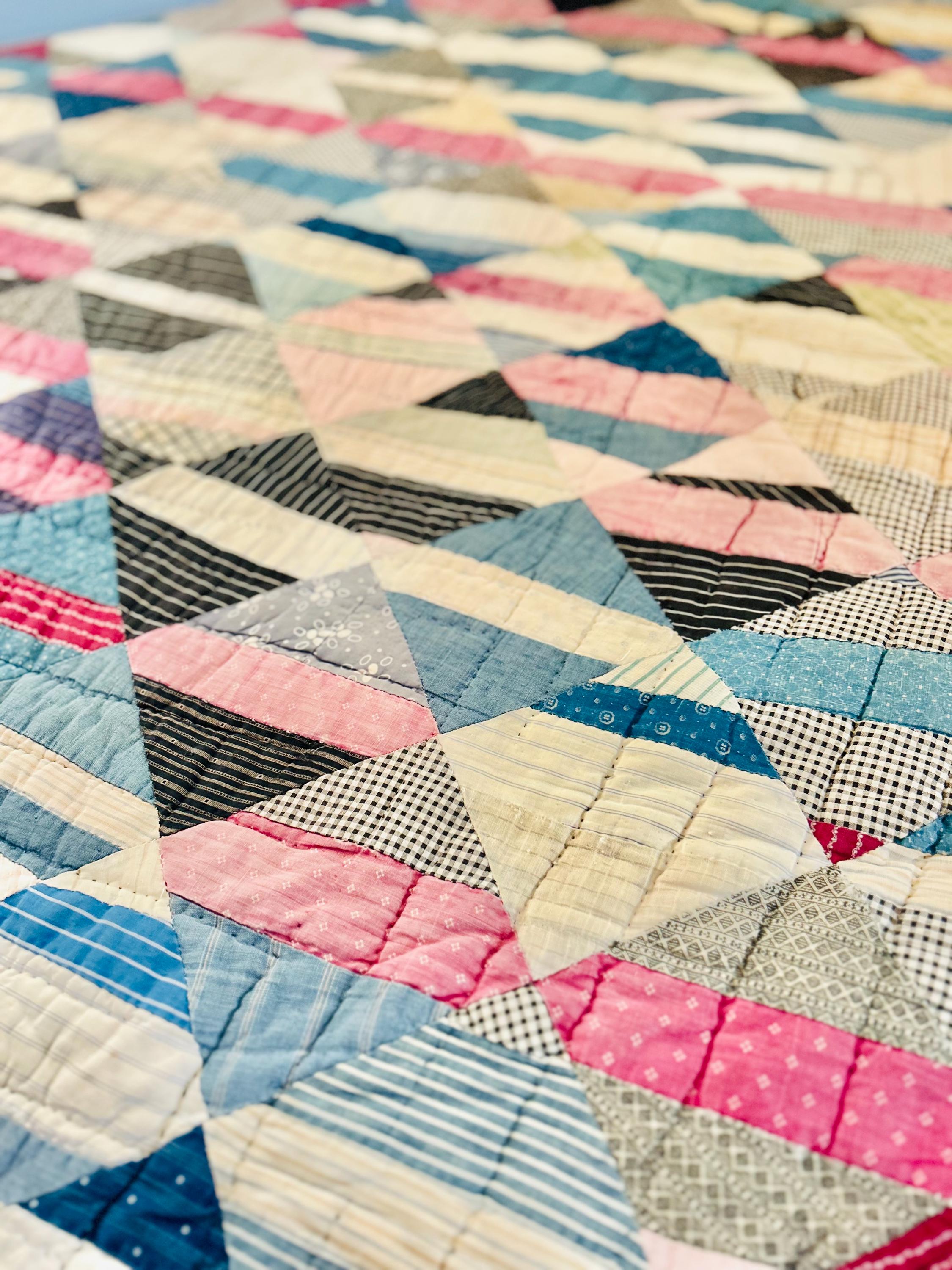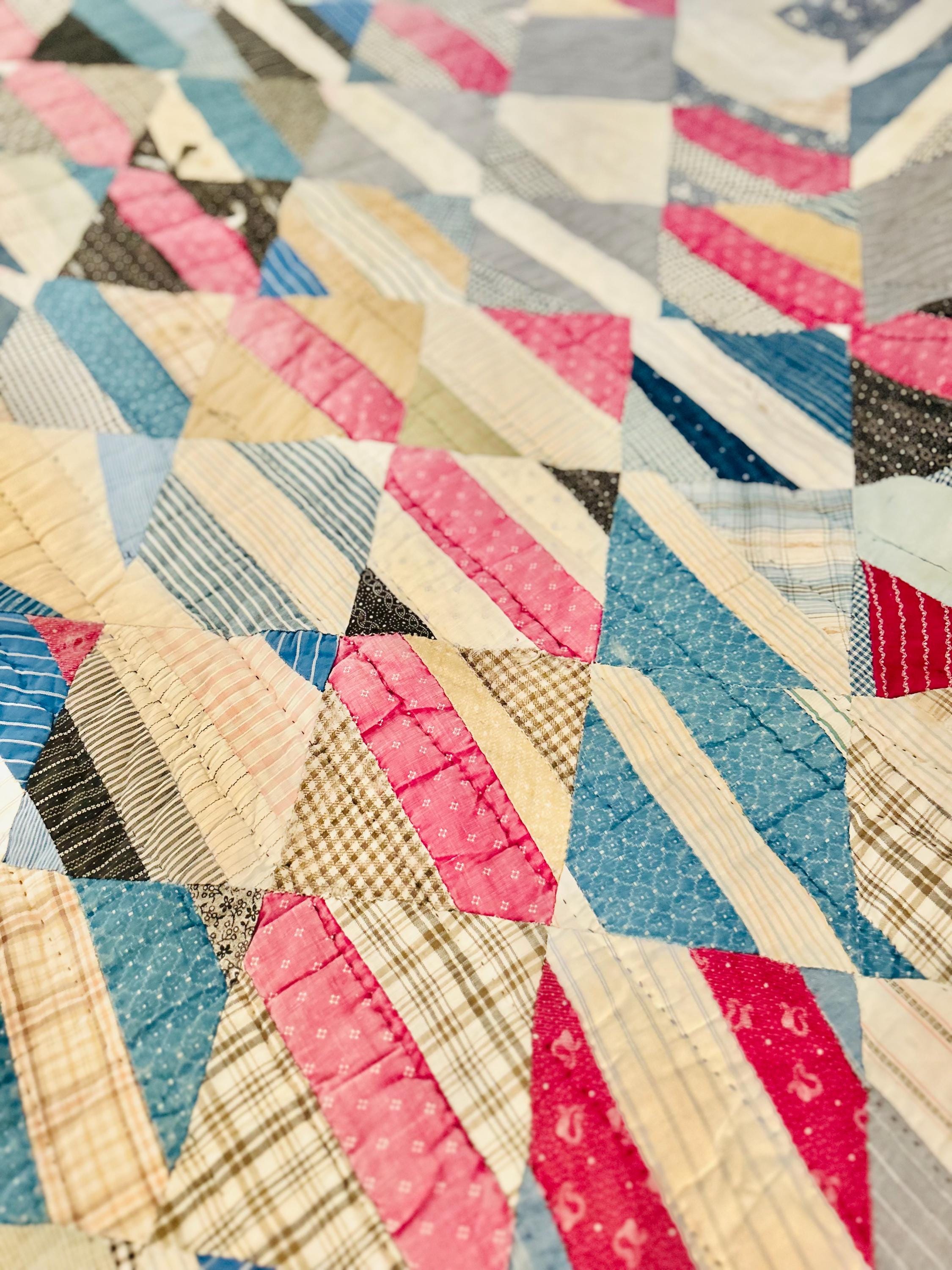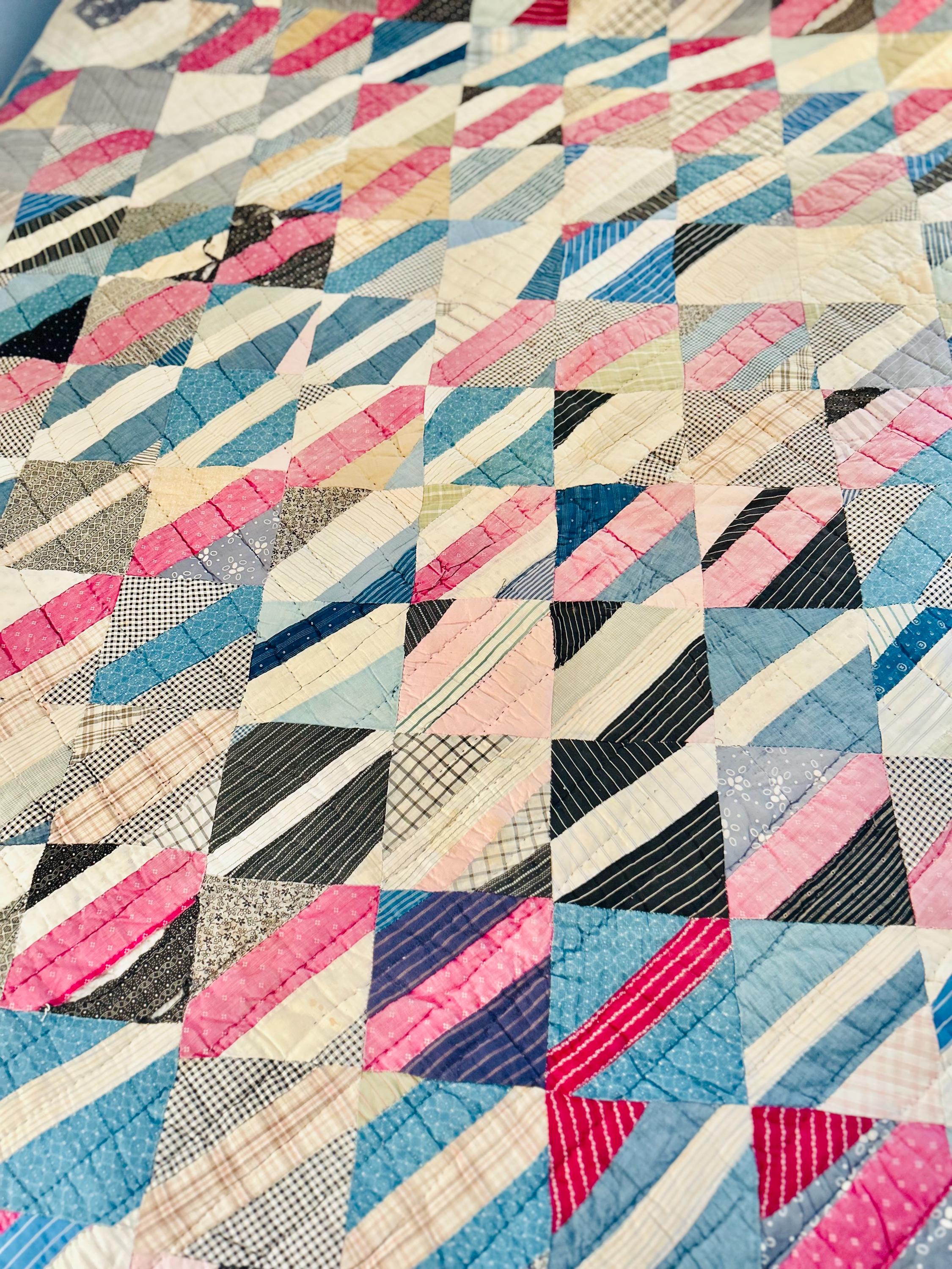 This beautiful Scrappy String Quilt was made in the 1930s from a wonderful mix of colorful scraps -- pink, blue, black, white along with shirting prints, all of which have been arranged in a diagonal string pattern. It has been entirely hand quilted in black thread in a diamond, diagonals and grid pattern.
