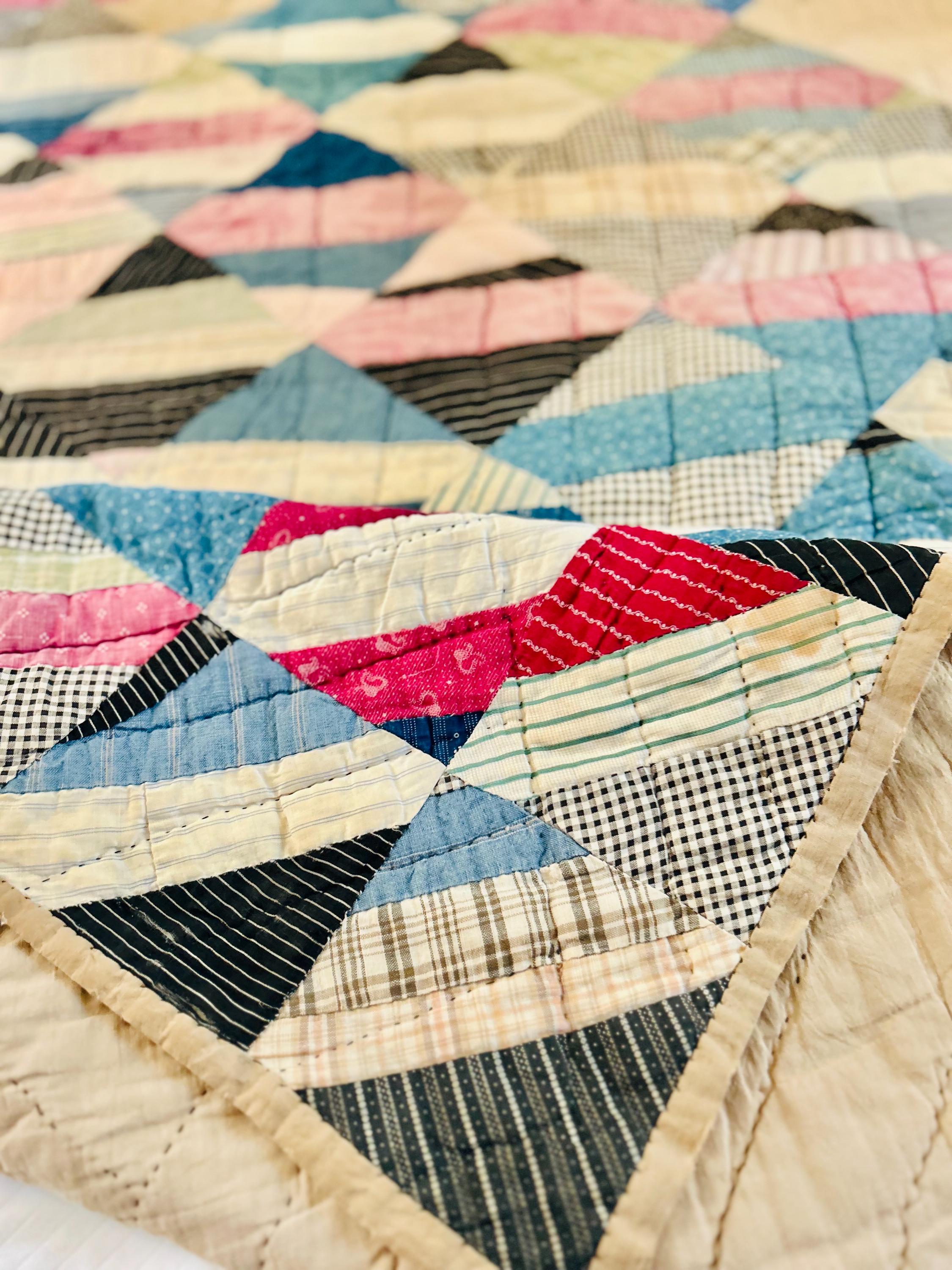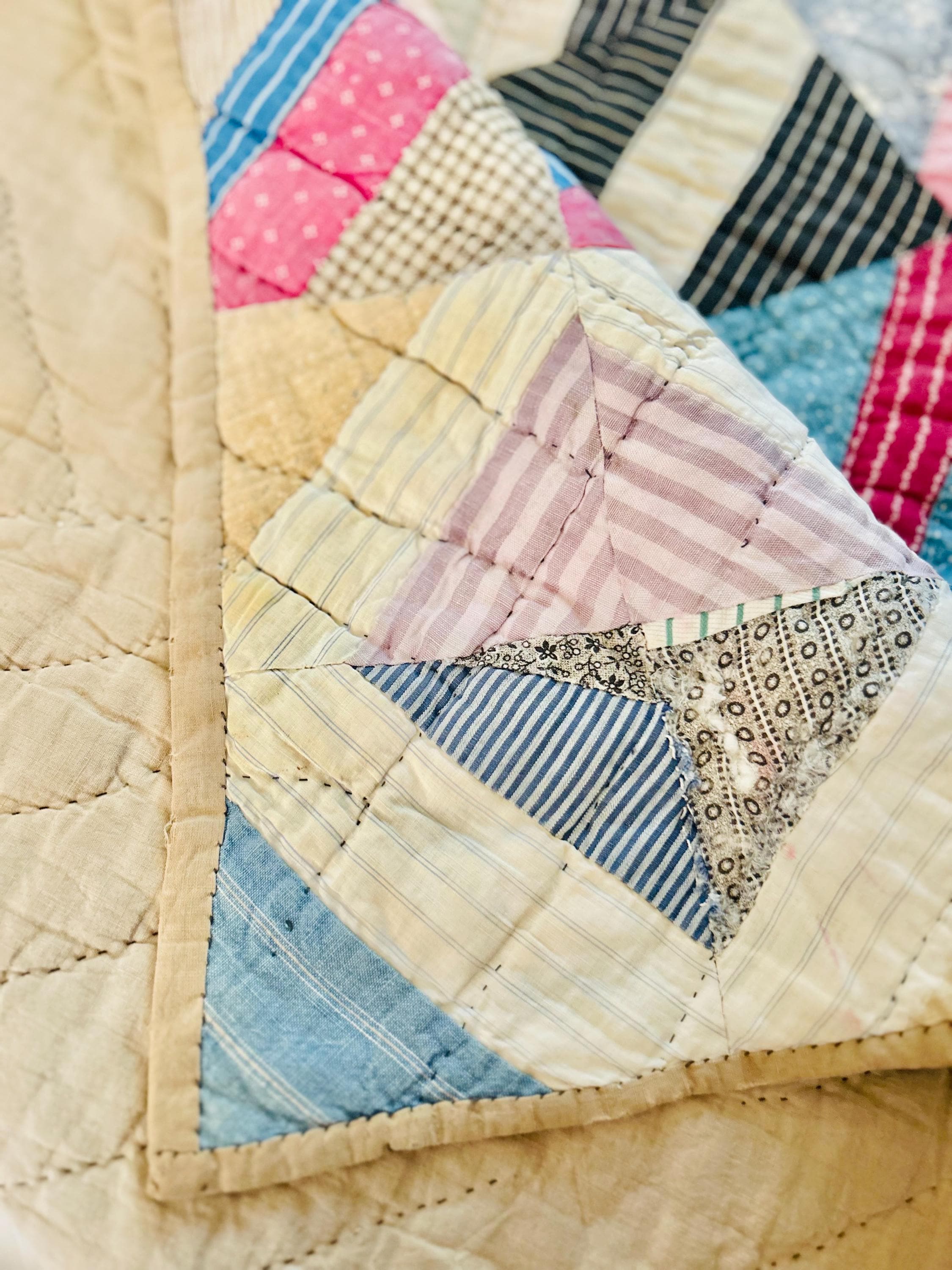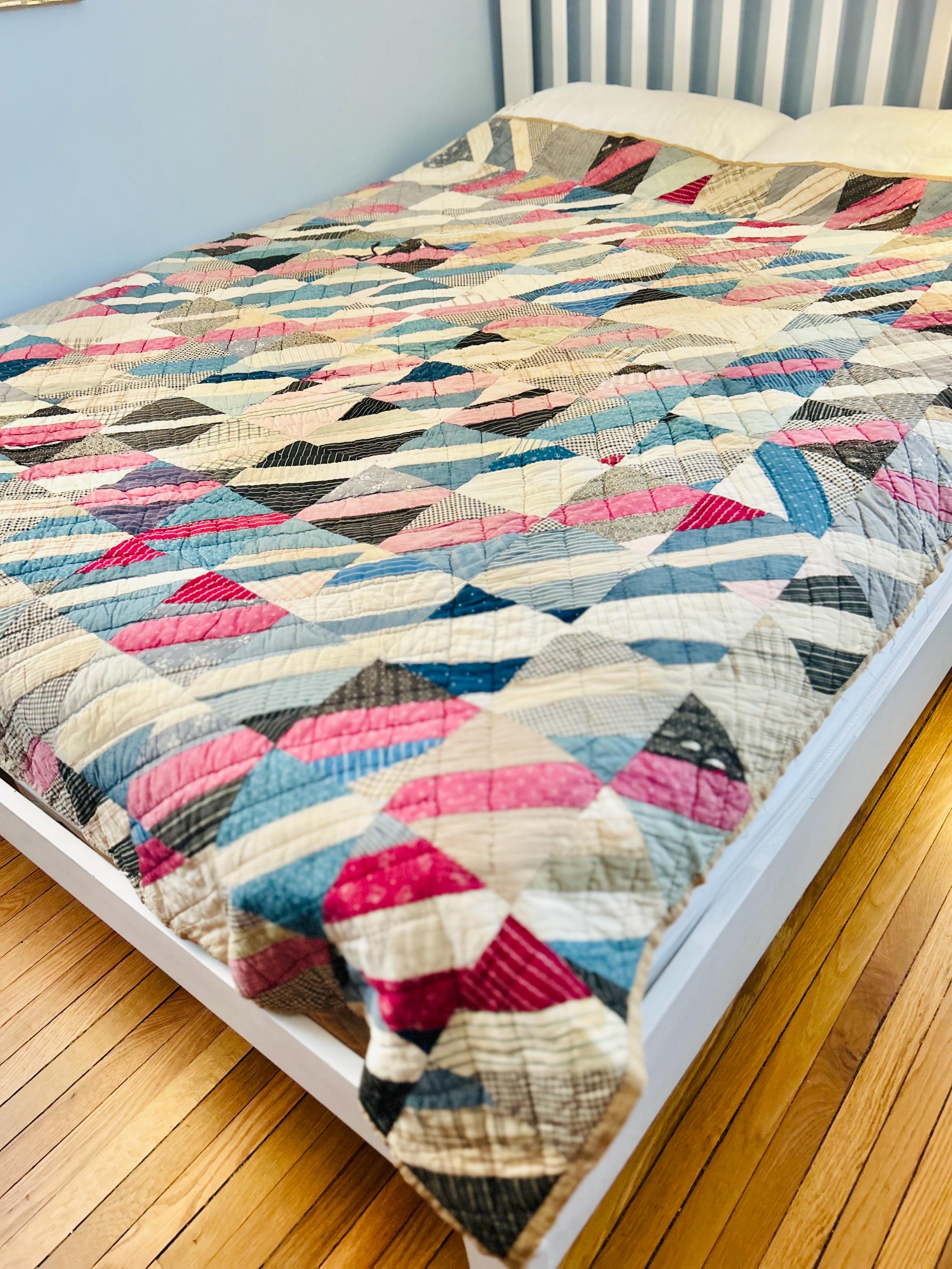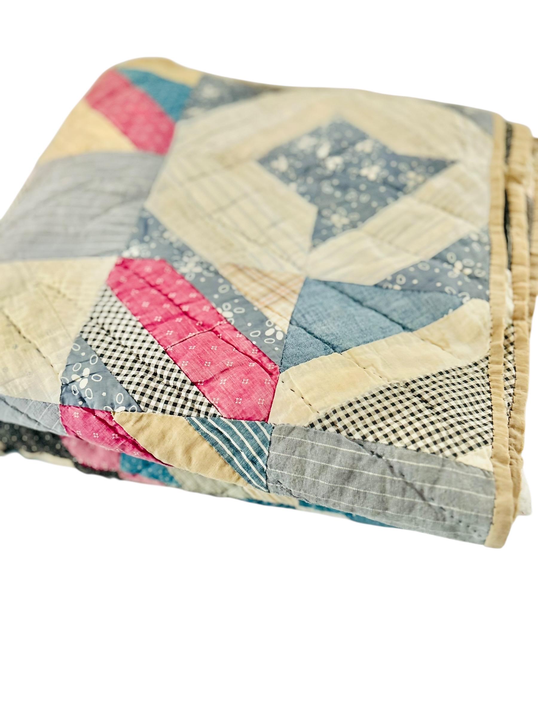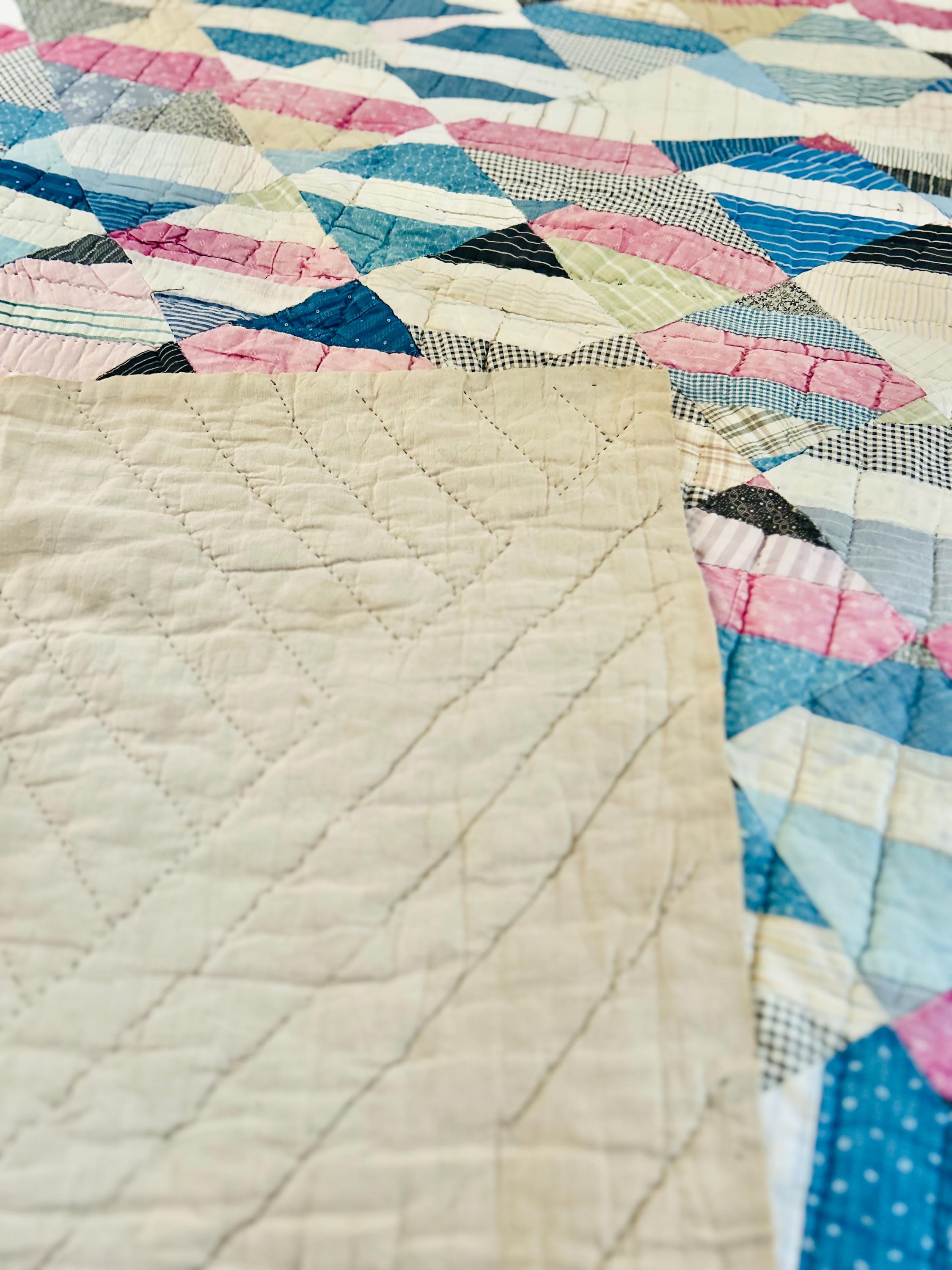 This beautiful Scrappy String Quilt was made in the 1930s from a wonderful mix of colorful scraps -- pink, blue, black, white along with shirting prints, all of which have been arranged in a diagonal string pattern. It has been entirely hand quilted in black thread in a diamond, diagonals and grid pattern.