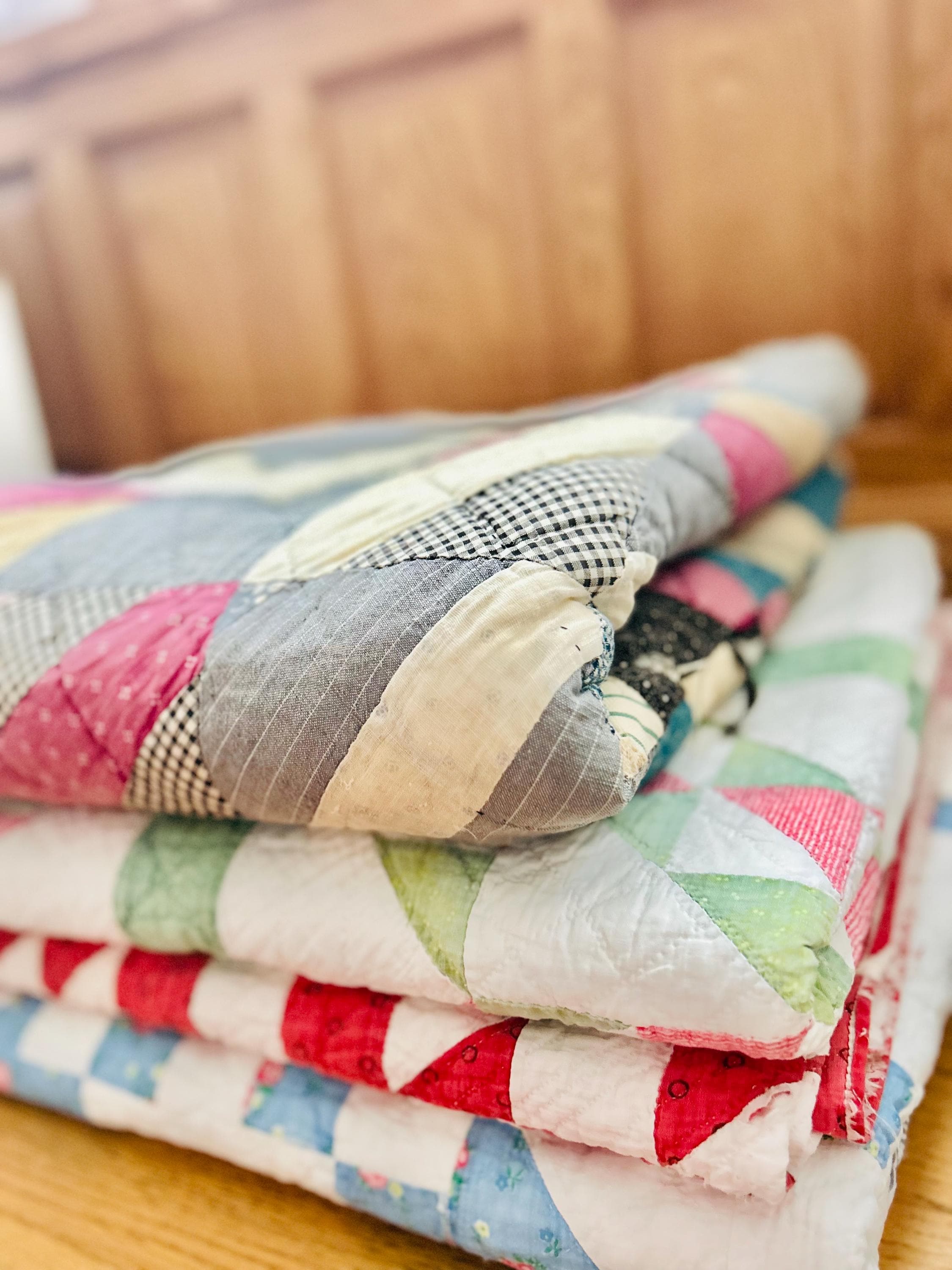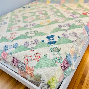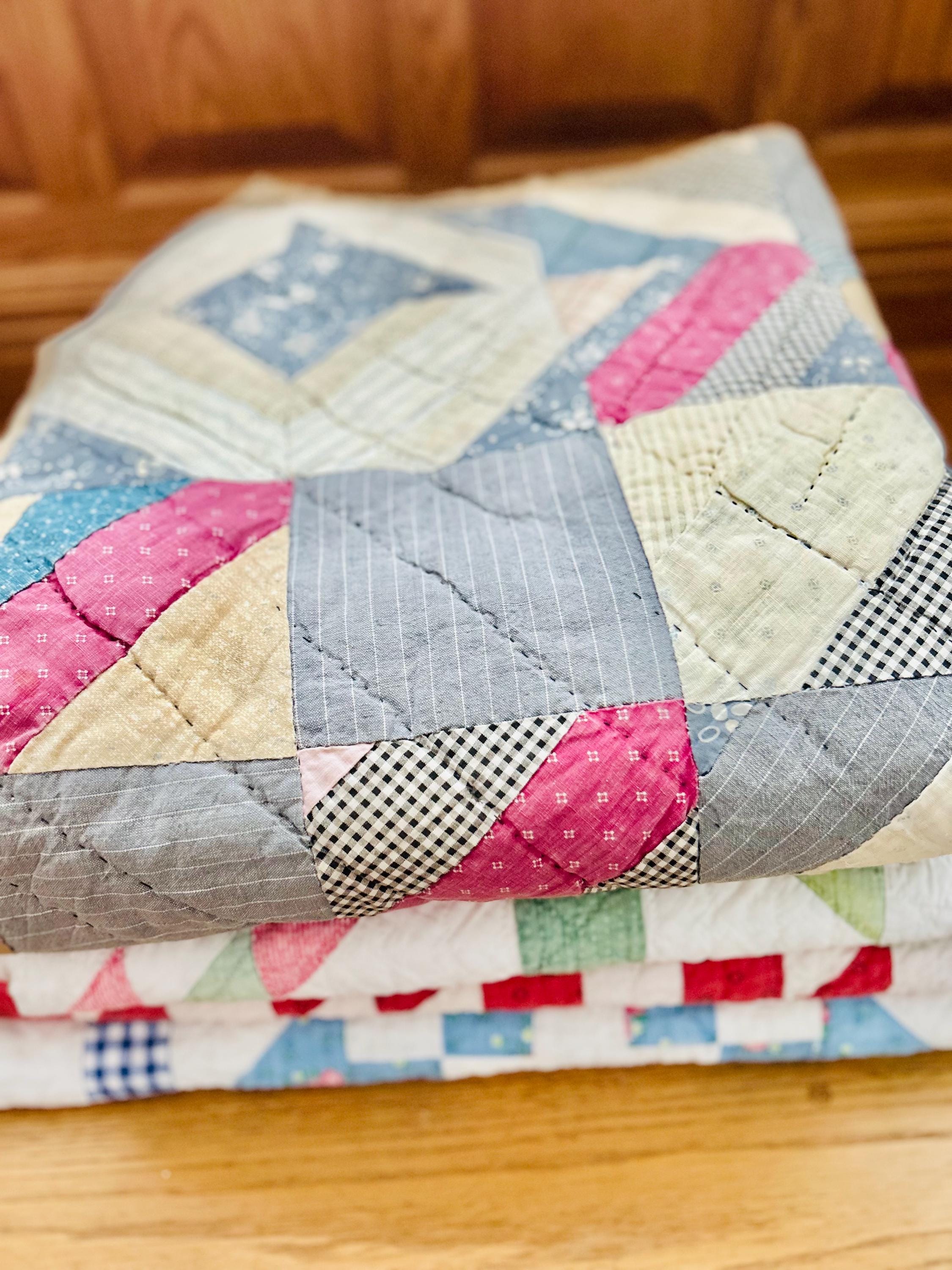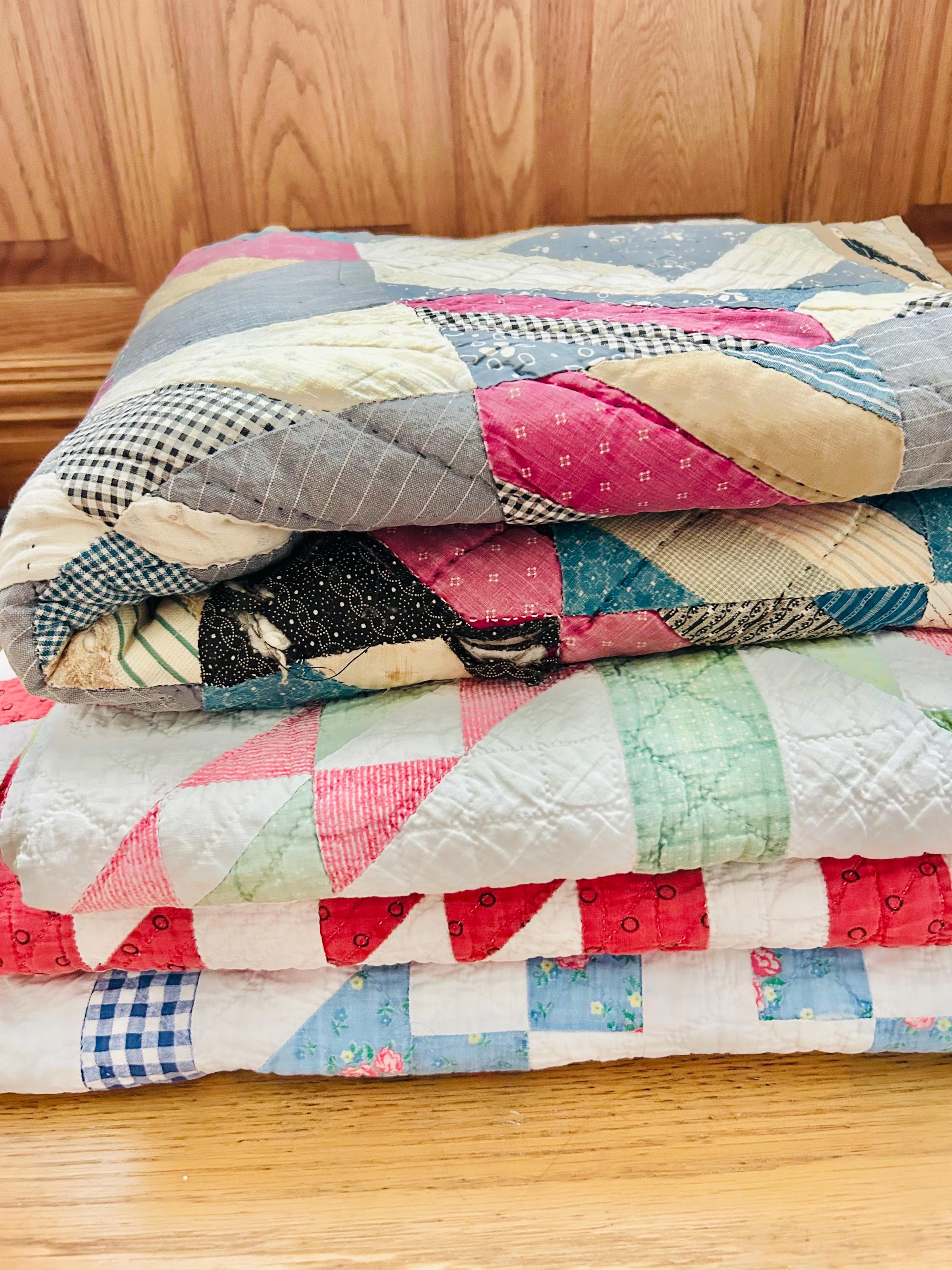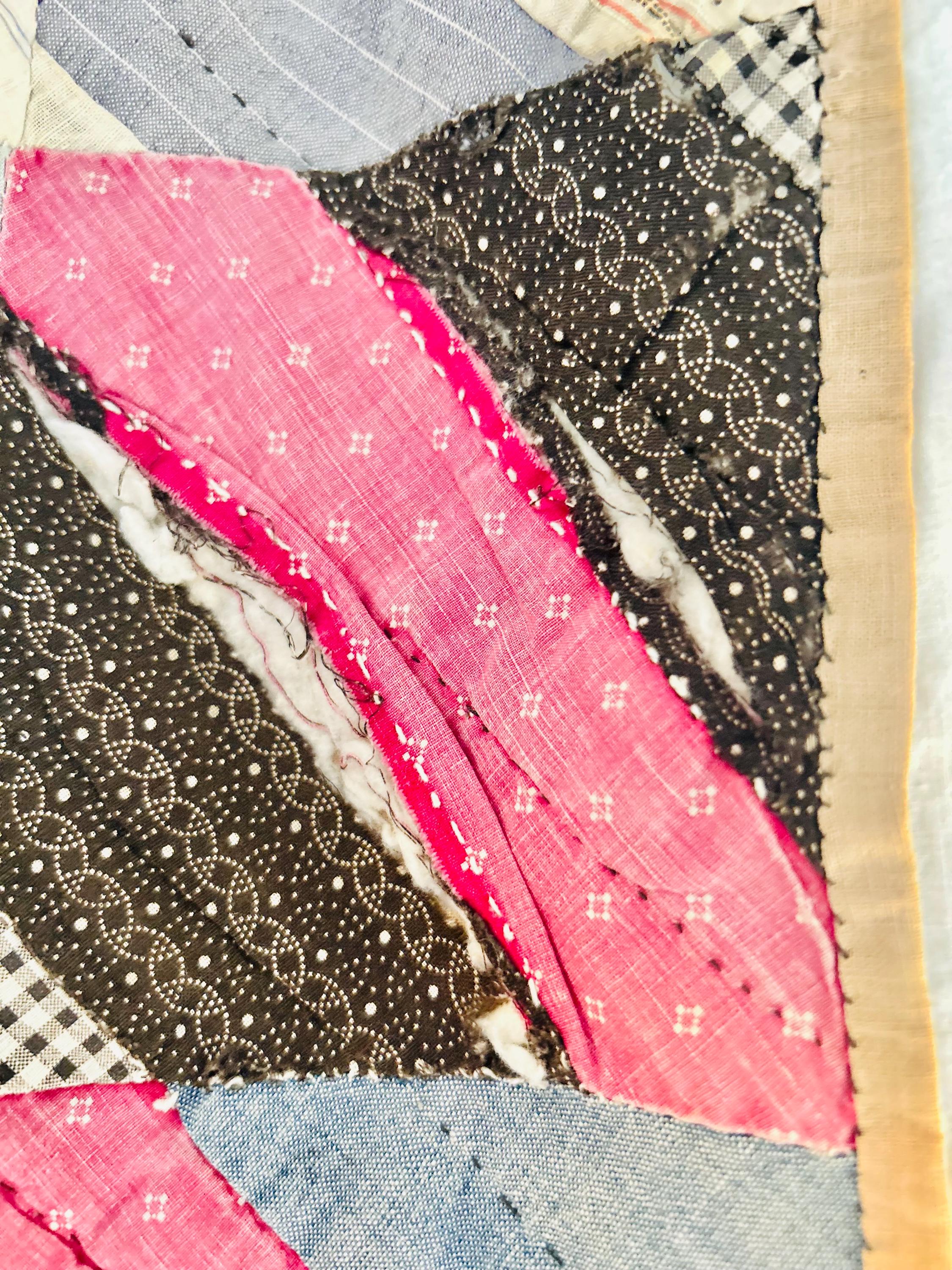 This quilt is in good condition and is almost entirely intact, but is being listed as a cutter quilt due to the shattering/fabric loss/seam separations of some of black fabrics throughout the quilt. See photos. The fabrics also have age-related fading and there is some fraying of the binding.