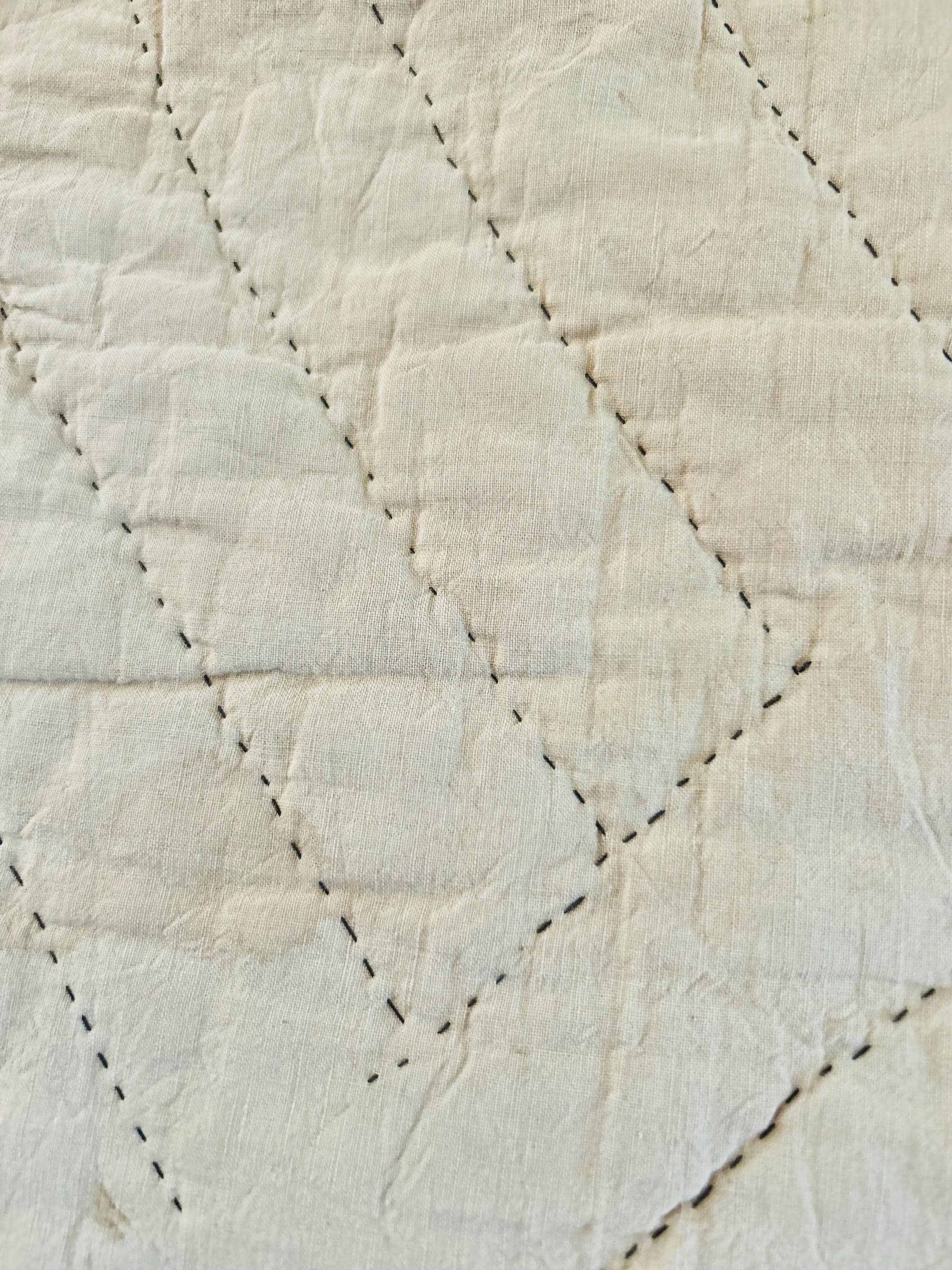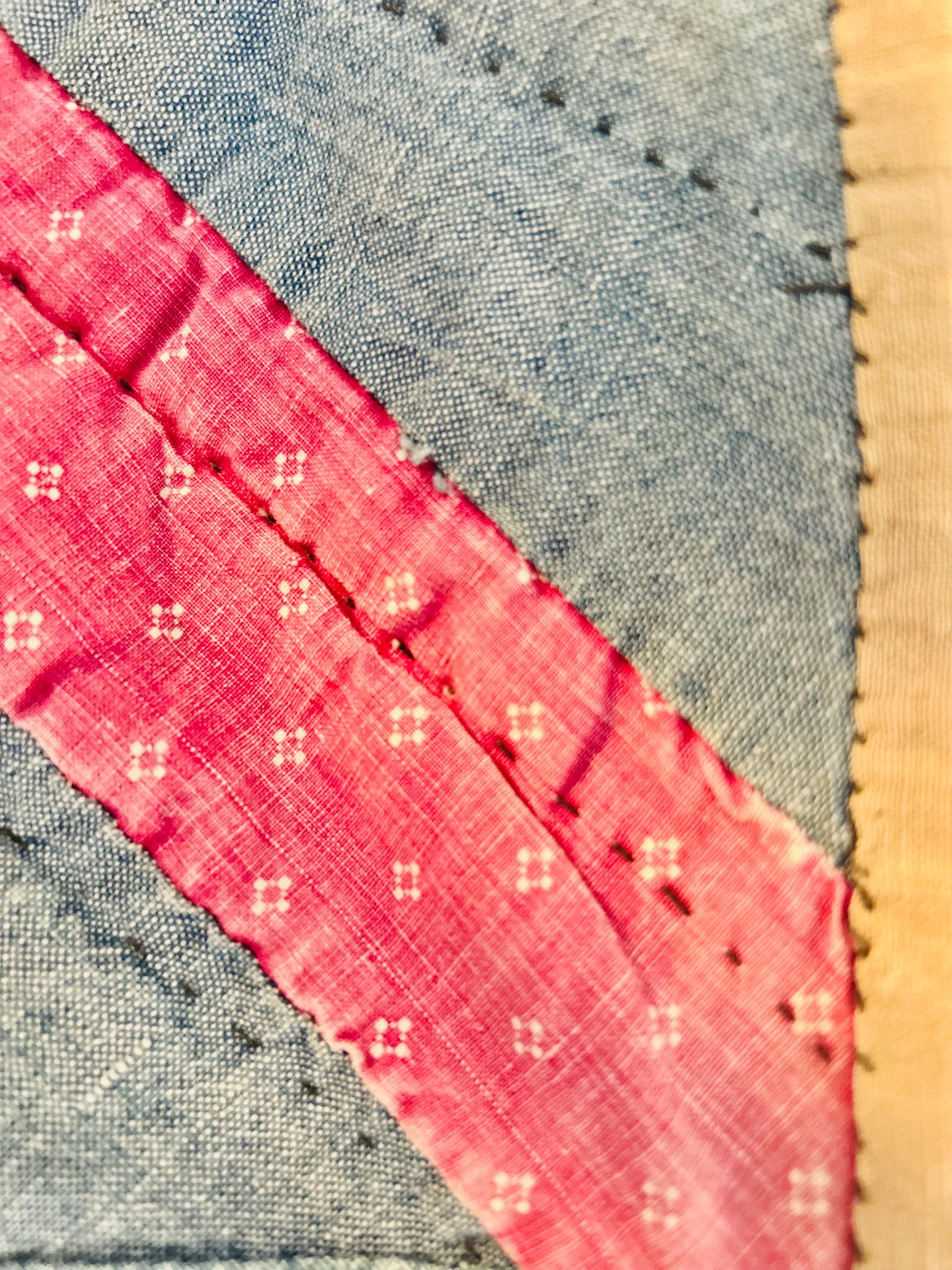 The back is tan cotton that has been turned to the front and hand-stitched to form the binding.