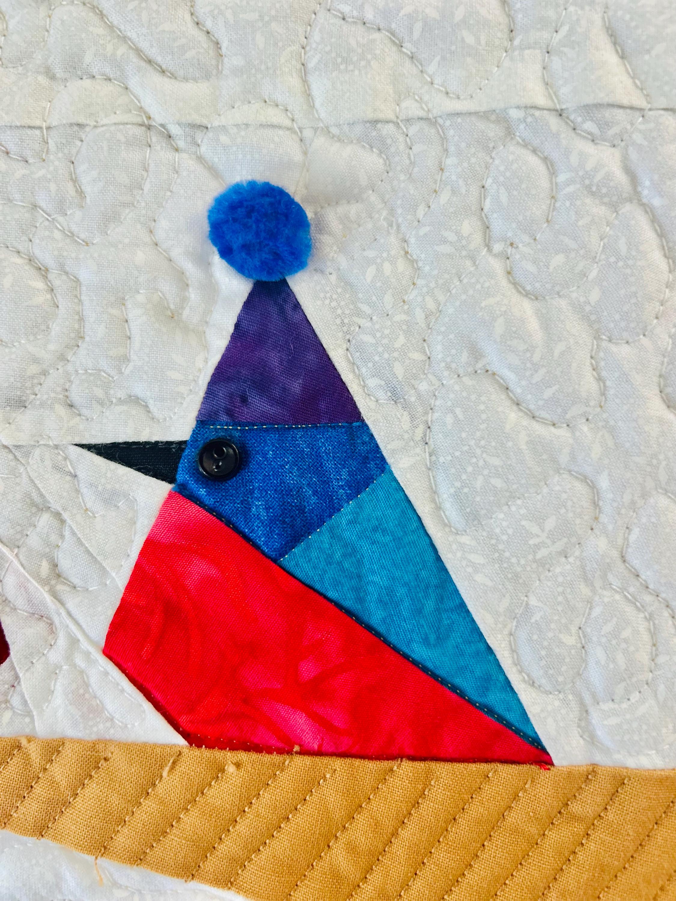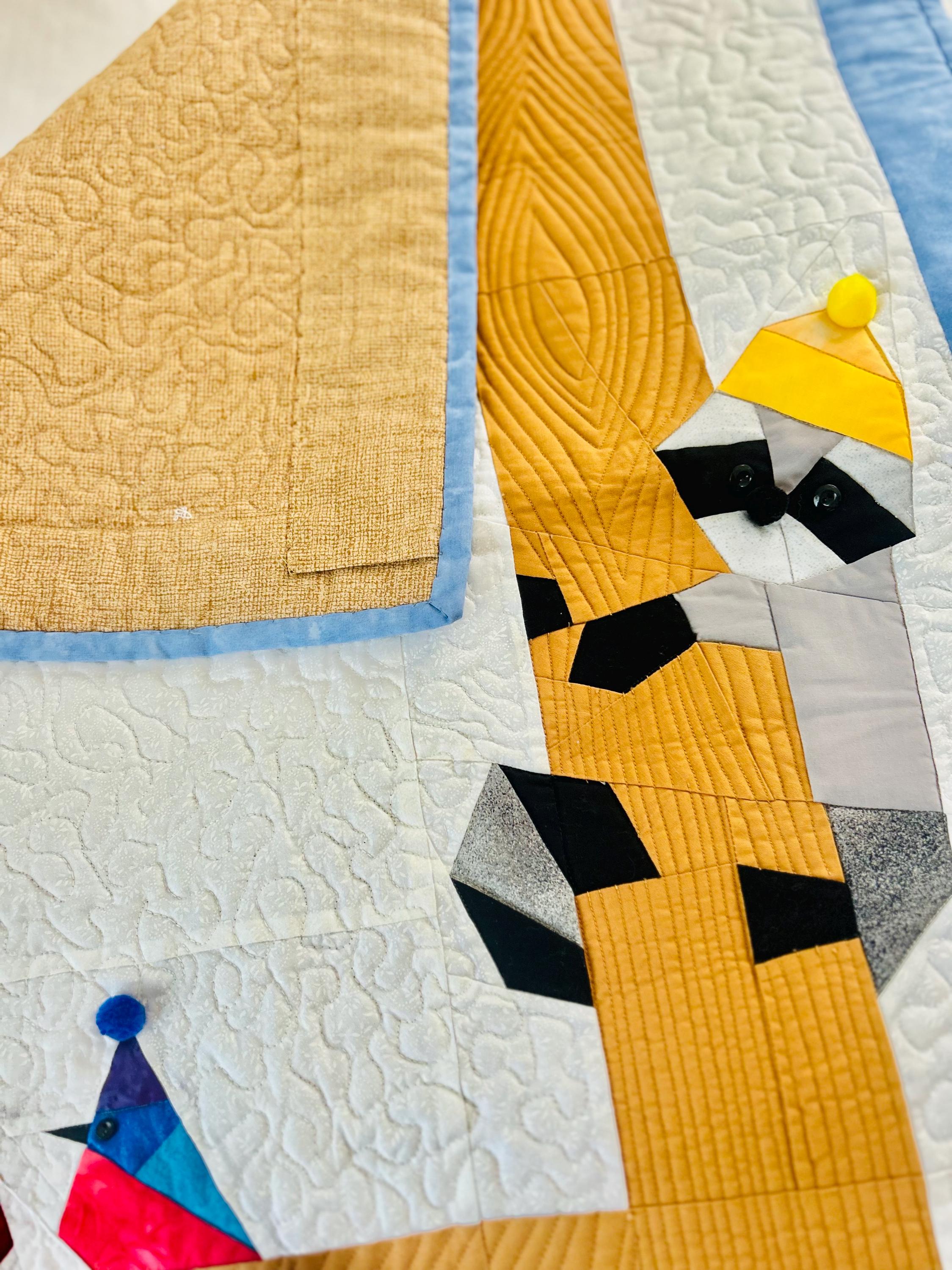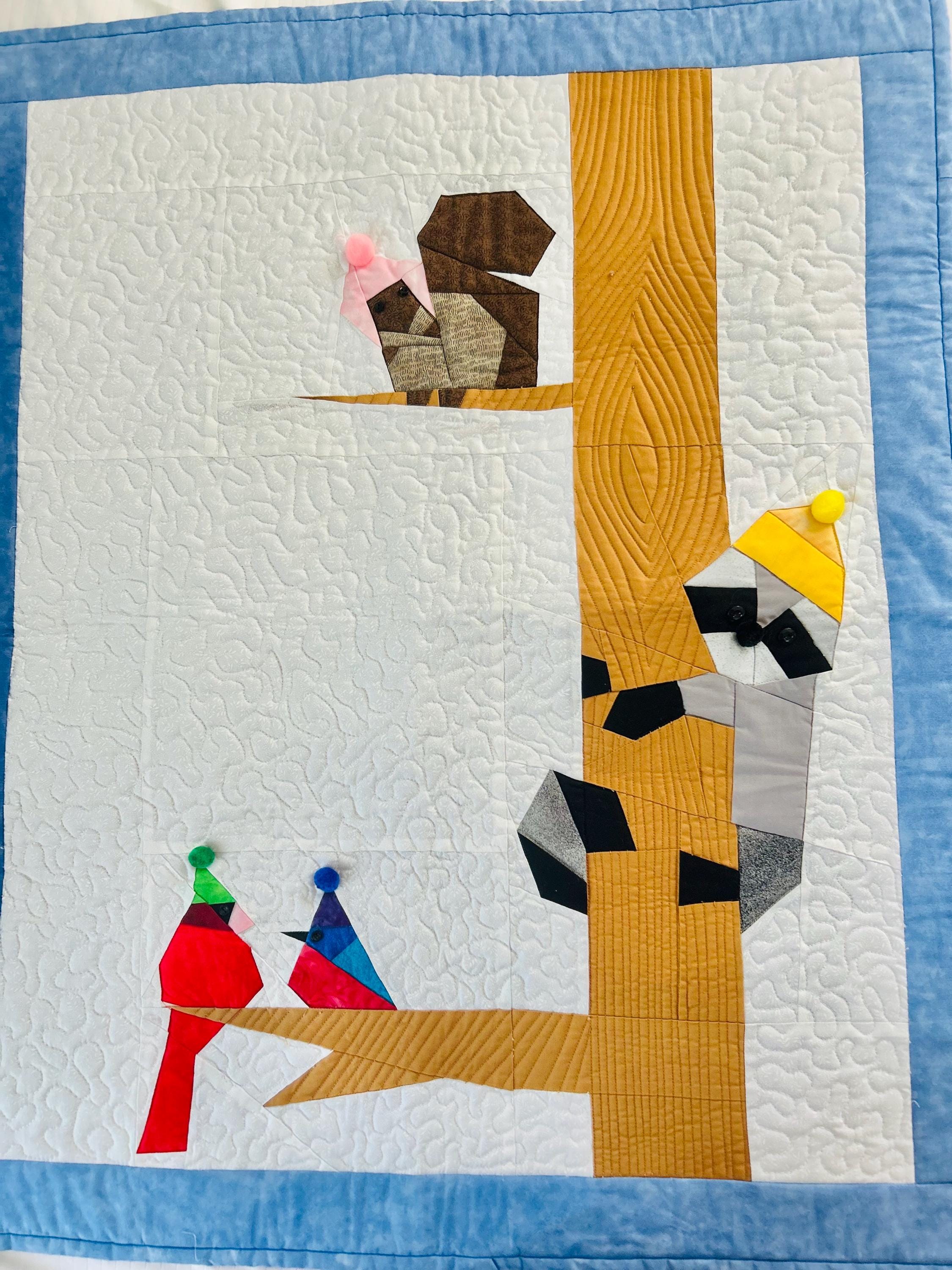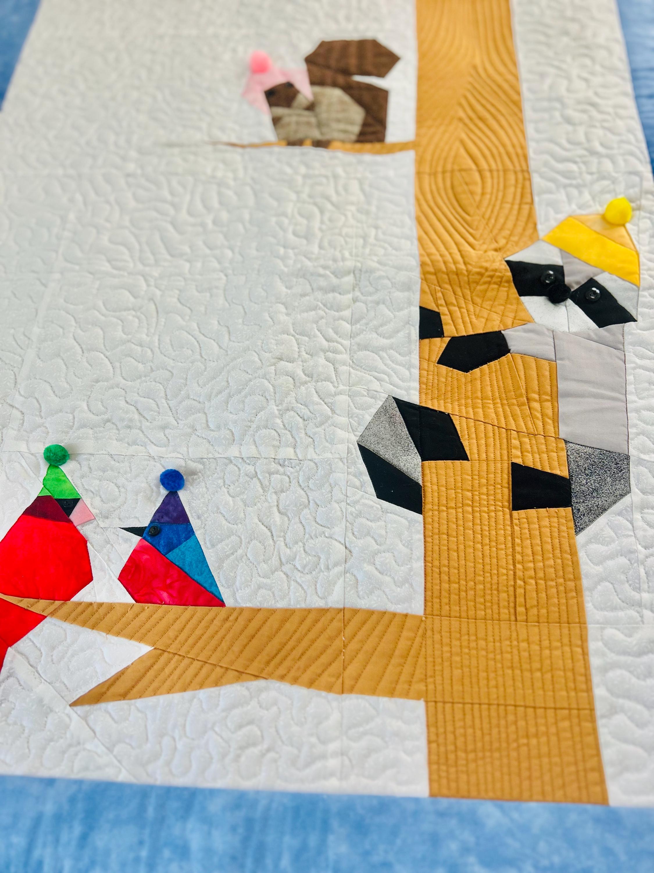 Everything about this quilt is adorable and well done, from the Raccoon, Squirrel and Cardinals with pom-pom hats and button eyes, to the intricate long-arm quilting and the realistic bark on the tree.