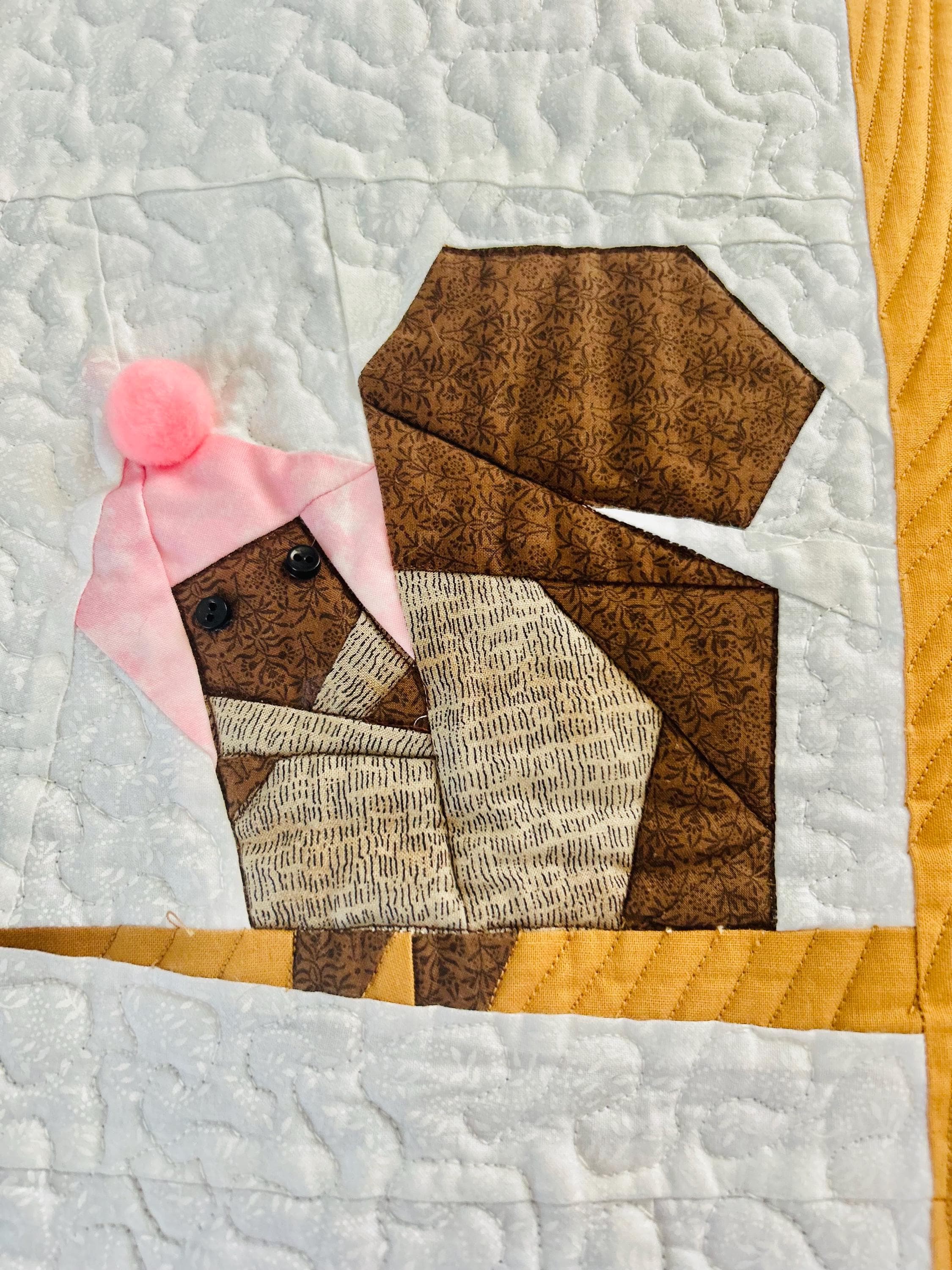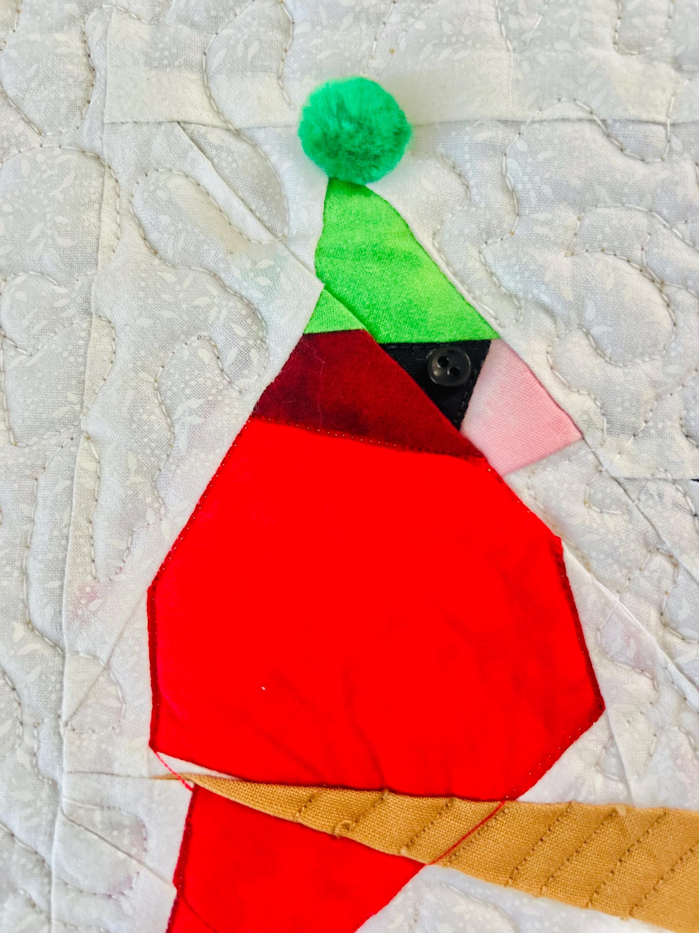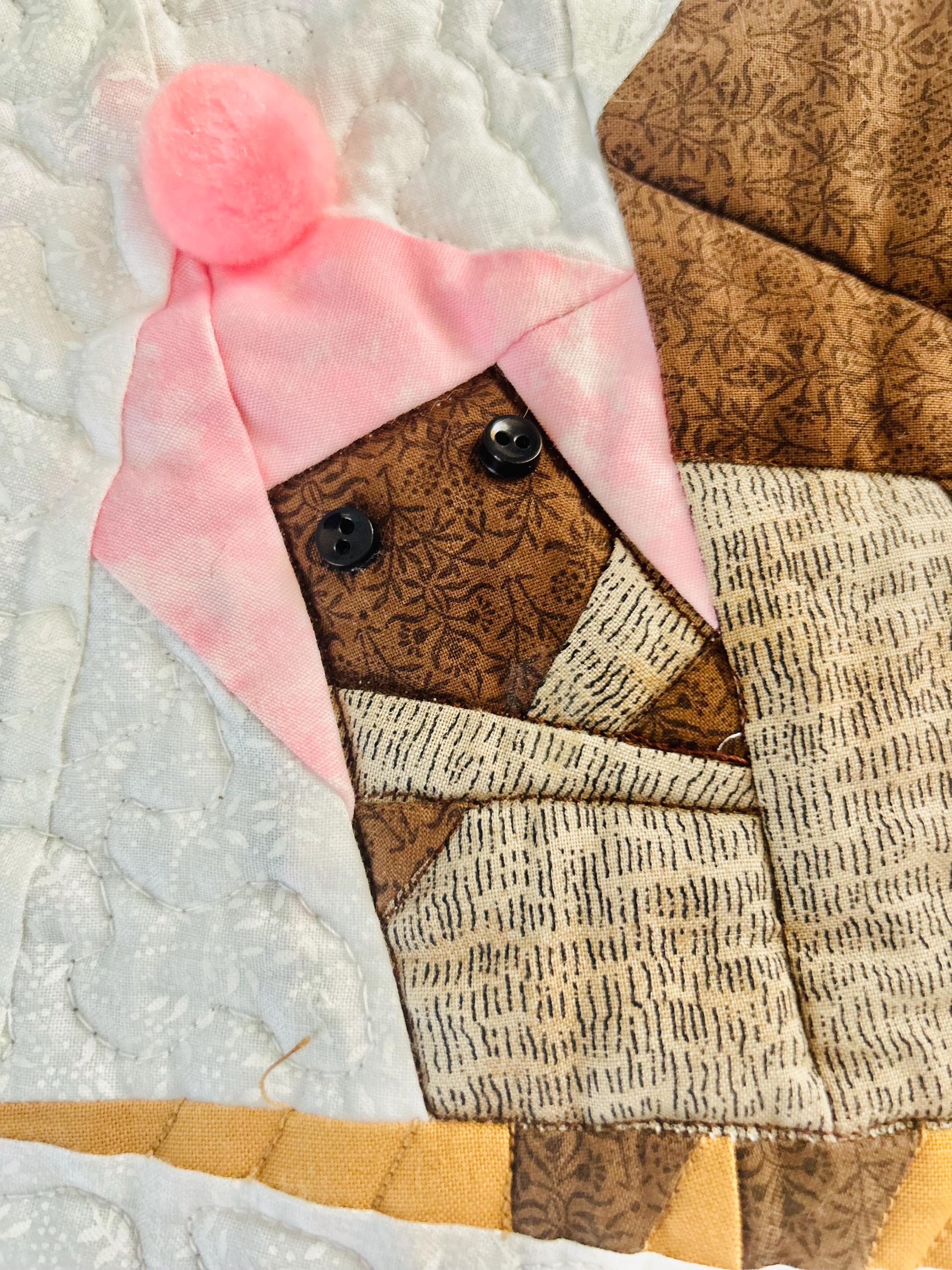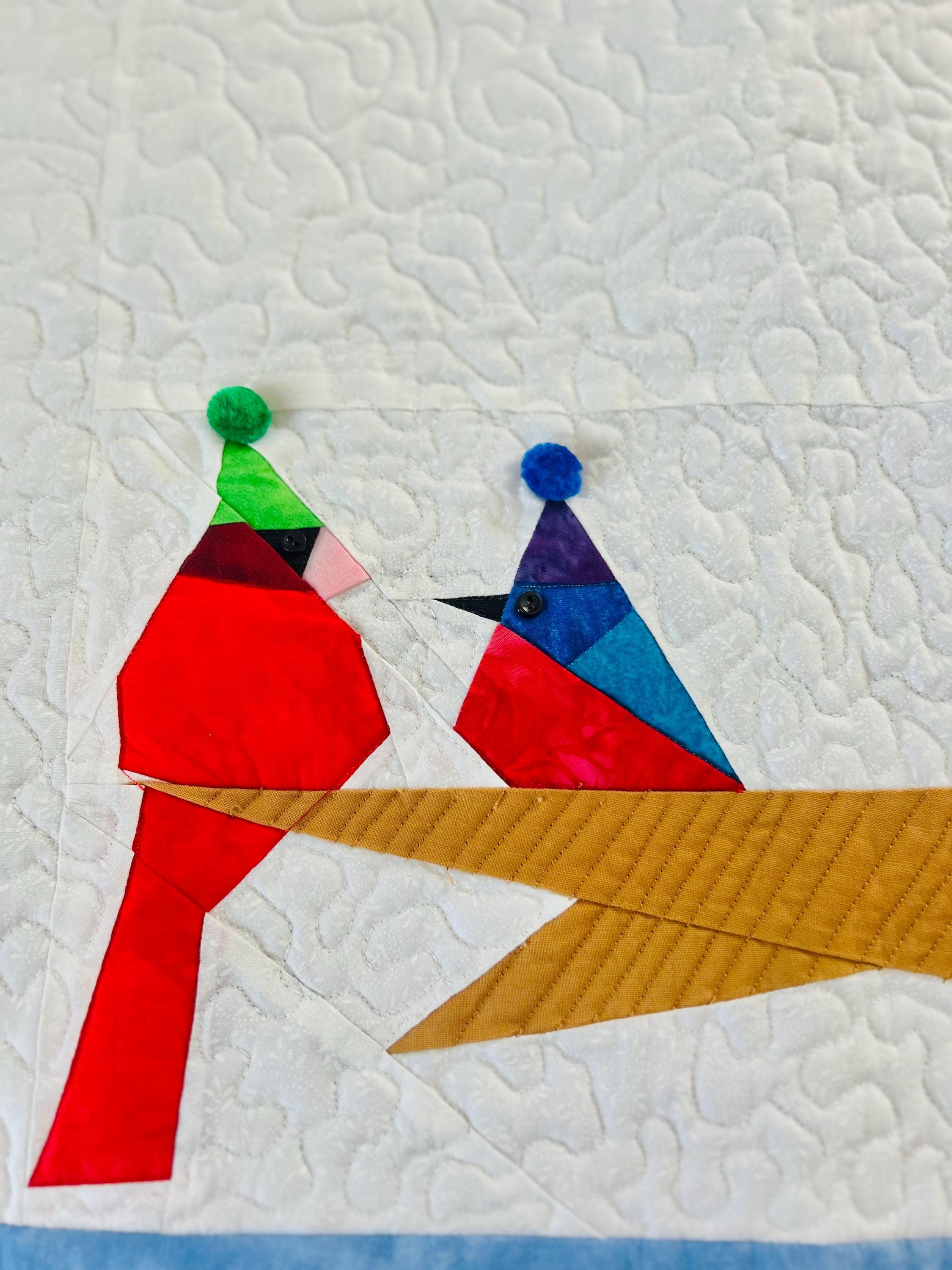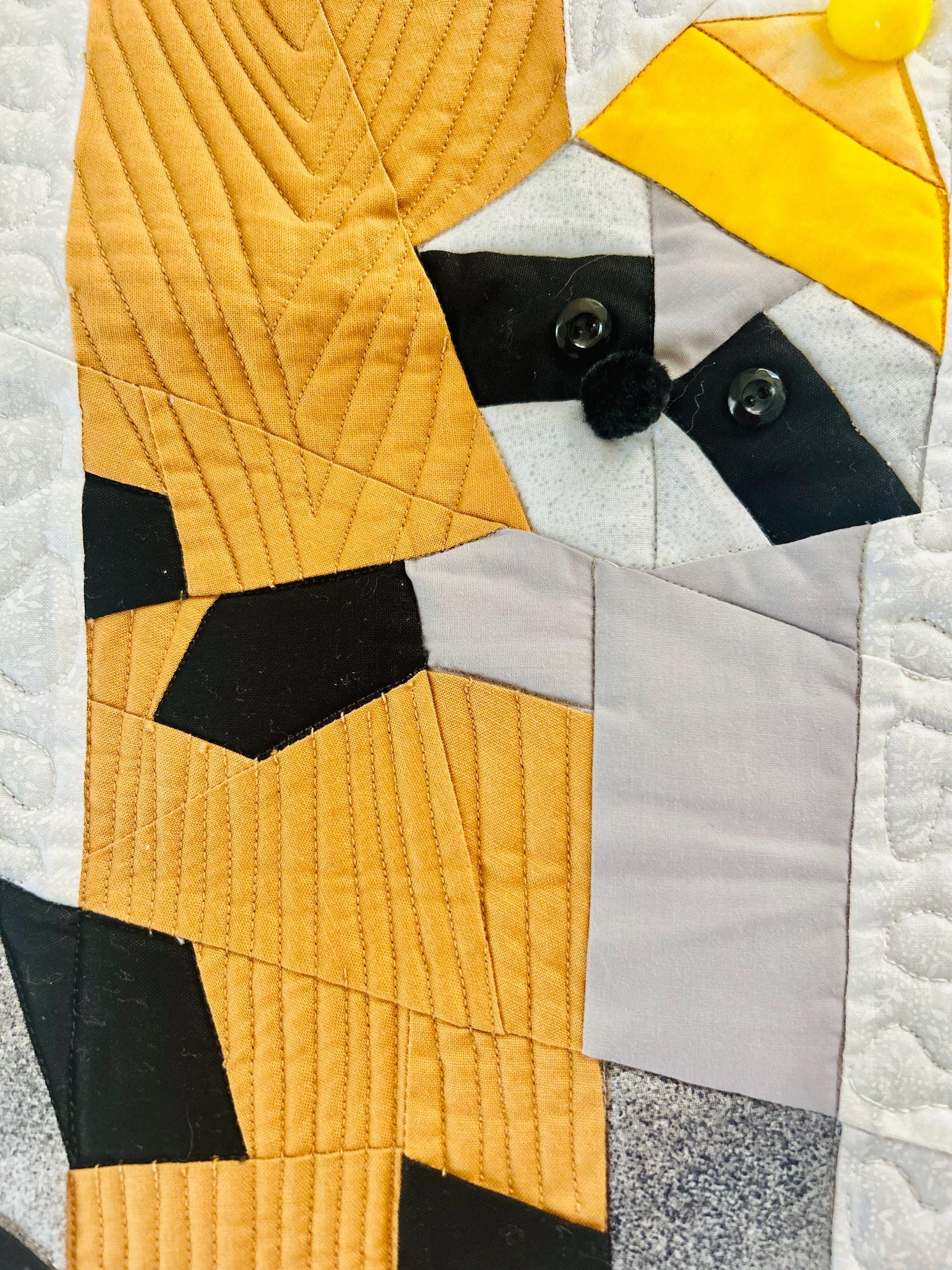 Everything about this quilt is adorable and well done, from the Raccoon, Squirrel and Cardinals with pom-pom hats and button eyes, to the intricate long-arm quilting and the realistic bark on the tree.